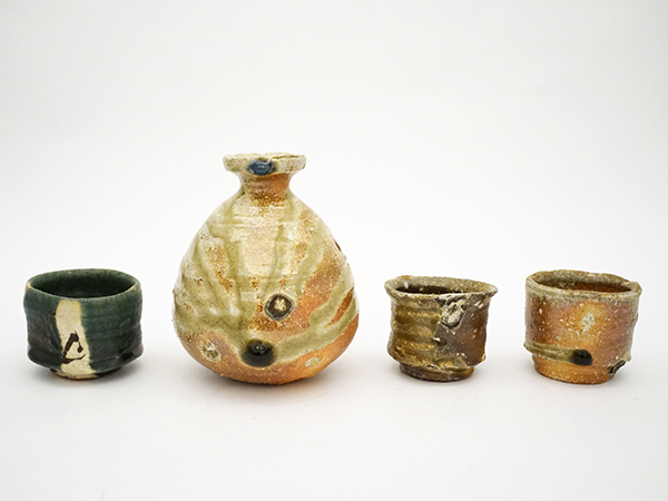 | 作品名 | 左から順に 〔1〕 織部ぐい呑(仕覆付) 〔2〕信楽自然釉徳利 〔3〕織部ぐい呑(仕覆付) 〔4〕織部ぐい呑(仕覆付) |