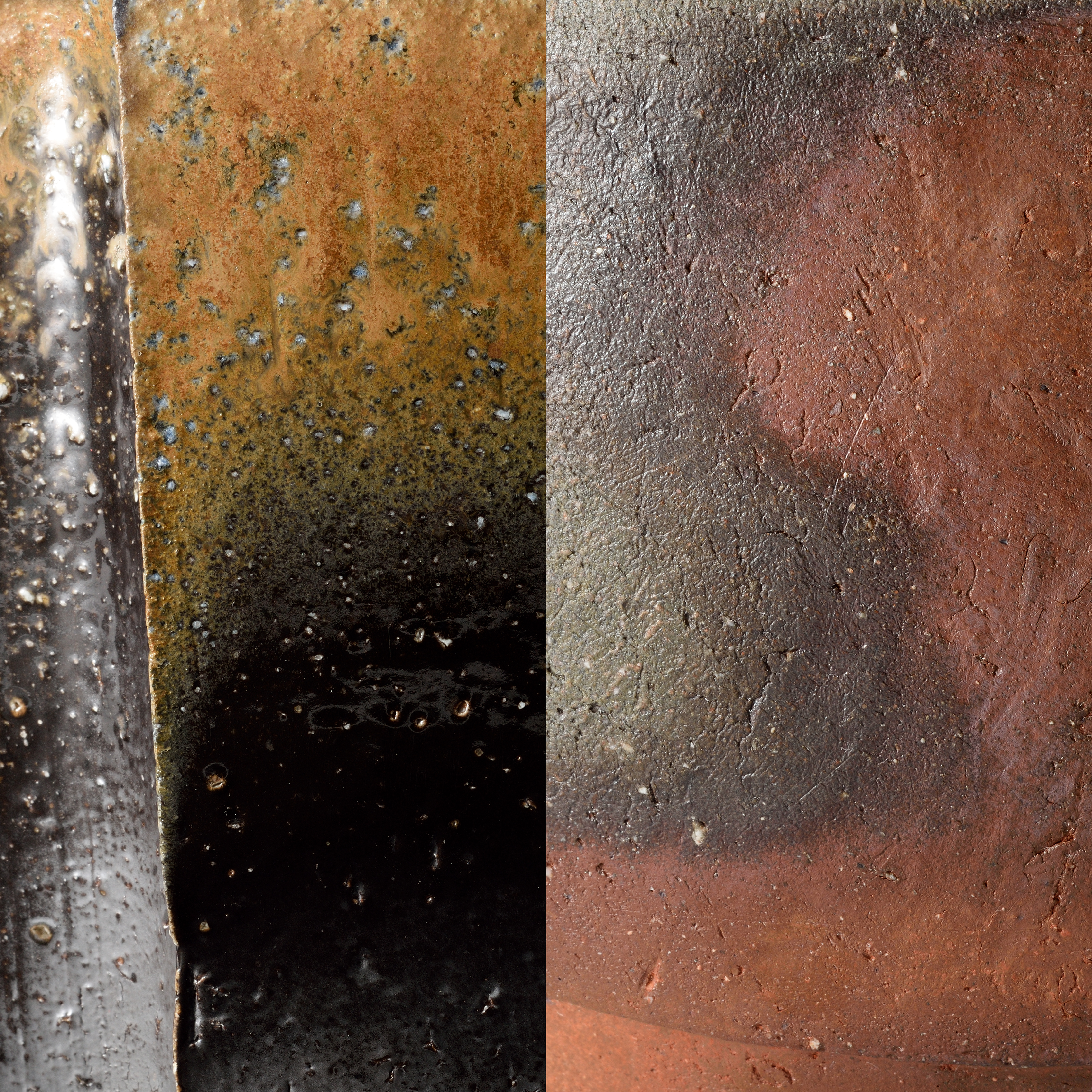高島聡平は、北海道釧路市出身。 道都大学デザイン科卒業後、備前の伊勢﨑 淳に師事し、令和4年、日本陶磁協会現代陶芸奨励賞を受賞した。 備前の土の新たな一面を引き出すために、日夜、悪戦苦闘している。 今回の《備前茶盌》は、田土と山土をブレンドし薪窯で四回ほど焼いたもの。 そうすることで重量感のある様相が引き出せるのだという。焼き締まった黒い肌に混じった白い粒が、焼成を重ねることで釉化し、青味のある釉流れを生み出している。