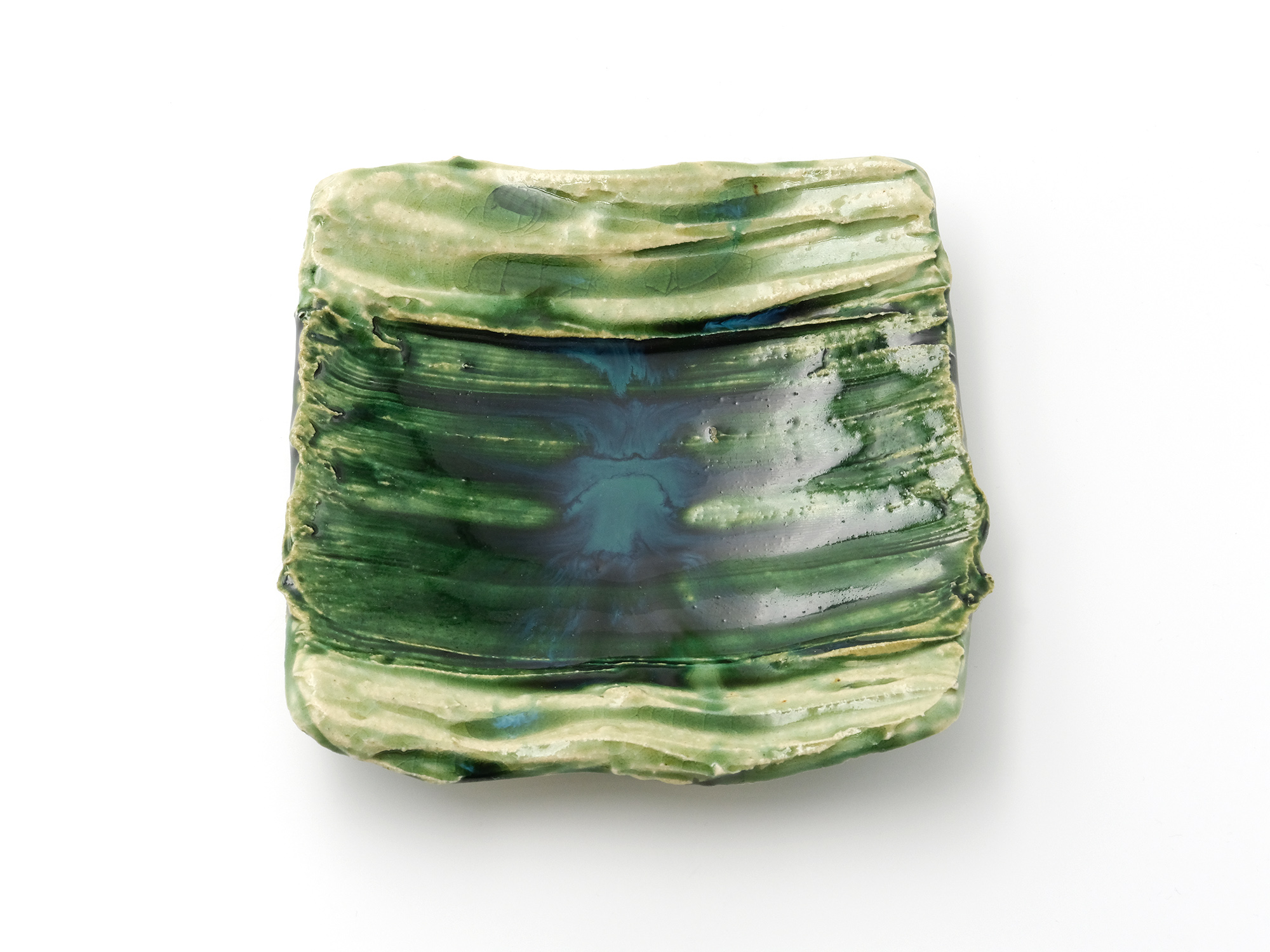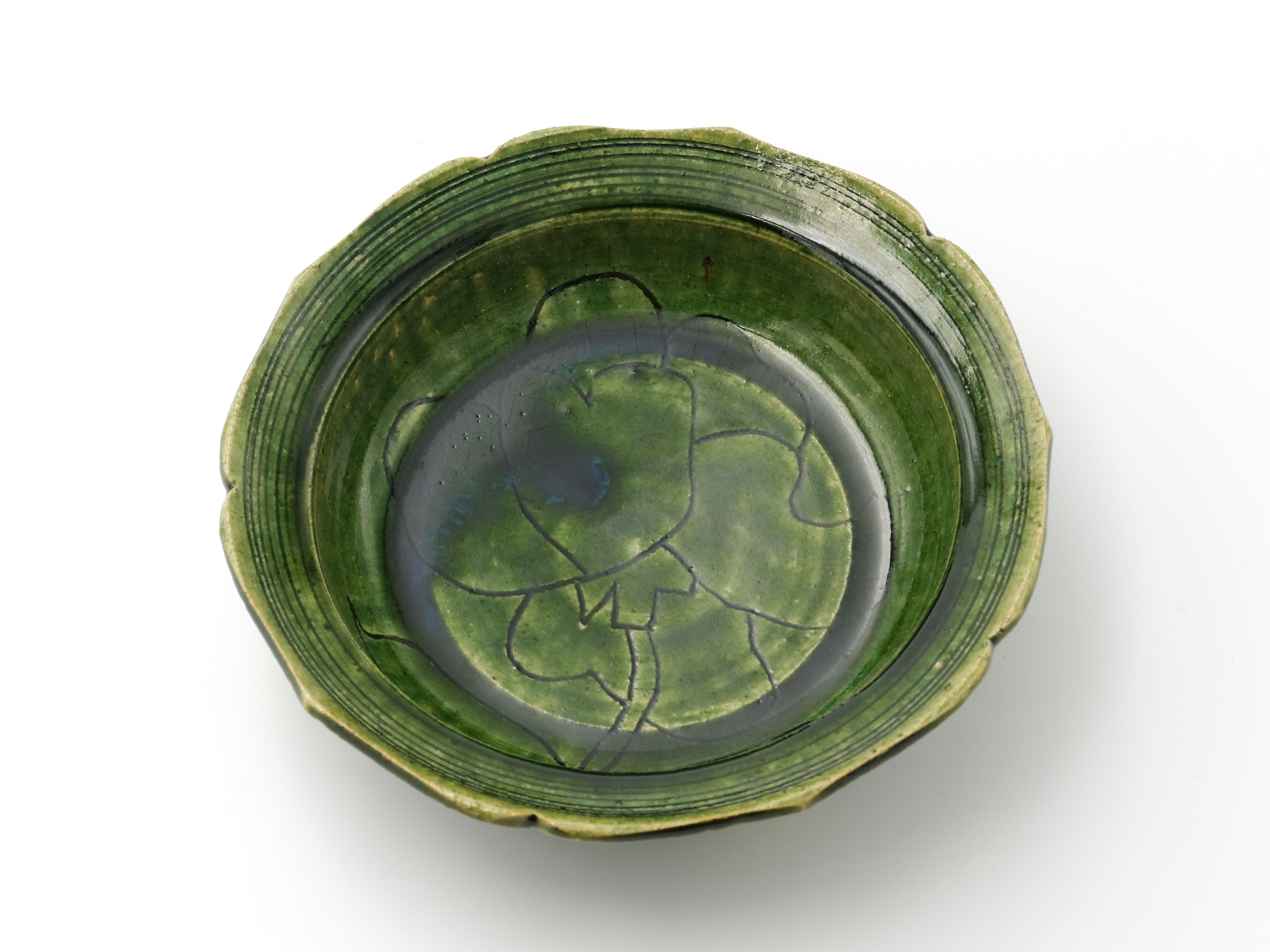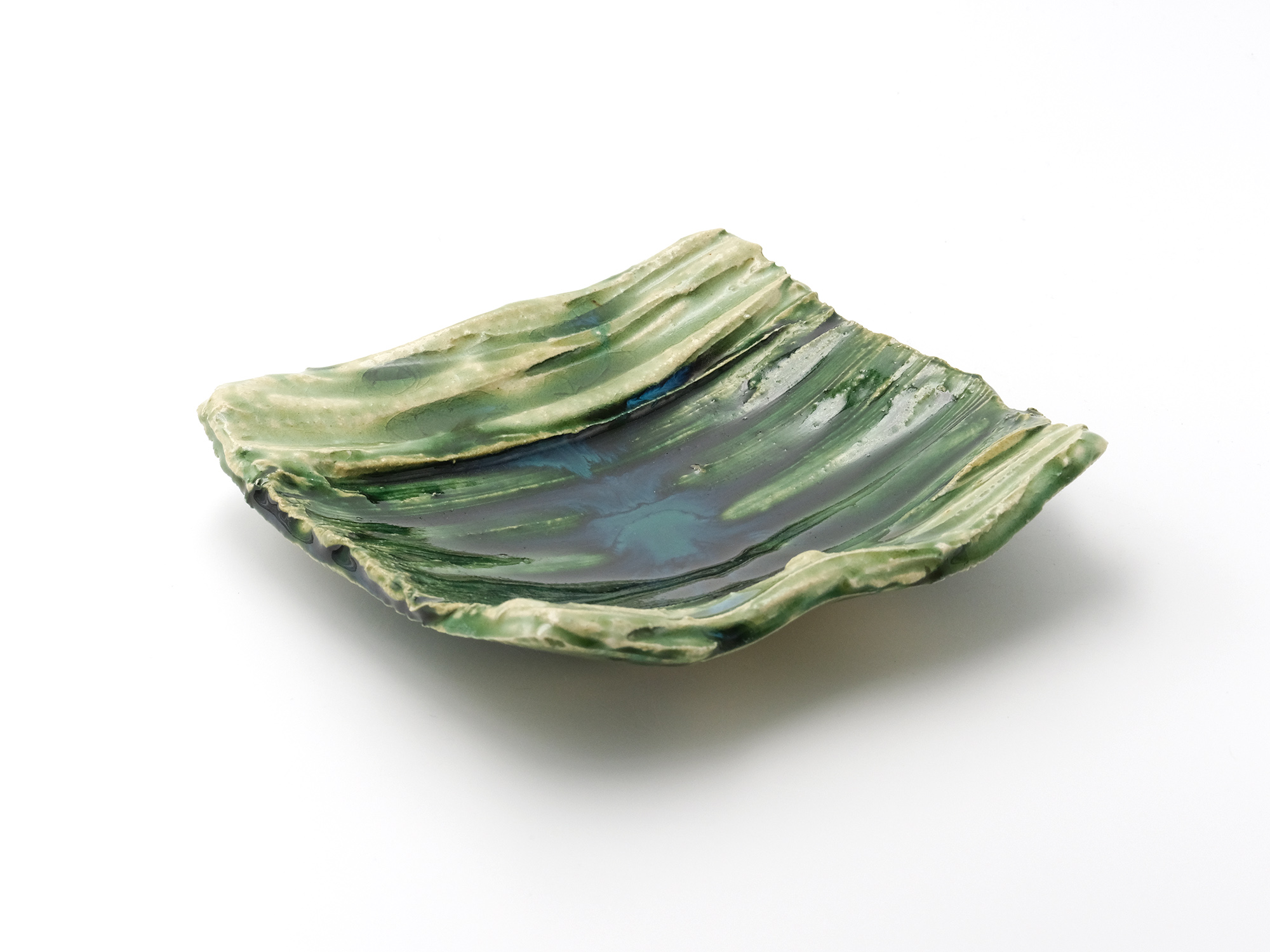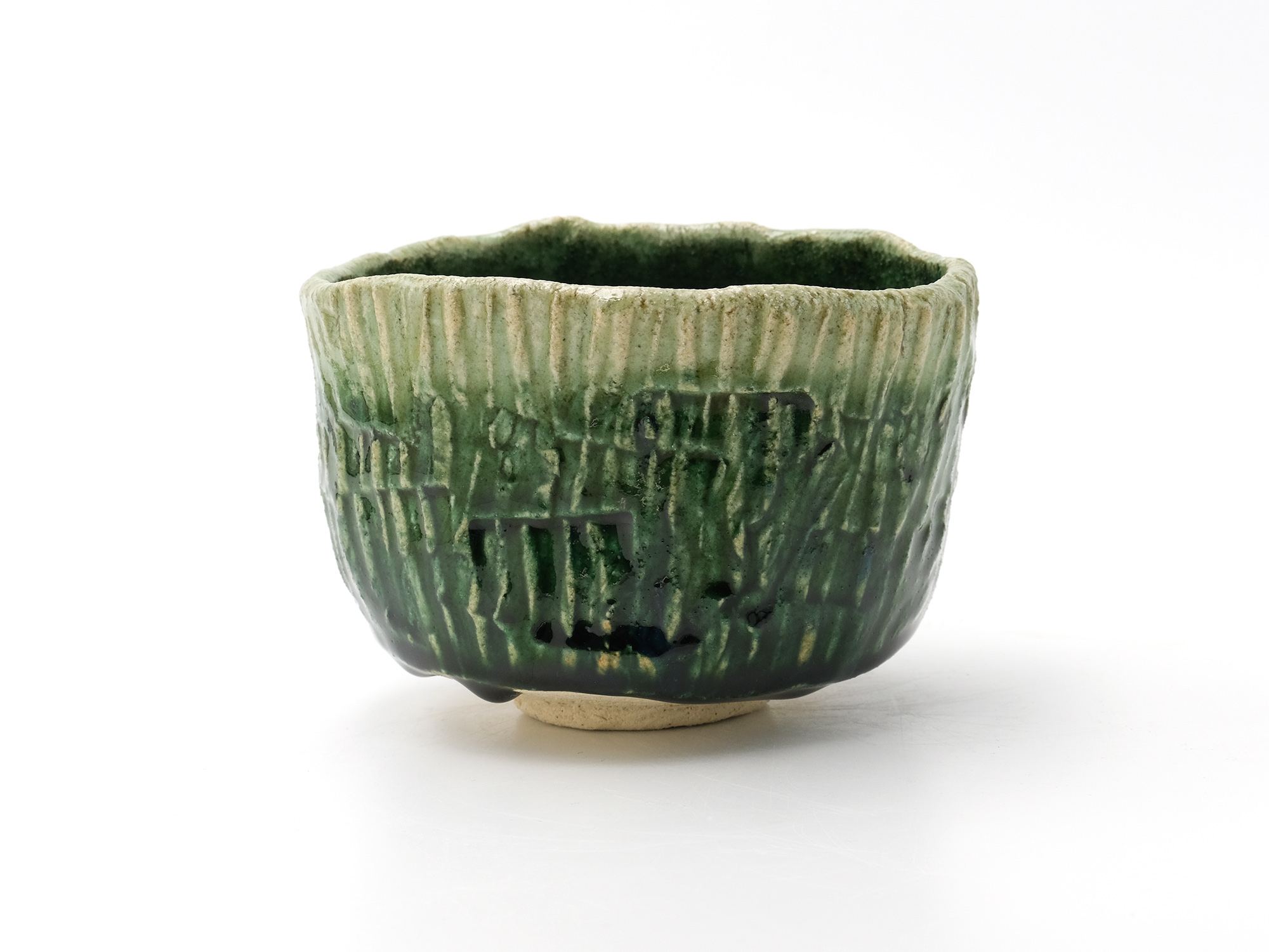 徹さんは、緑釉の作品に一貫して挑まれています。 私は20年近く、彼の緑釉作品を拝見して来ましたが、その緑の色調は微妙に進化し、そのボディは茶陶を主軸に造形作品にも挑まれてきました。 私は彼の緑色の佇まいが大好きで、茶碗、水指、食器と愛用しております。 大寄せの茶会などで、たくさんの茶碗を使う時に、緑釉茶碗があると、茶室が華やぎ、そして和みます。 新宿柿傳でも長く愛用している定番の緑釉丸皿は、どんな料理を盛り付けても、料理が一層美味しく映えます。 今年から、日本工芸会 東海支部の幹事長に就任され、公私共に一層忙しくなった徹さん。激務の傍らの作陶で、本当に頭が下がります。