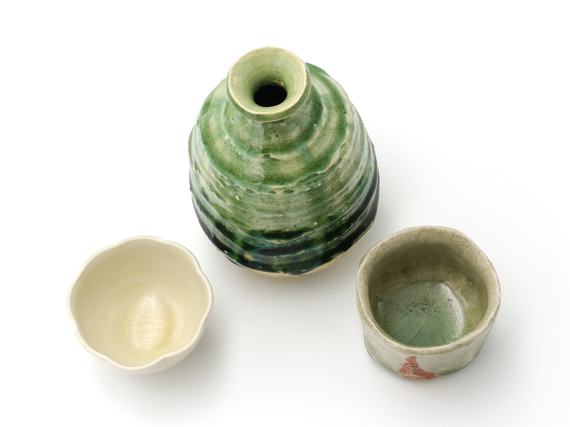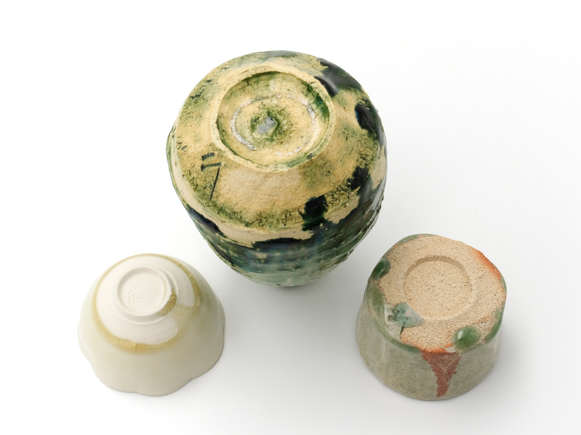 | 作品名 | [左] 黄白釉酒呑【ご売約済】 [中] 緑釉徳利 [右] 灰釉酒呑【ご売約済】 |