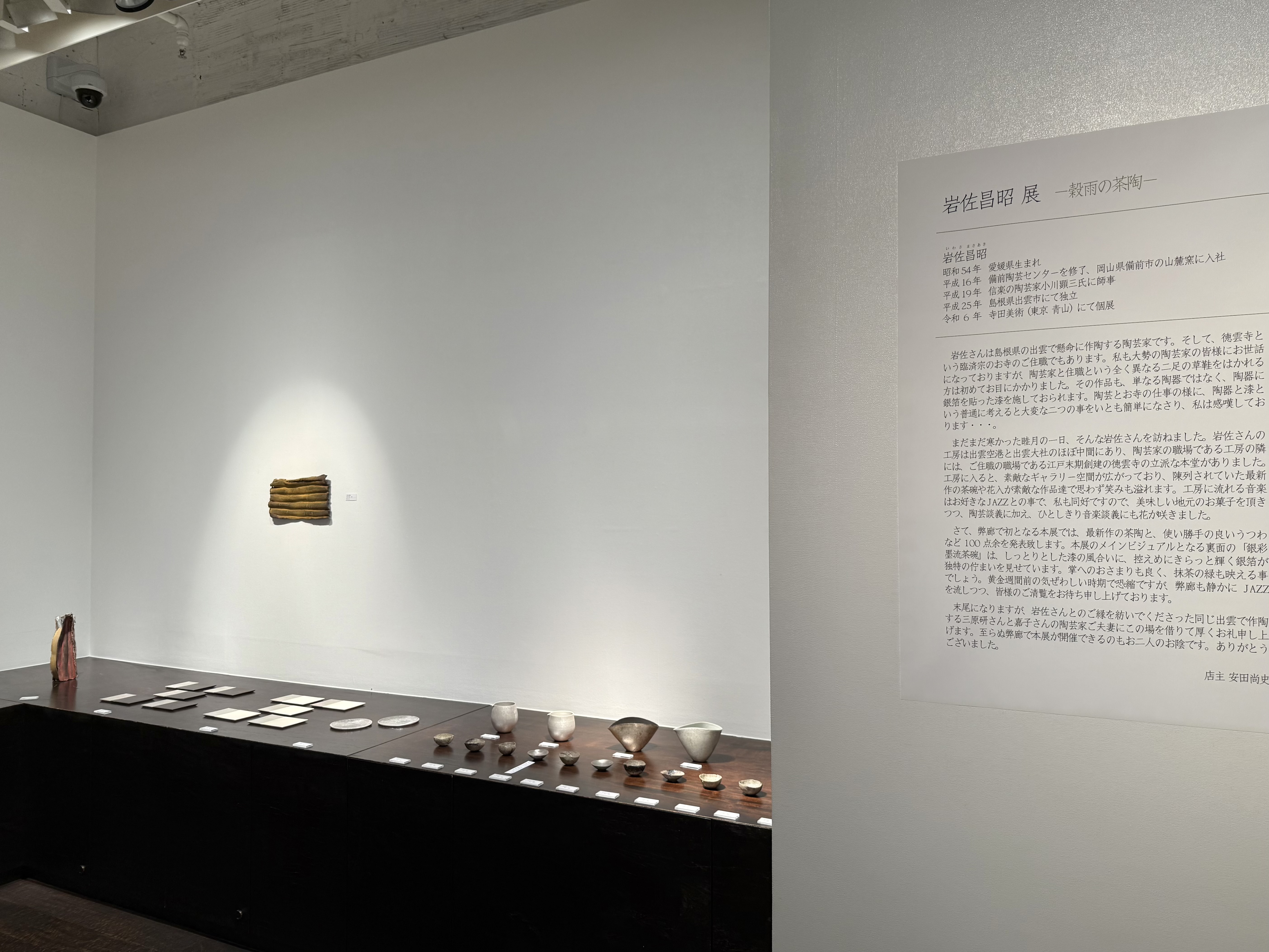 末尾になりますが、岩佐さんとのご縁を紡いでくださった同じ出雲で作陶する三原研さんと嘉子さんの陶芸家ご夫妻にこの場を借りて厚くお礼申し上げます。 至らぬ弊廊で本展が開催できるのもお二人のお陰です。 ありがとうございました。