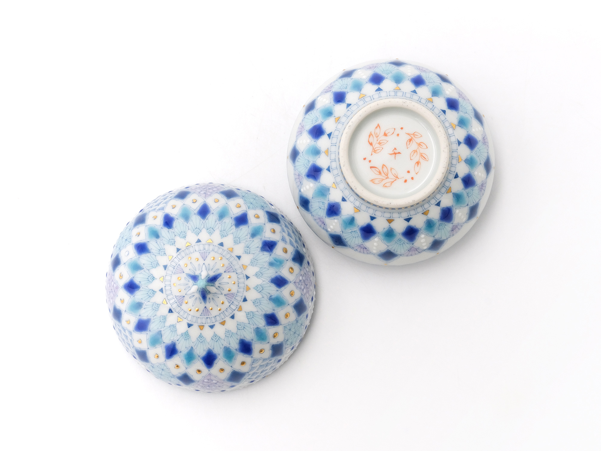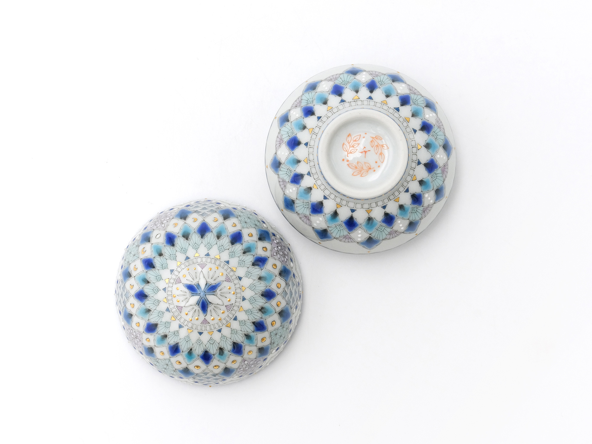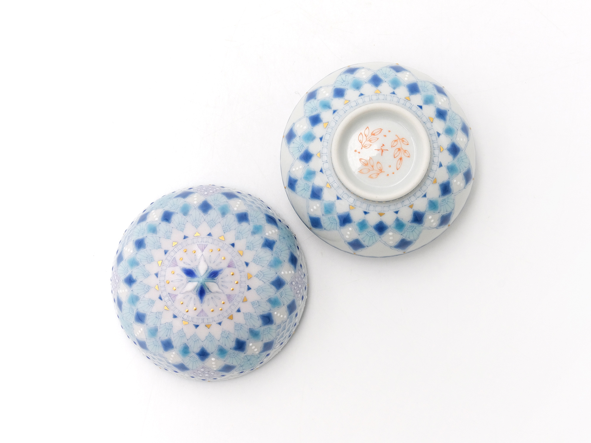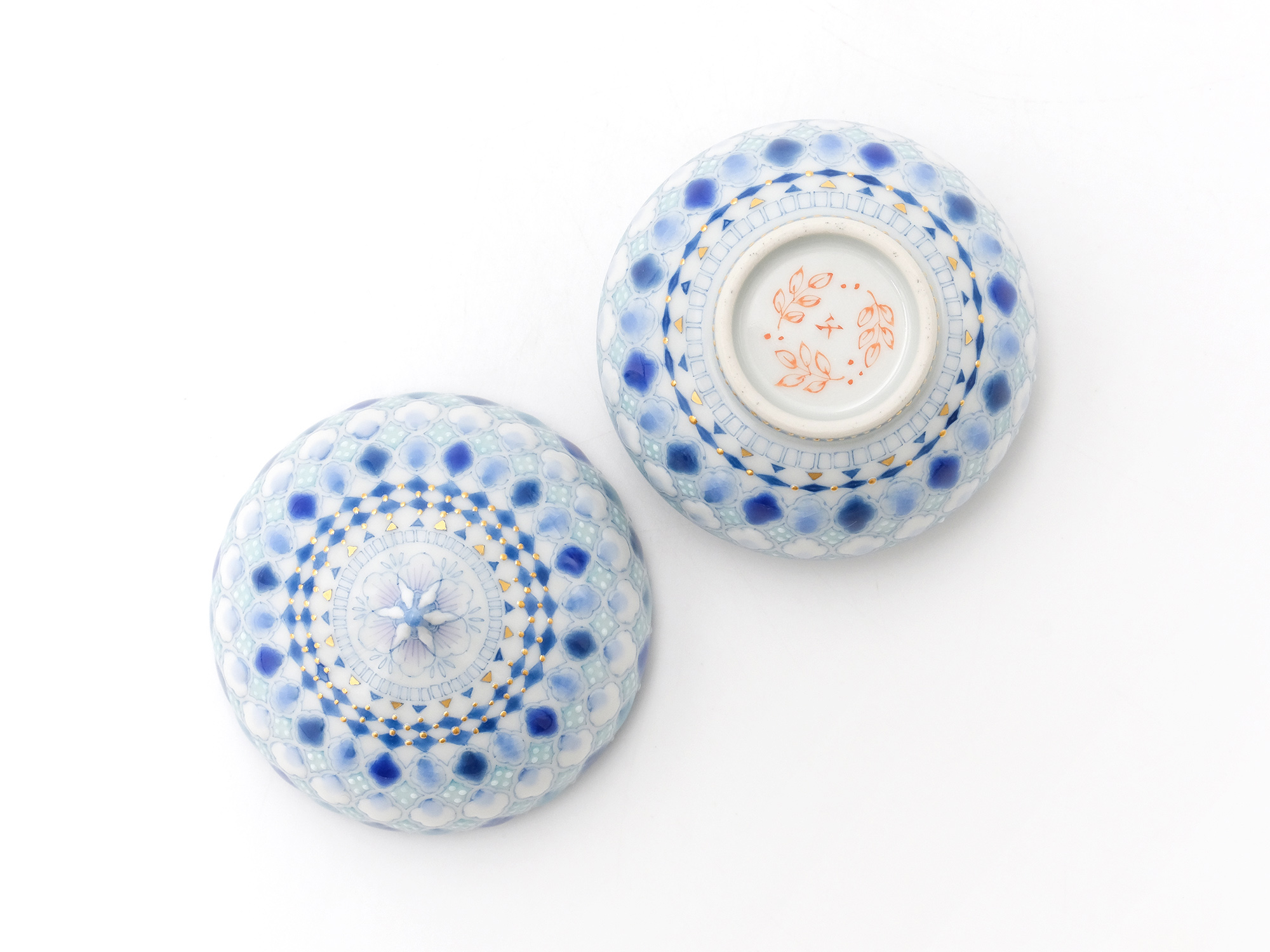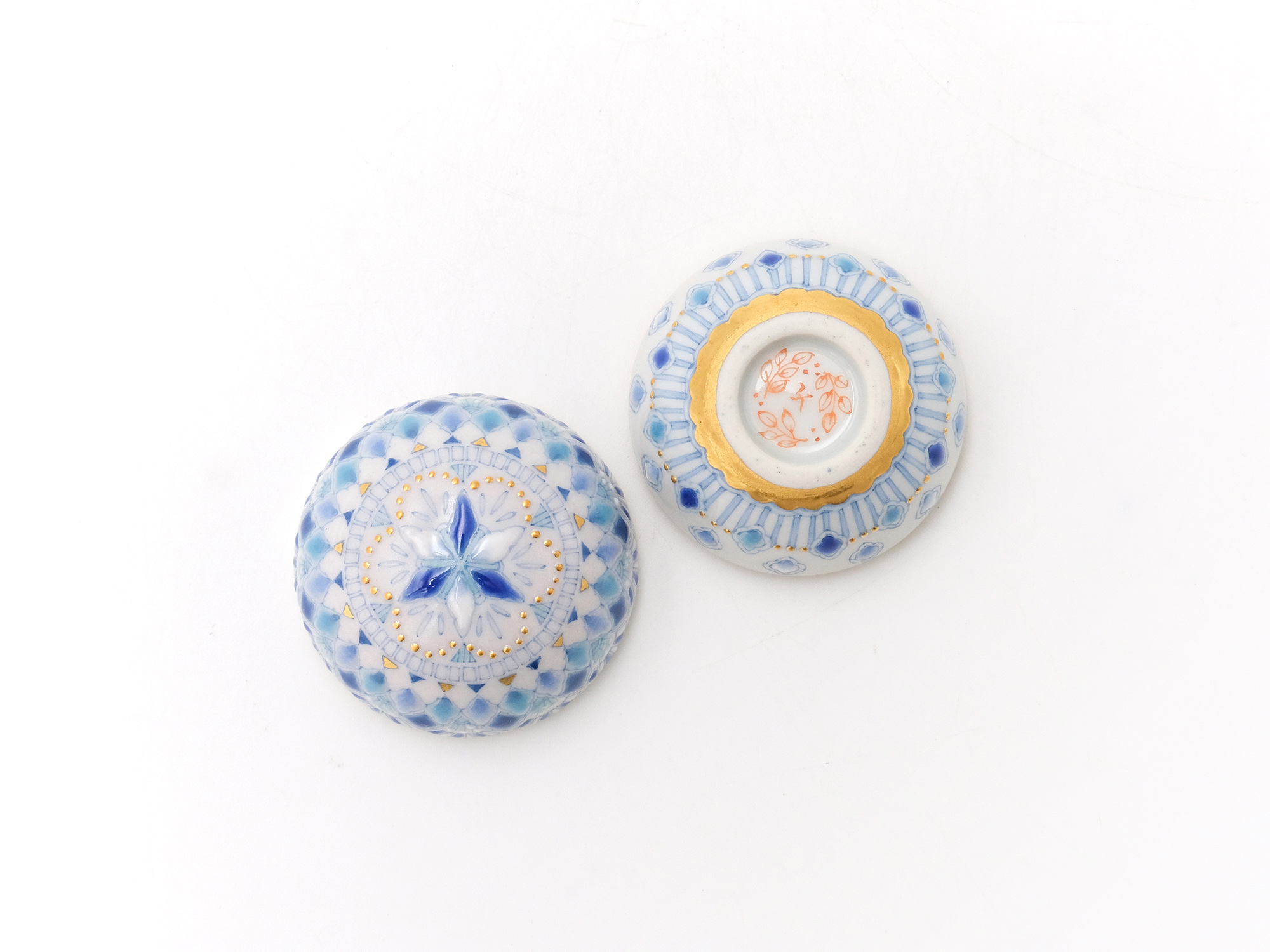早助千晴さんは、石川県の金沢市で、磁器に美しい絵付けをなさる九谷焼の女流作家です。 その作品は青色を基本に、エキゾチックで細かな幾何学文様が描かれています。 その文様のモチーフは月の満ち欠けや星といったもので、彼女が描く世界観は、他の誰とも似ておらず、唯一無二のものです。 旅へといざなう様な異国情緒漂う作品と、心豊かで誠実なお人柄も相まって、愛陶家の皆様の心を掴んで離しません。もちろん、かくいう私も早助ファンの一人です。