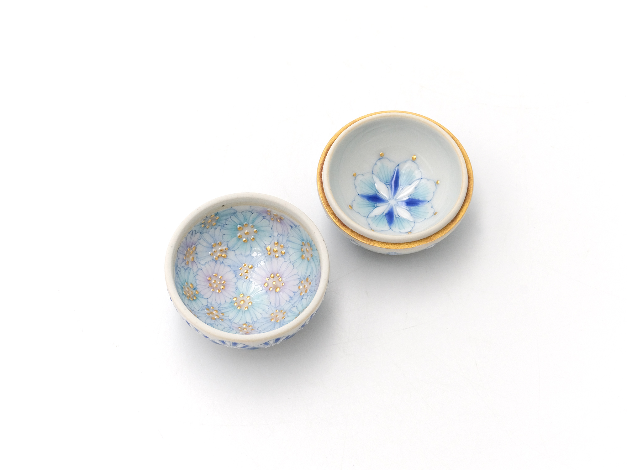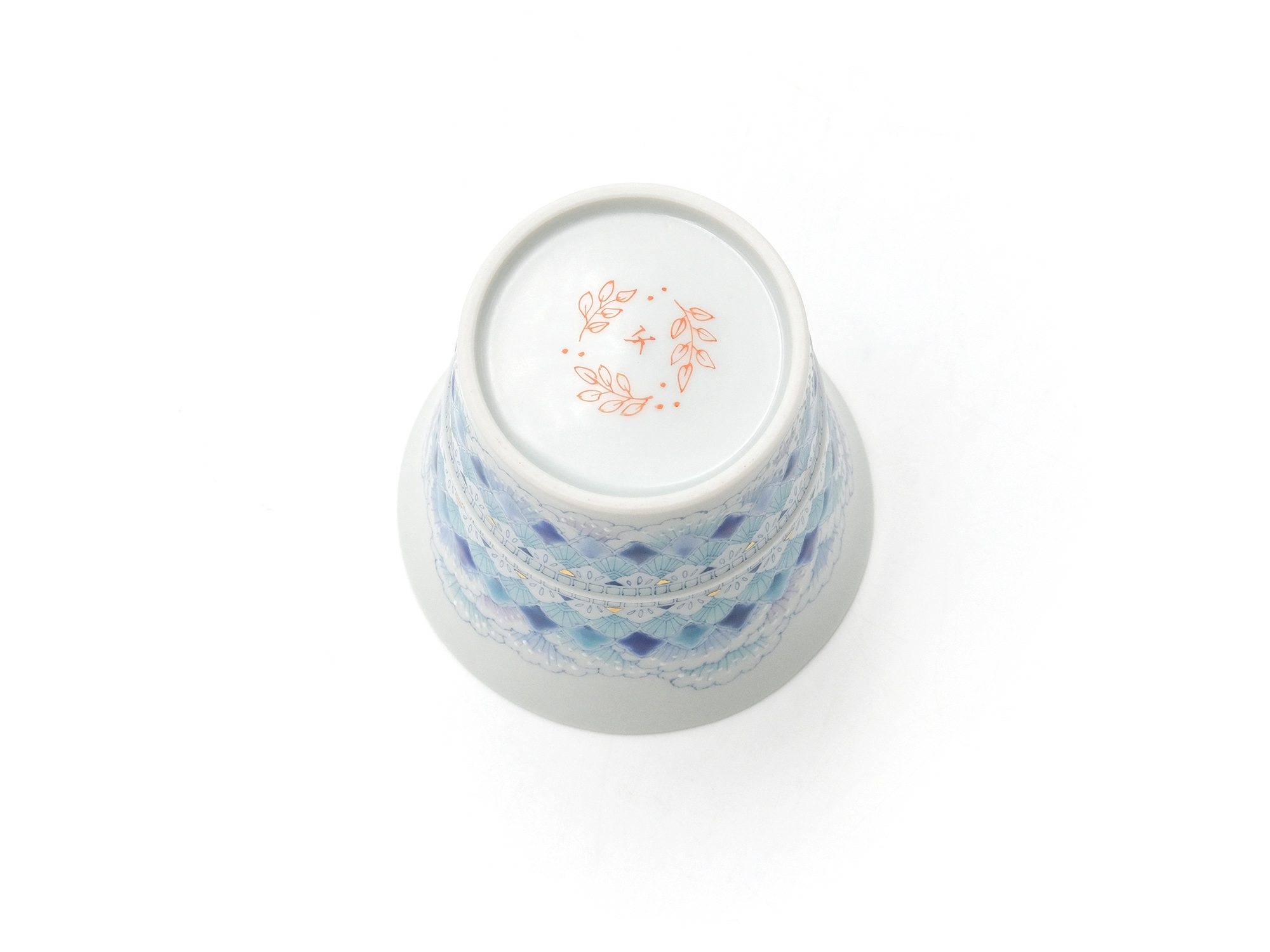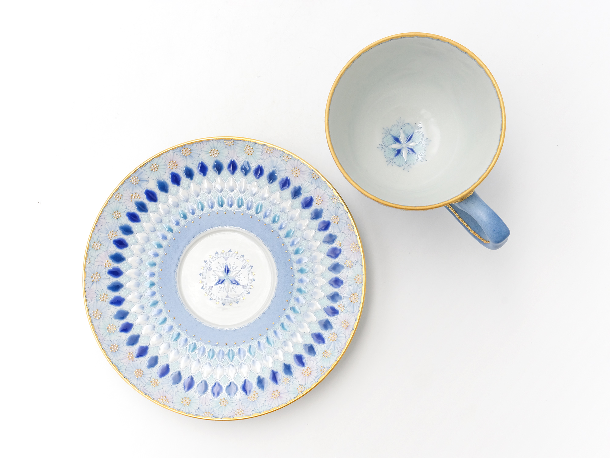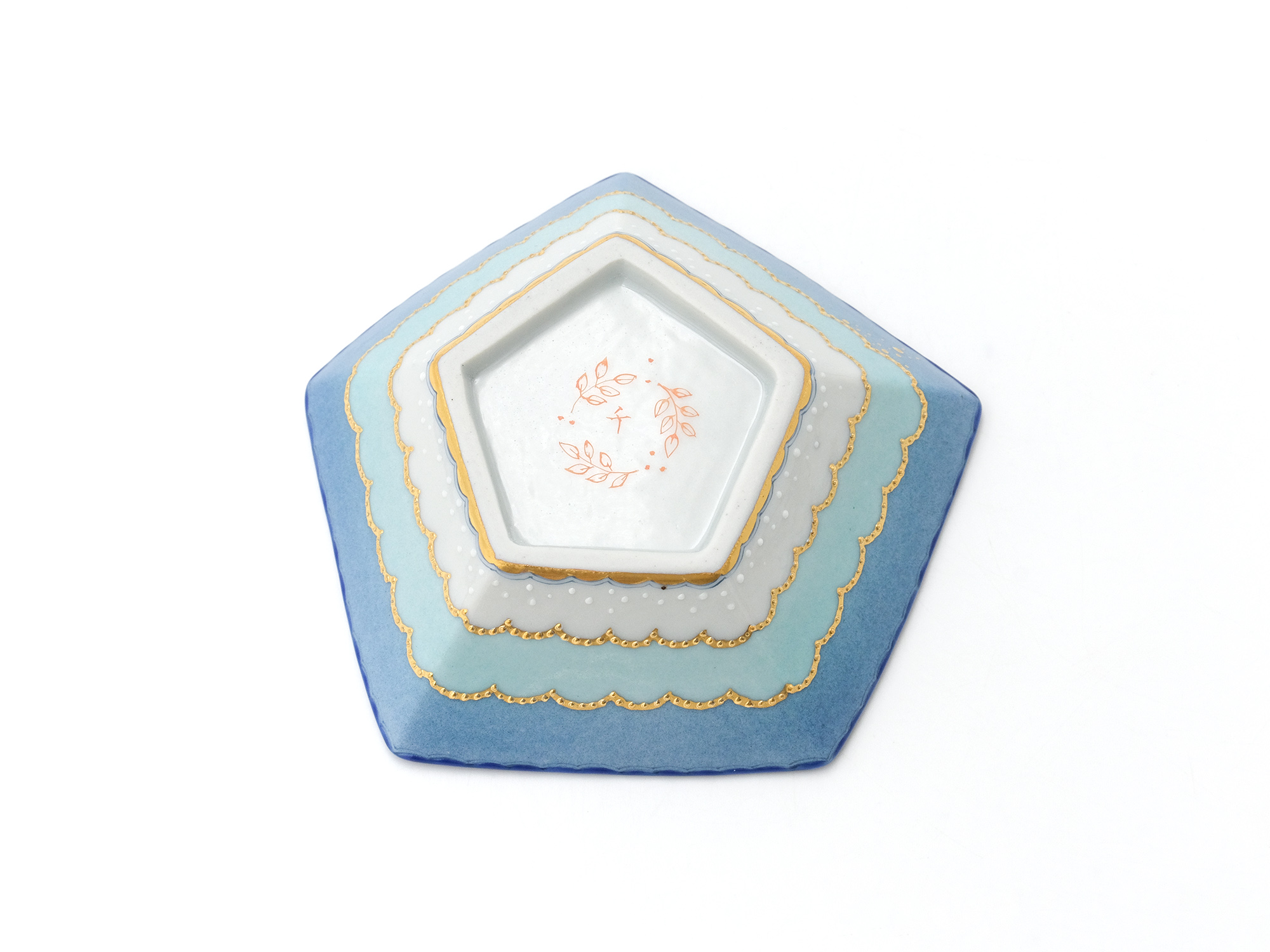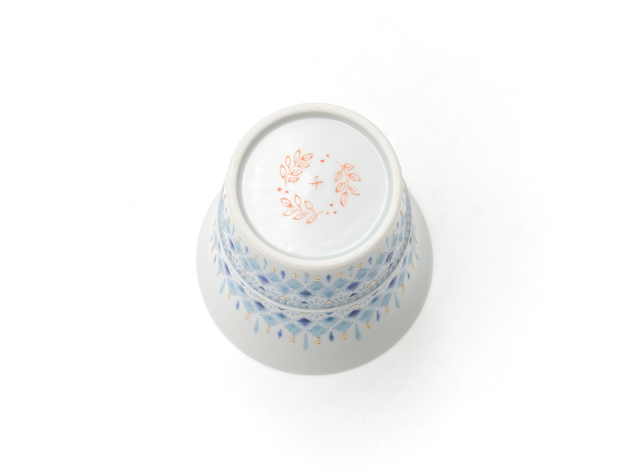 早助千晴さんは、石川県の金沢市で、磁器に美しい絵付けをなさる九谷焼の女流作家です。 その作品は青色を基本に、エキゾチックで細かな幾何学文様が描かれています。 その文様のモチーフは月の満ち欠けや星といったもので、彼女が描く世界観は、他の誰とも似ておらず、唯一無二のものです。 旅へといざなう様な異国情緒漂う作品と、心豊かで誠実なお人柄も相まって、愛陶家の皆様の心を掴んで離しません。もちろん、かくいう私も早助ファンの一人です。