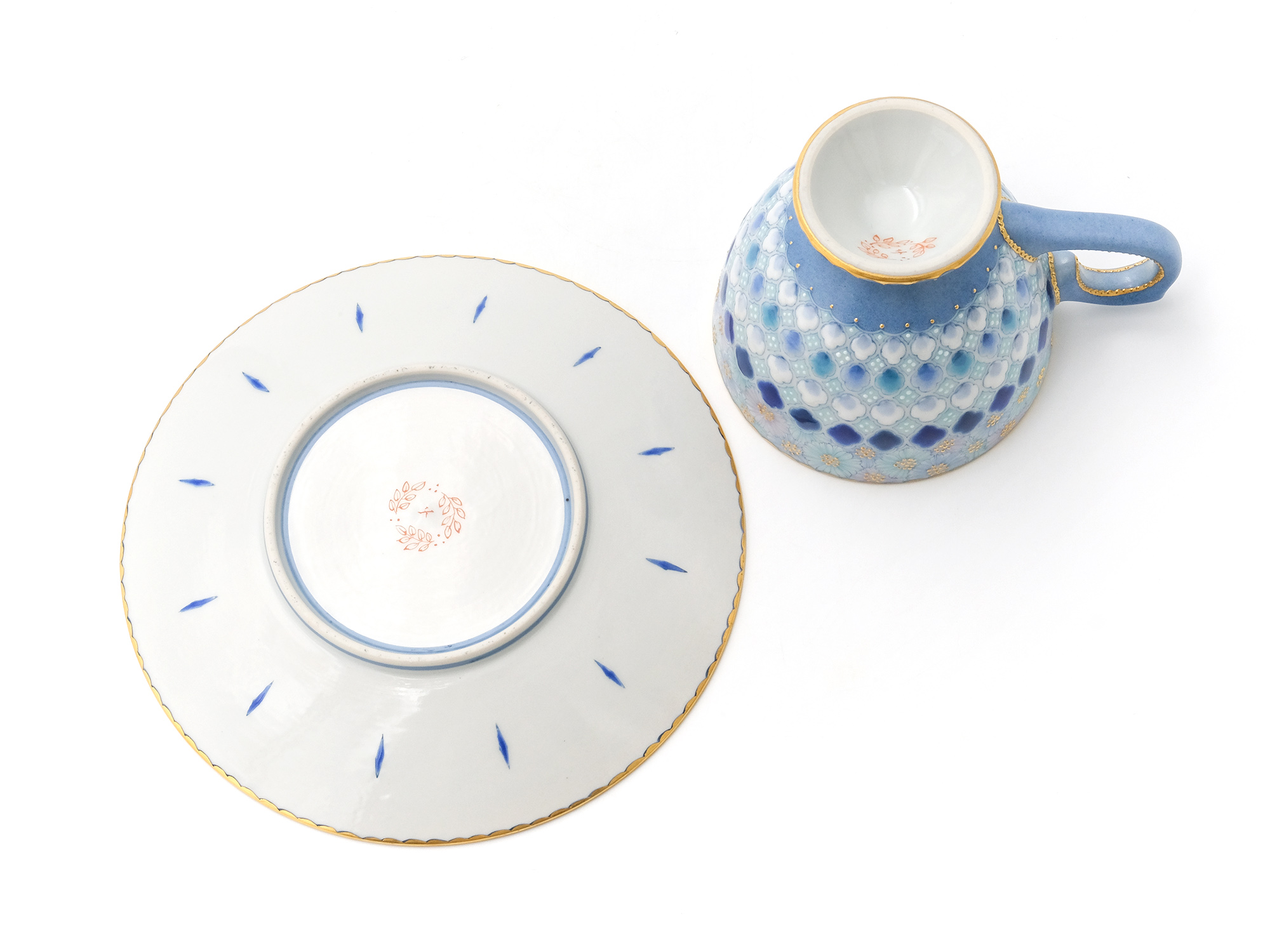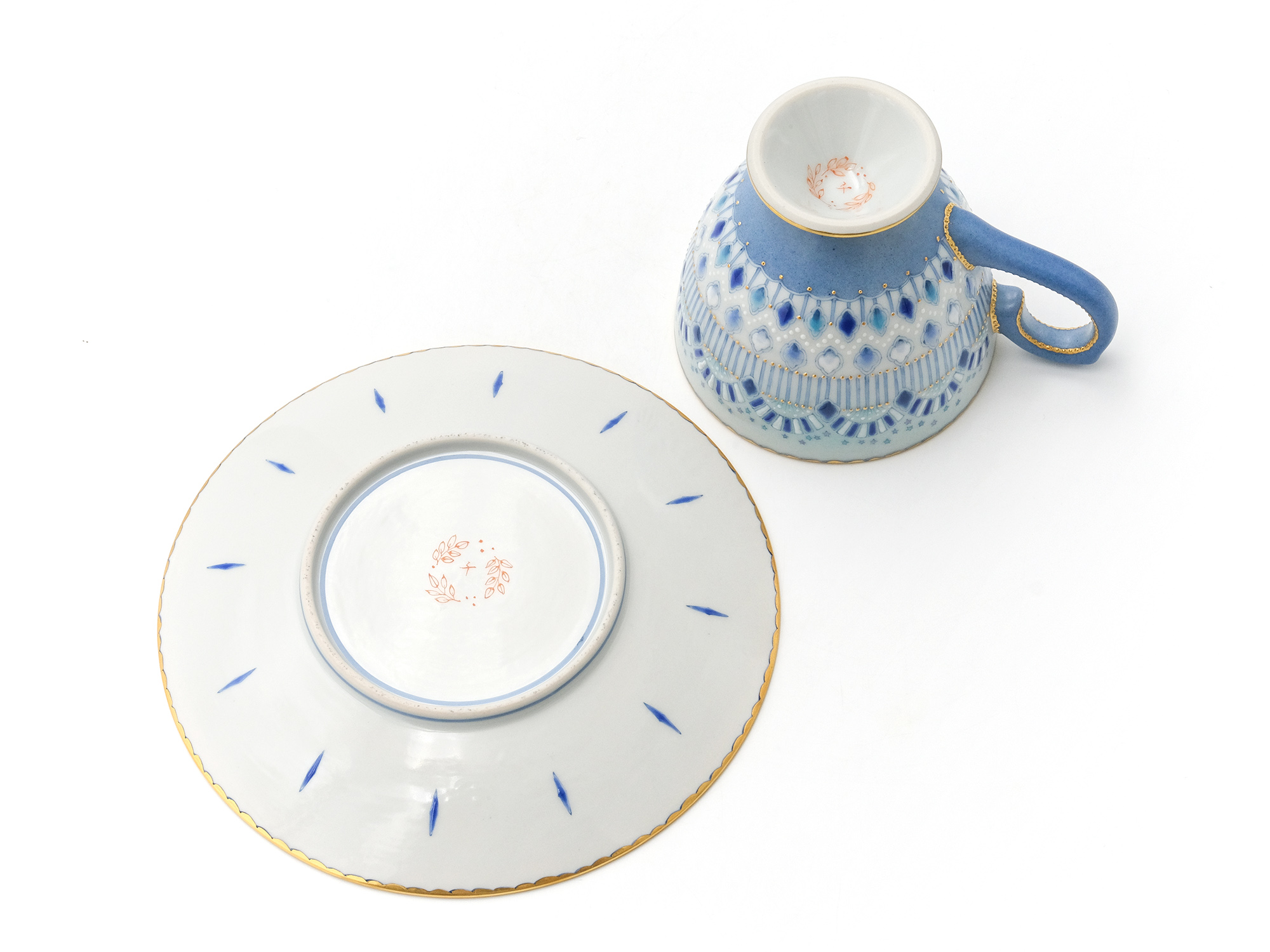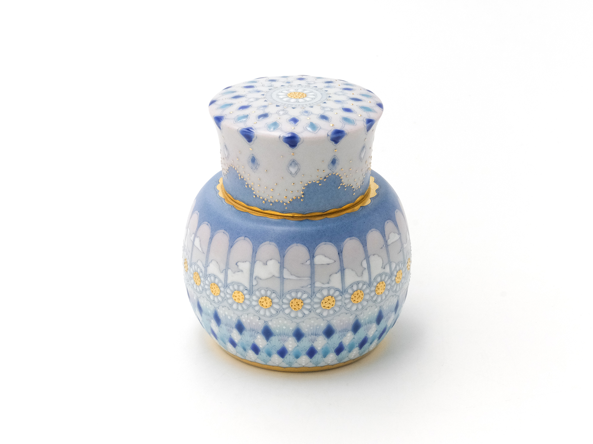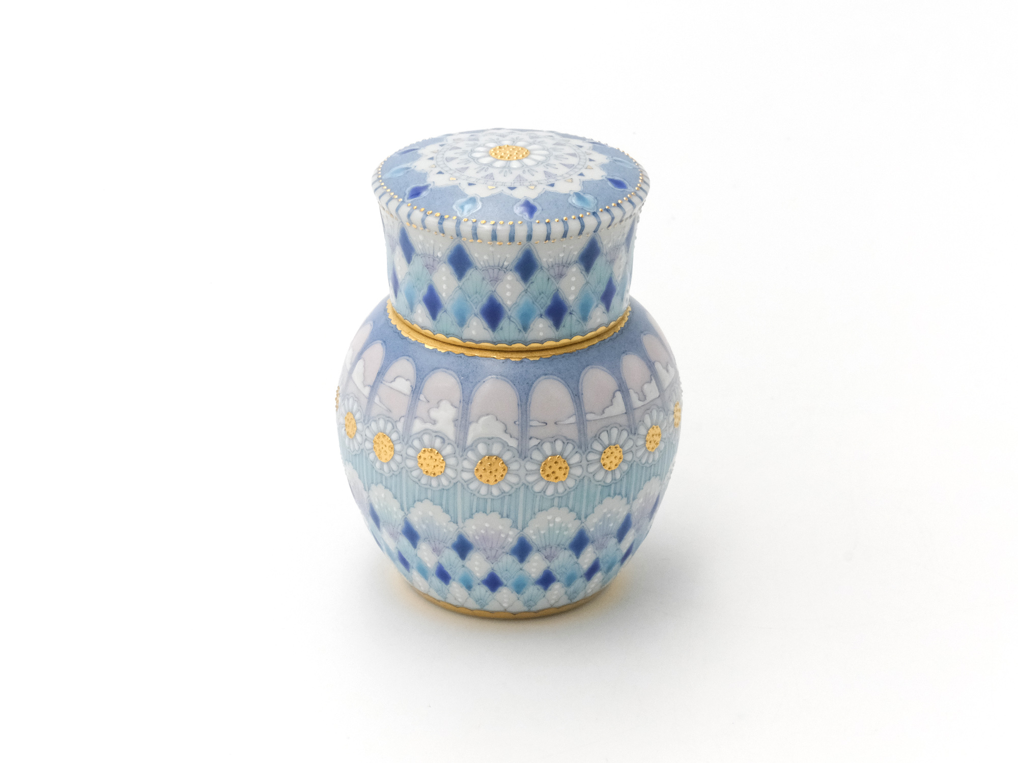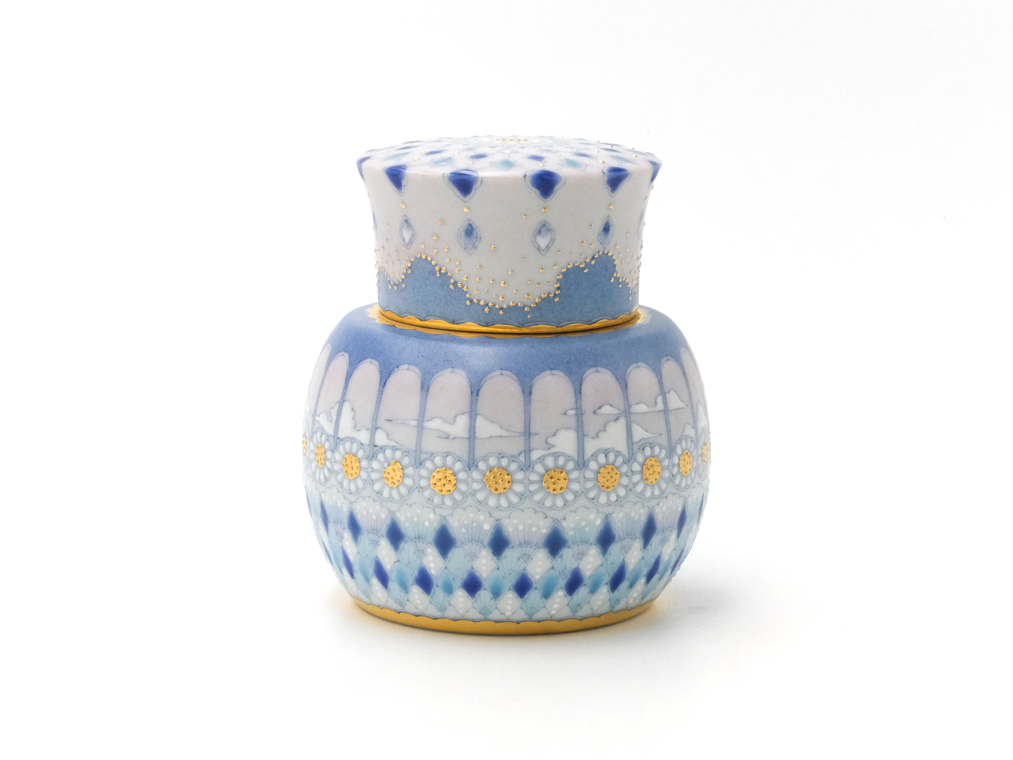 早助千晴さんは、石川県の金沢市で、磁器に美しい絵付けをなさる九谷焼の女流作家です。 その作品は青色を基本に、エキゾチックで細かな幾何学文様が描かれています。 その文様のモチーフは月の満ち欠けや星といったもので、彼女が描く世界観は、他の誰とも似ておらず、唯一無二のものです。 旅へといざなう様な異国情緒漂う作品と、心豊かで誠実なお人柄も相まって、愛陶家の皆様の心を掴んで離しません。もちろん、かくいう私も早助ファンの一人です。