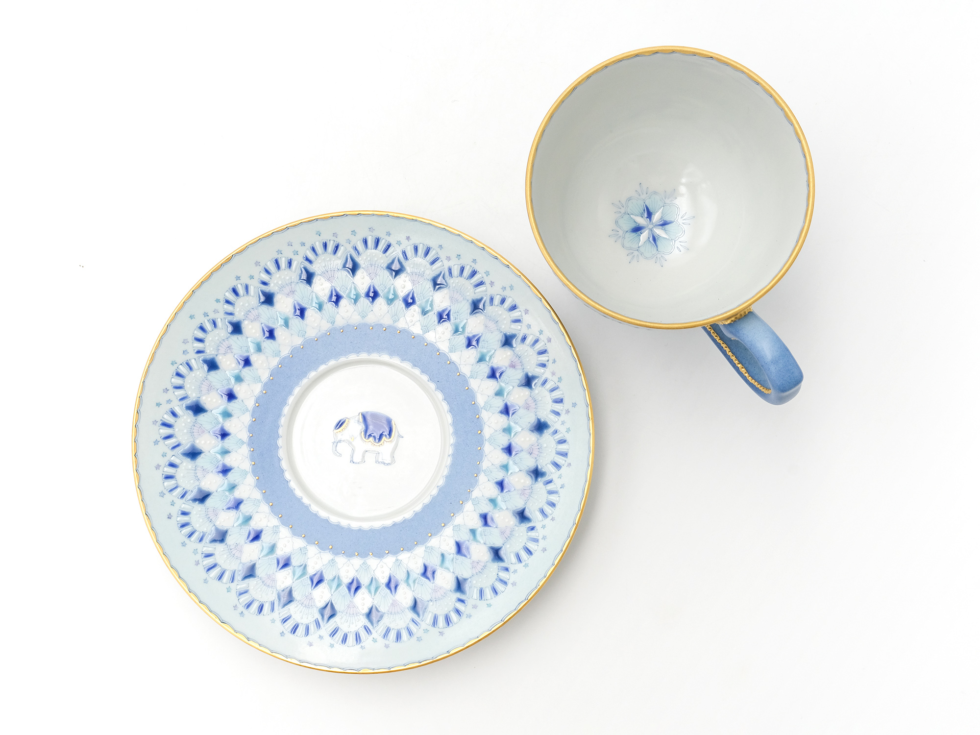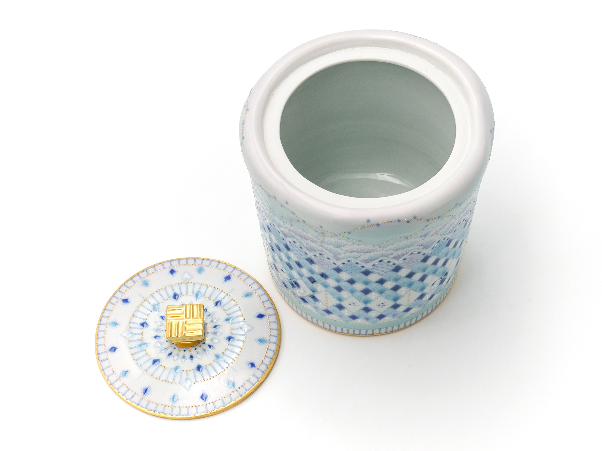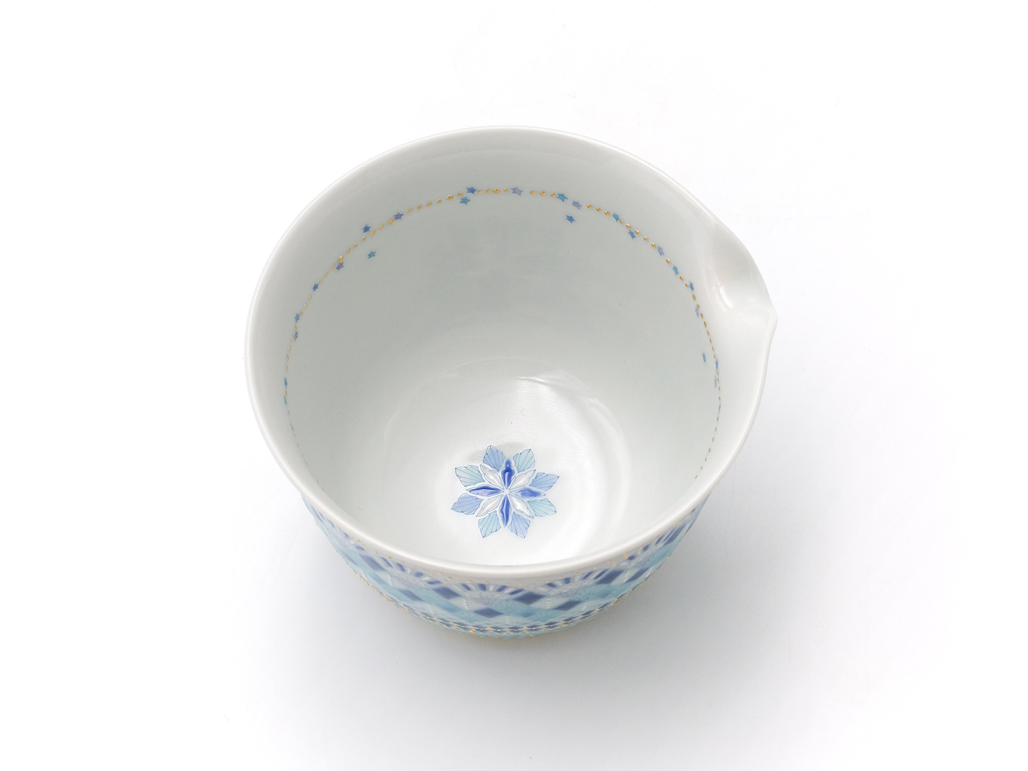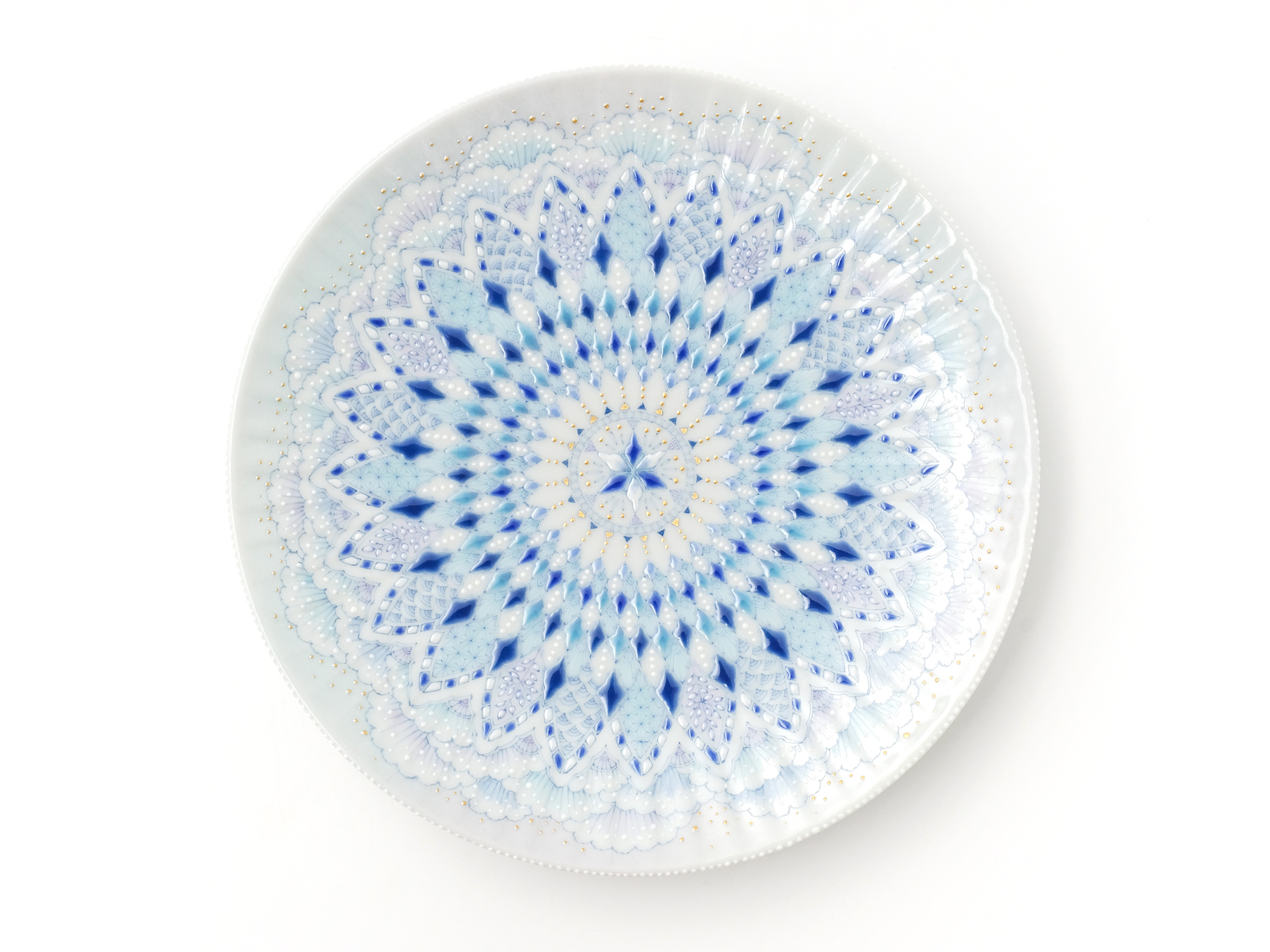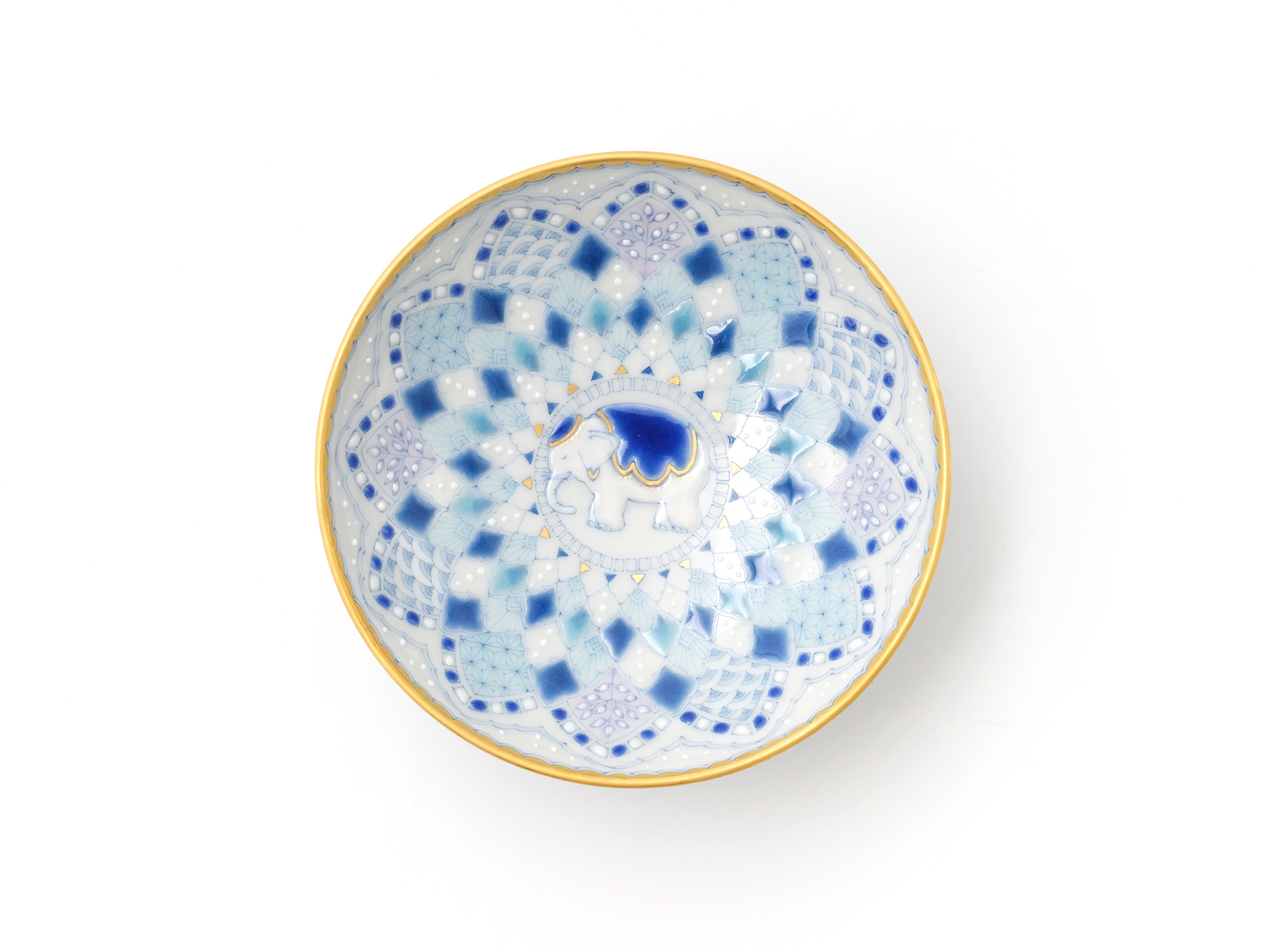 早助千晴さんは、石川県の金沢市で、磁器に美しい絵付けをなさる九谷焼の女流作家です。 その作品は青色を基本に、エキゾチックで細かな幾何学文様が描かれています。 その文様のモチーフは月の満ち欠けや星といったもので、彼女が描く世界観は、他の誰とも似ておらず、唯一無二のものです。 旅へといざなう様な異国情緒漂う作品と、心豊かで誠実なお人柄も相まって、愛陶家の皆様の心を掴んで離しません。もちろん、かくいう私も早助ファンの一人です。