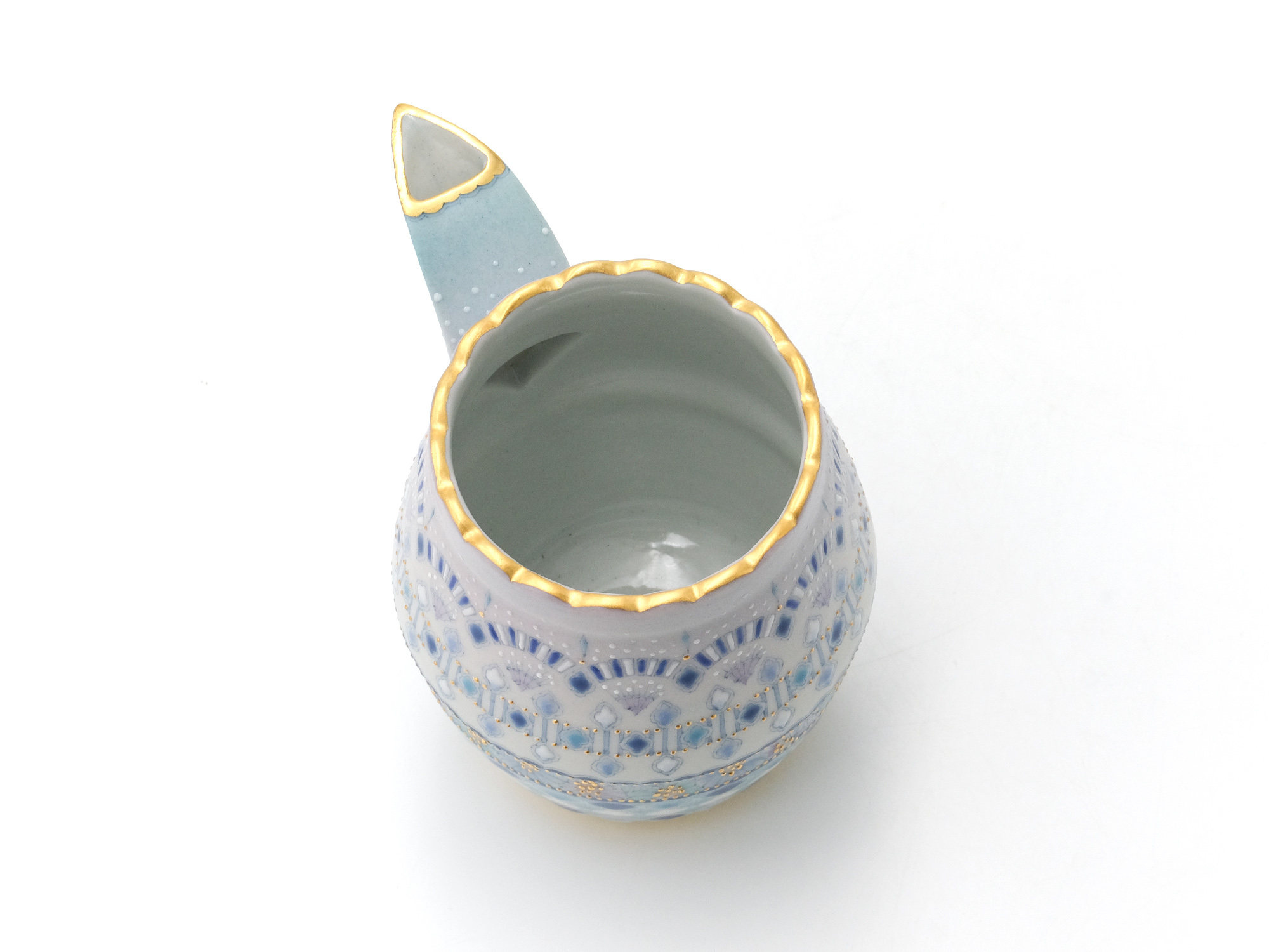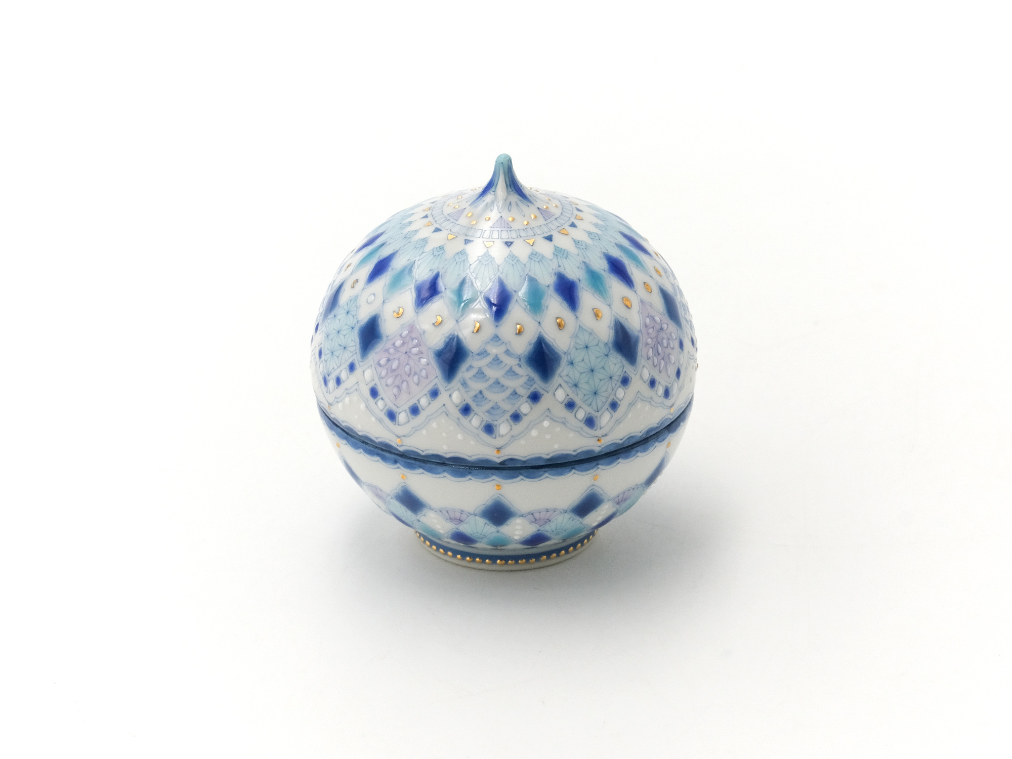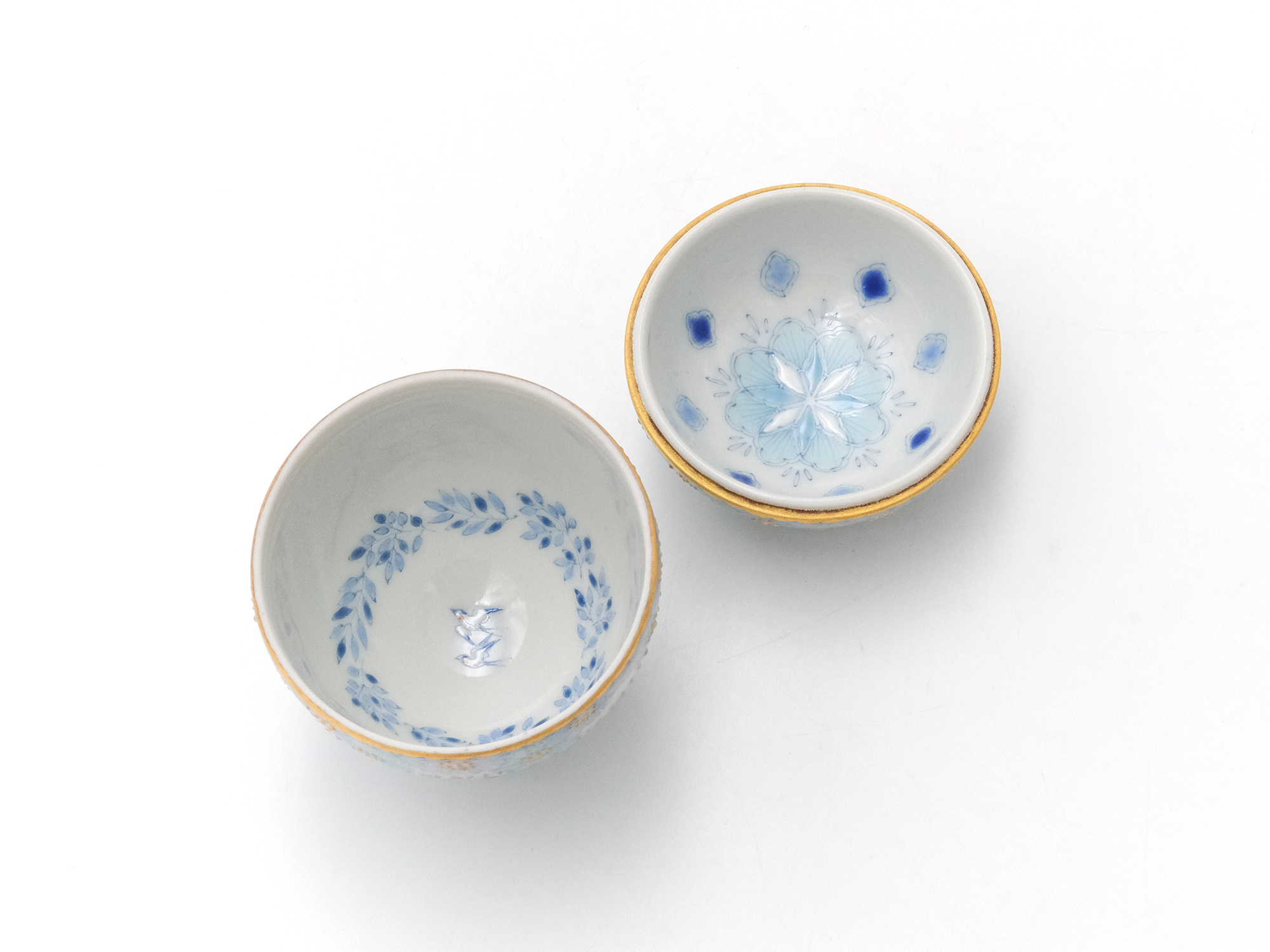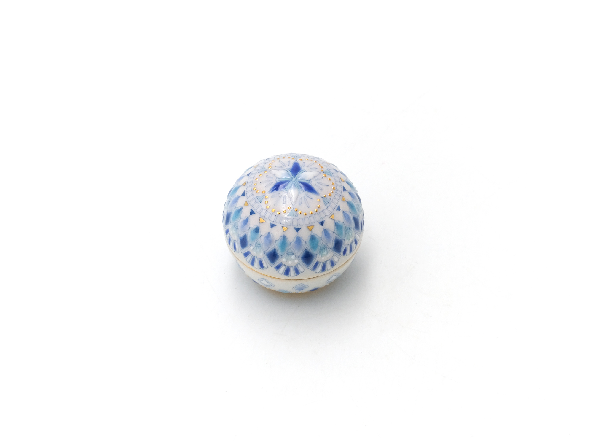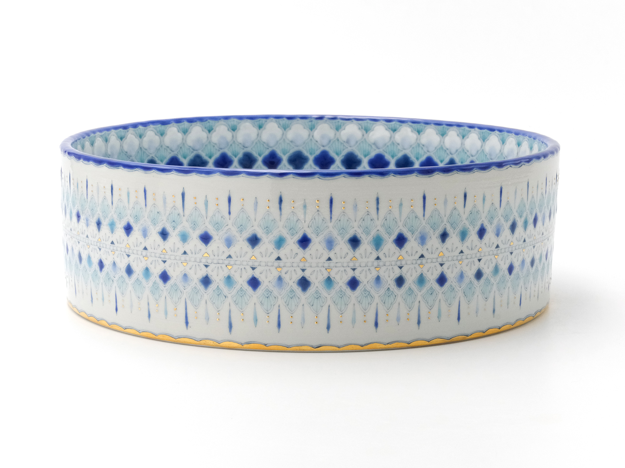 早助千晴さんは、石川県の金沢市で、磁器に美しい絵付けをなさる九谷焼の女流作家です。 その作品は青色を基本に、エキゾチックで細かな幾何学文様が描かれています。 その文様のモチーフは月の満ち欠けや星といったもので、彼女が描く世界観は、他の誰とも似ておらず、唯一無二のものです。 旅へといざなう様な異国情緒漂う作品と、心豊かで誠実なお人柄も相まって、愛陶家の皆様の心を掴んで離しません。もちろん、かくいう私も早助ファンの一人です。
