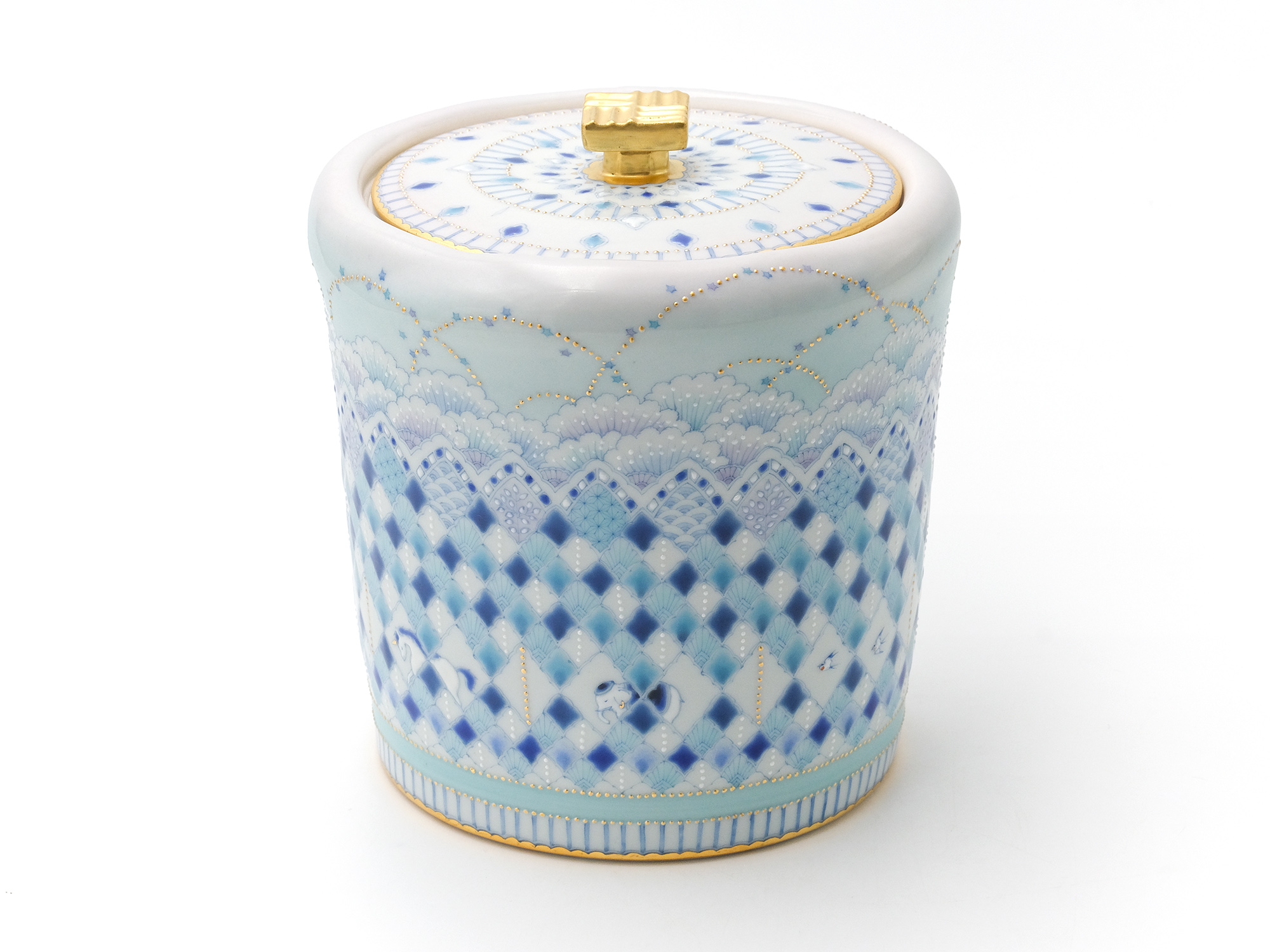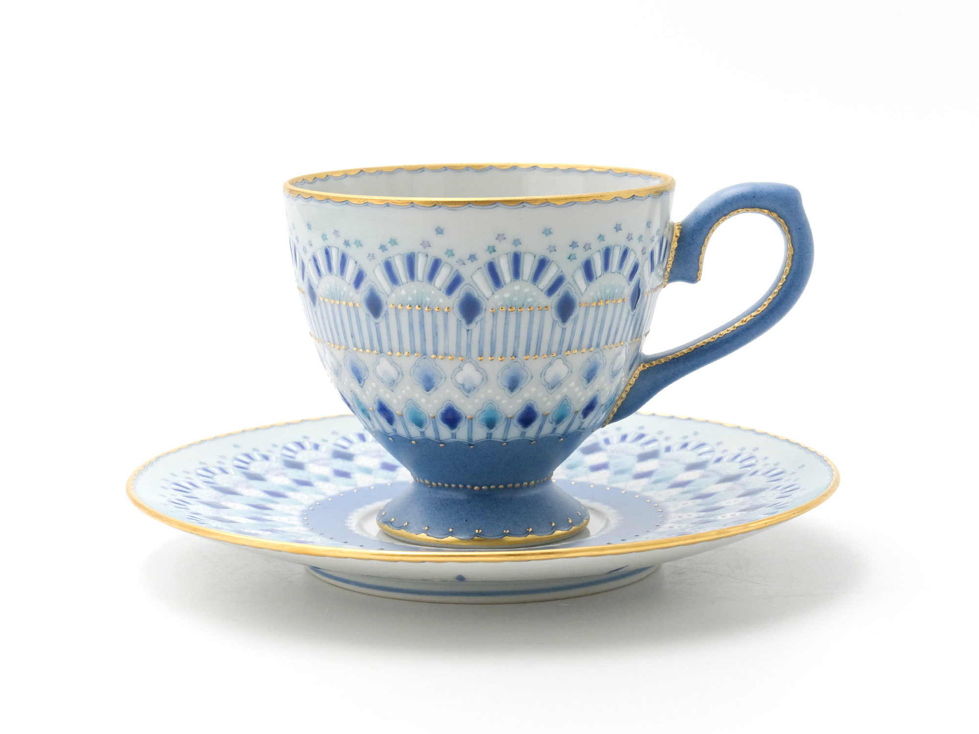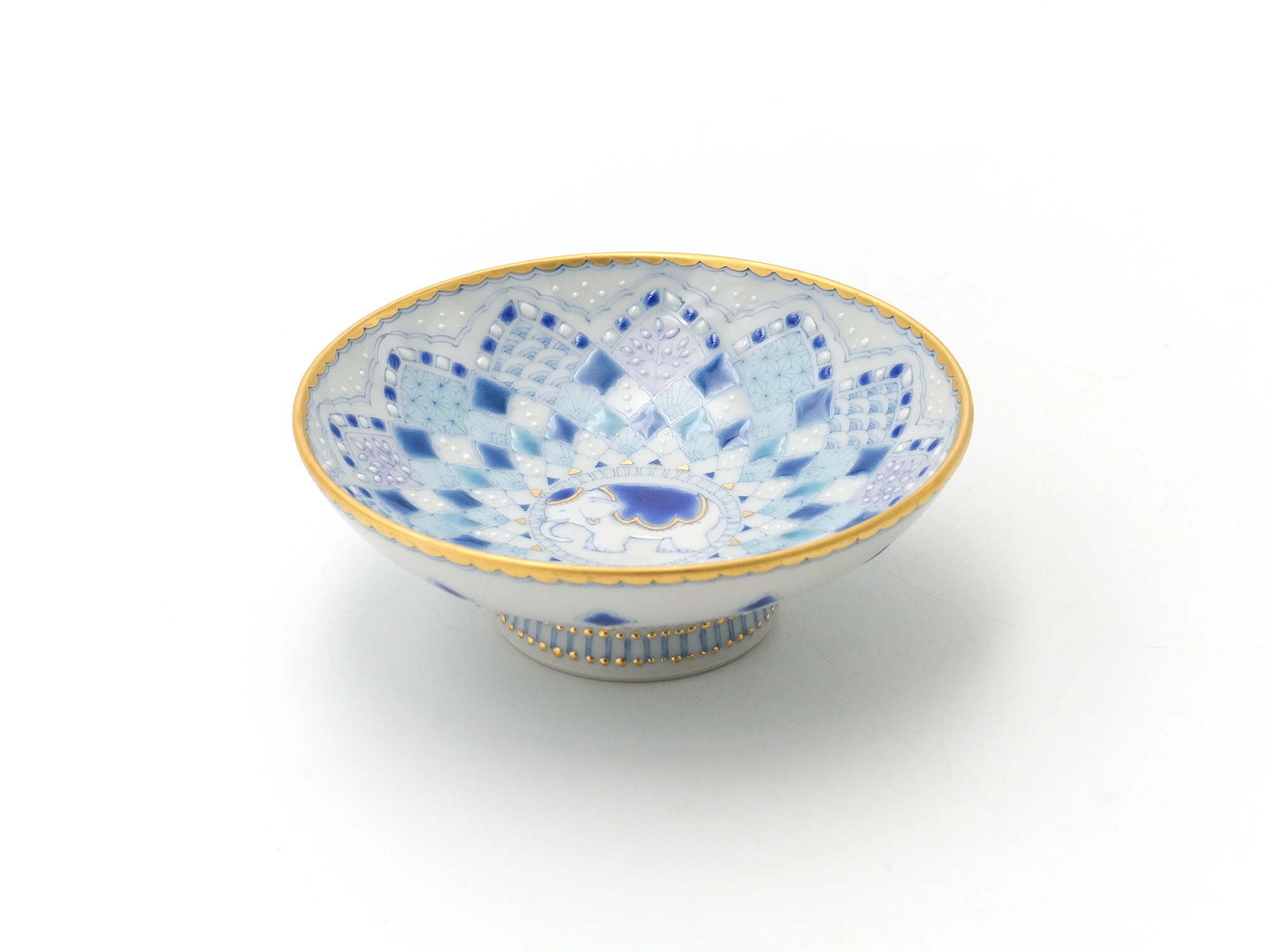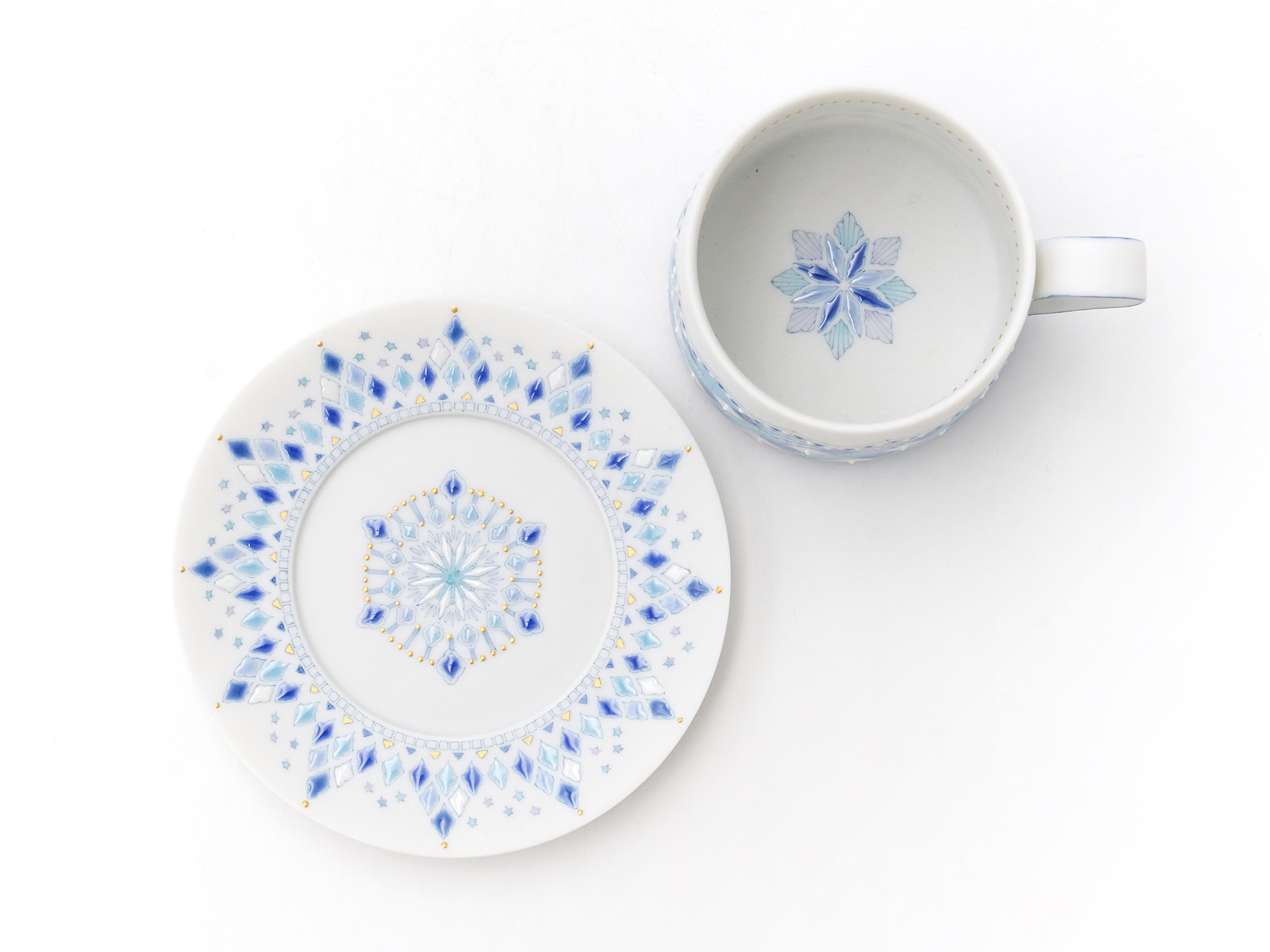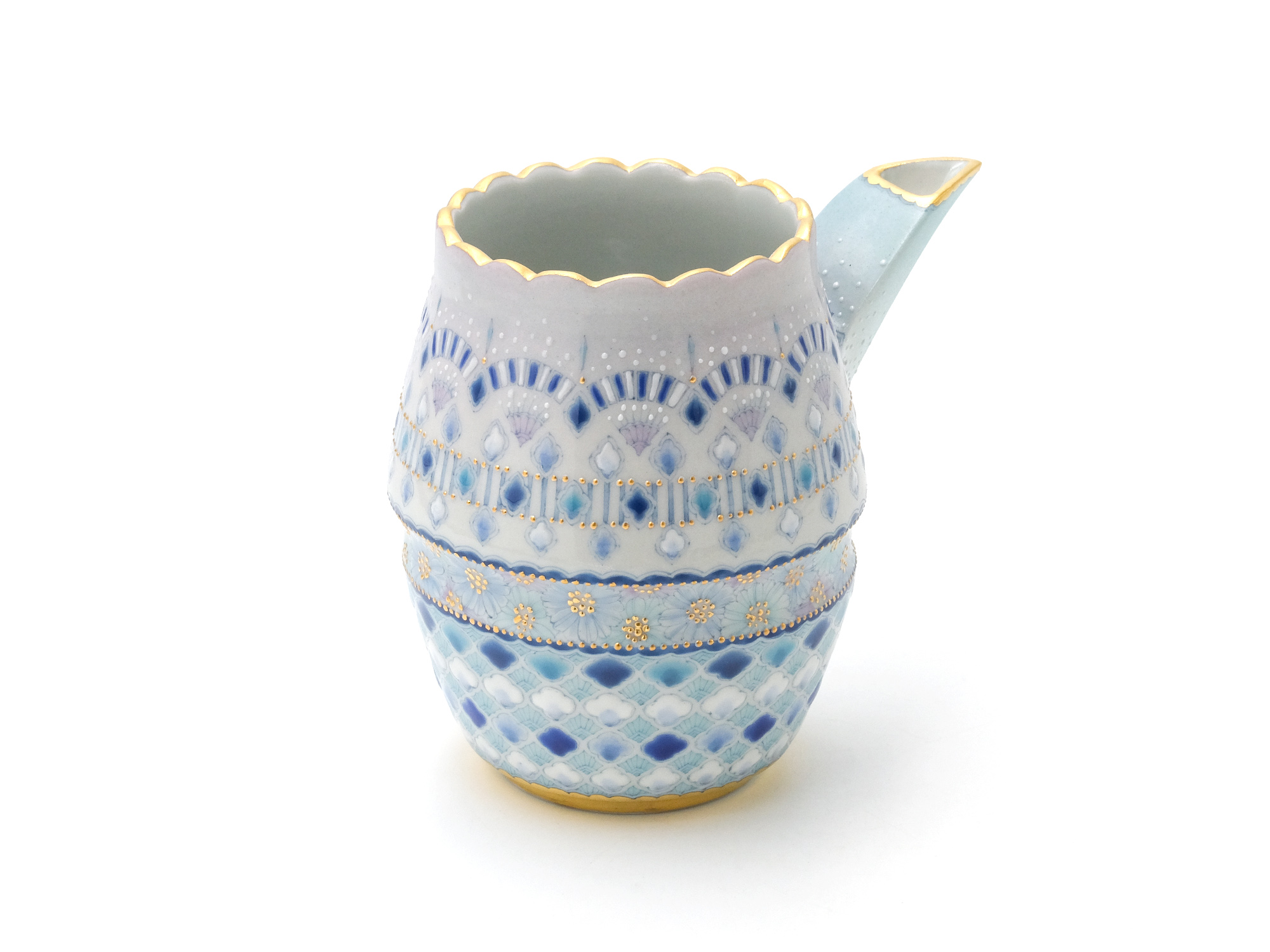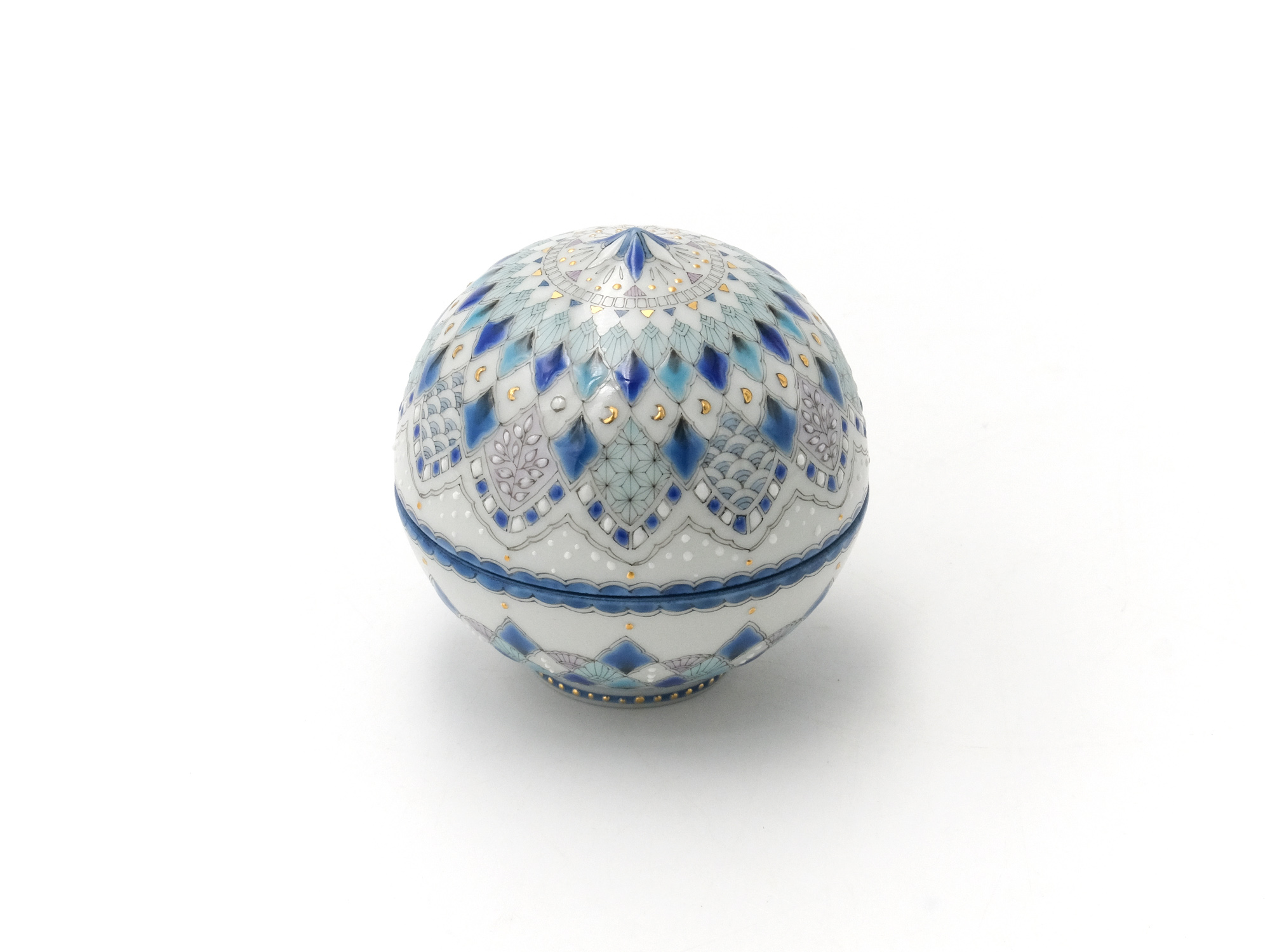 早助千晴さんは、石川県の金沢市で、磁器に美しい絵付けをなさる九谷焼の女流作家です。 その作品は青色を基本に、エキゾチックで細かな幾何学文様が描かれています。 その文様のモチーフは月の満ち欠けや星といったもので、彼女が描く世界観は、他の誰とも似ておらず、唯一無二のものです。 旅へといざなう様な異国情緒漂う作品と、心豊かで誠実なお人柄も相まって、愛陶家の皆様の心を掴んで離しません。もちろん、かくいう私も早助ファンの一人です。