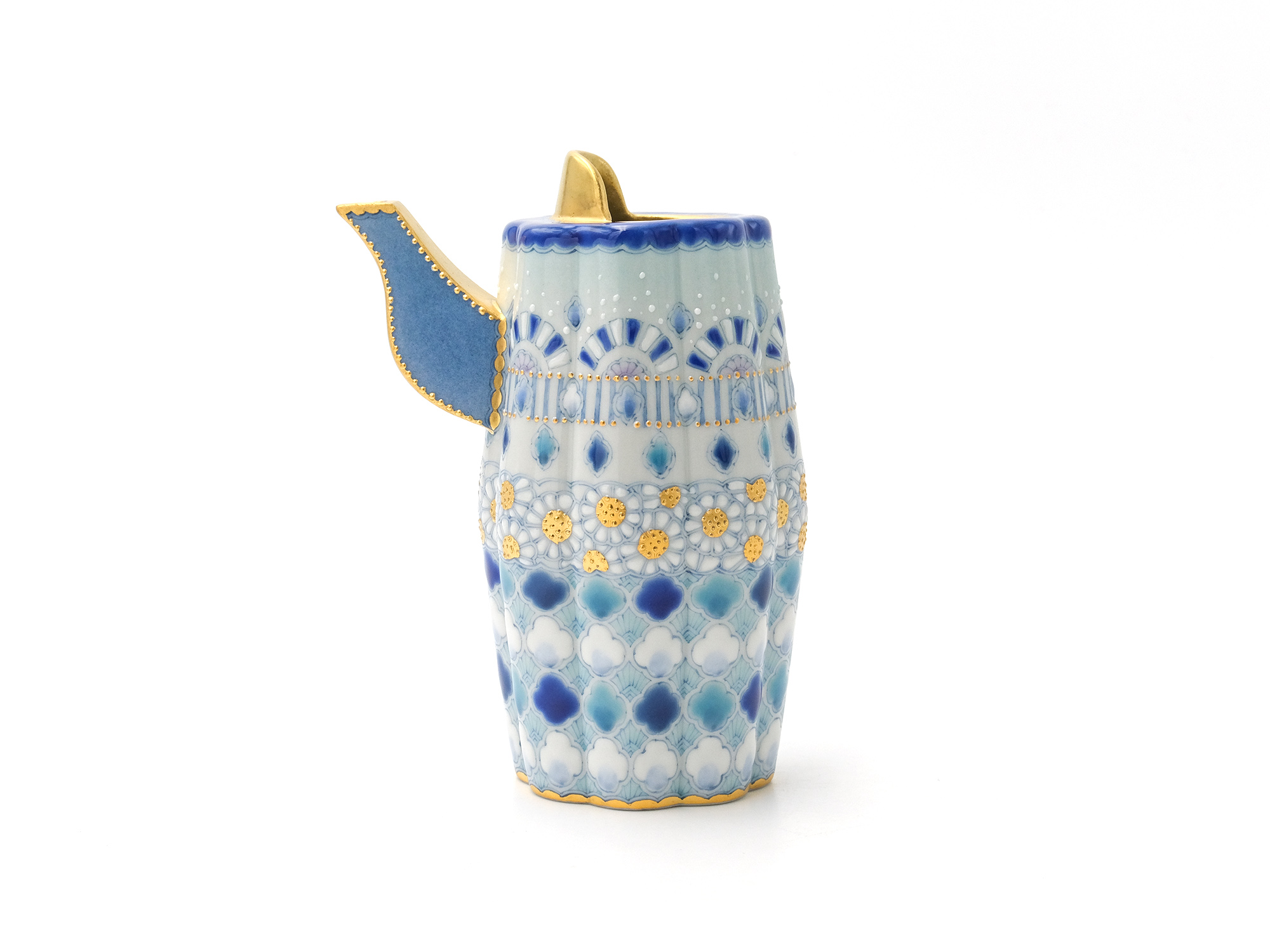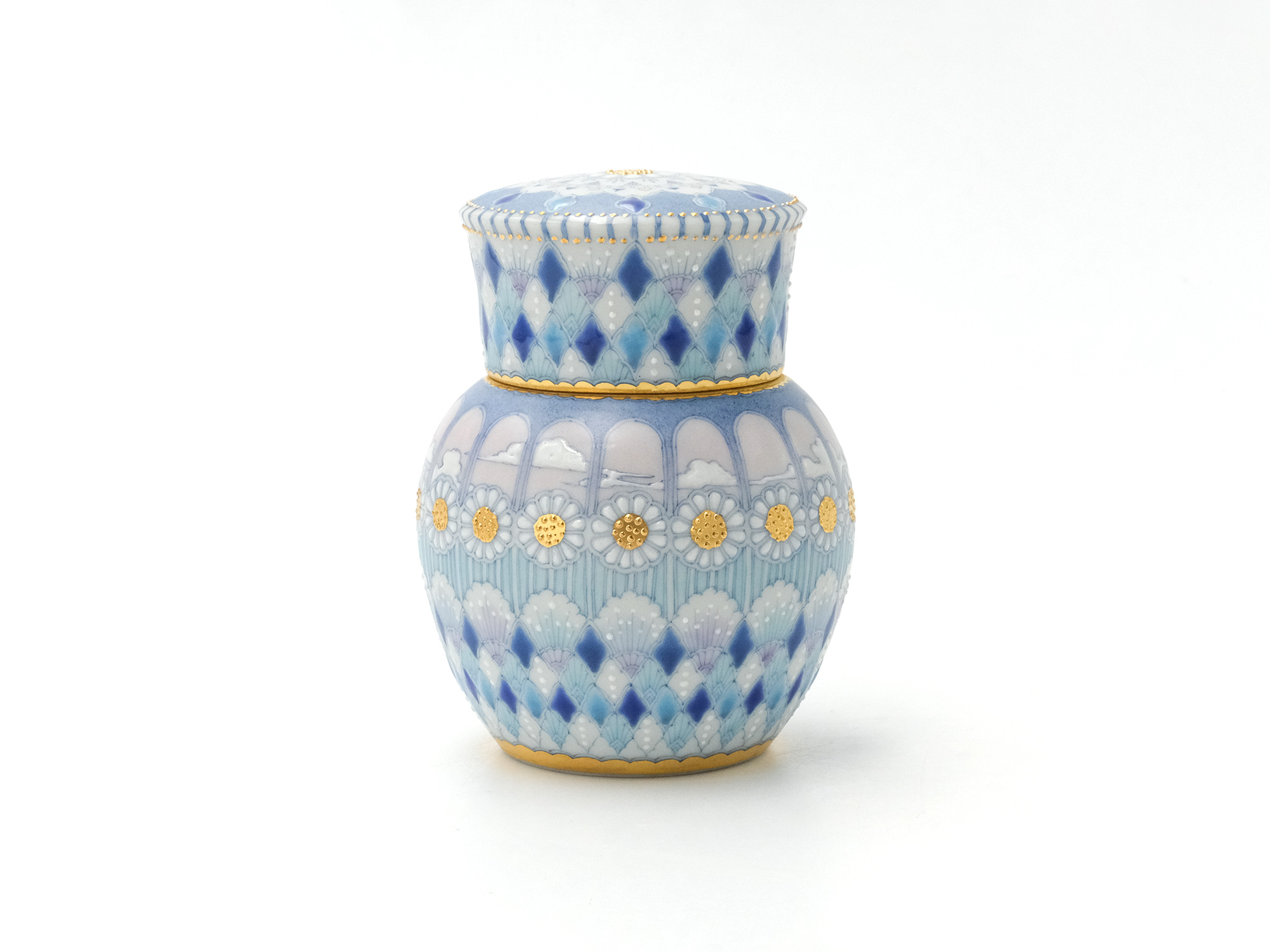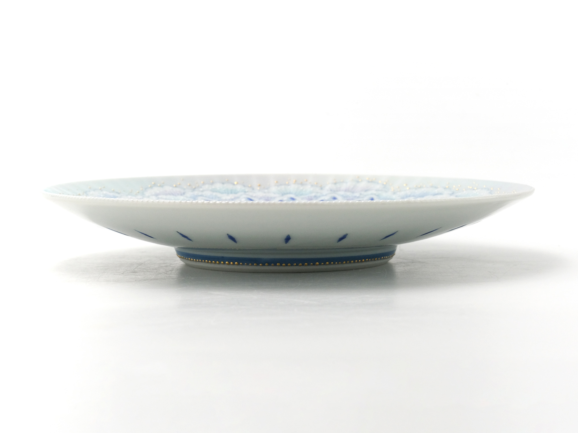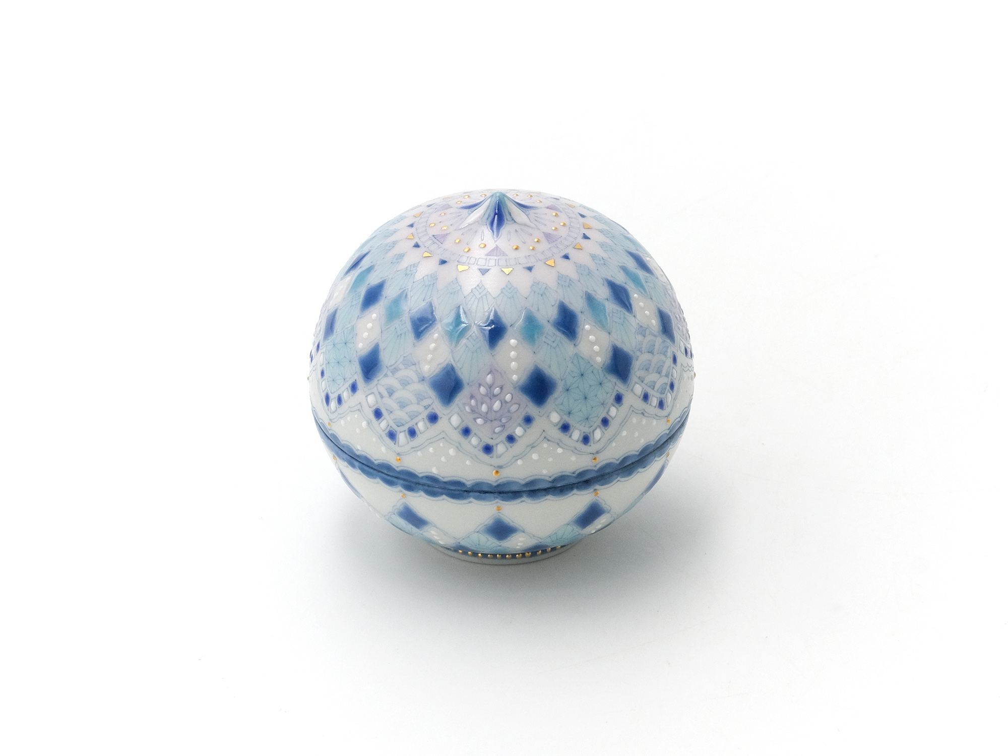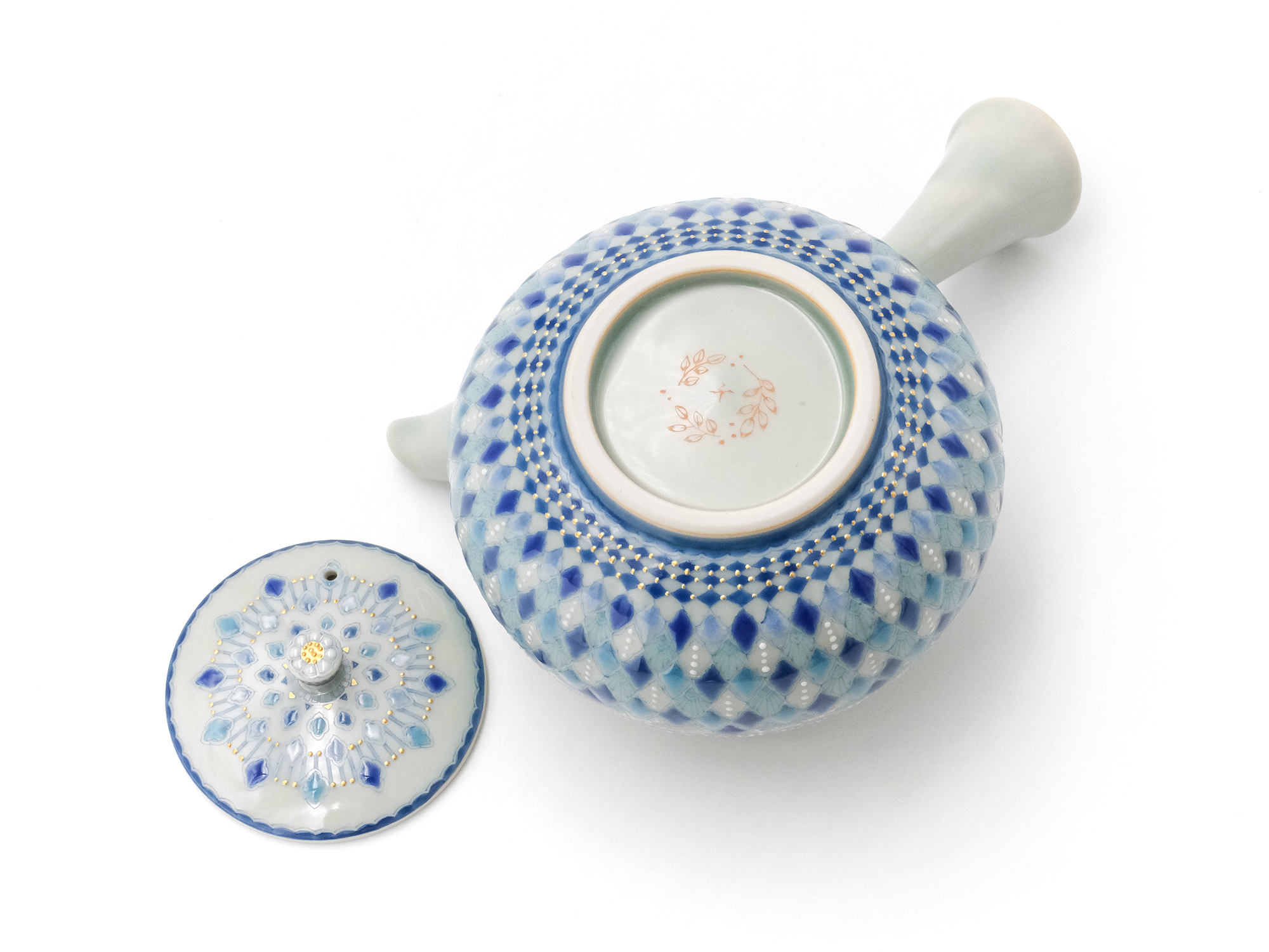 早助千晴さんは、石川県の金沢市で、磁器に美しい絵付けをなさる九谷焼の女流作家です。 その作品は青色を基本に、エキゾチックで細かな幾何学文様が描かれています。 その文様のモチーフは月の満ち欠けや星といったもので、彼女が描く世界観は、他の誰とも似ておらず、唯一無二のものです。 旅へといざなう様な異国情緒漂う作品と、心豊かで誠実なお人柄も相まって、愛陶家の皆様の心を掴んで離しません。もちろん、かくいう私も早助ファンの一人です。