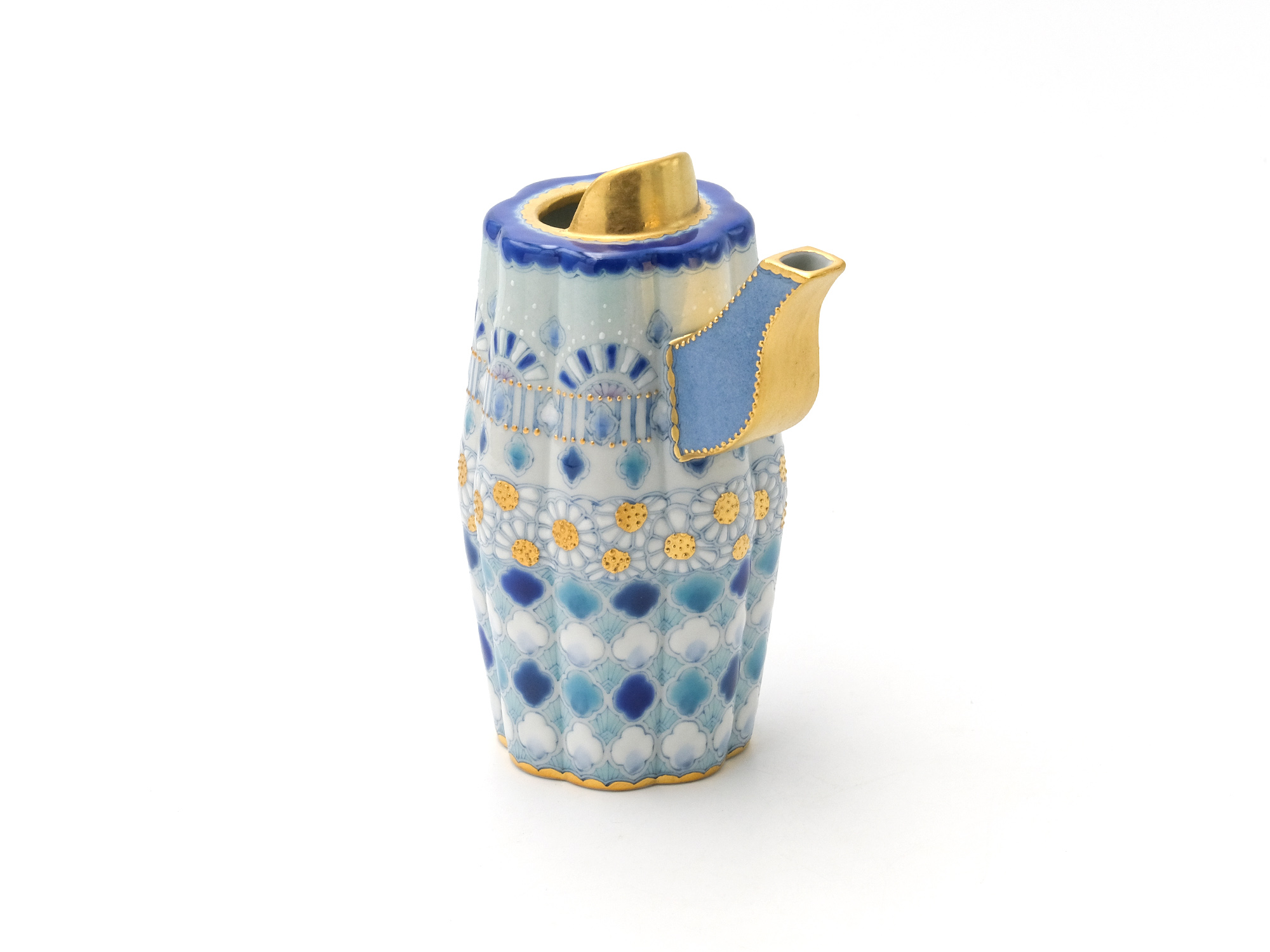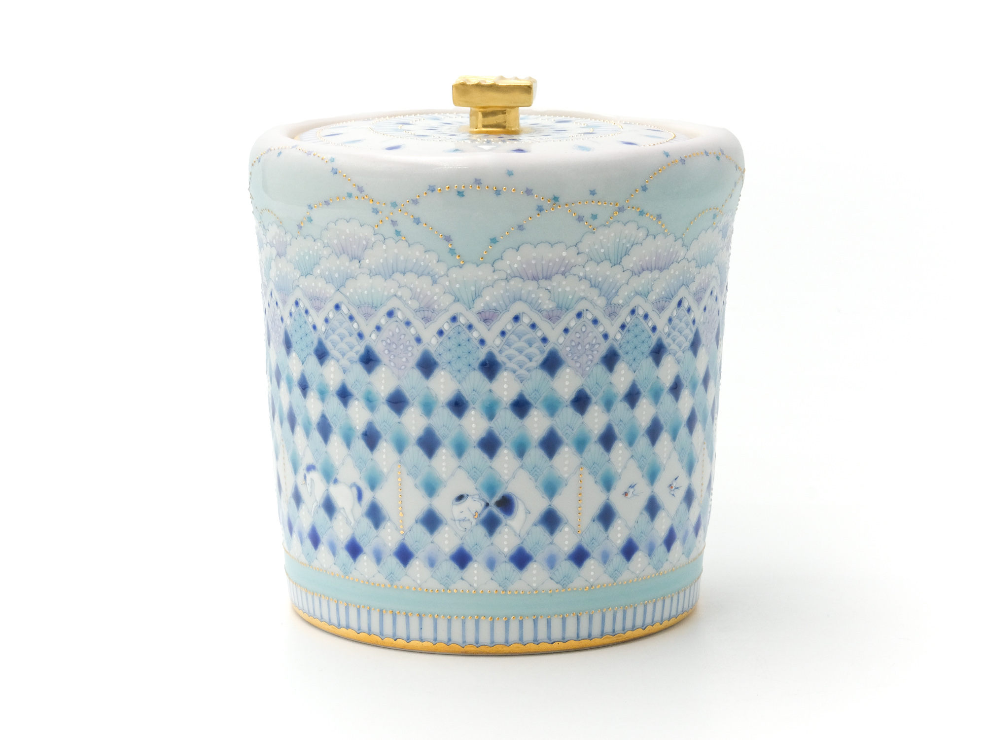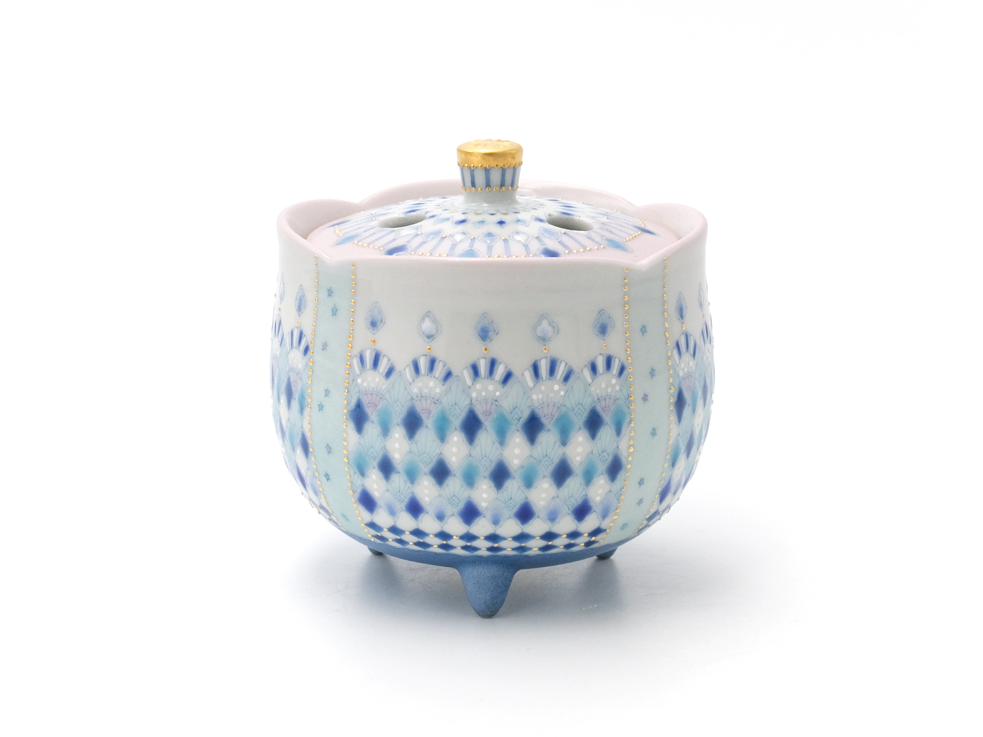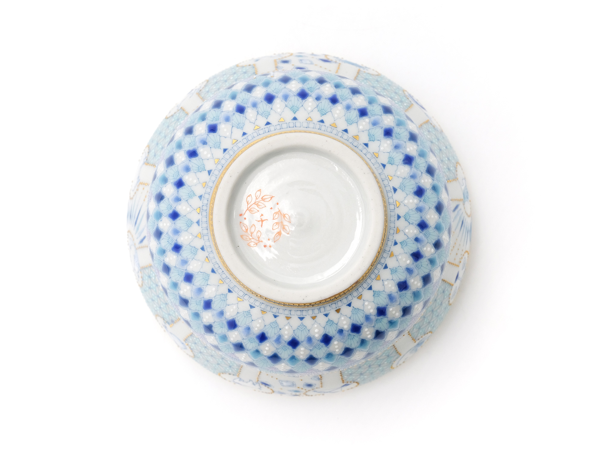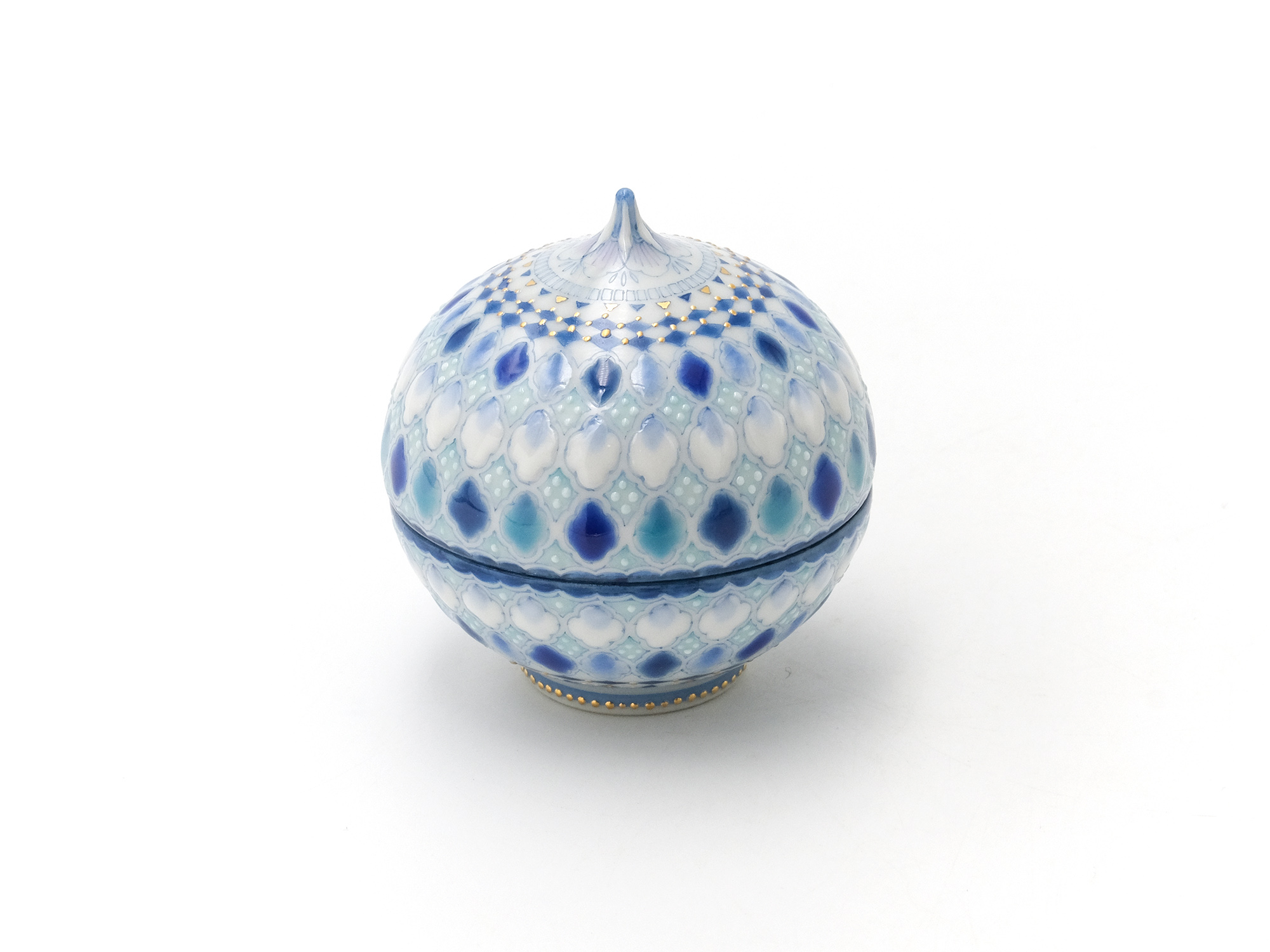 早助千晴さんは、石川県の金沢市で、磁器に美しい絵付けをなさる九谷焼の女流作家です。 その作品は青色を基本に、エキゾチックで細かな幾何学文様が描かれています。 その文様のモチーフは月の満ち欠けや星といったもので、彼女が描く世界観は、他の誰とも似ておらず、唯一無二のものです。 旅へといざなう様な異国情緒漂う作品と、心豊かで誠実なお人柄も相まって、愛陶家の皆様の心を掴んで離しません。もちろん、かくいう私も早助ファンの一人です。