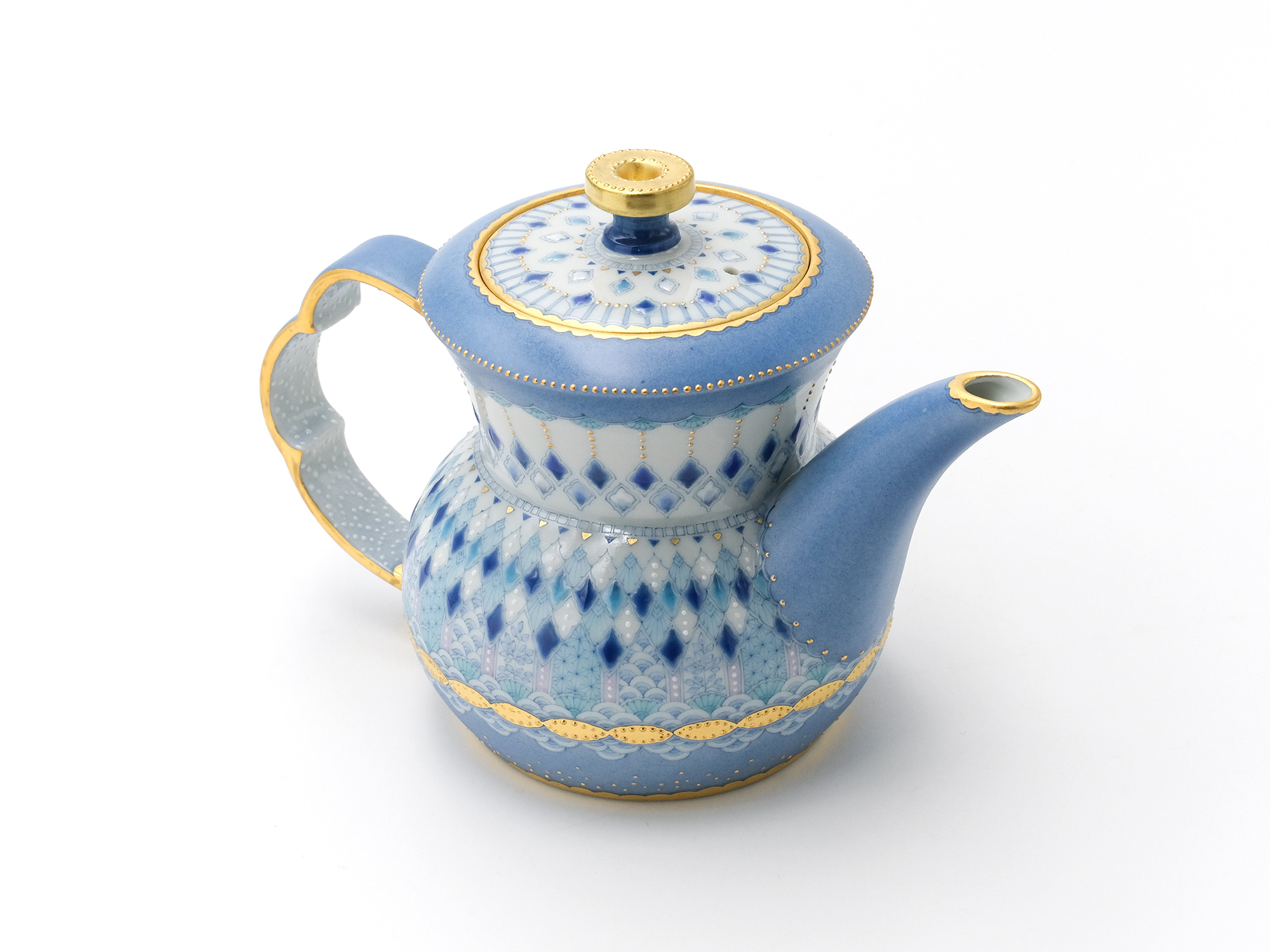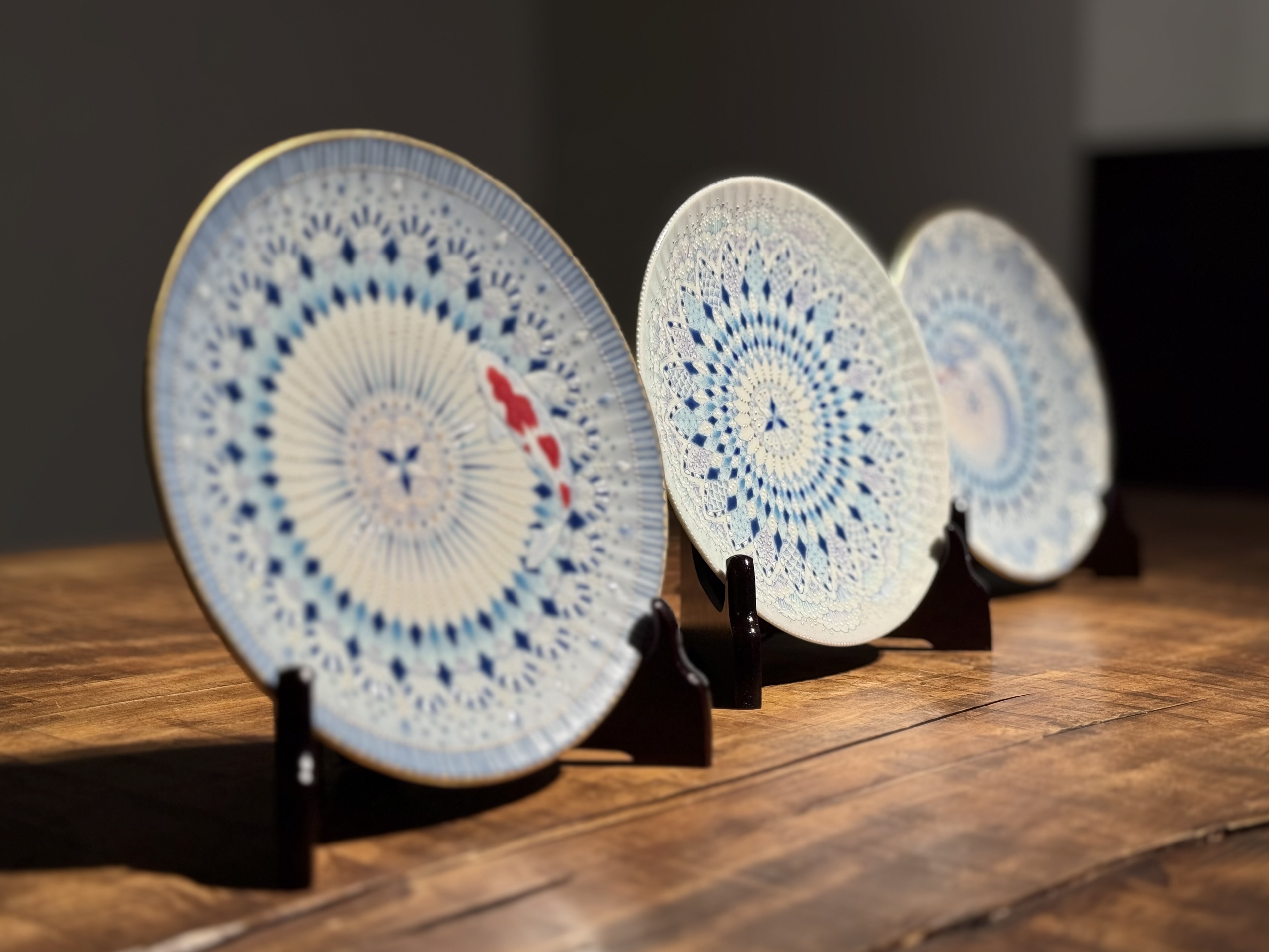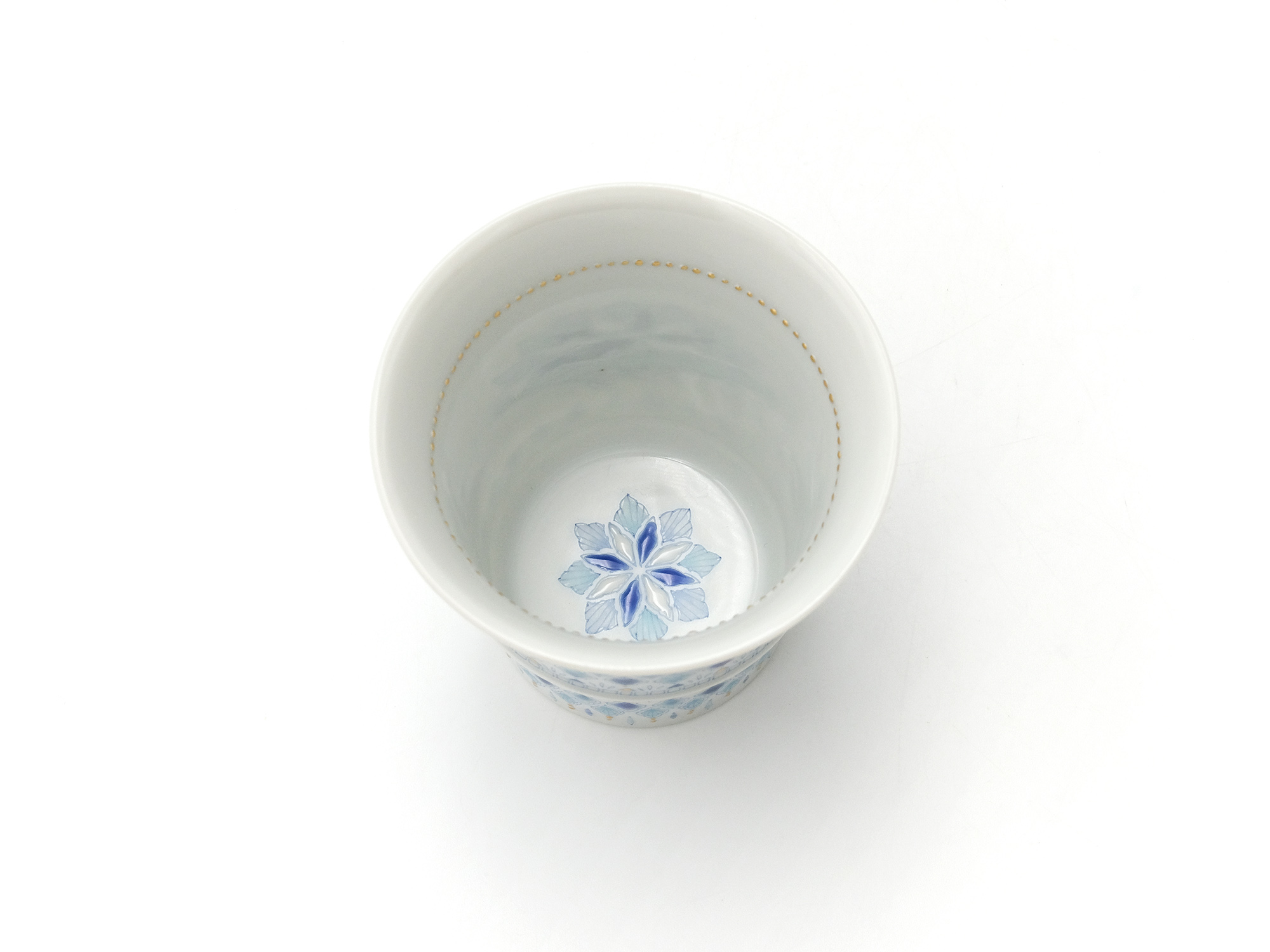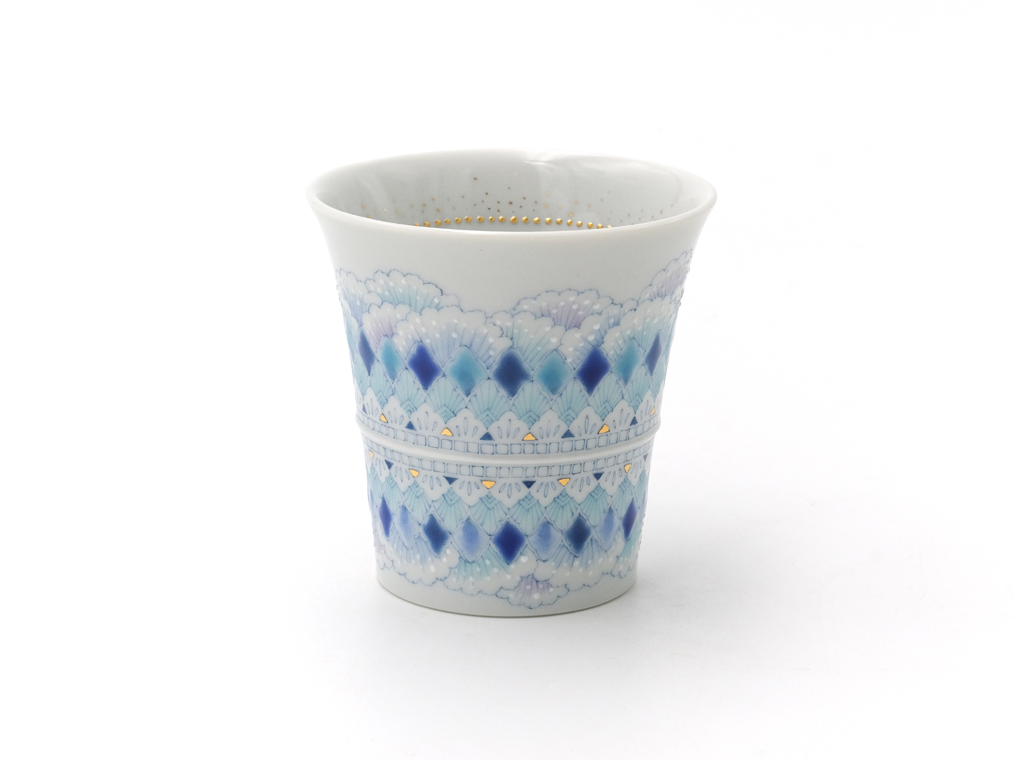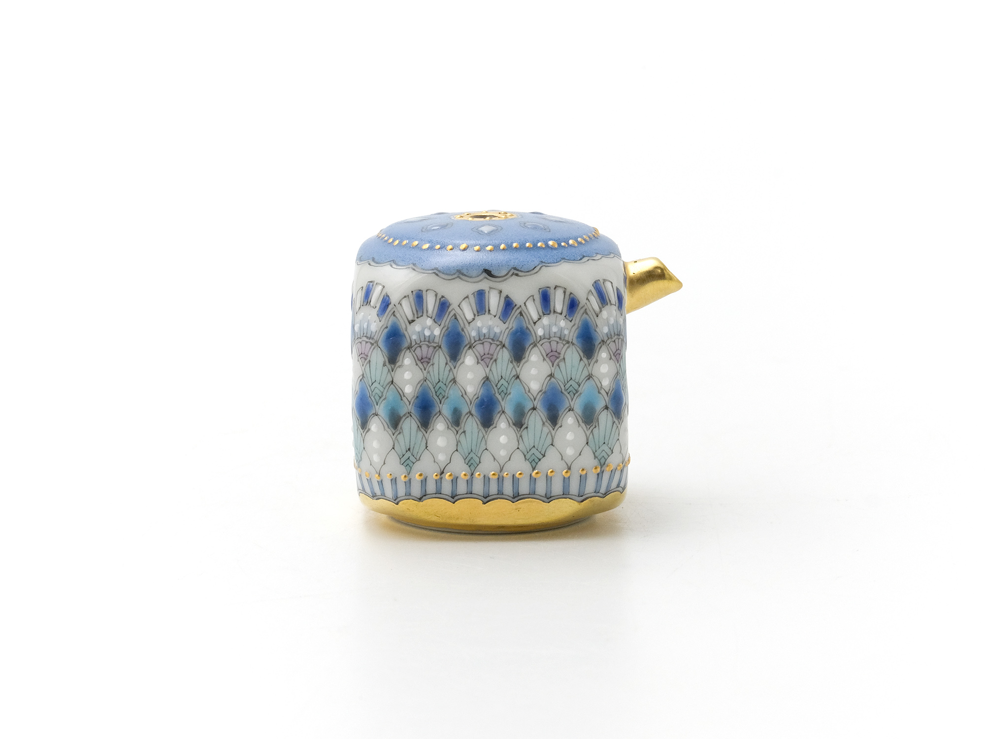 早助千晴さんは、石川県の金沢市で、磁器に美しい絵付けをなさる九谷焼の女流作家です。 その作品は青色を基本に、エキゾチックで細かな幾何学文様が描かれています。 その文様のモチーフは月の満ち欠けや星といったもので、彼女が描く世界観は、他の誰とも似ておらず、唯一無二のものです。 旅へといざなう様な異国情緒漂う作品と、心豊かで誠実なお人柄も相まって、愛陶家の皆様の心を掴んで離しません。もちろん、かくいう私も早助ファンの一人です。