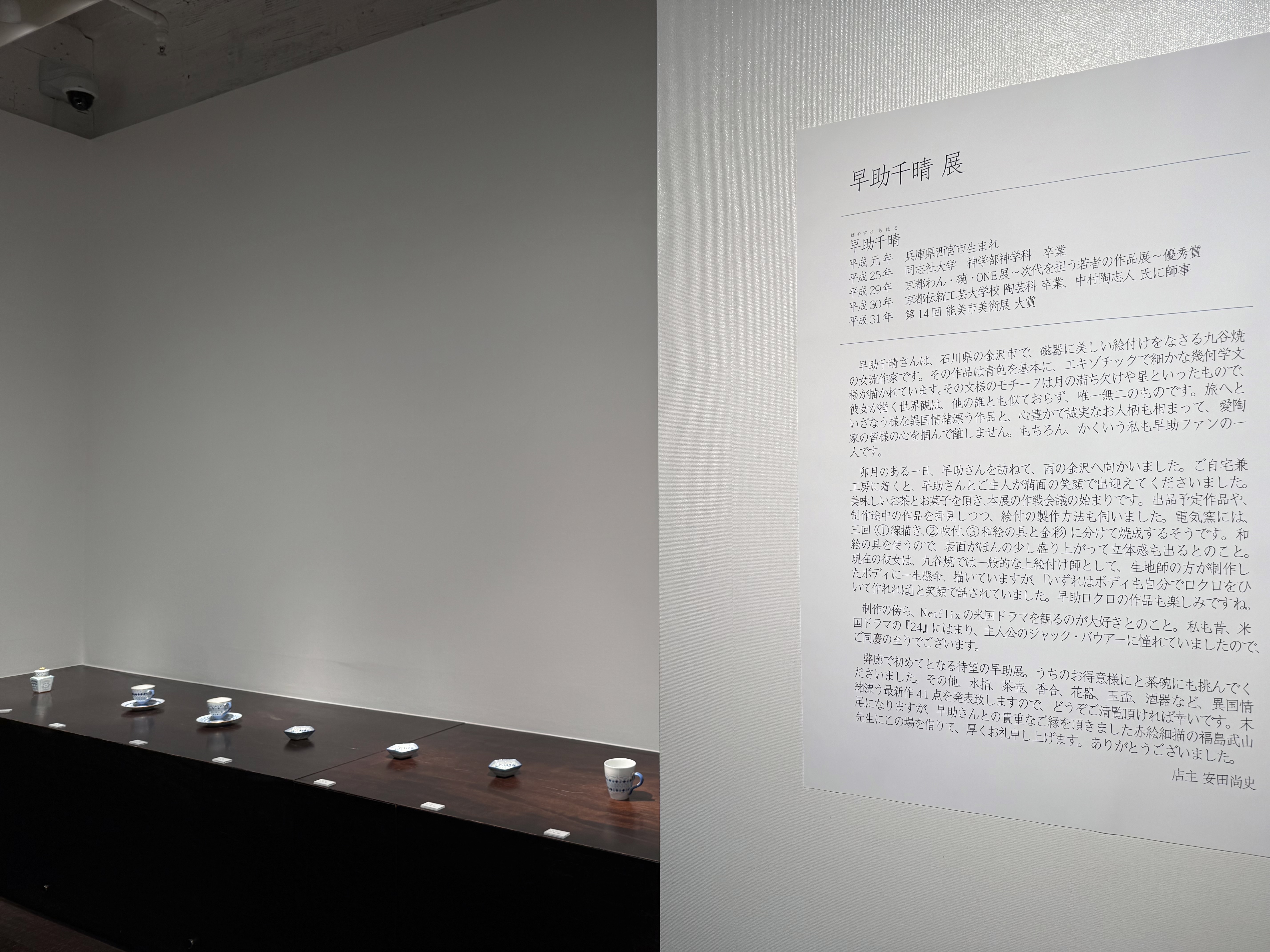 弊廊で初めてとなる待望の早助展。 うちのお得意様にと茶碗にも挑んでくださいました。 その他、玉盃、蓋物、一輪挿しなど、異国情緒漂う最新作40点余りを発表致しますので、どうぞご清覧頂ければ幸いです。 末尾になりますが、早助さんとの貴重なご縁を頂きました赤絵細描の福島武山先生にこの場を借りて、厚くお礼申し上げます。ありがとうございました。