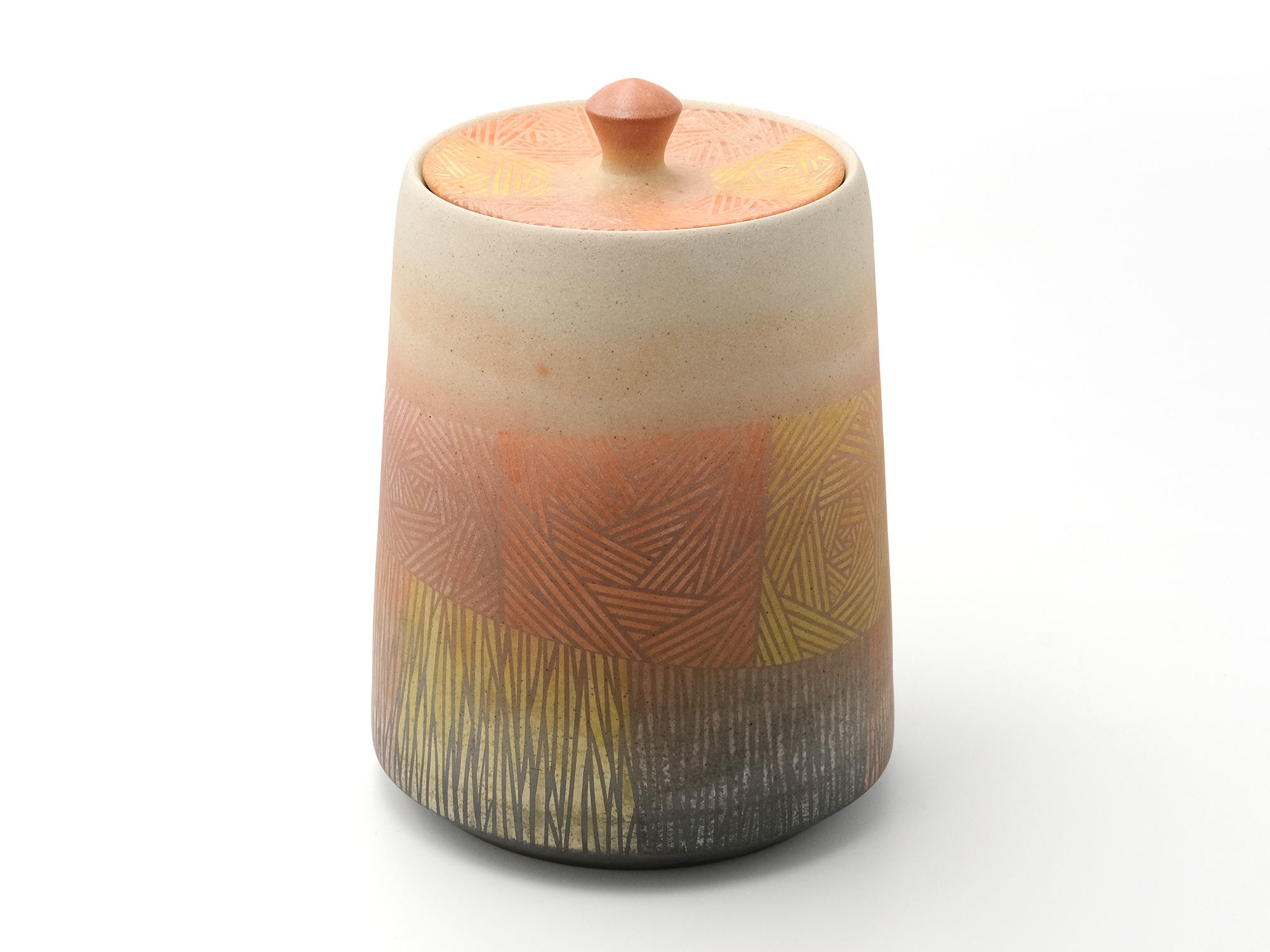 小牧鉄平の《炭化彩色鉢》はガス窯焼成で、顔料とアルミナを混ぜたものを水で溶き、マスキングした鉢に色を塗り分け、焼成後にサンドペーパーで磨いて余分な顔料を洗い流し、生地に写り込んだのが模様になっていると話す。 真横から見ると、幾何学的な模様が木立のように見え、赤、オレンジ、黄の交互の配色が自然の移ろいのようにも感じられる。