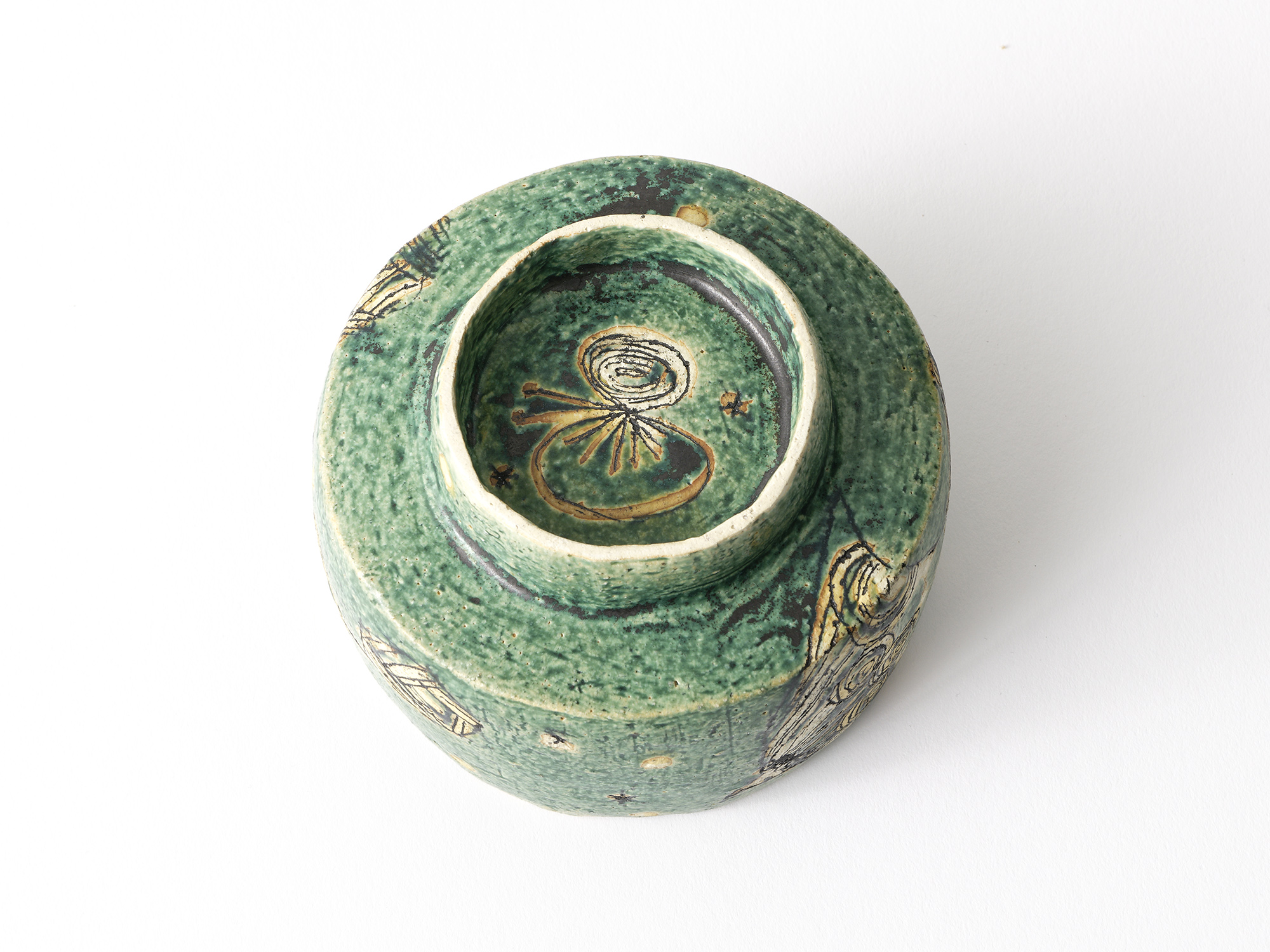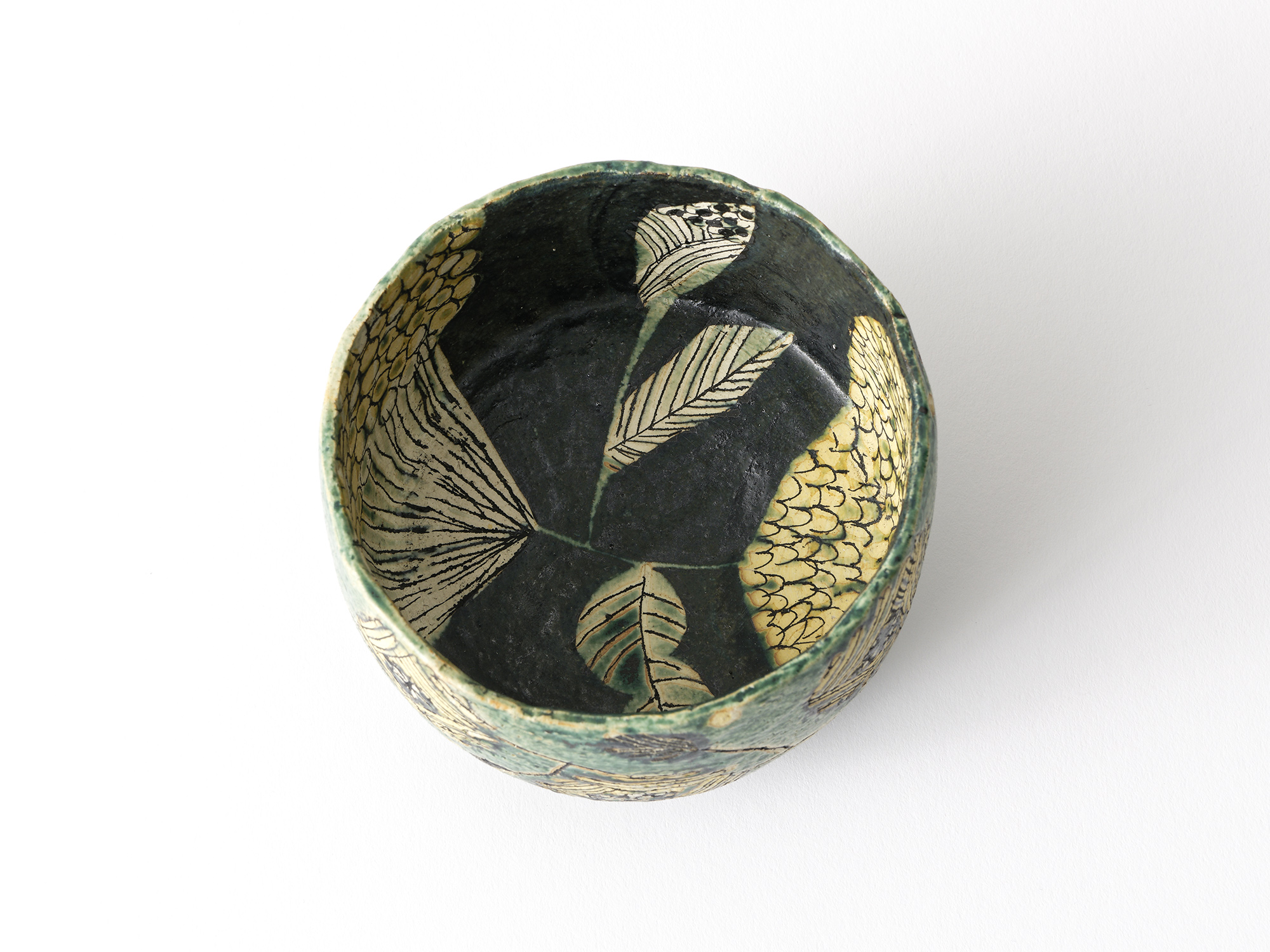 青木寿美子の《花あわせ 月映茶盌》は、この作家でないと表現出来ない青木織部になっている。 大概の織部作品は、桃山織部の呪縛から抜け出せないでいる。 そう考えると、この作家の造る現代織部、すなわち、月明かりで見る花と鳥の大胆な文様が一層魅力的に見えてくる。特に文様の配置、間が絶妙である。