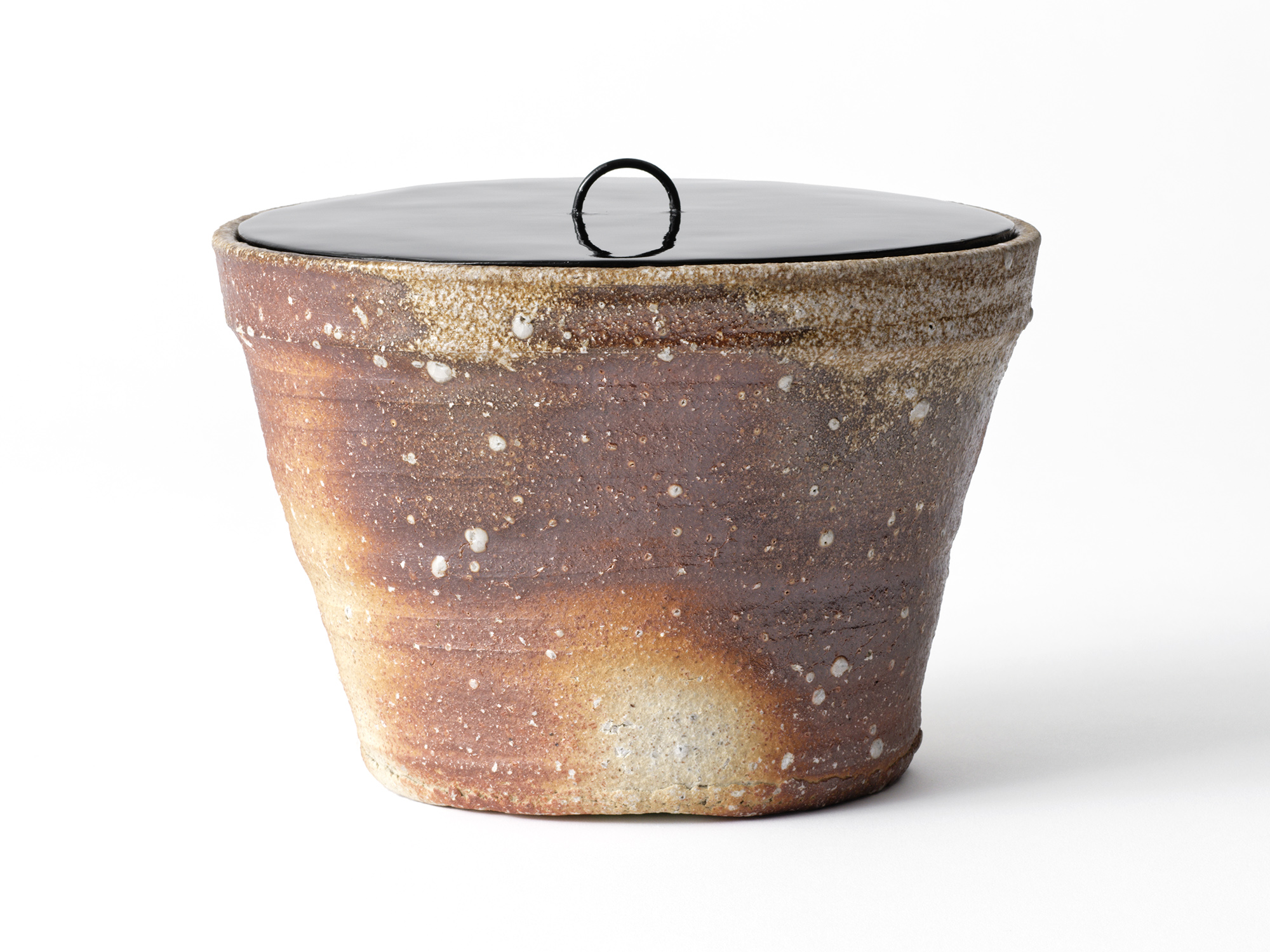 神﨑秀策の作品は、いわゆる桶形の水指である。 新作に挑戦するも、古典が気になるという。《信楽水指》は、そんな心の間(はざま)から生まれた作品である。 小山冨士夫は、その緋色の美しさを明るい夕日をあびた枯葉の林を見るようだと絶賛しているが、この火色の美しい鬼桶水指を眺めていると、そんな信楽の景色が思い浮かぶ。