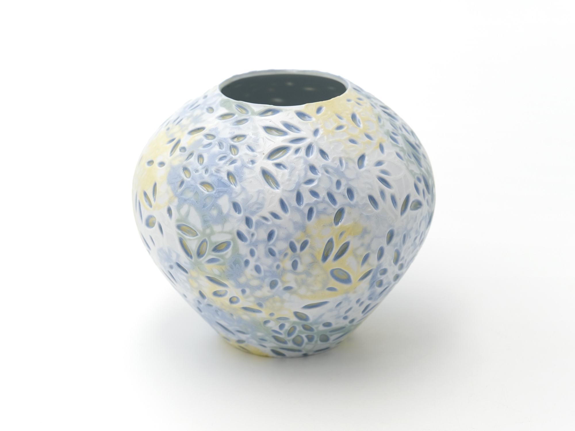 髙間智子の積層彩磁は、何種類もの色の磁土を何層にも重ね、模様を削り出すという独特な技法を駆使した作品である。 この《積層彩磁-振出し-》は、積層されていく色彩と削り出される色彩の移ろい、組み合わせにより生まれた「色のあはひ(間)」を三種の振出しで見事に表現している。
