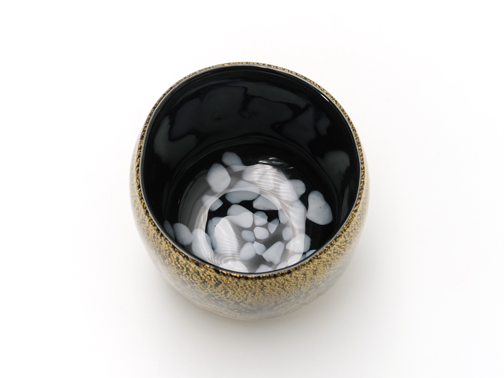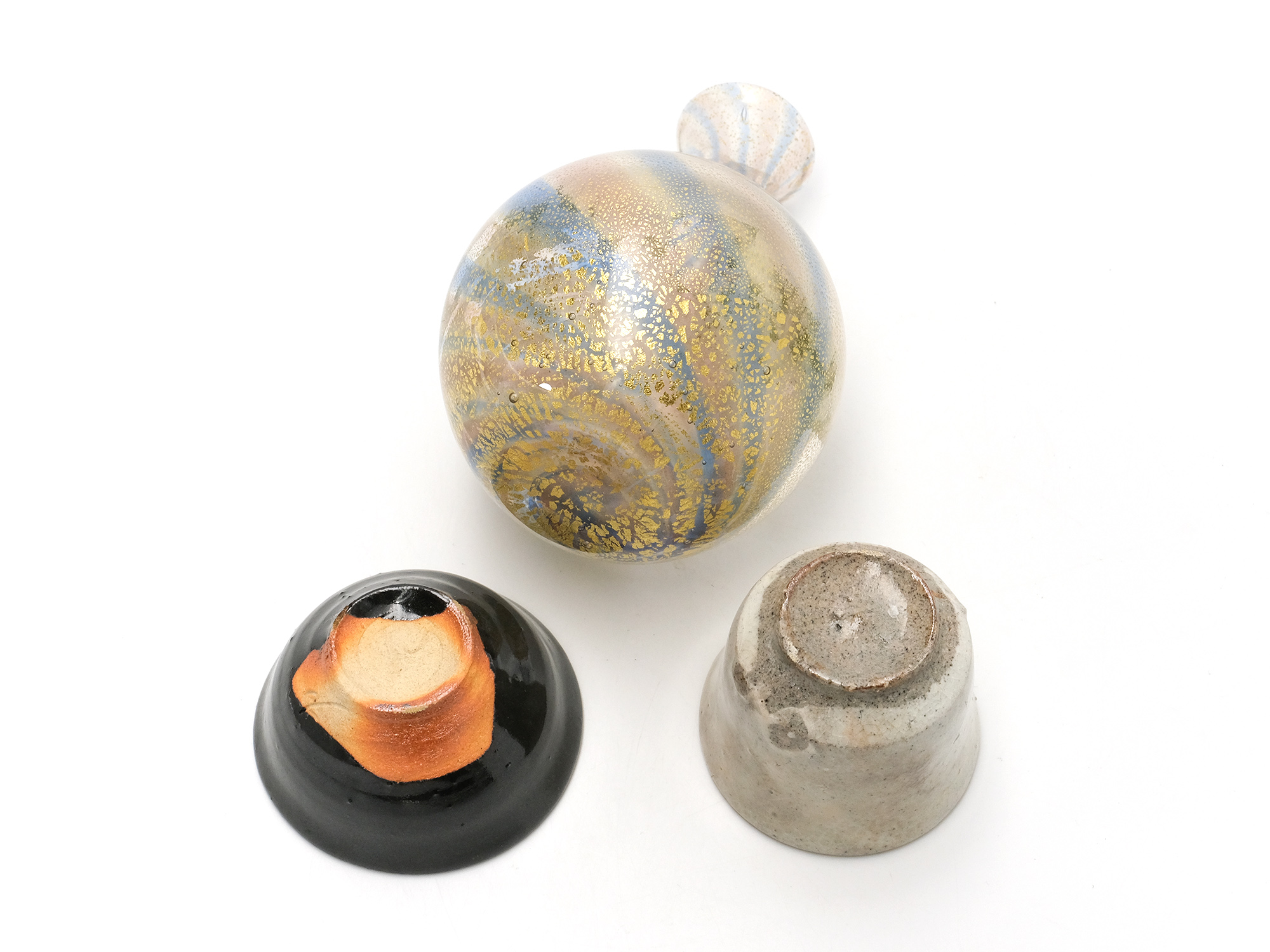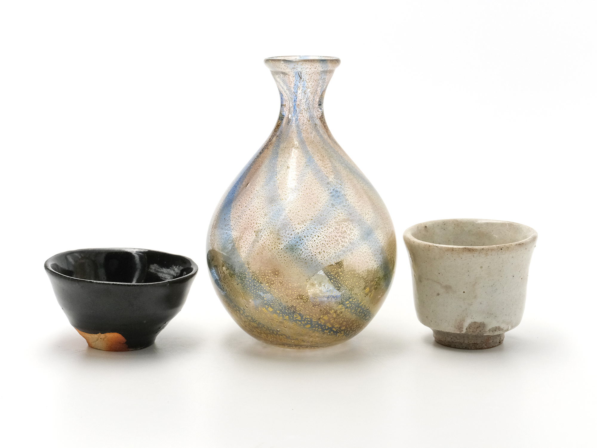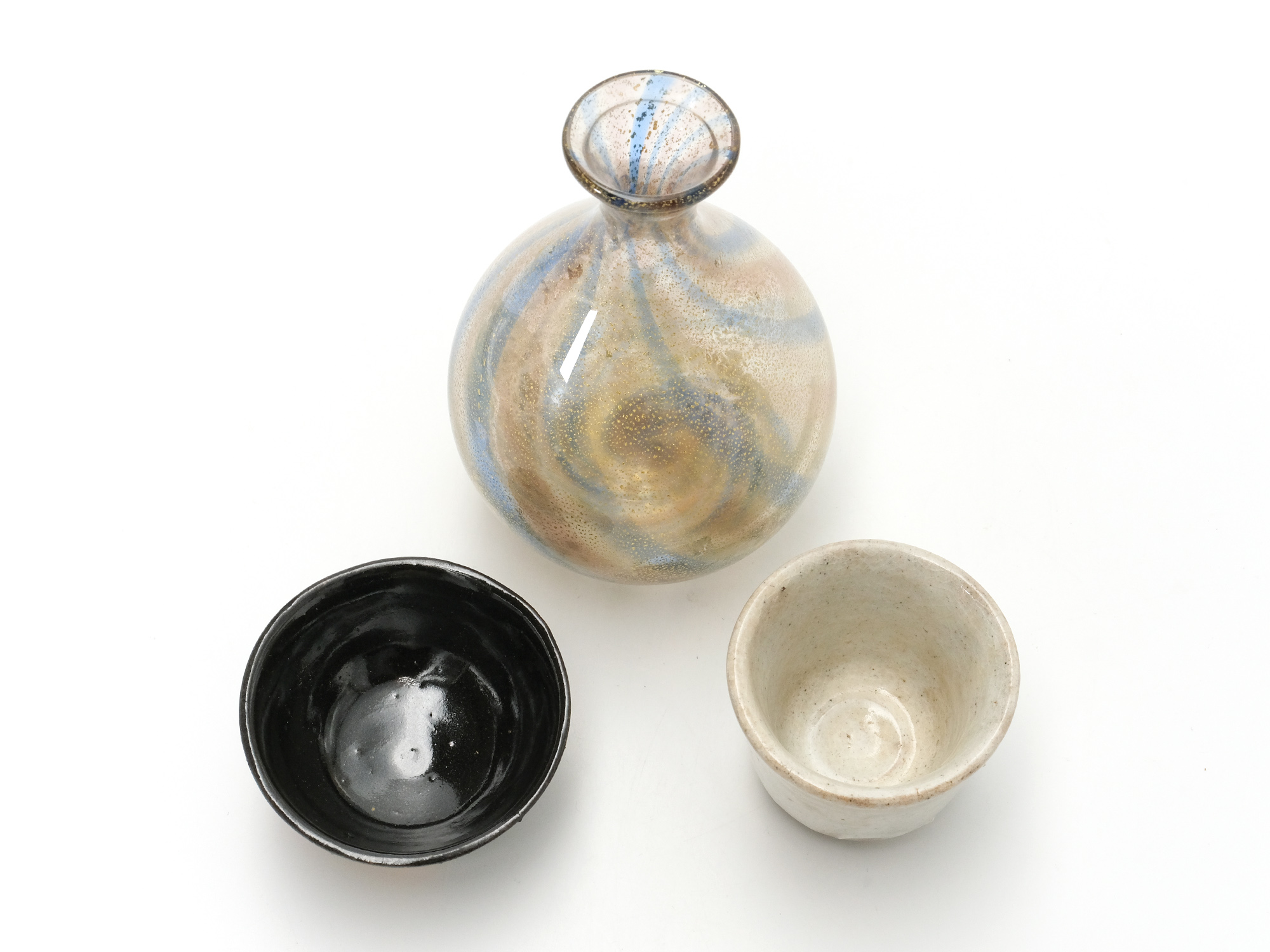 | 作品名 | [左] 黒釉 ぐいのみ [中] 徳利(金、ブルー) [右] 粉引き ぐいのみ |