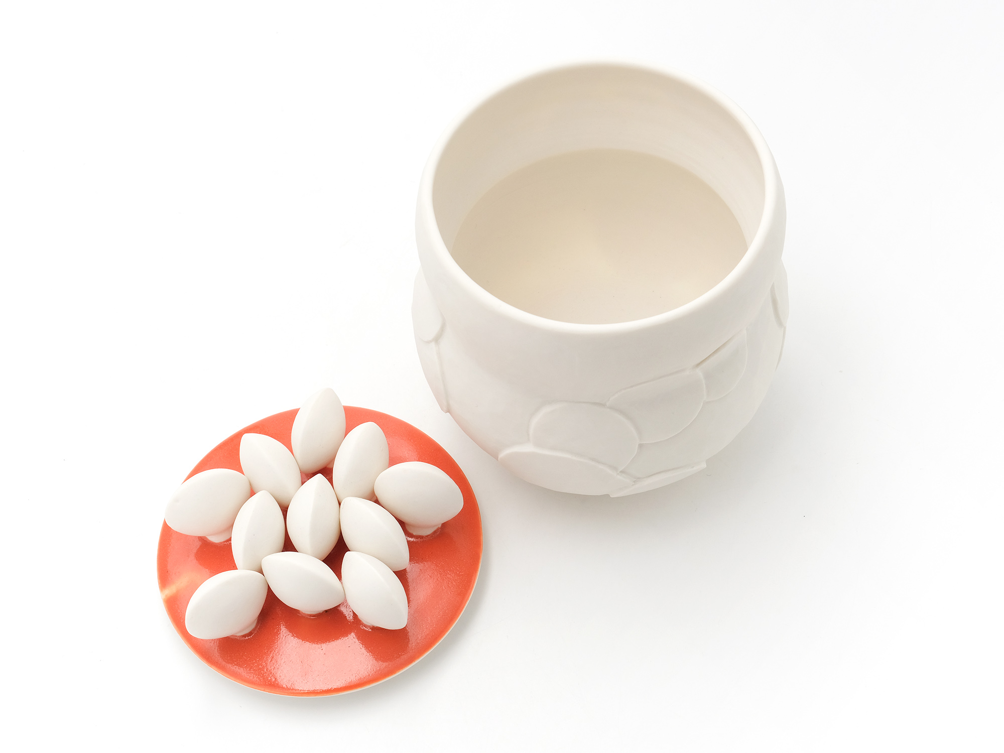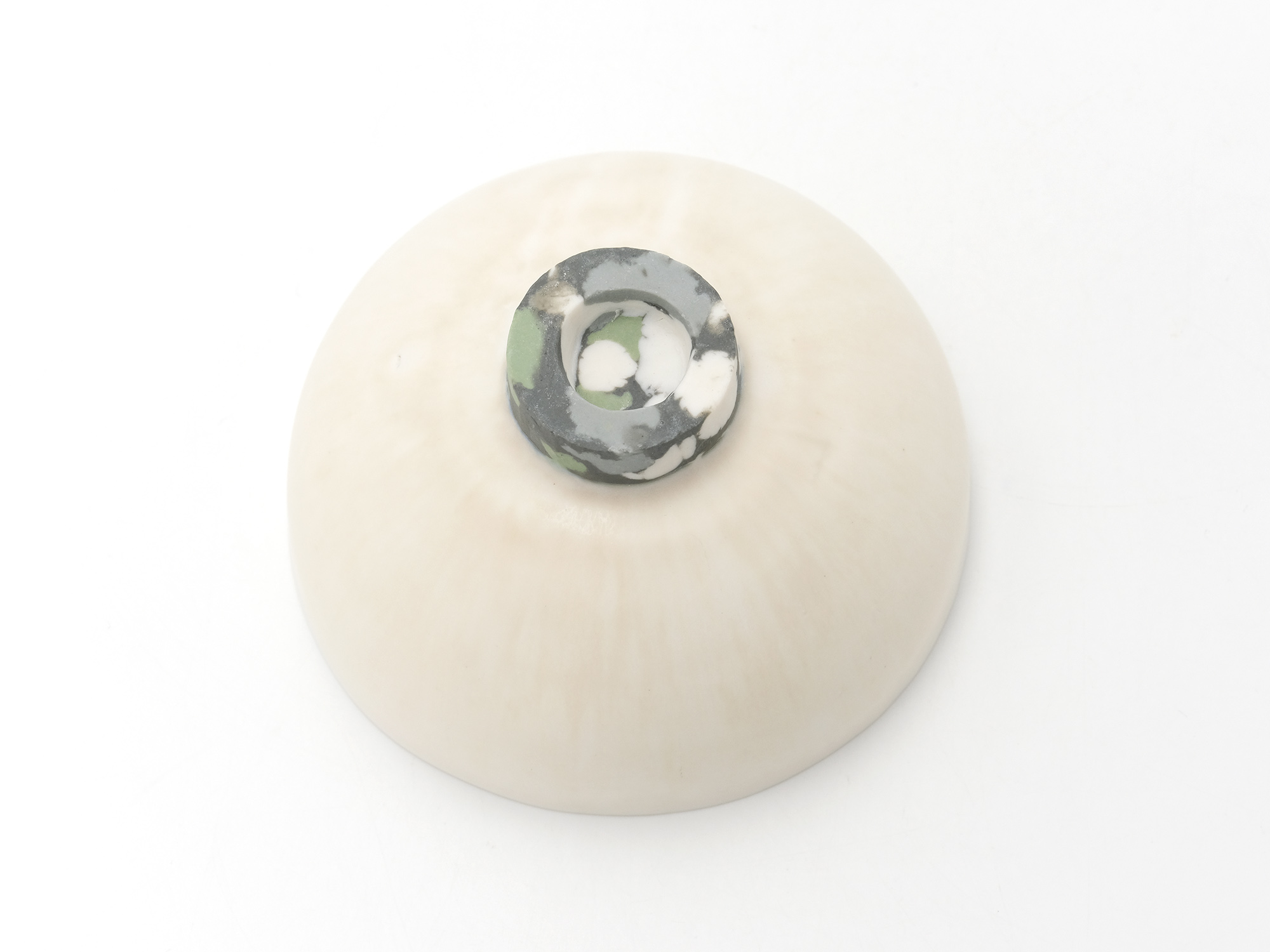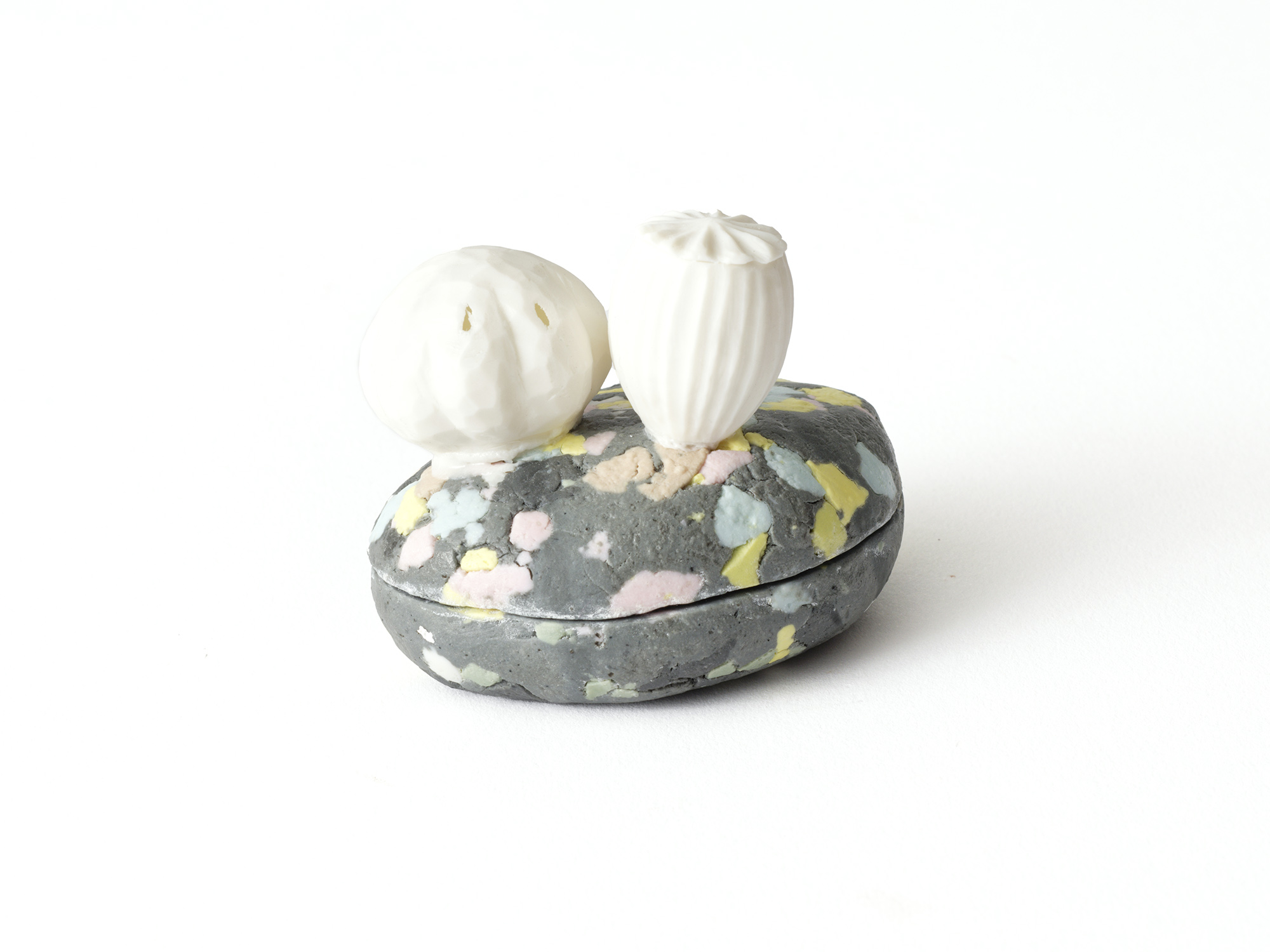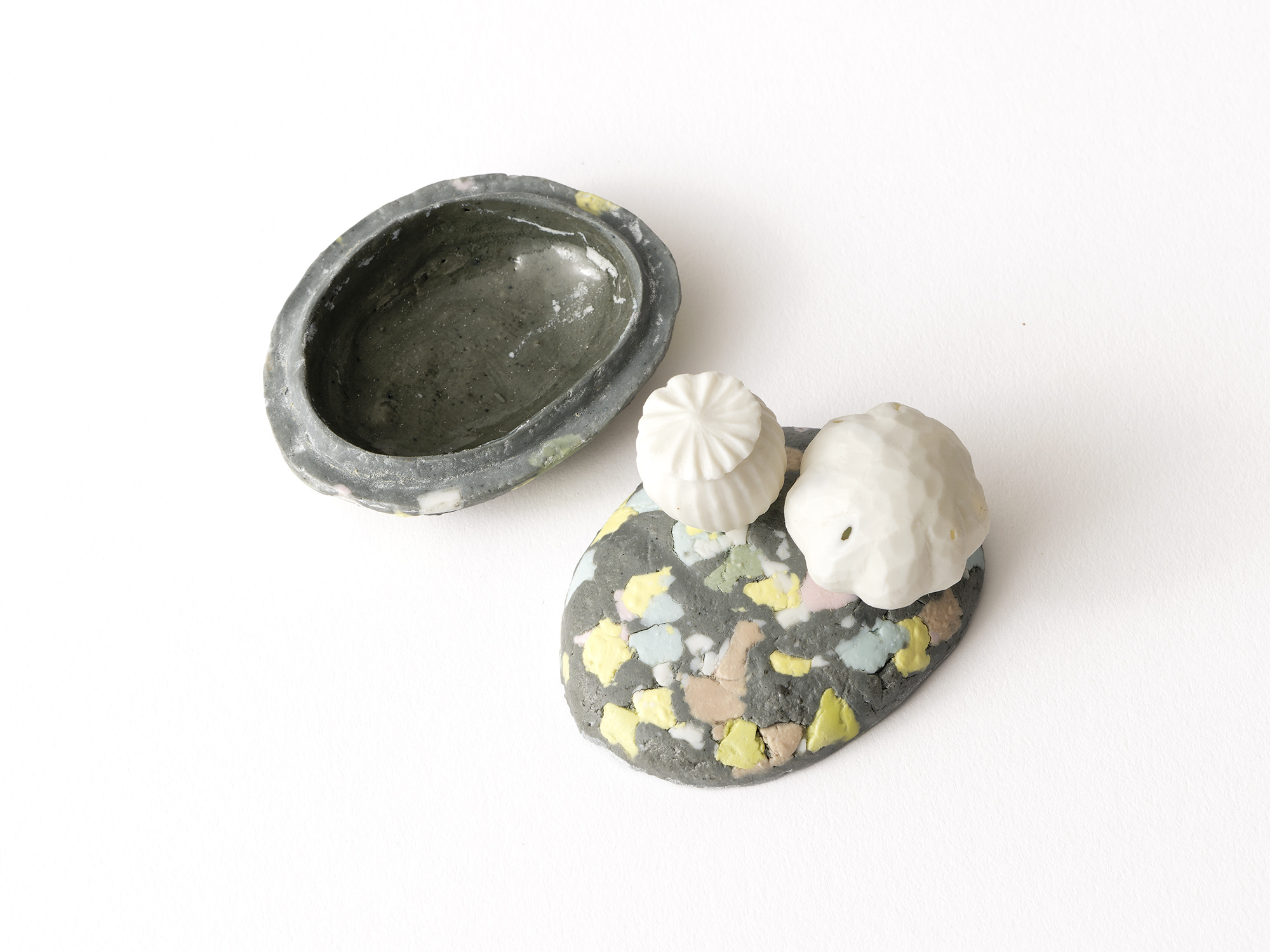 宇賀和子は武蔵野美術大学で陶磁器デザインを学び、オブジェや磁器の照明の他、花器やマグカップなどの器を制作している。 《香合−石にhana−》は色粘土に白磁を組み合わせたもので、お互いの色を際立たせてとても新鮮である。