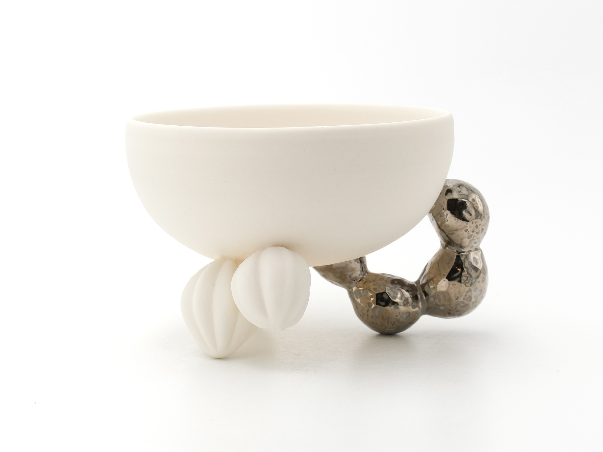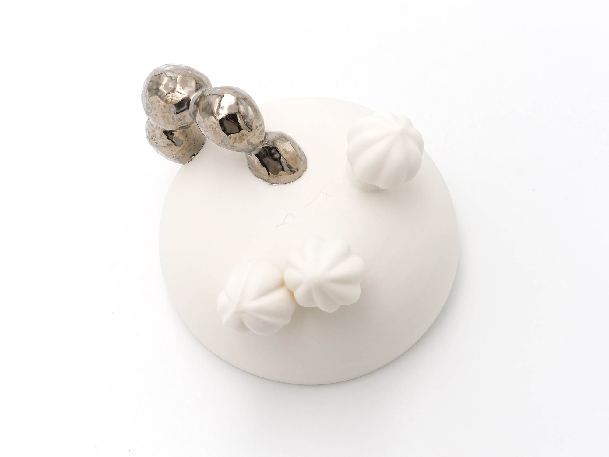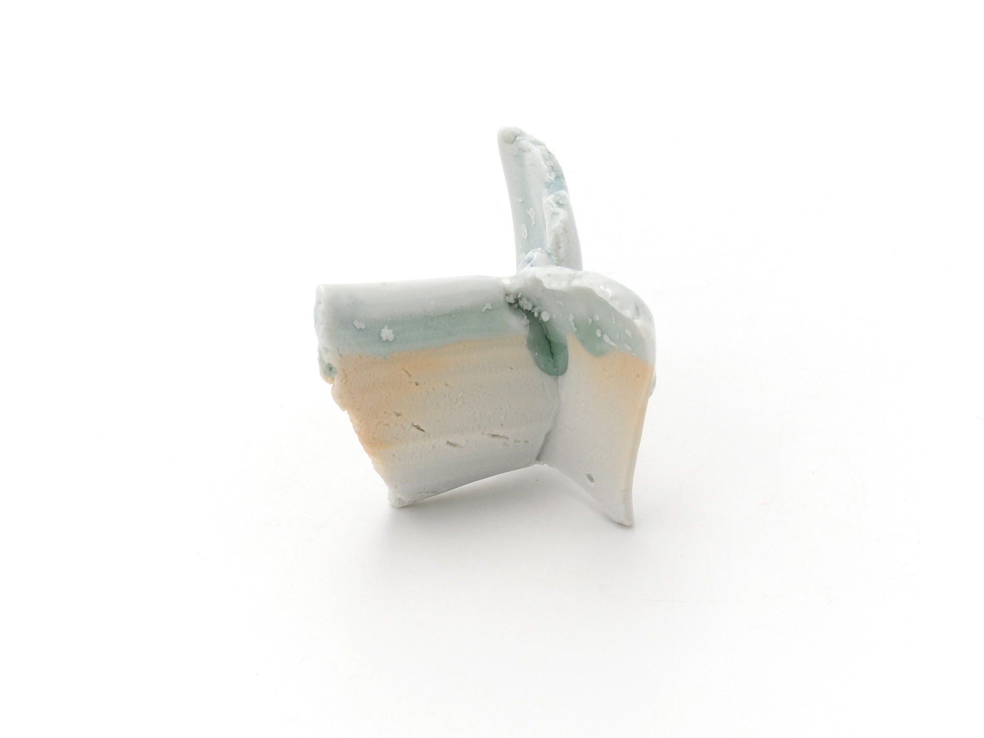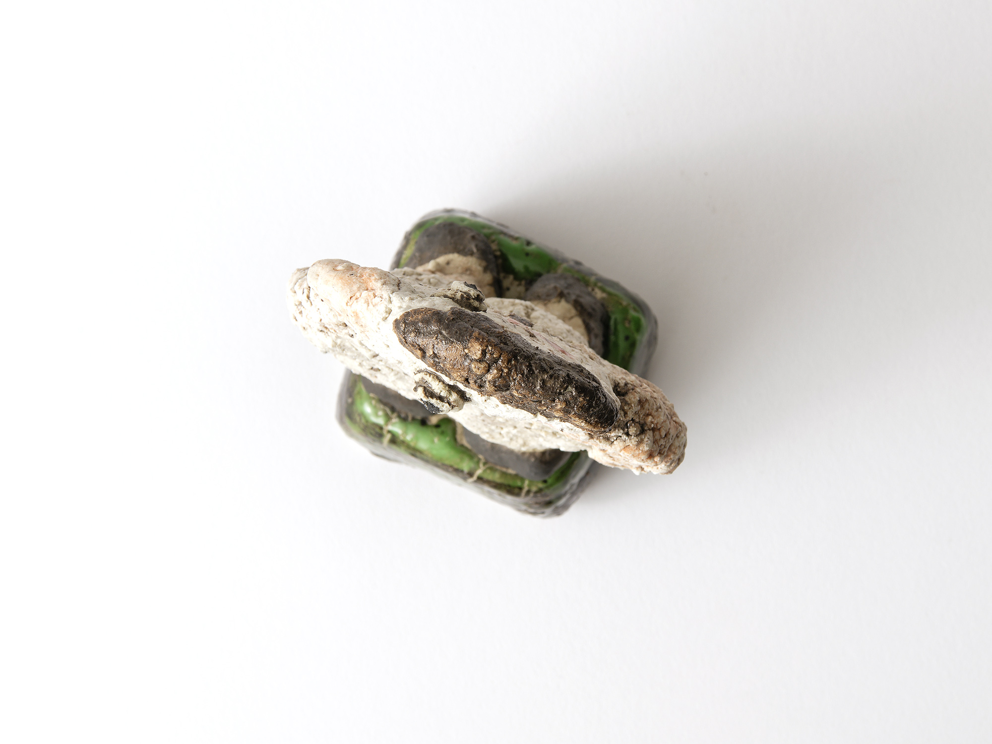 宇賀和子は武蔵野美術大学で陶磁器デザインを学び、オブジェや磁器の照明の他、花器やマグカップなどの器を制作している。 《香合−石にhana−》は色粘土に白磁を組み合わせたもので、お互いの色を際立たせてとても新鮮である。
