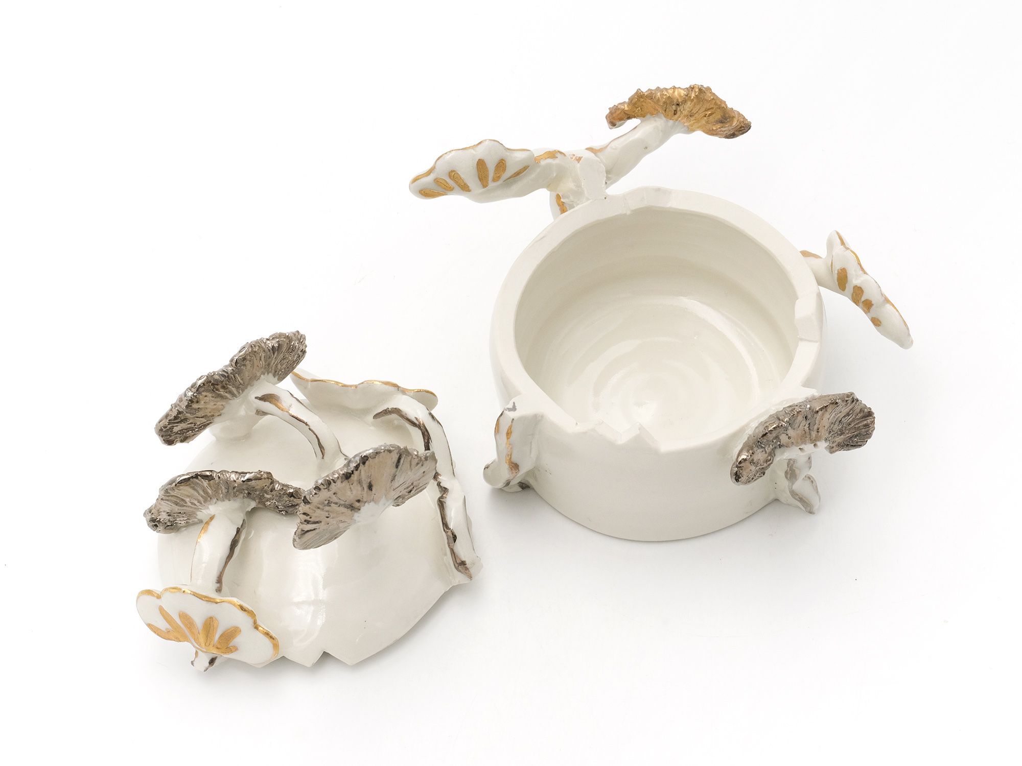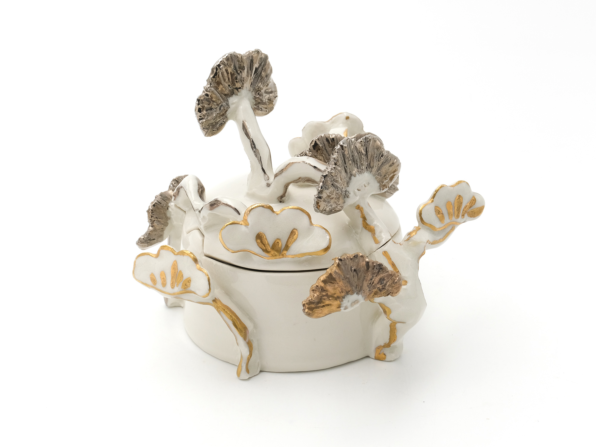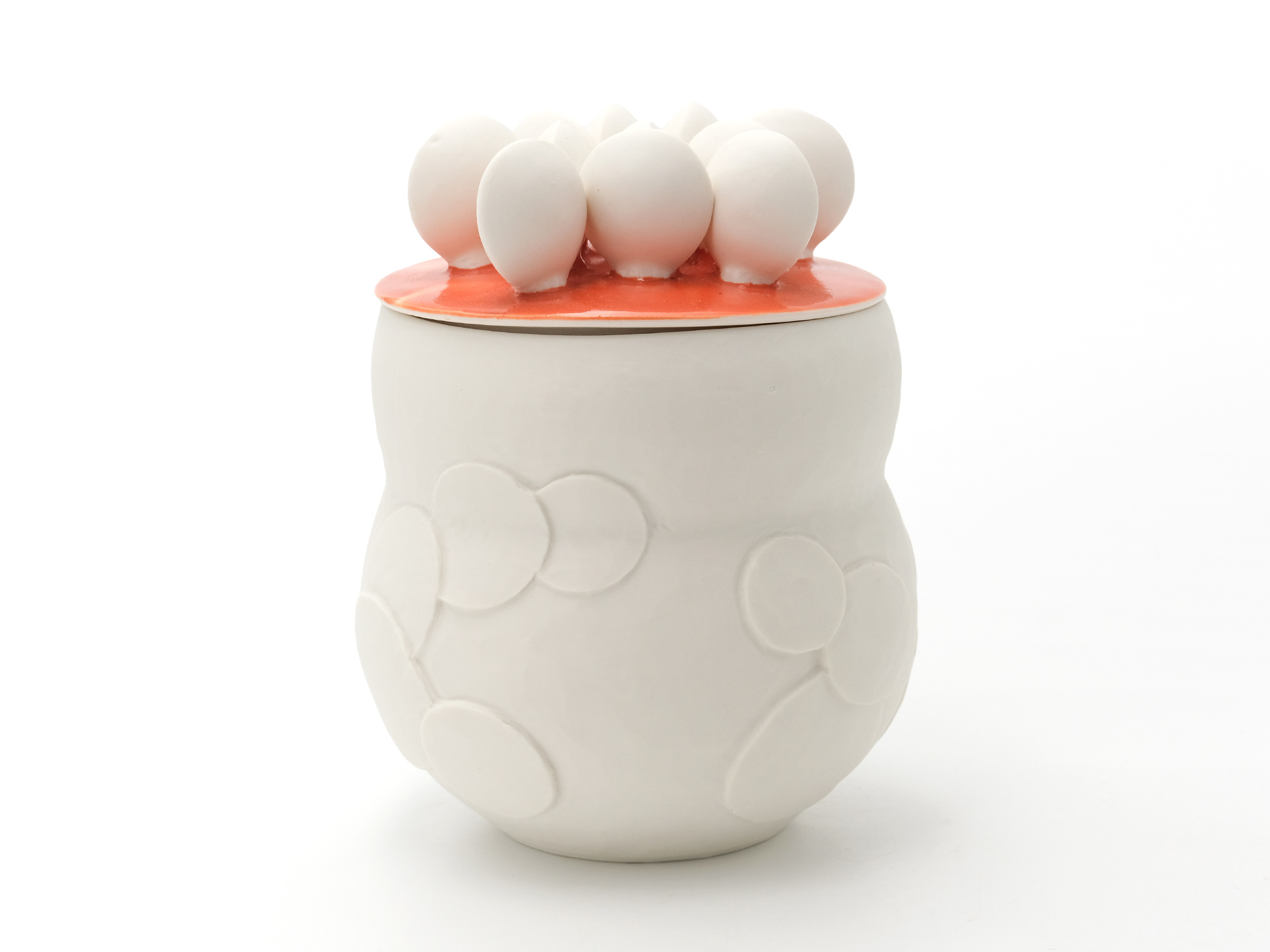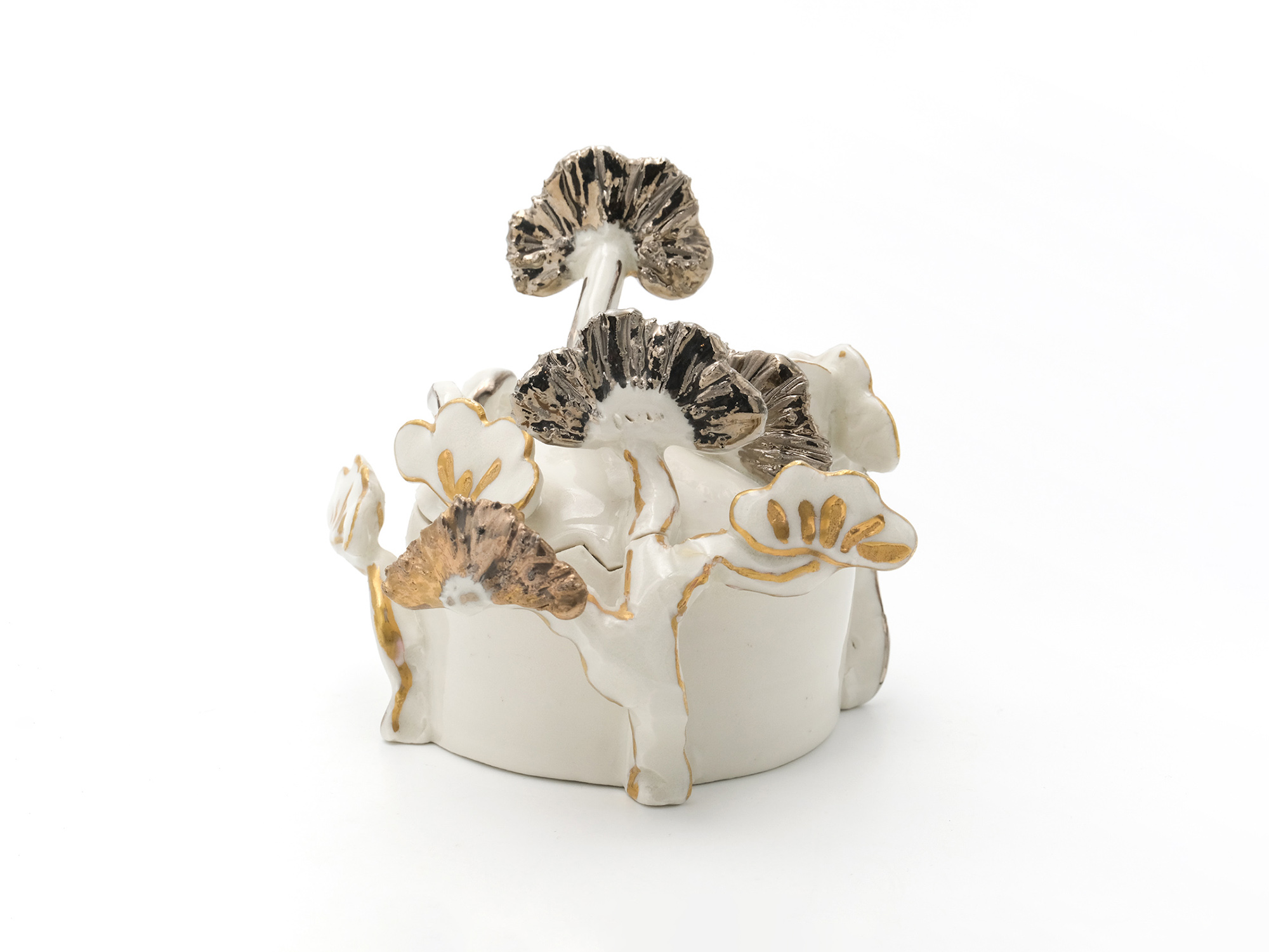 宇賀和子は武蔵野美術大学で陶磁器デザインを学び、オブジェや磁器の照明の他、花器やマグカップなどの器を制作している。 《香合−石にhana−》は色粘土に白磁を組み合わせたもので、お互いの色を際立たせてとても新鮮である。
