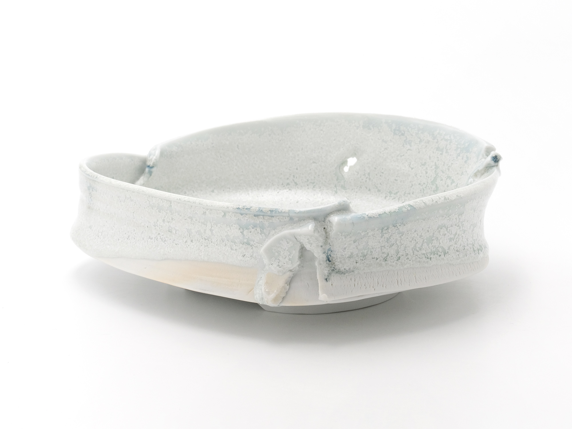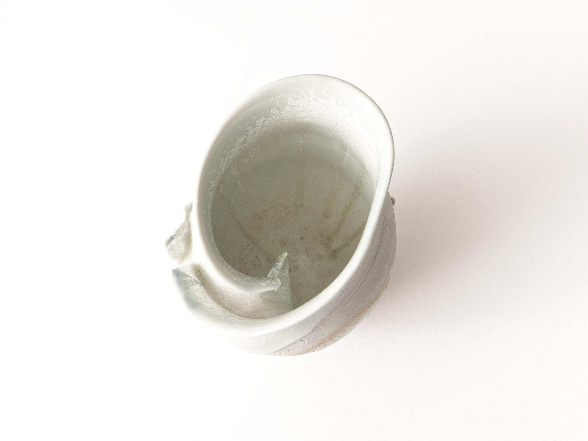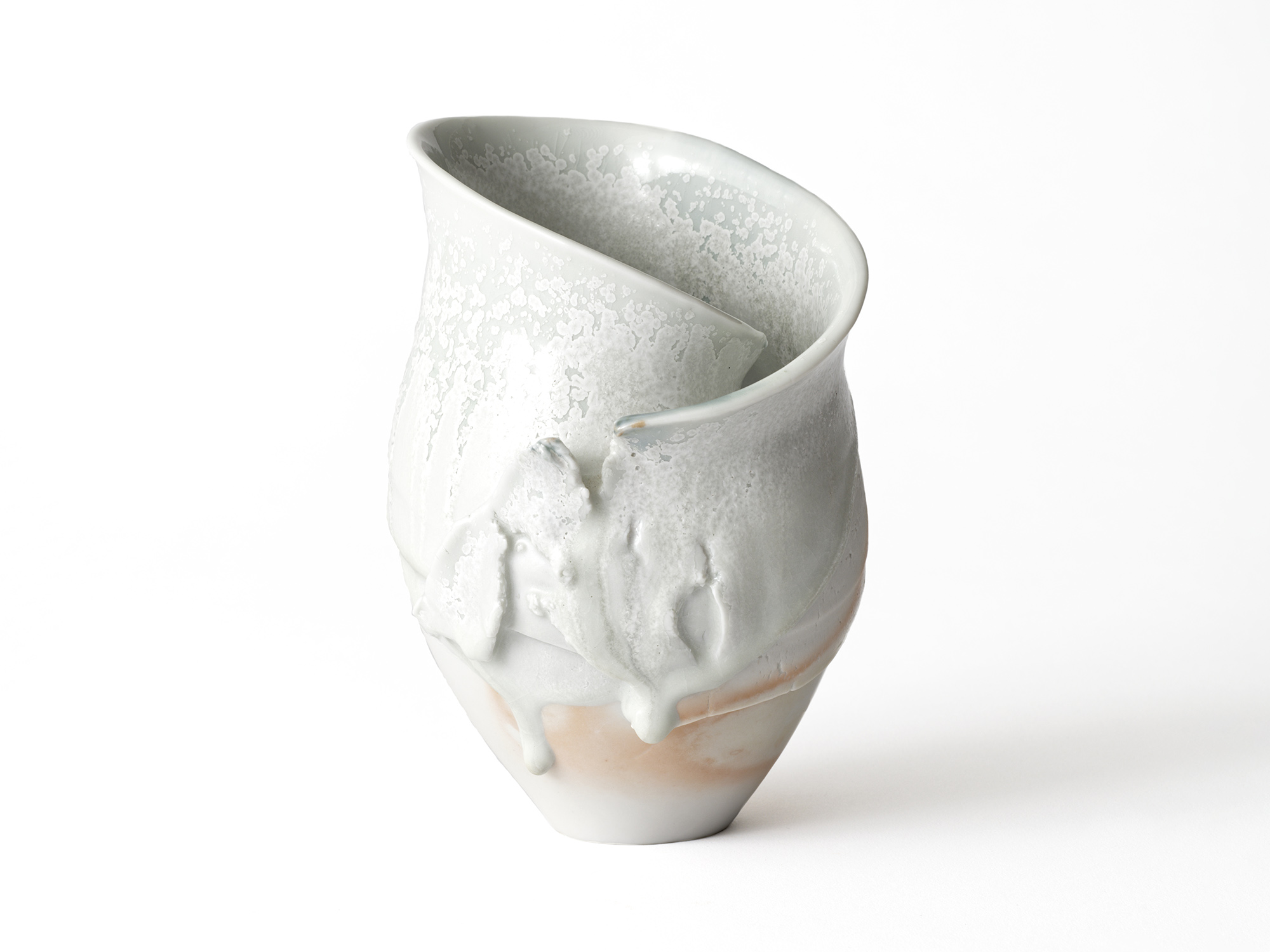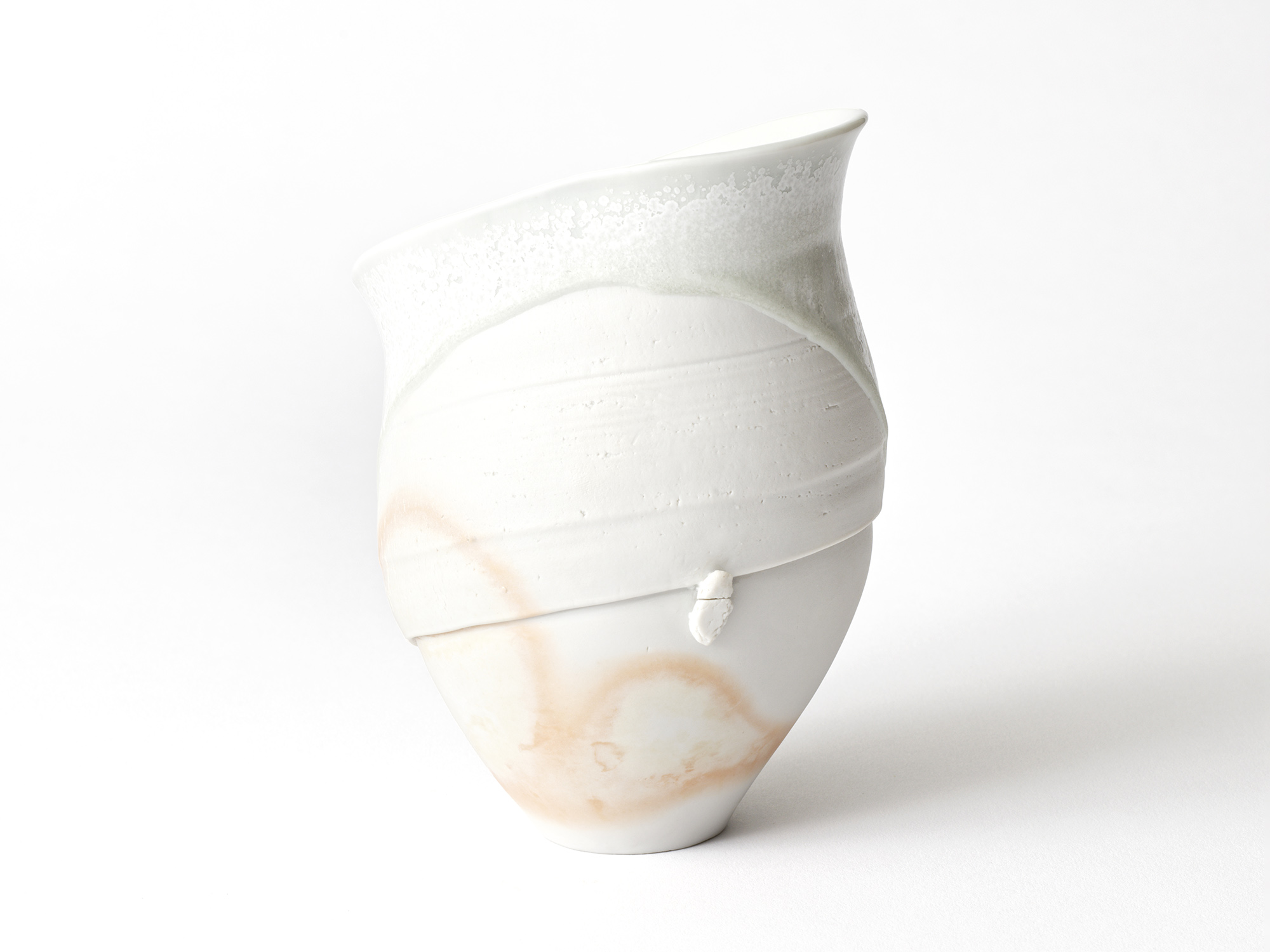 加藤真美の《フロスト釉花入》は、磁器土を用いて板作り技法で制作した花入。 フロスト釉独特の磁肌と磁器土にでた火色がなんとも温かい。丸めた板が重なる部分には、この作家の特徴であるちぎったり破いたりと破調の美が表現され、全体の緊張感を和らげている。