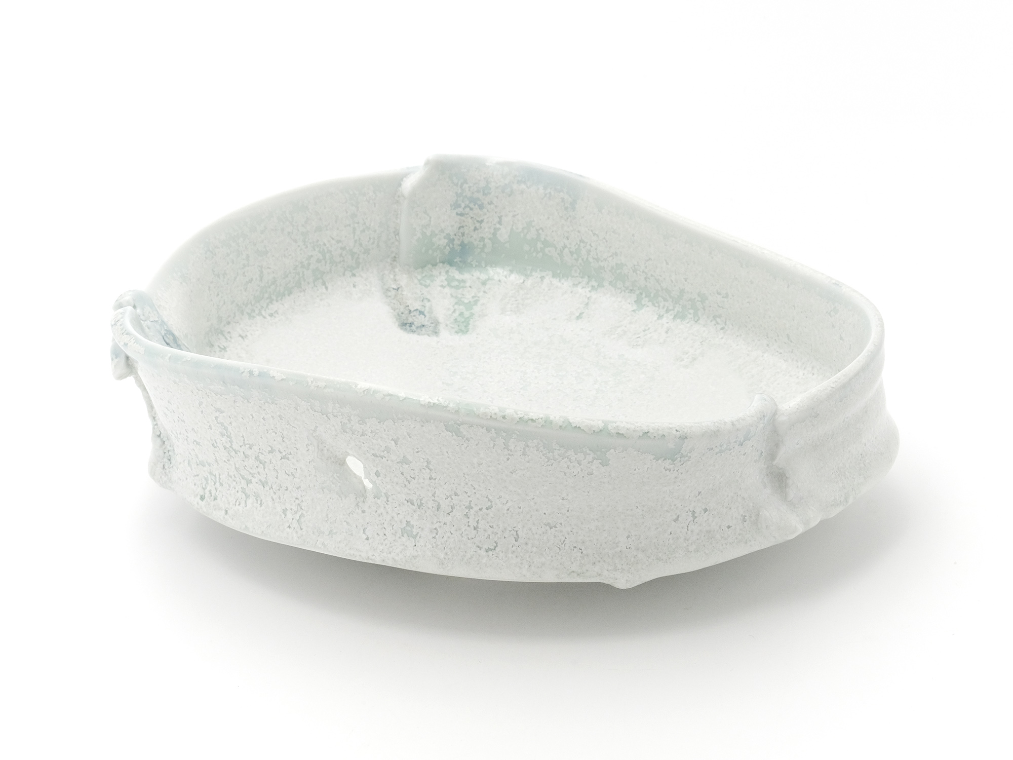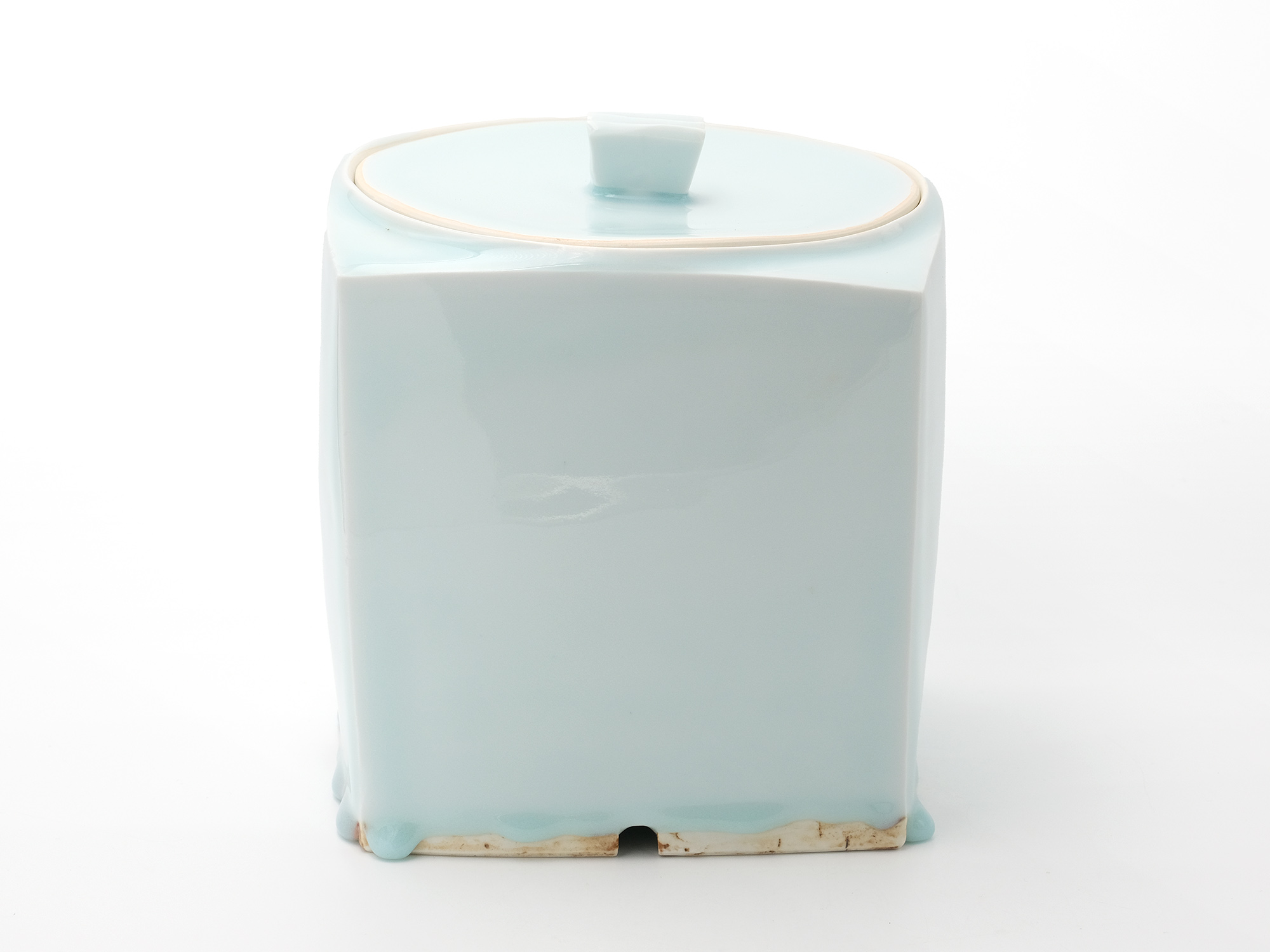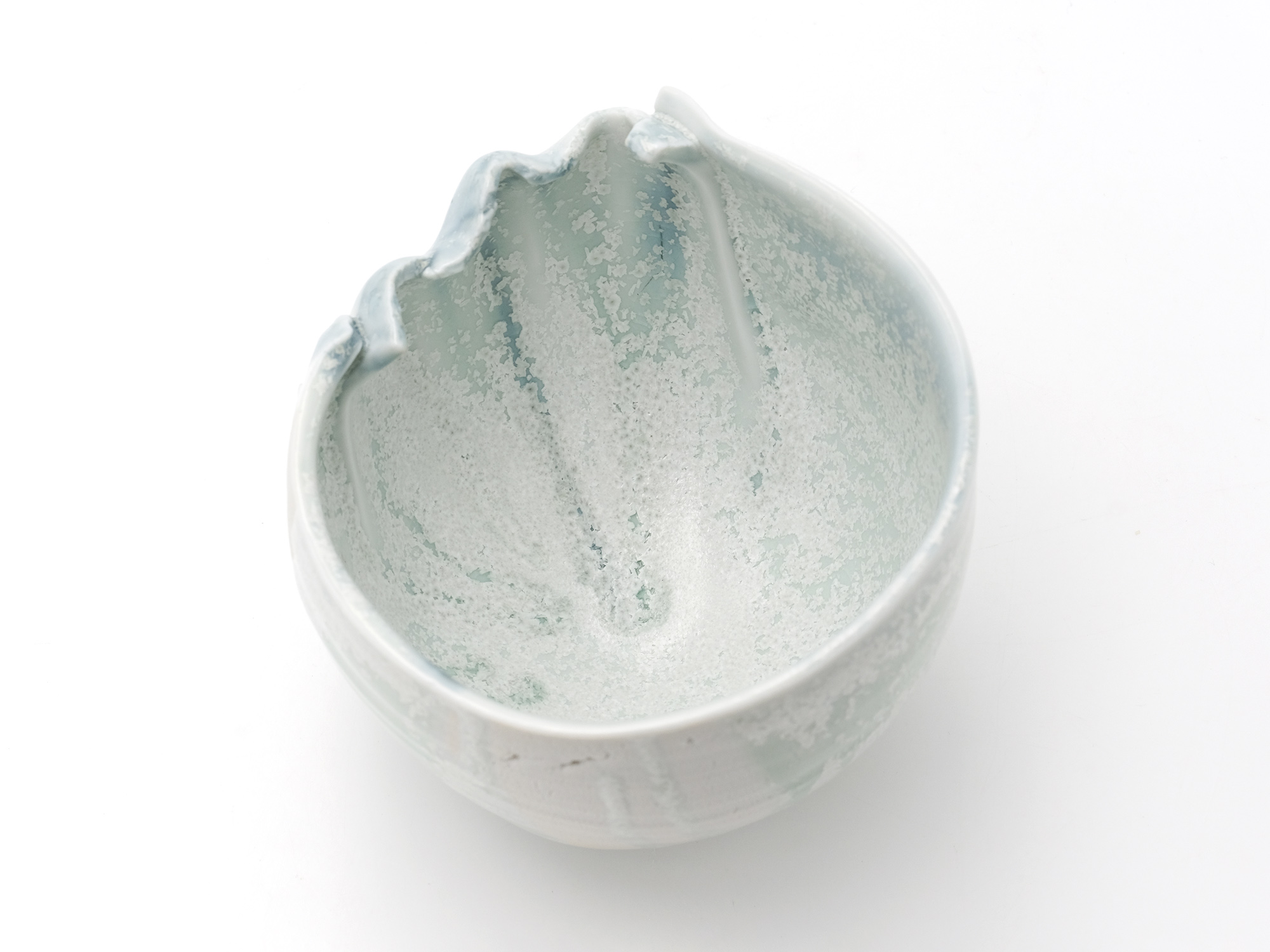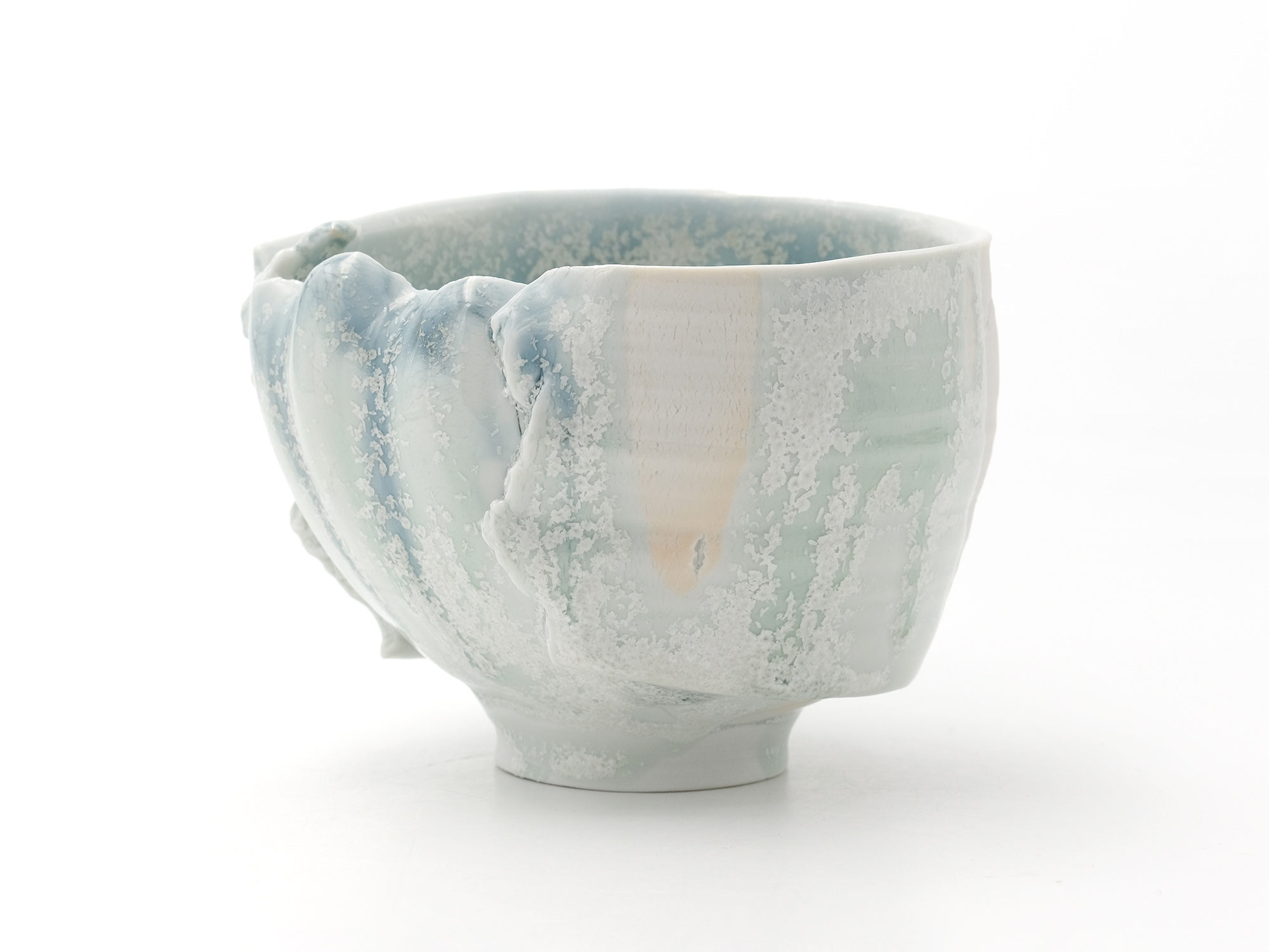 加藤真美の《フロスト釉花入》は、磁器土を用いて板作り技法で制作した花入。 フロスト釉独特の磁肌と磁器土にでた火色がなんとも温かい。丸めた板が重なる部分には、この作家の特徴であるちぎったり破いたりと破調の美が表現され、全体の緊張感を和らげている。