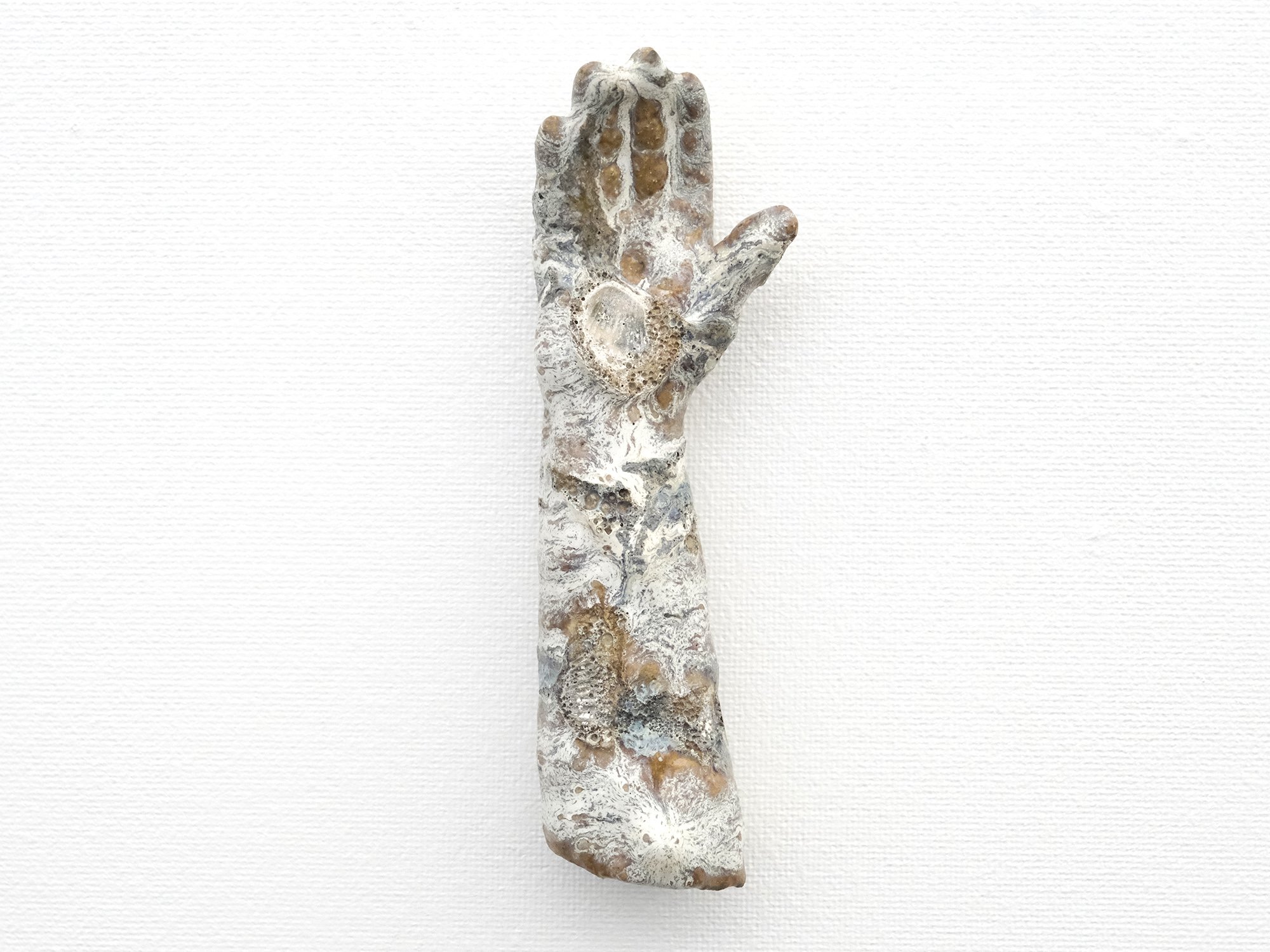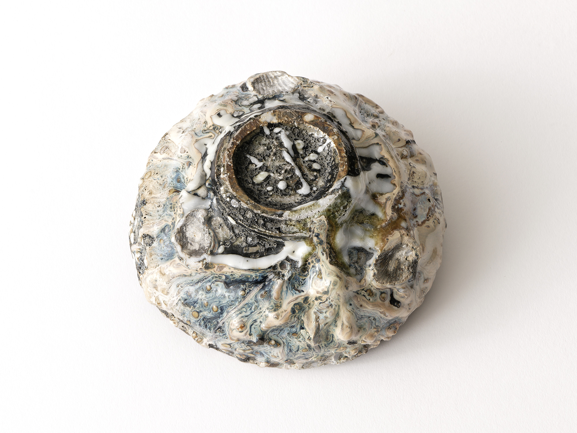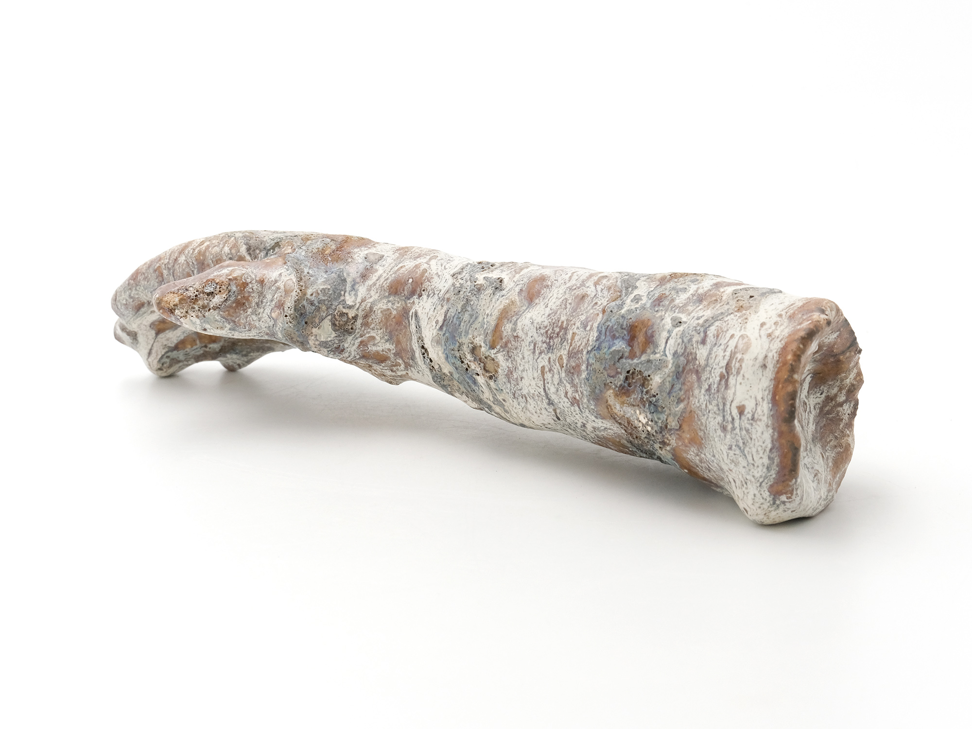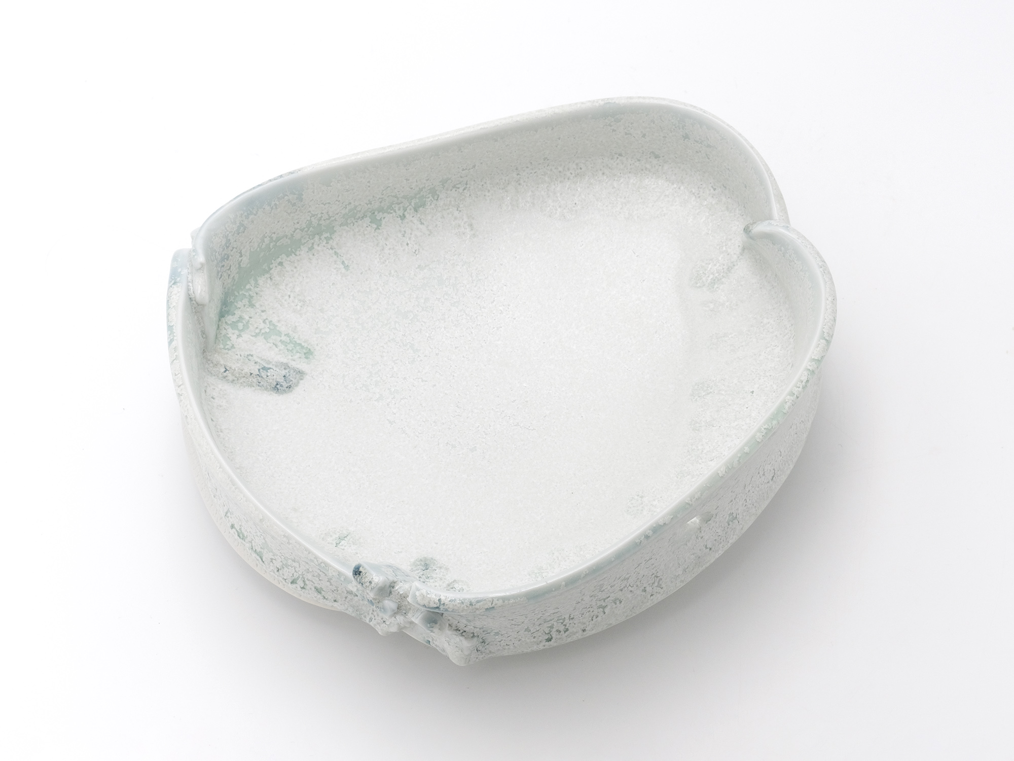 加藤真美の《フロスト釉花入》は、磁器土を用いて板作り技法で制作した花入。 フロスト釉独特の磁肌と磁器土にでた火色がなんとも温かい。丸めた板が重なる部分には、この作家の特徴であるちぎったり破いたりと破調の美が表現され、全体の緊張感を和らげている。
