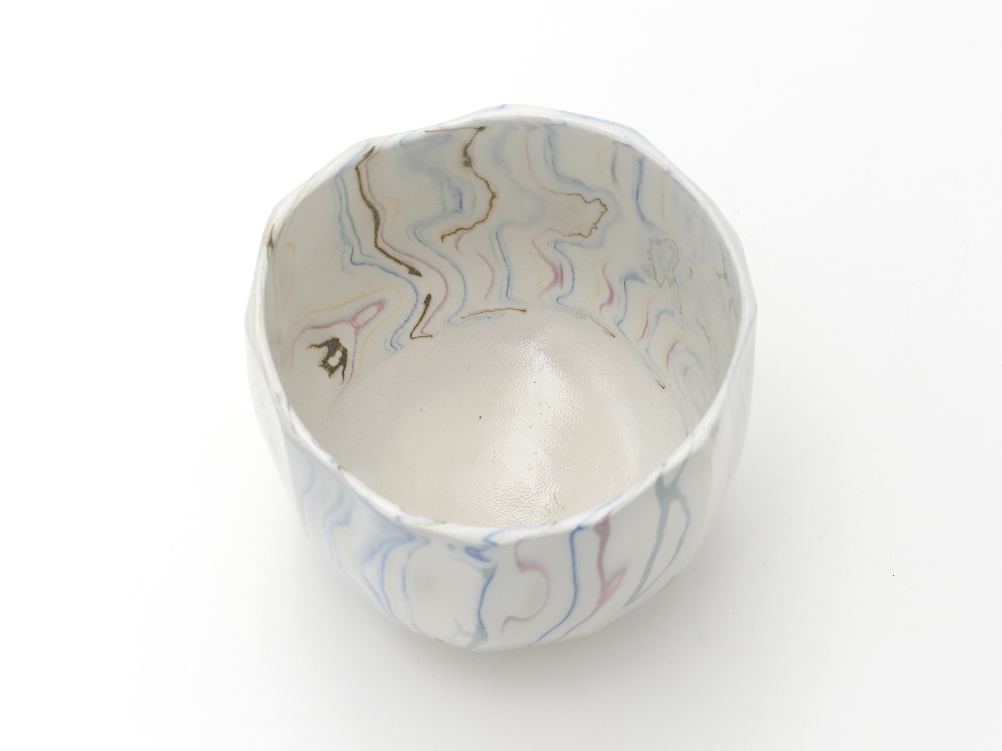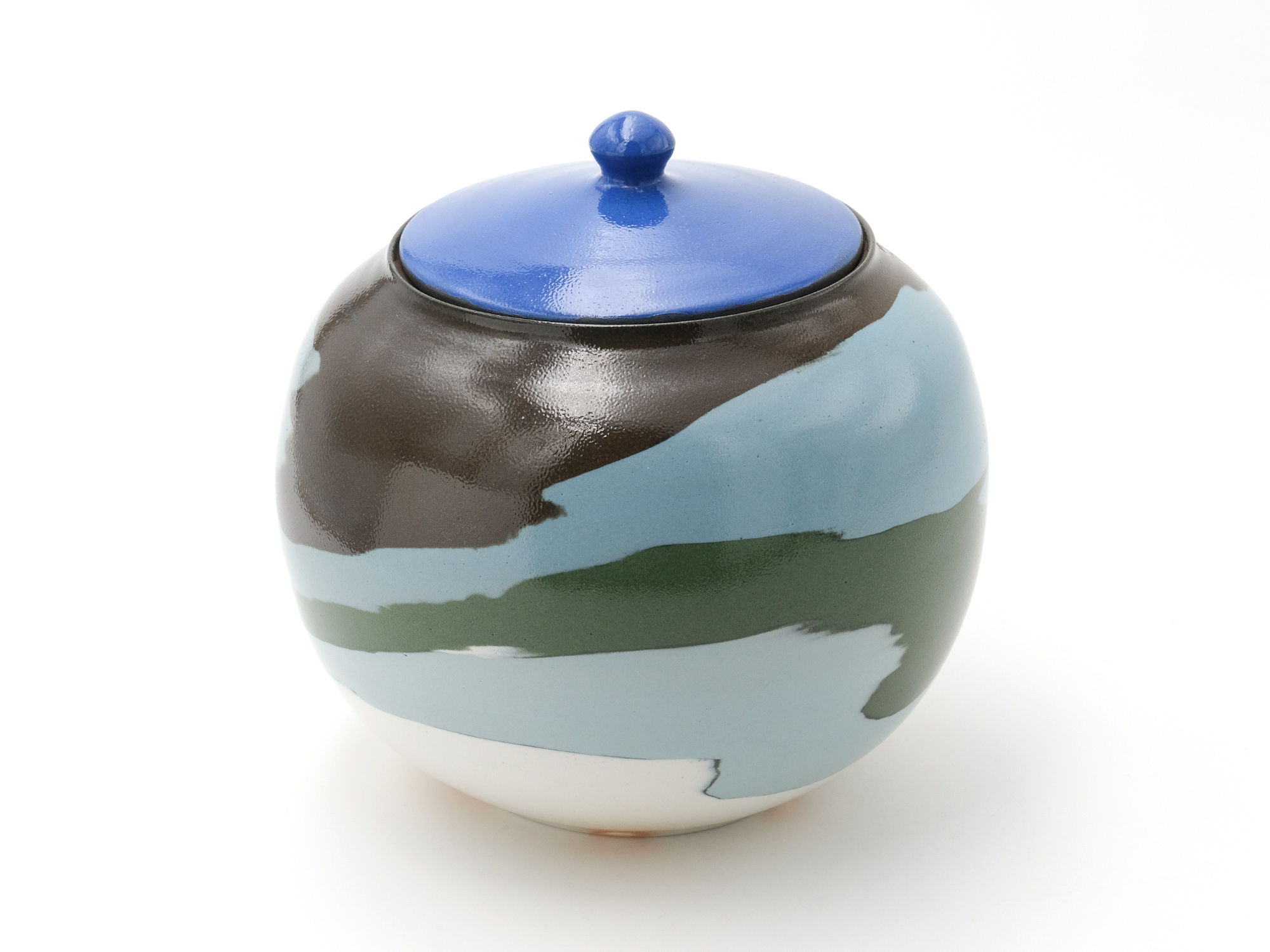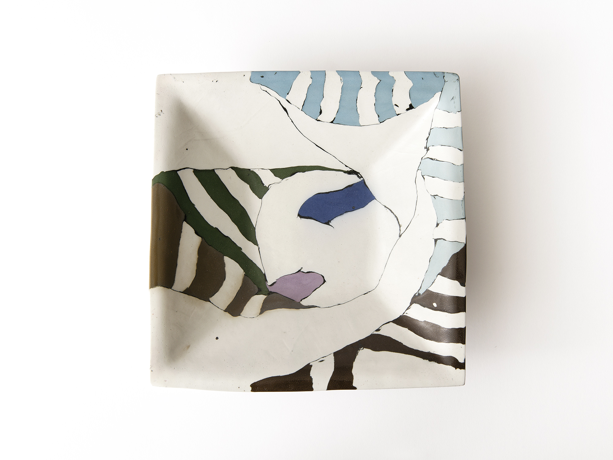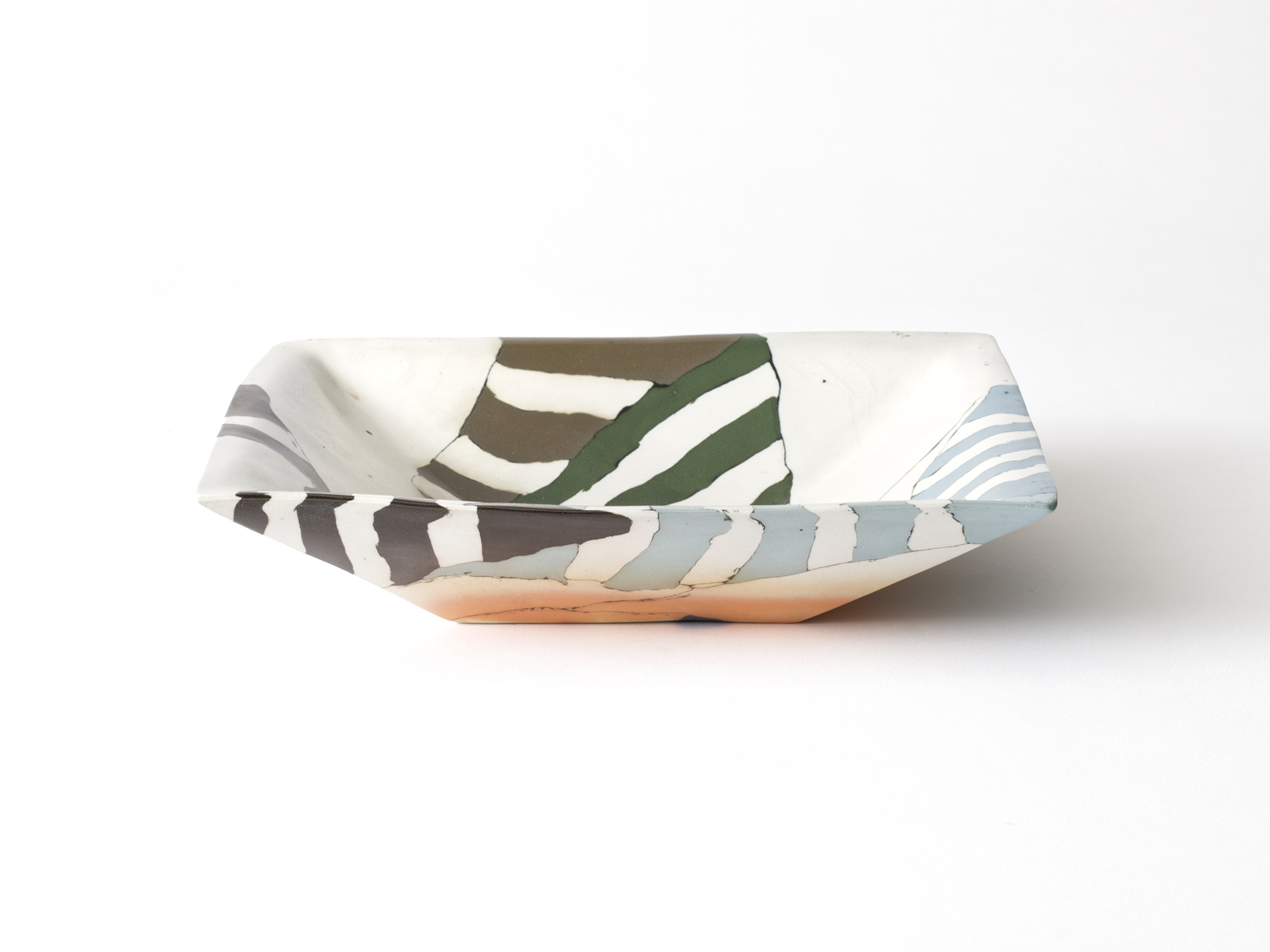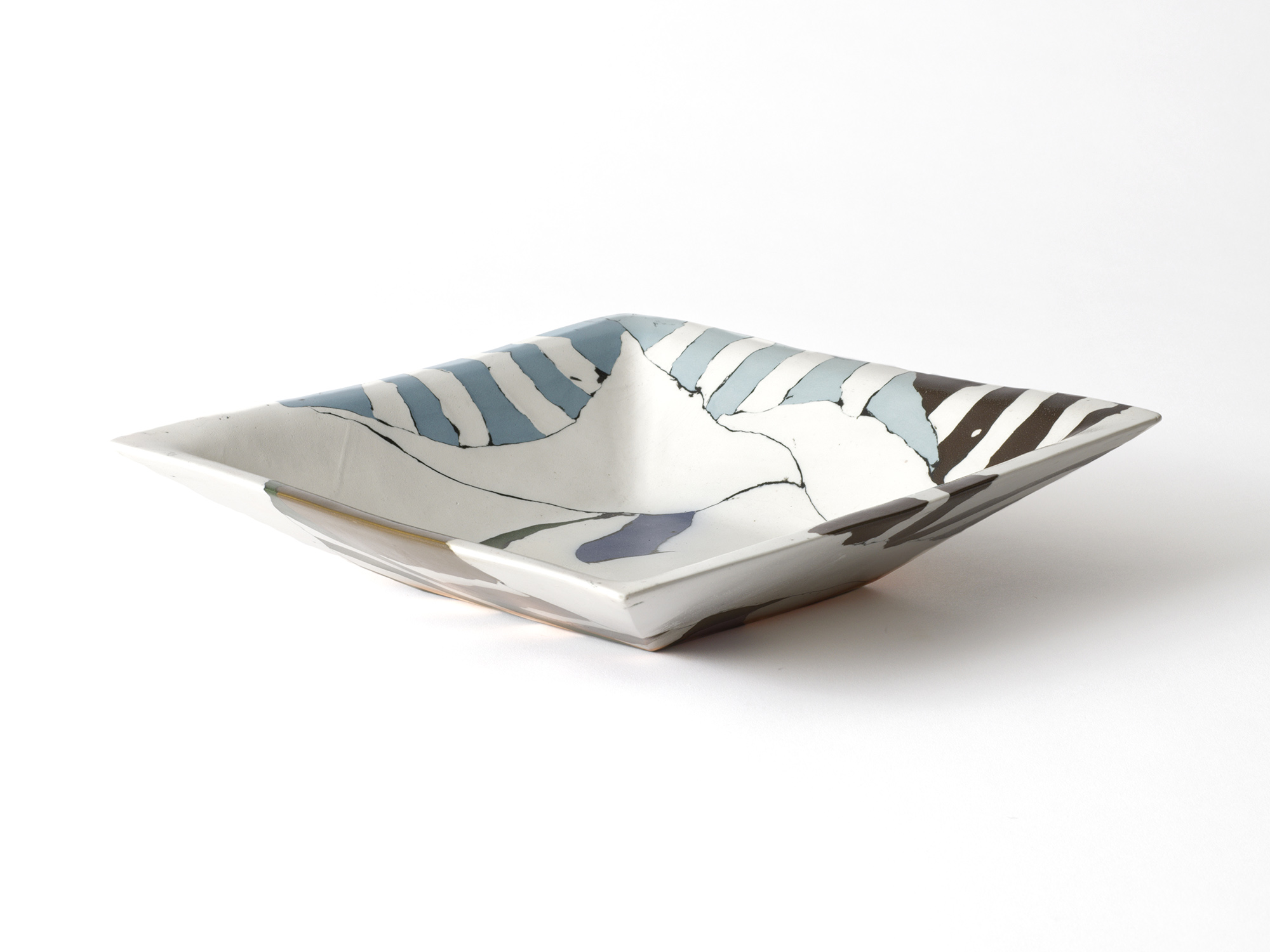伊藤雄志の《練込角鉢》は、微妙に濃淡の違う縞模様と黒い線によるモダンな図柄の作品である。 表面を叩くことによって土の持つ素朴さと強さと伊藤の感性が溶け合って、何とも言えない表情を醸し出している。