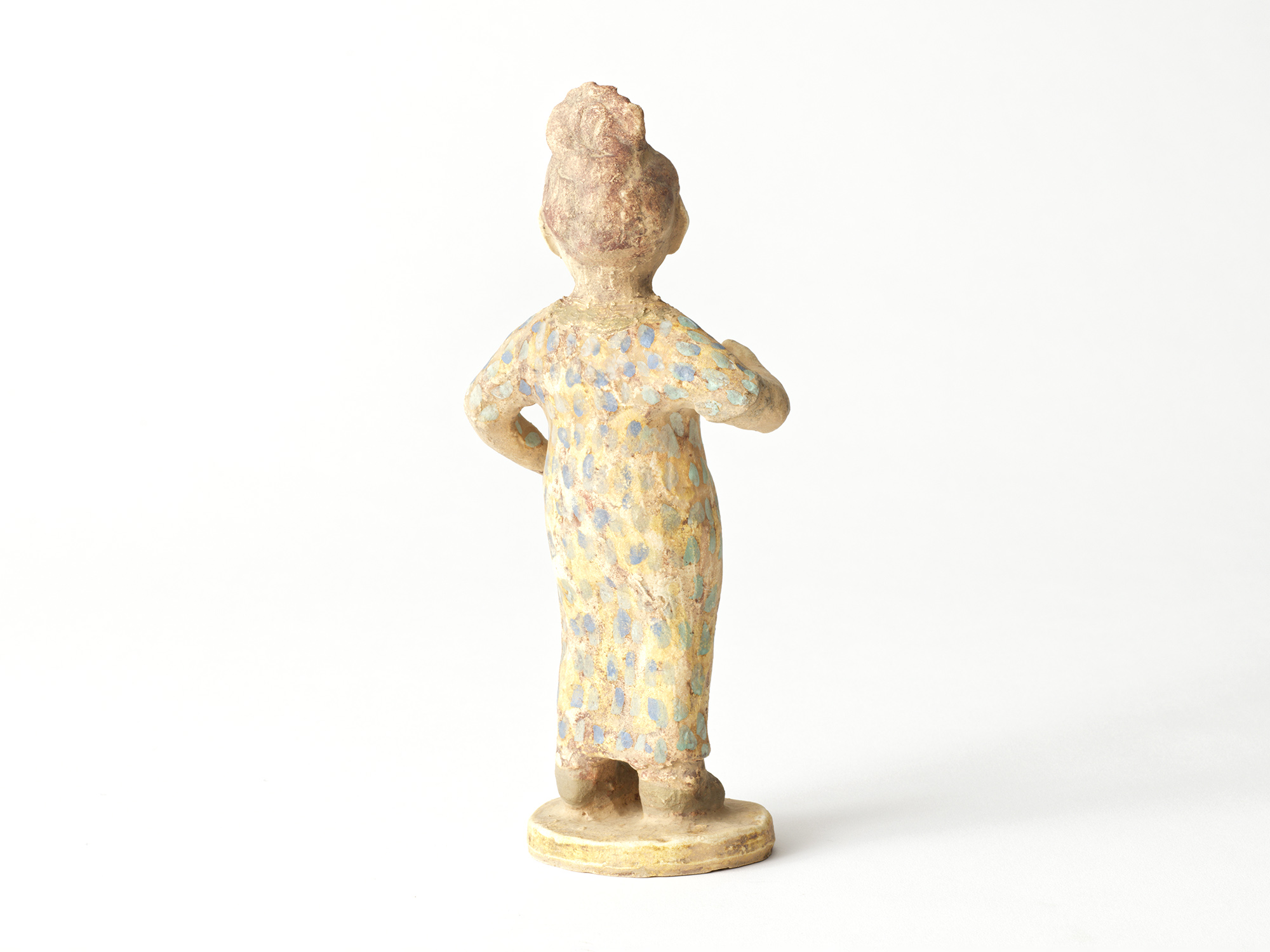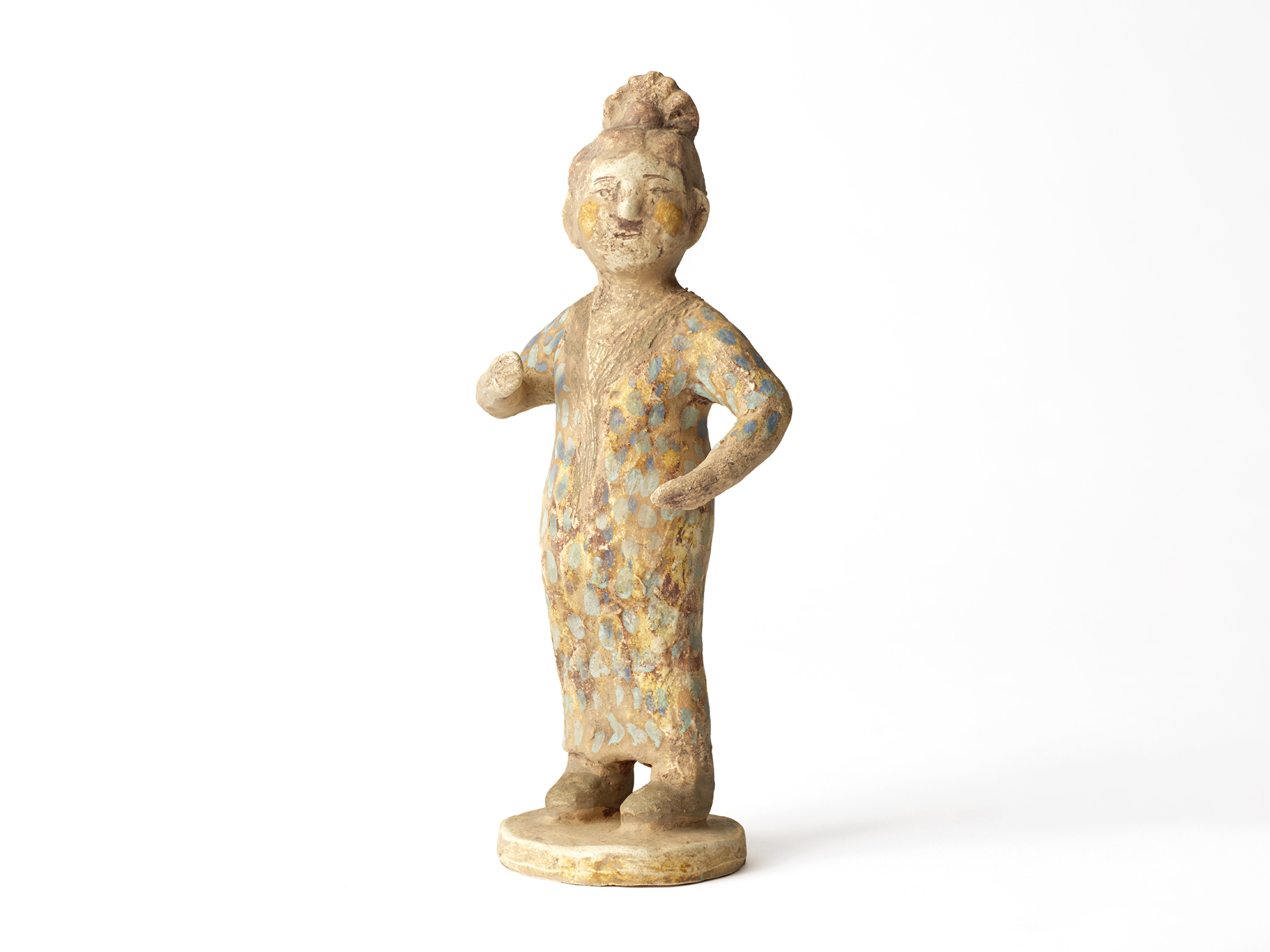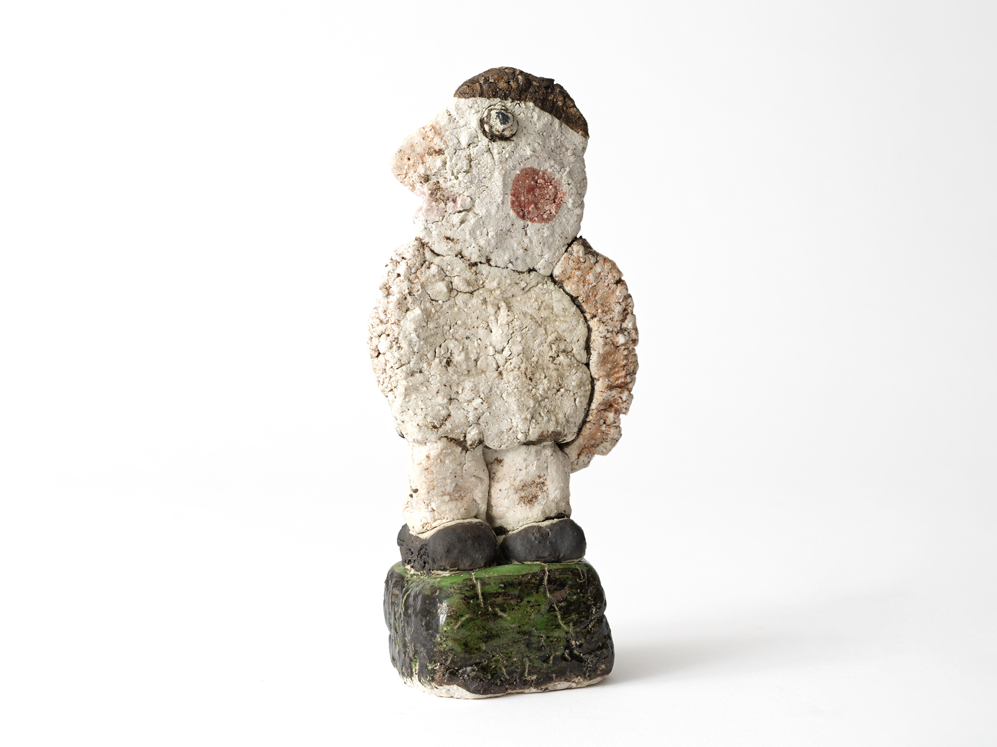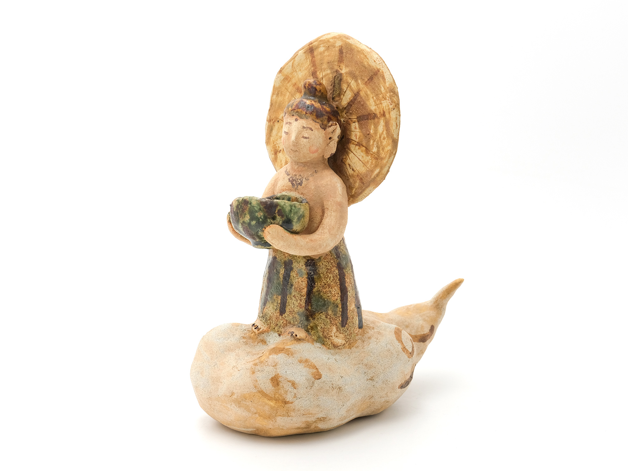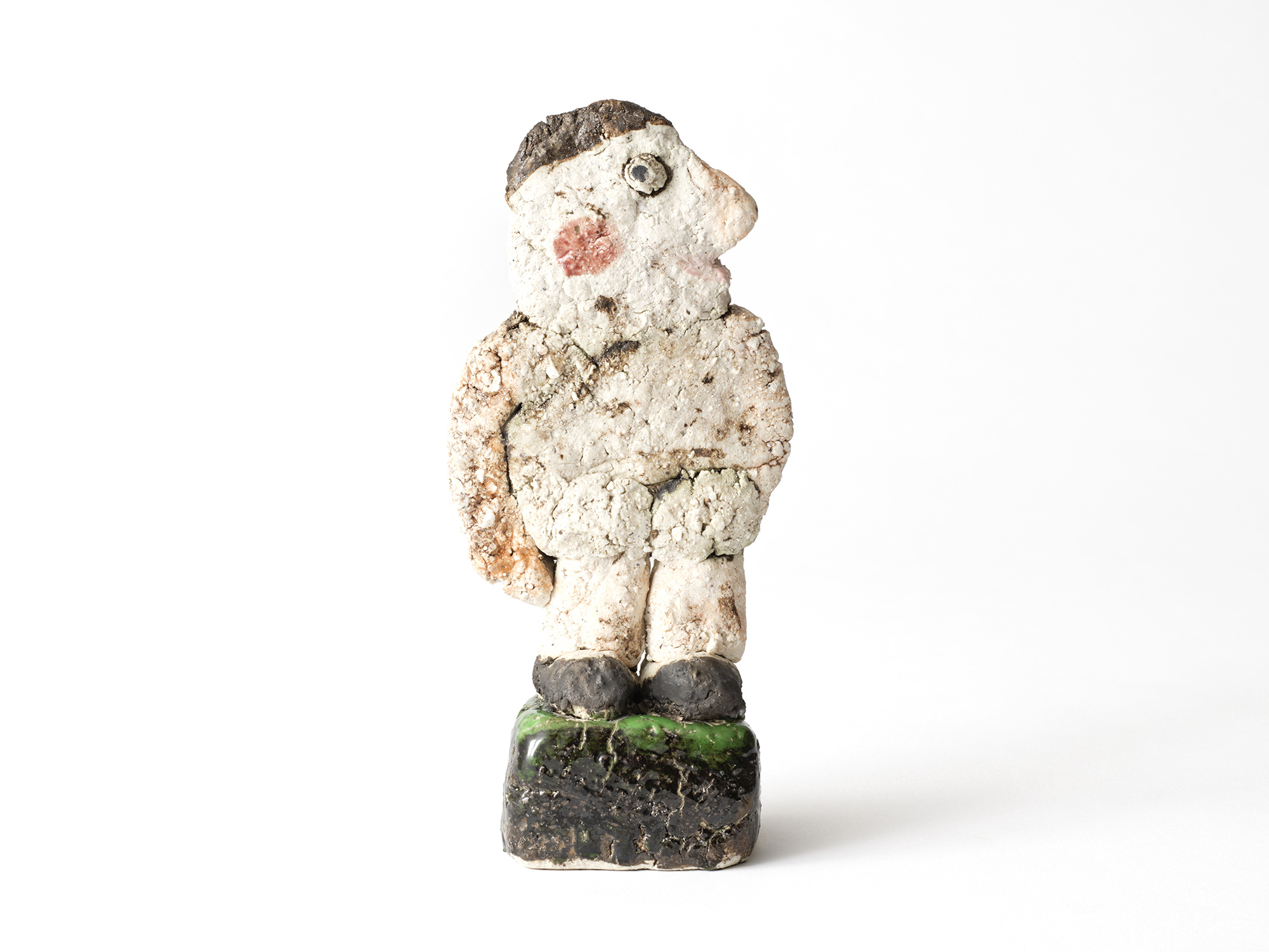 濱比嘉詩子の《古代の人》は、白化粧を掛け、焼成後にトノコや日本画の絵の具で彩色したもので、古代の女性がひらりと立っているイメージの作品。 この作家の作品にはポエジィーがあり、不思議な魅力に溢れている。