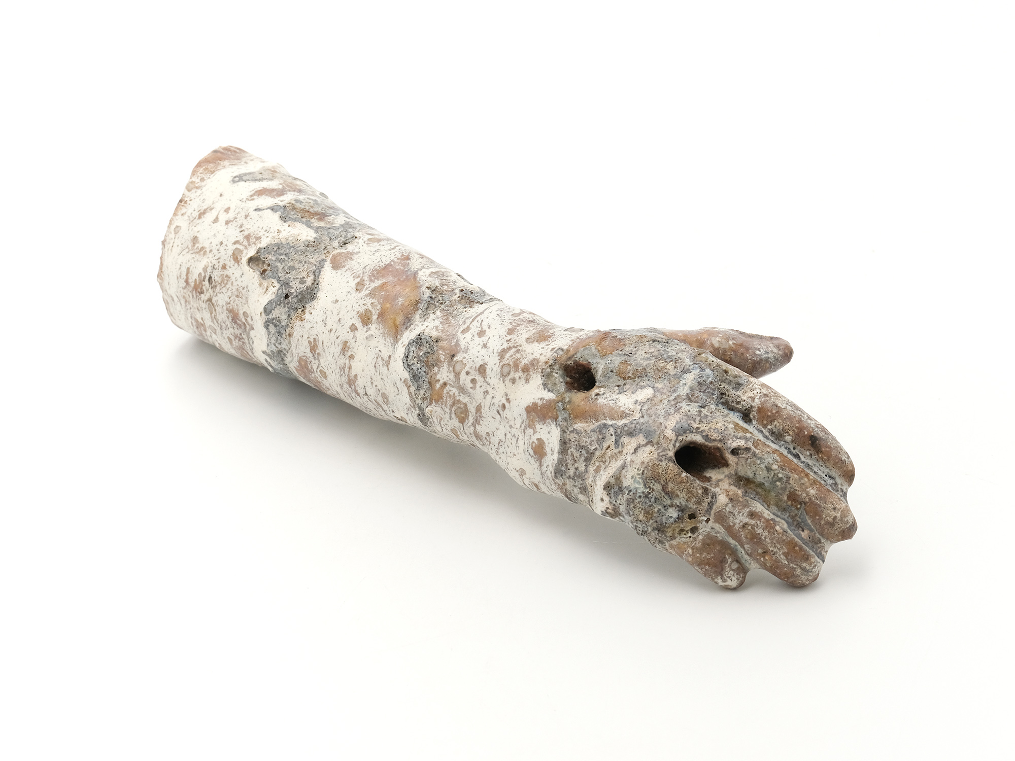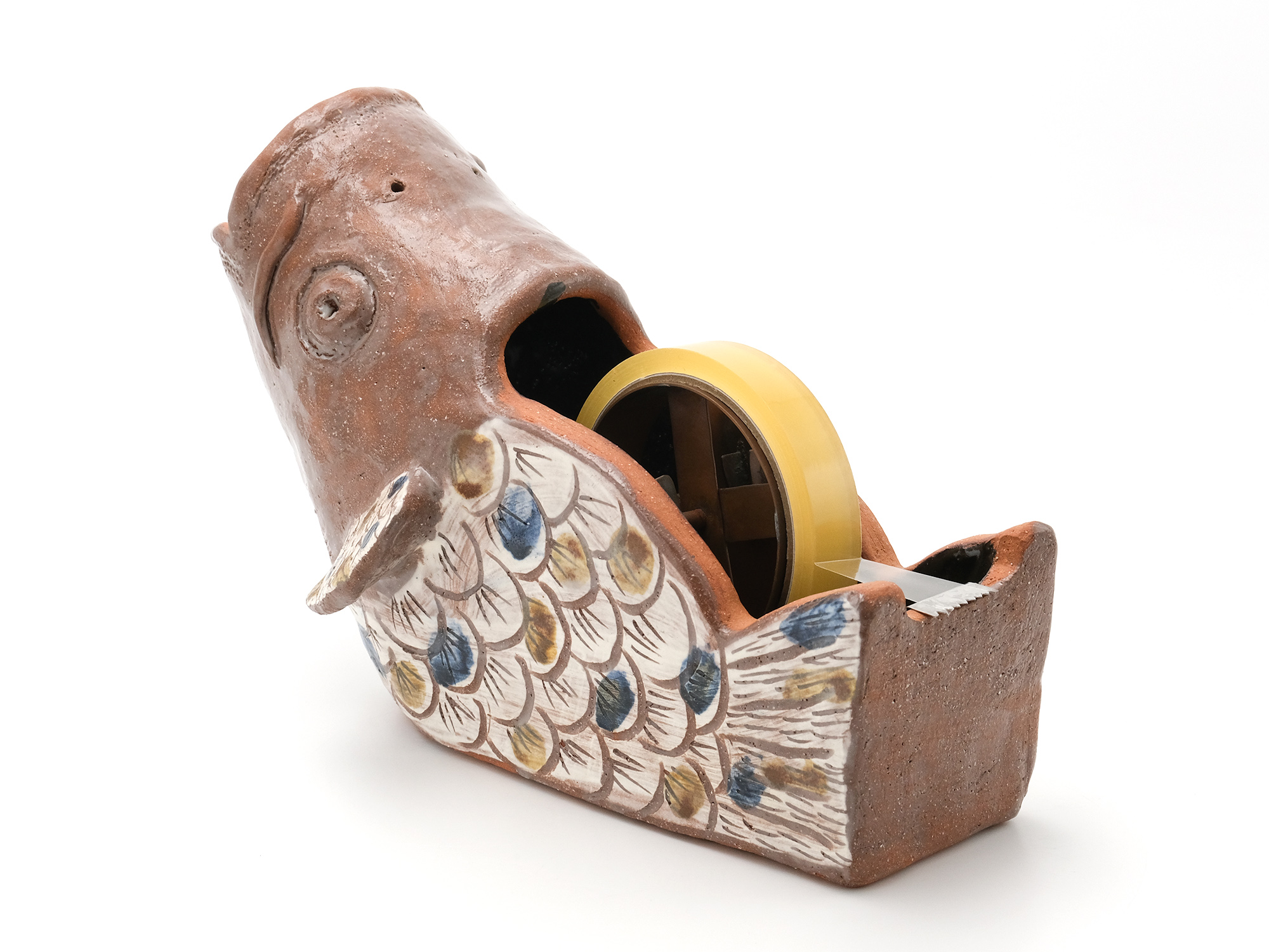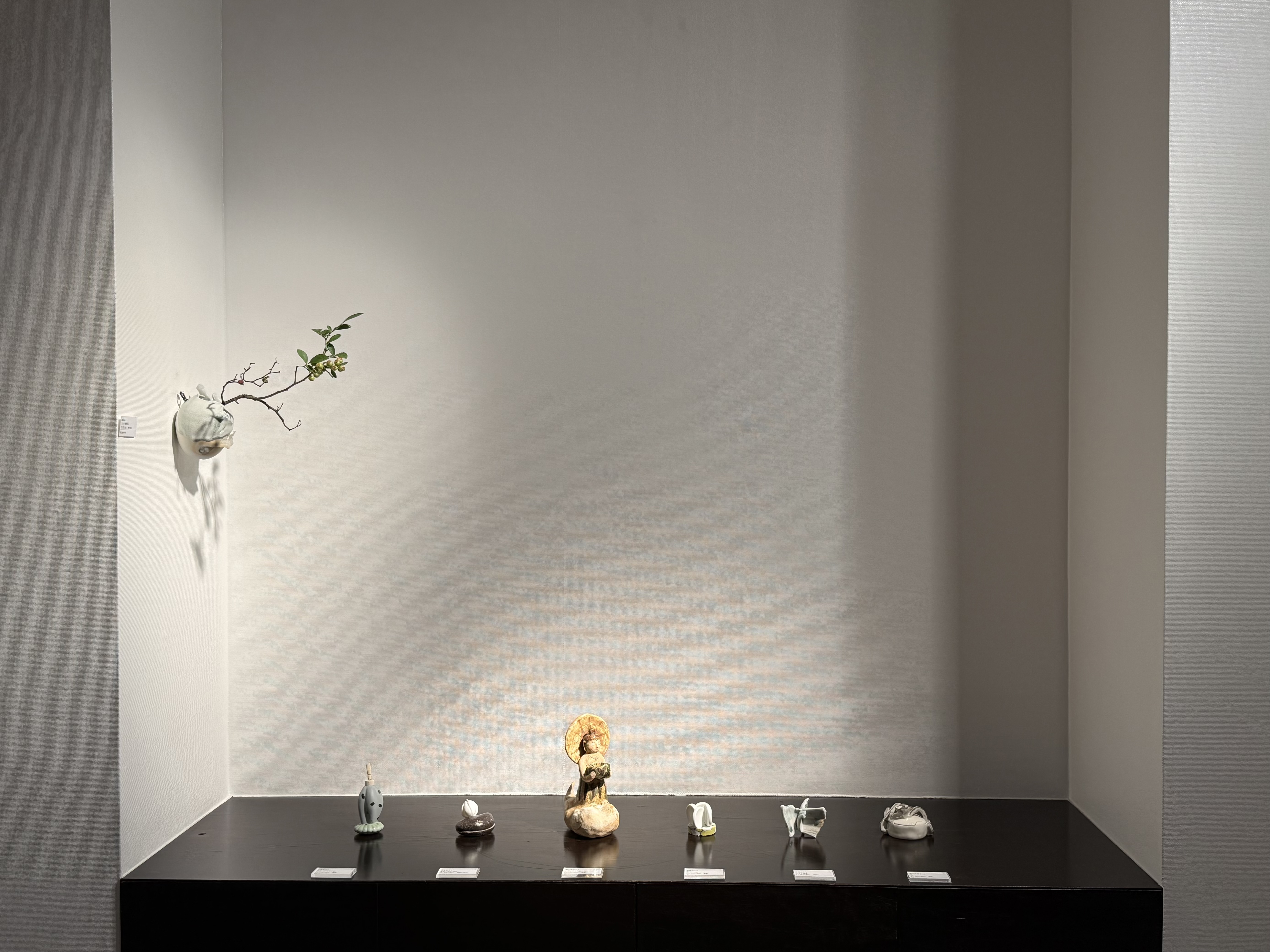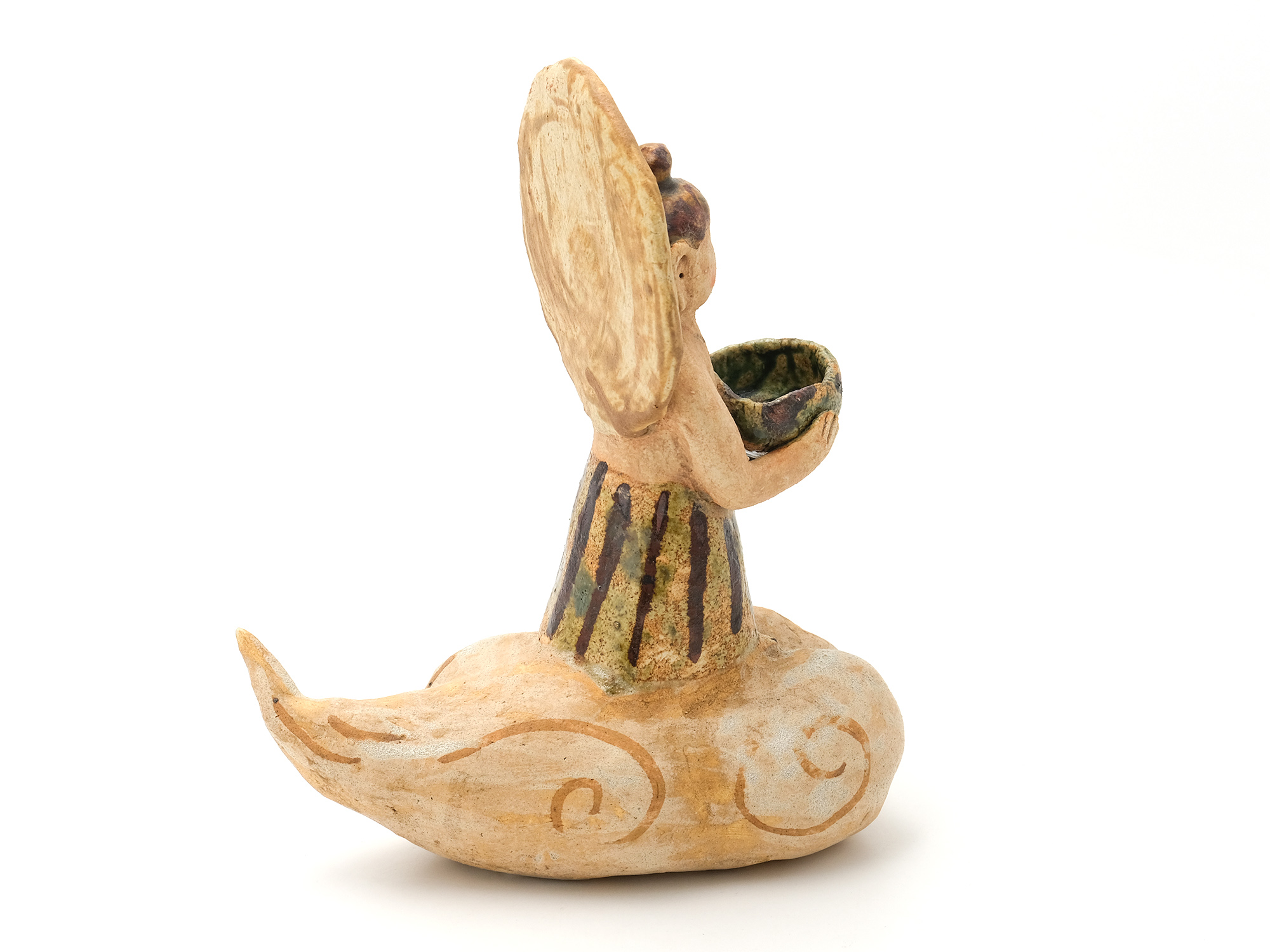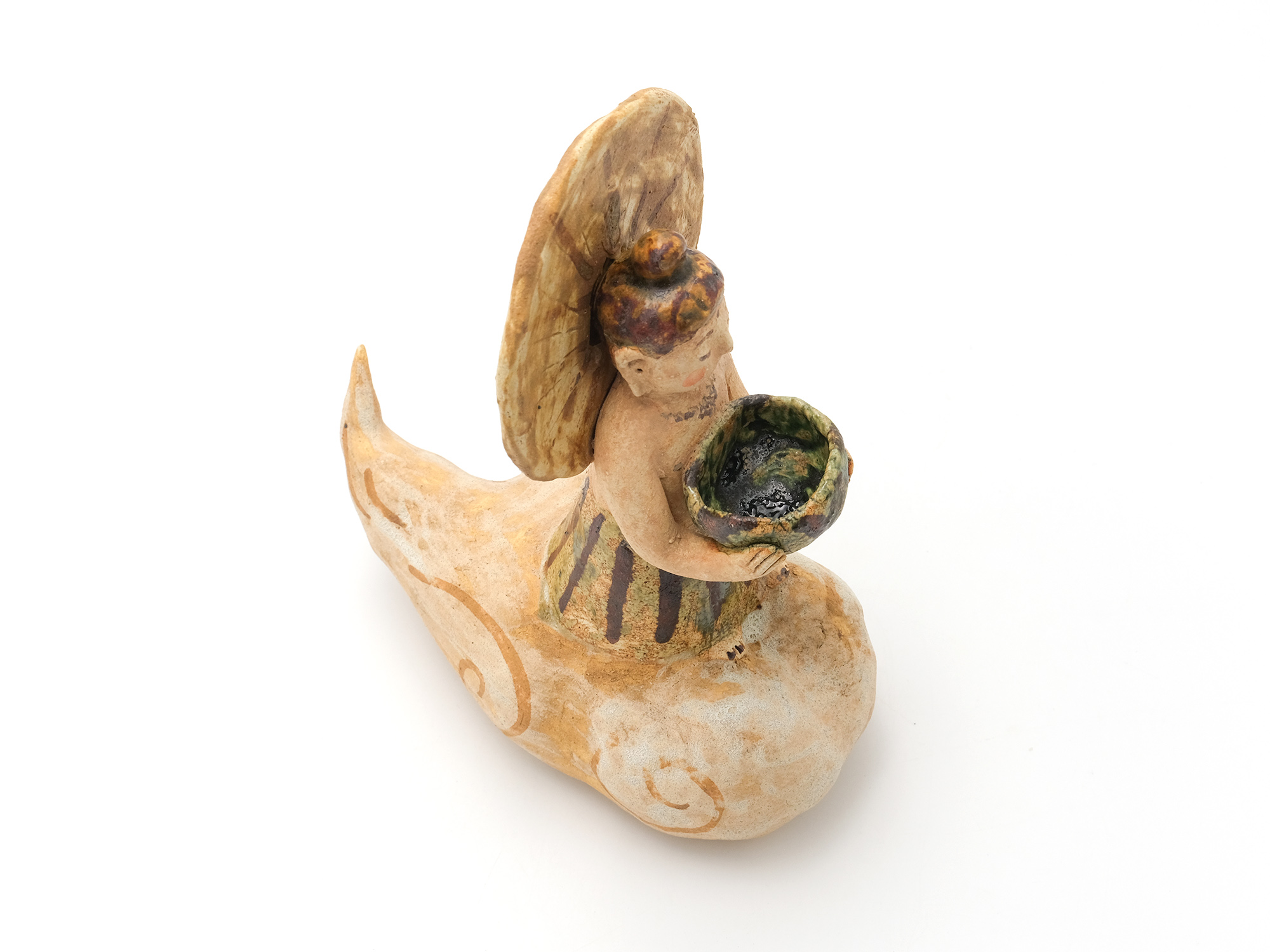 濱比嘉詩子の《古代の人》は、白化粧を掛け、焼成後にトノコや日本画の絵の具で彩色したもので、古代の女性がひらりと立っているイメージの作品。 この作家の作品にはポエジィーがあり、不思議な魅力に溢れている。