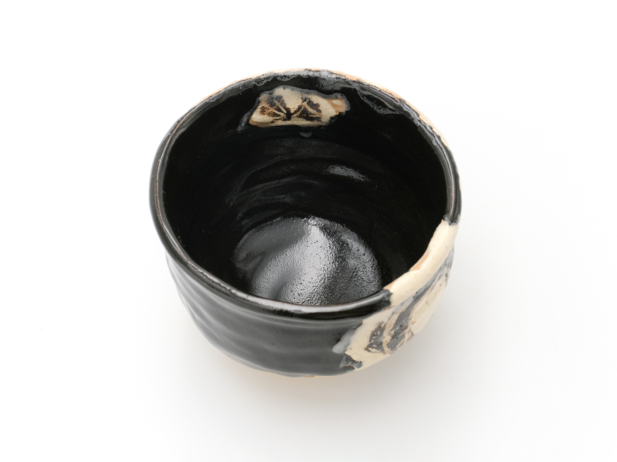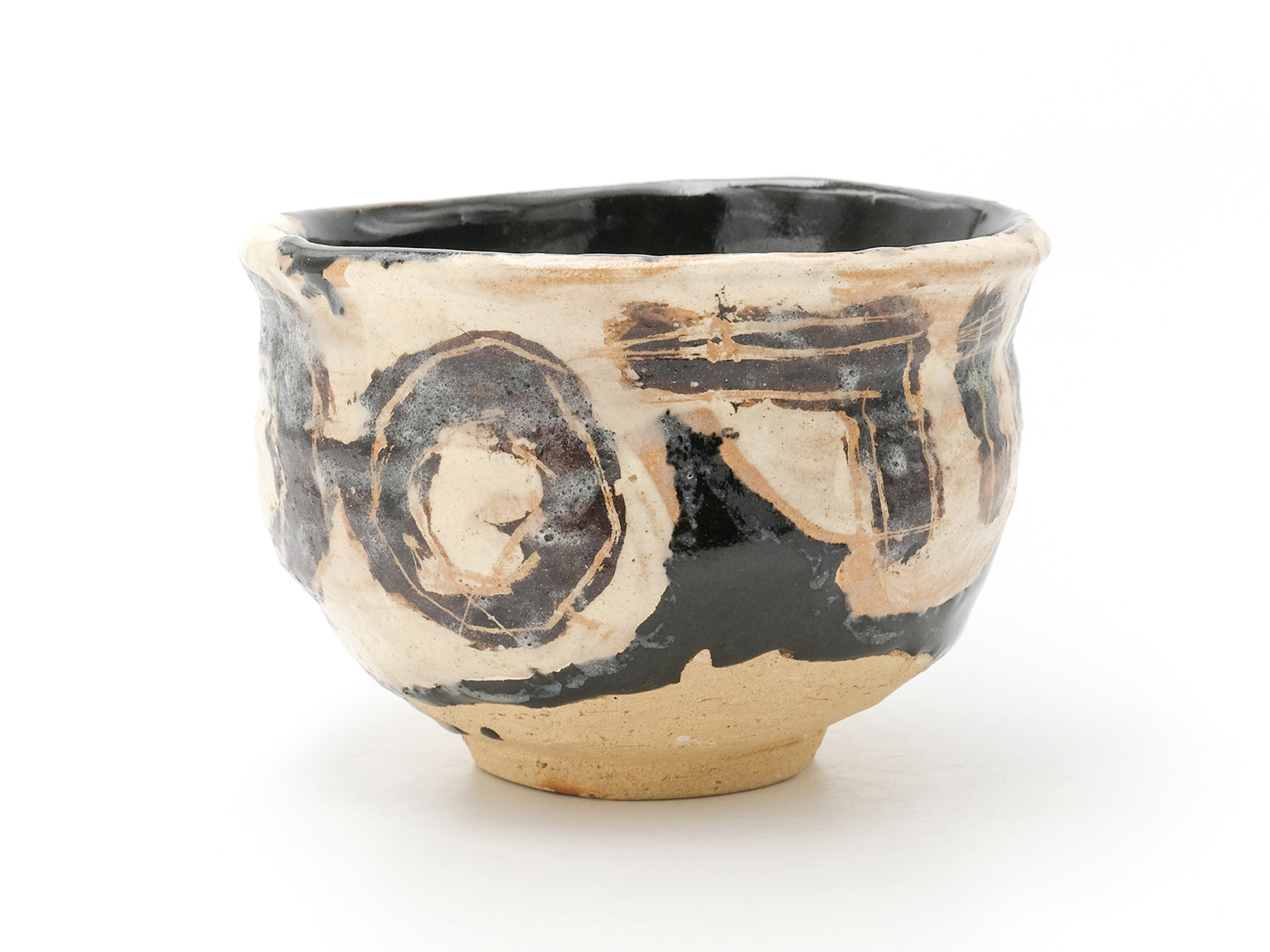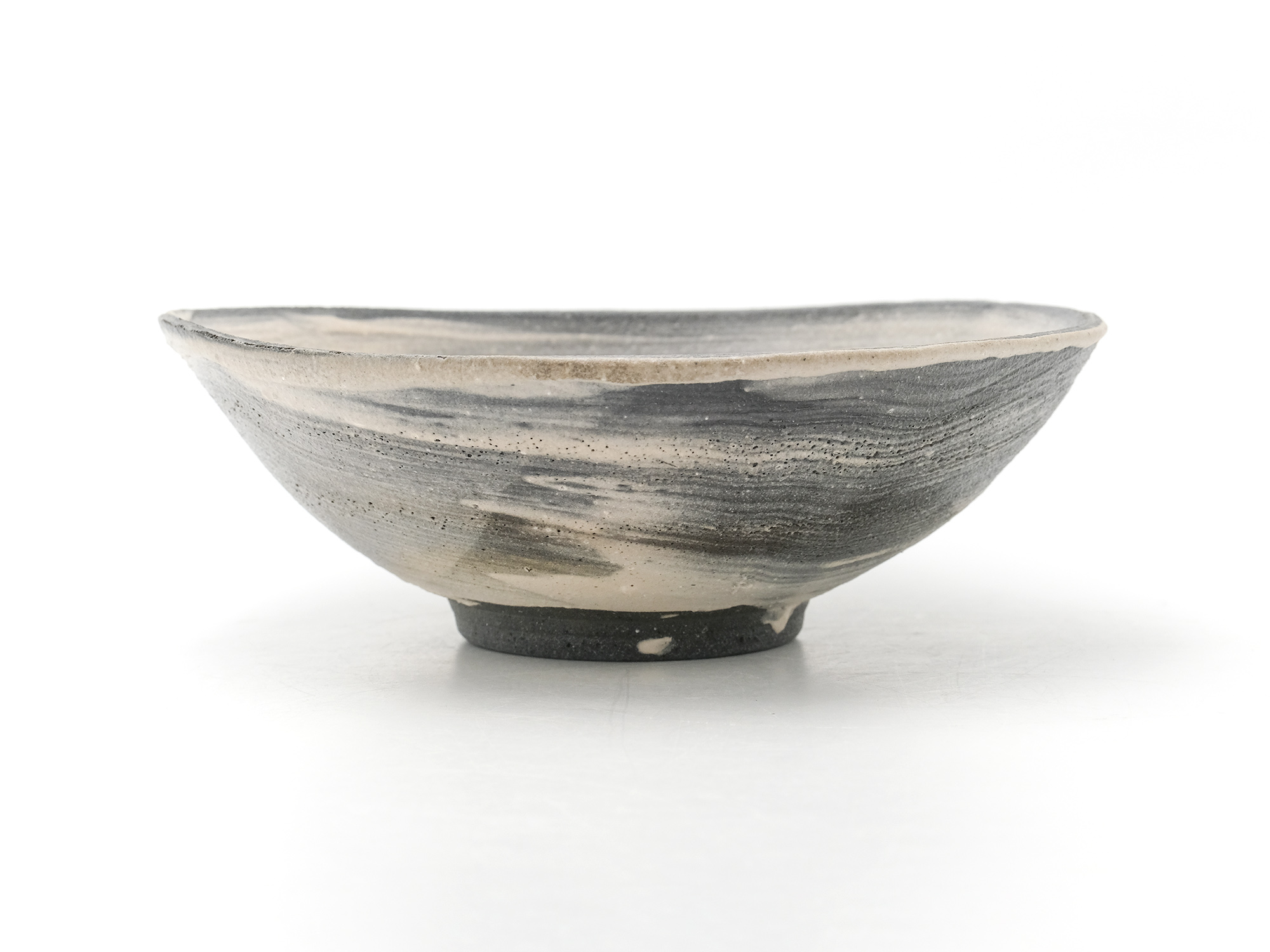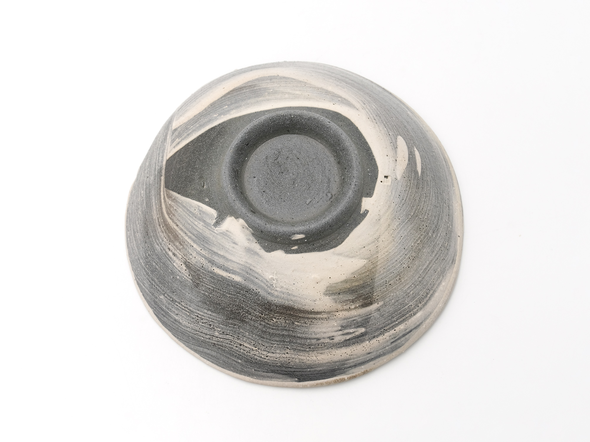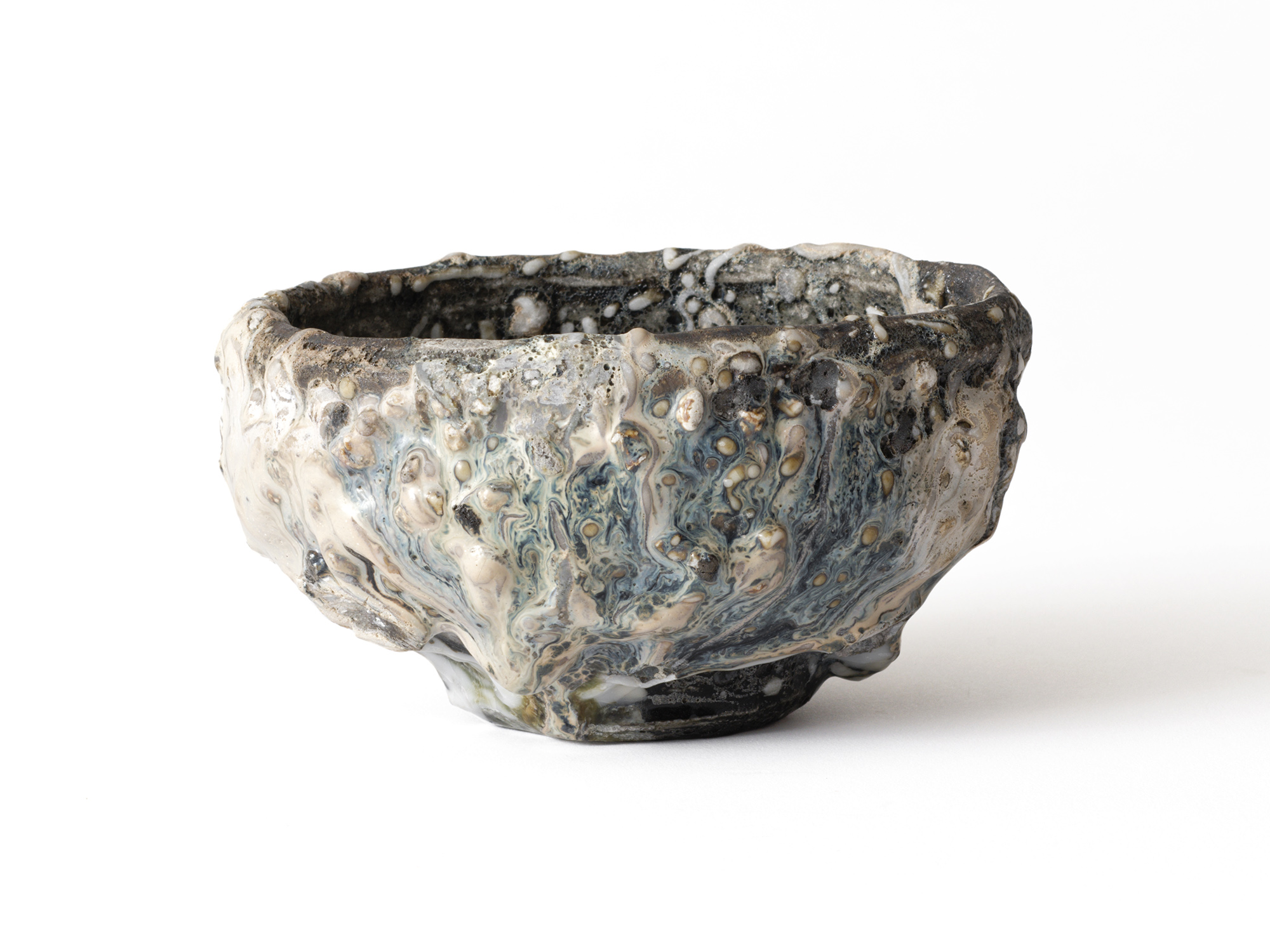 大原光一の《飛石黒灰釉茶盌「愚助」》は、流れ出た溶岩が固まったような大地の力強さを感じる豪快な茶盌。 独自にブレンドした土と、化粧土と釉薬による荒々しくも凛とした豊かな釉調が魅力的である。