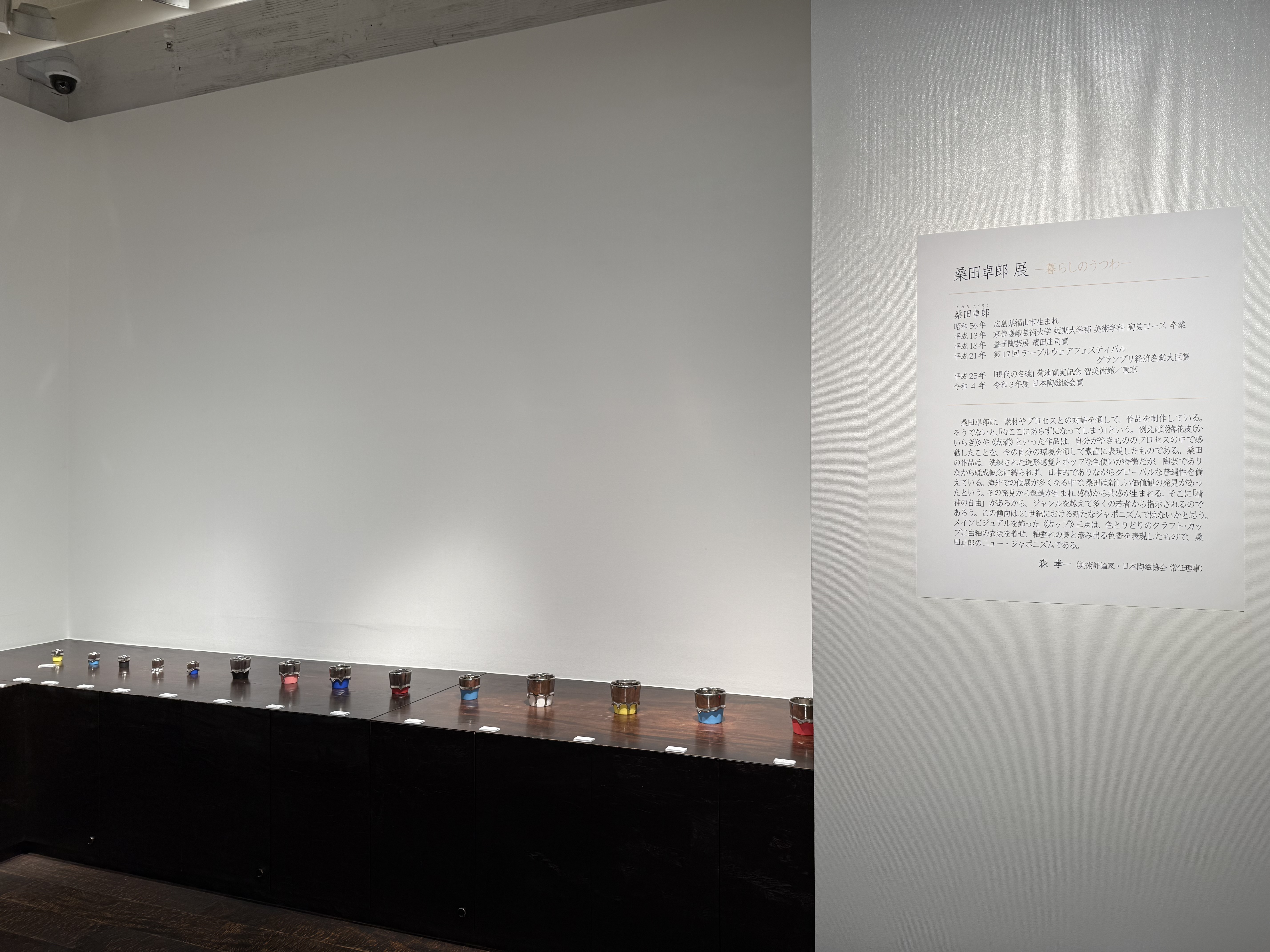 桑田卓郎は、素材やプロセスとの対話を通して、作品を制作している。 そうでないと、「心ここにあらずになってしまう」という。 例えば、《梅花皮(かいらぎ)》や《点滴》といった作品は、自分がやきもののプロセスの中で感動したことを、今の自分の環境を通して素直に表現したものである。 桑田の作品は、洗練された造形感覚とポップな色使いが特徴だが、陶芸でありながら既成概念に縛られず、日本的でありながらグローバルな普遍性を備えている。 海外での個展が多くなる中で、桑田は新しい価値観の発見があったという。 その発見から創造が生まれ、感動から共感が生まれる。 そこに「精神の自由」があるから、ジャンルを越えて多くの若者から支持されるのであろう。 この傾向は、21世紀における新たなジャポニズムではないかと思う。 メインビジュアル↑となった《カップ》三点は、色とりどりのクラフト・カップに白釉の衣装を着せ、釉垂れの美と滲み出る色香を表現したもので、桑田卓郎のニュー・ジャポニズムである。 森 孝一(美術評論家・日本陶磁協会 常任理事) |