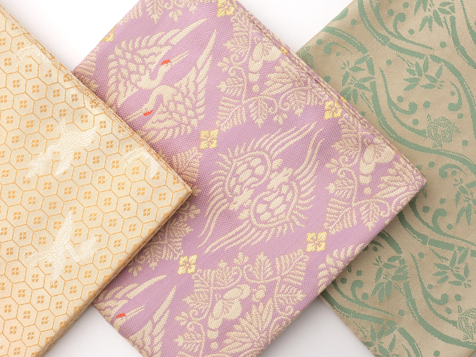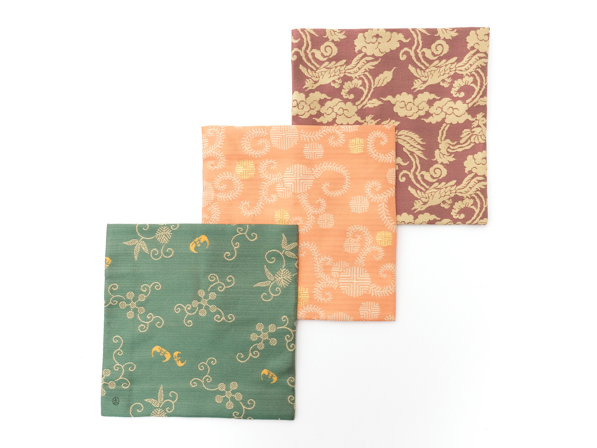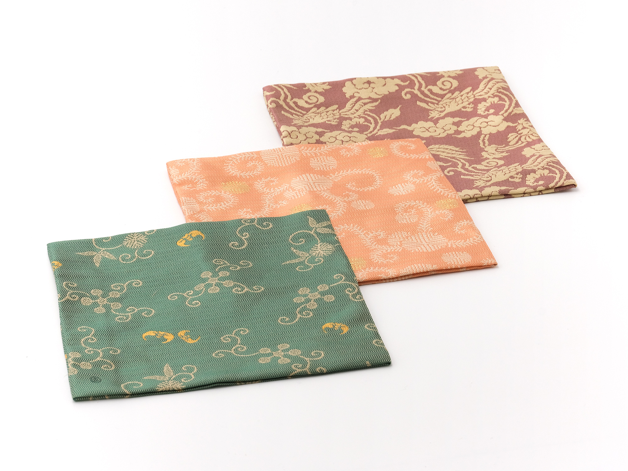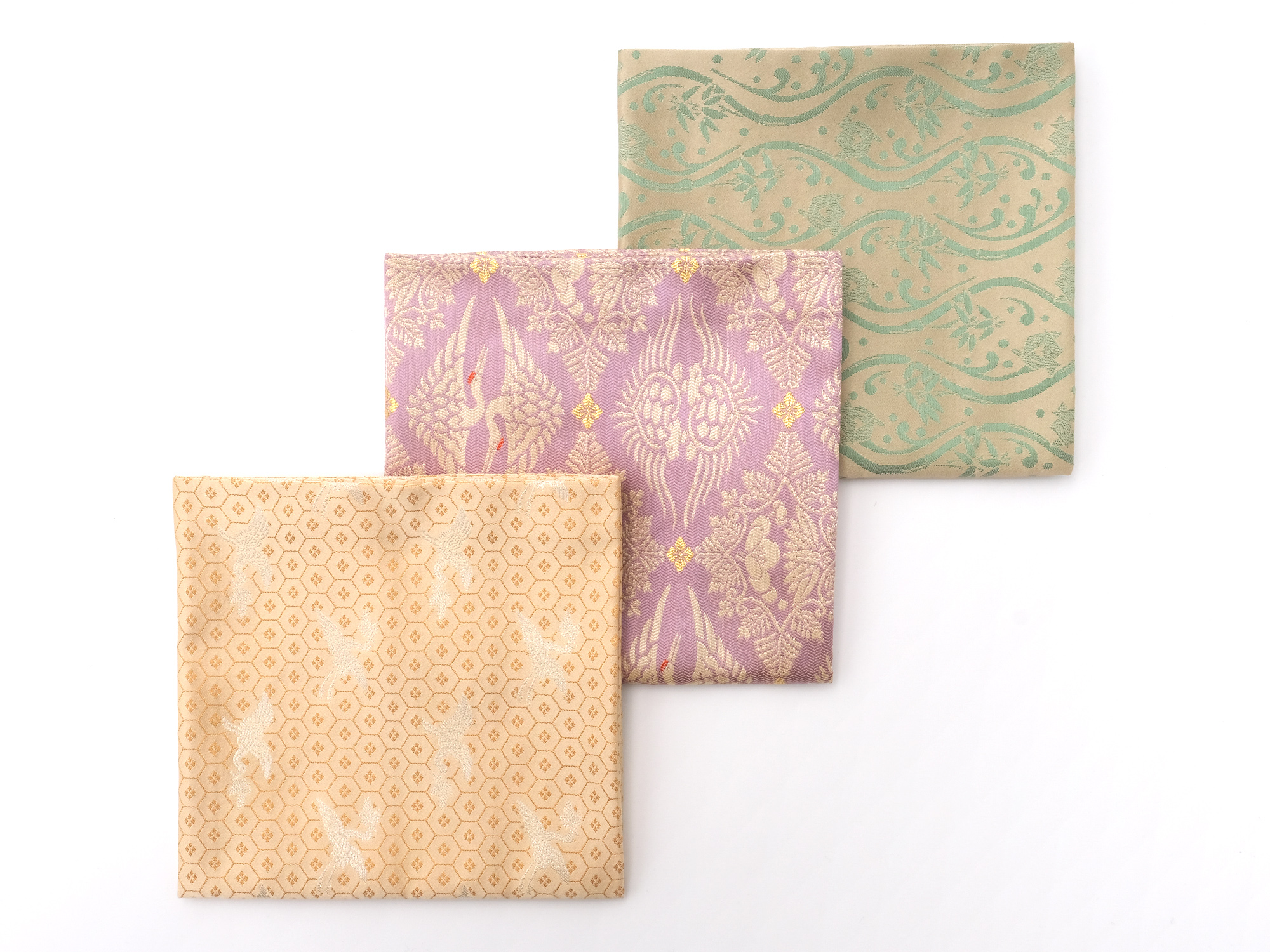 | 作品名 | [左] 出服紗 唐華唐草緞子 [中] 出服紗 亀甲龍文緞子【ご売約済】 [右] 出服紗 立涌草花文紹巴 |