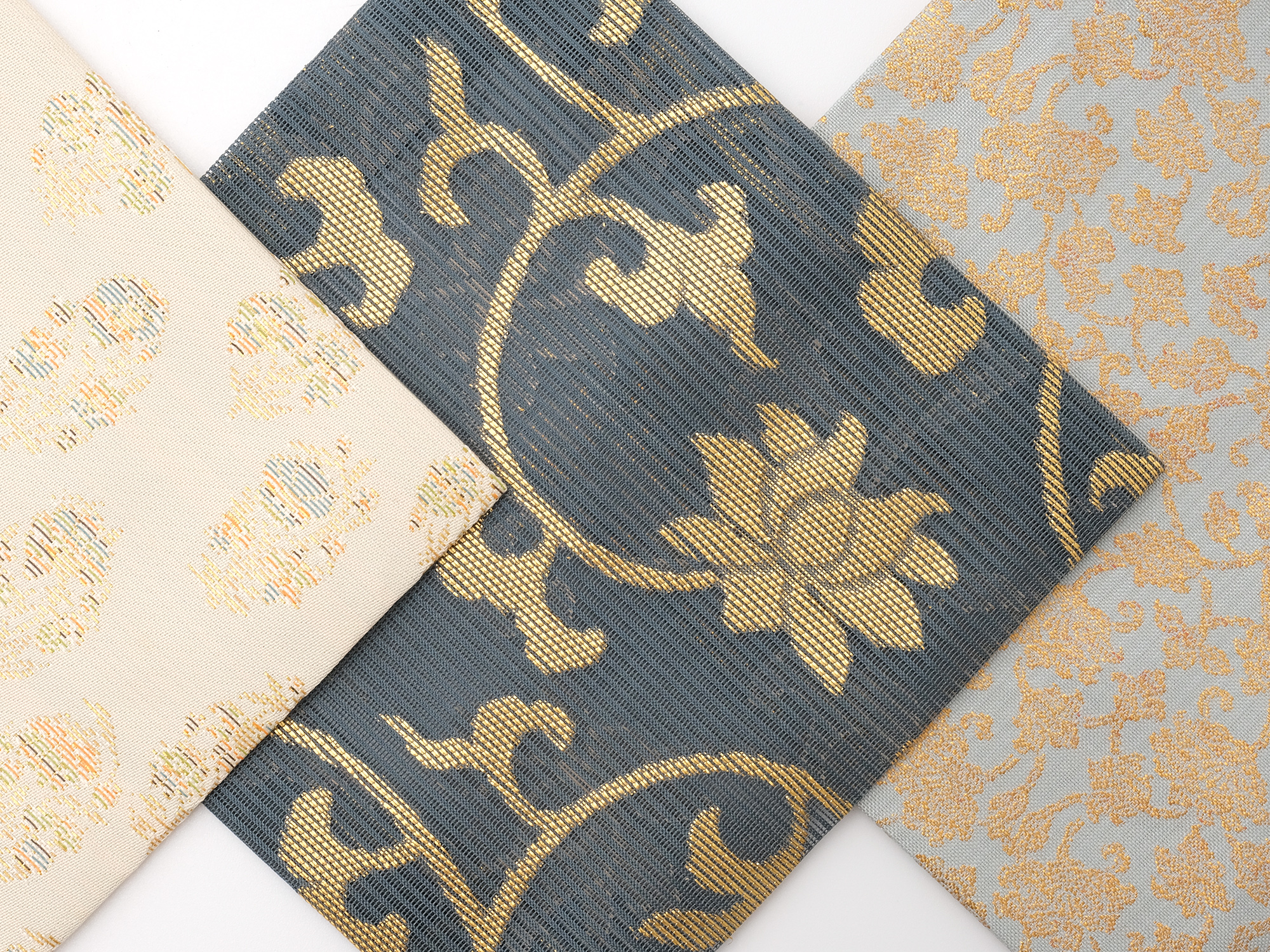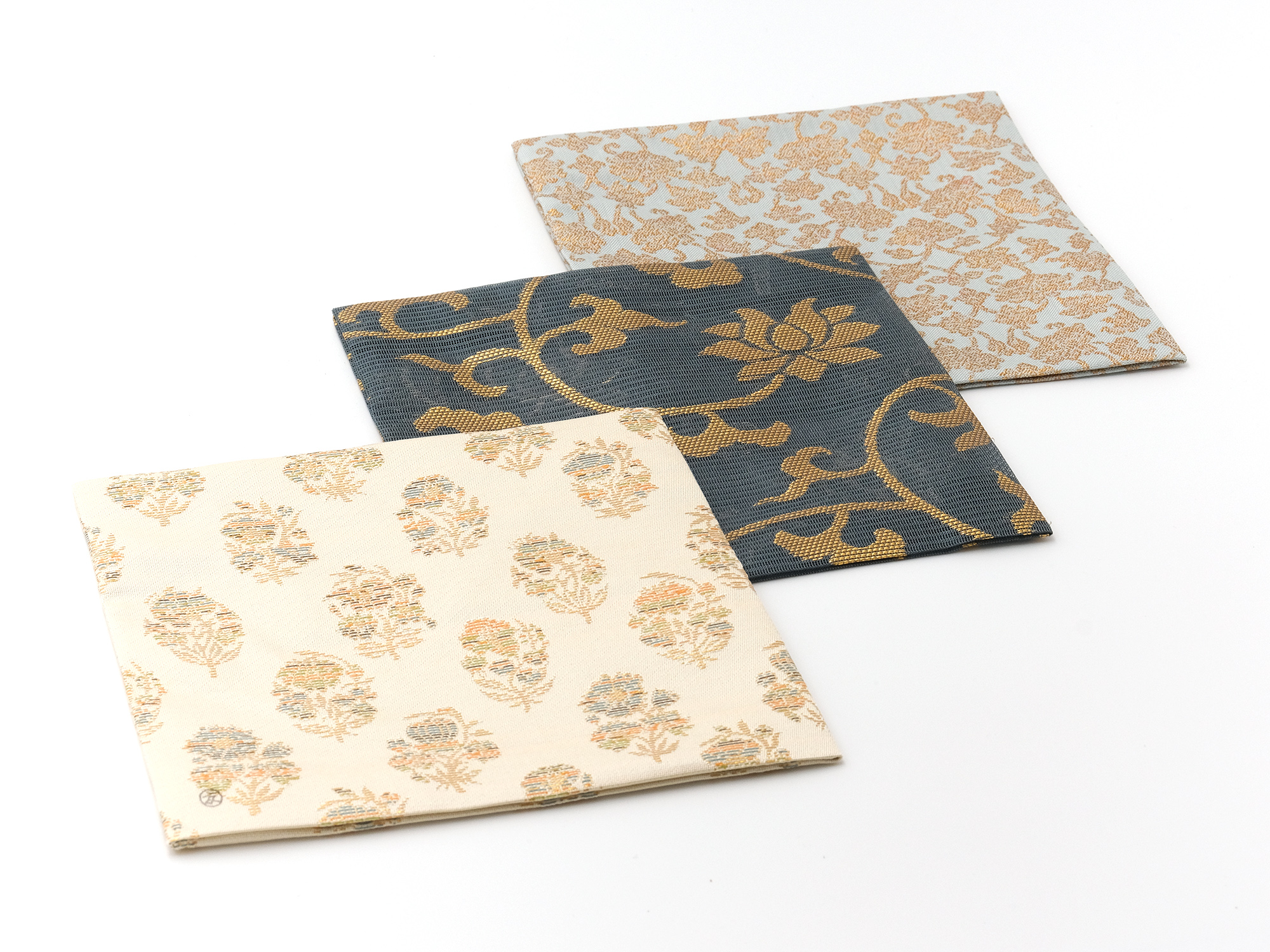 | 作品名 | [左] 古服紗 一房花文絧入金襴【ご売約済】 [中] 古服紗 牡丹唐草金紗【ご売約済】 [右] 古服紗 牡丹唐草金襴 |