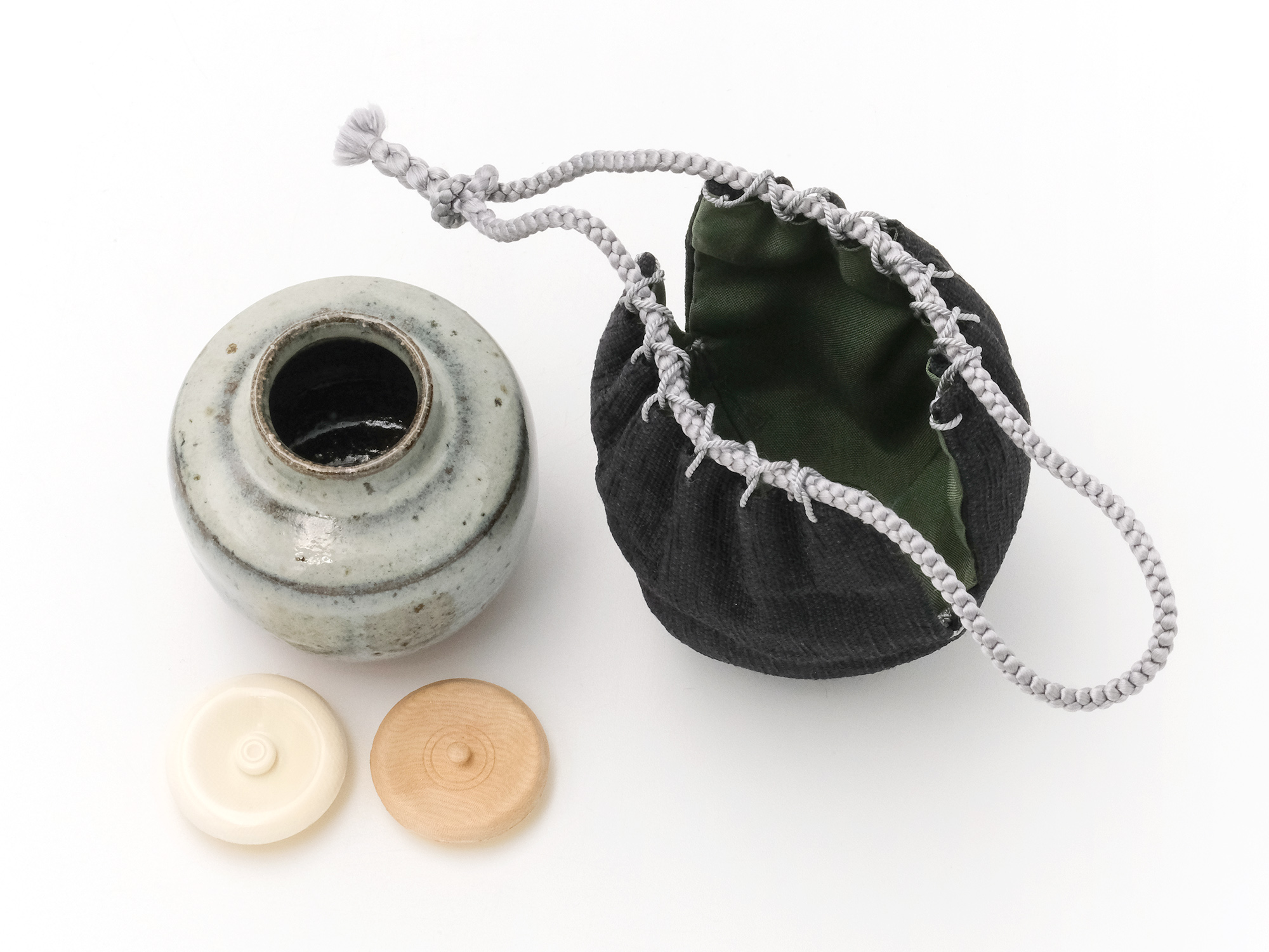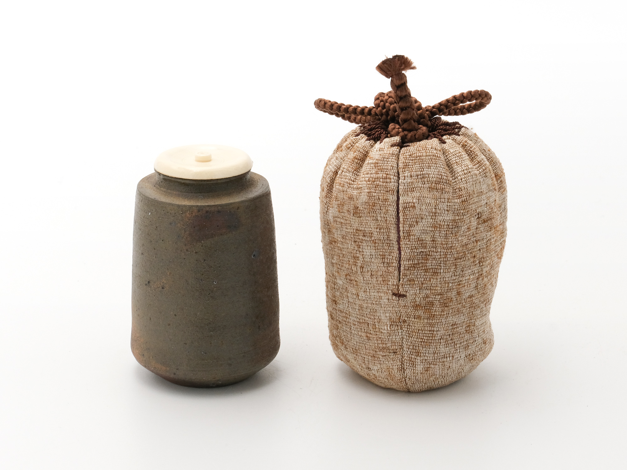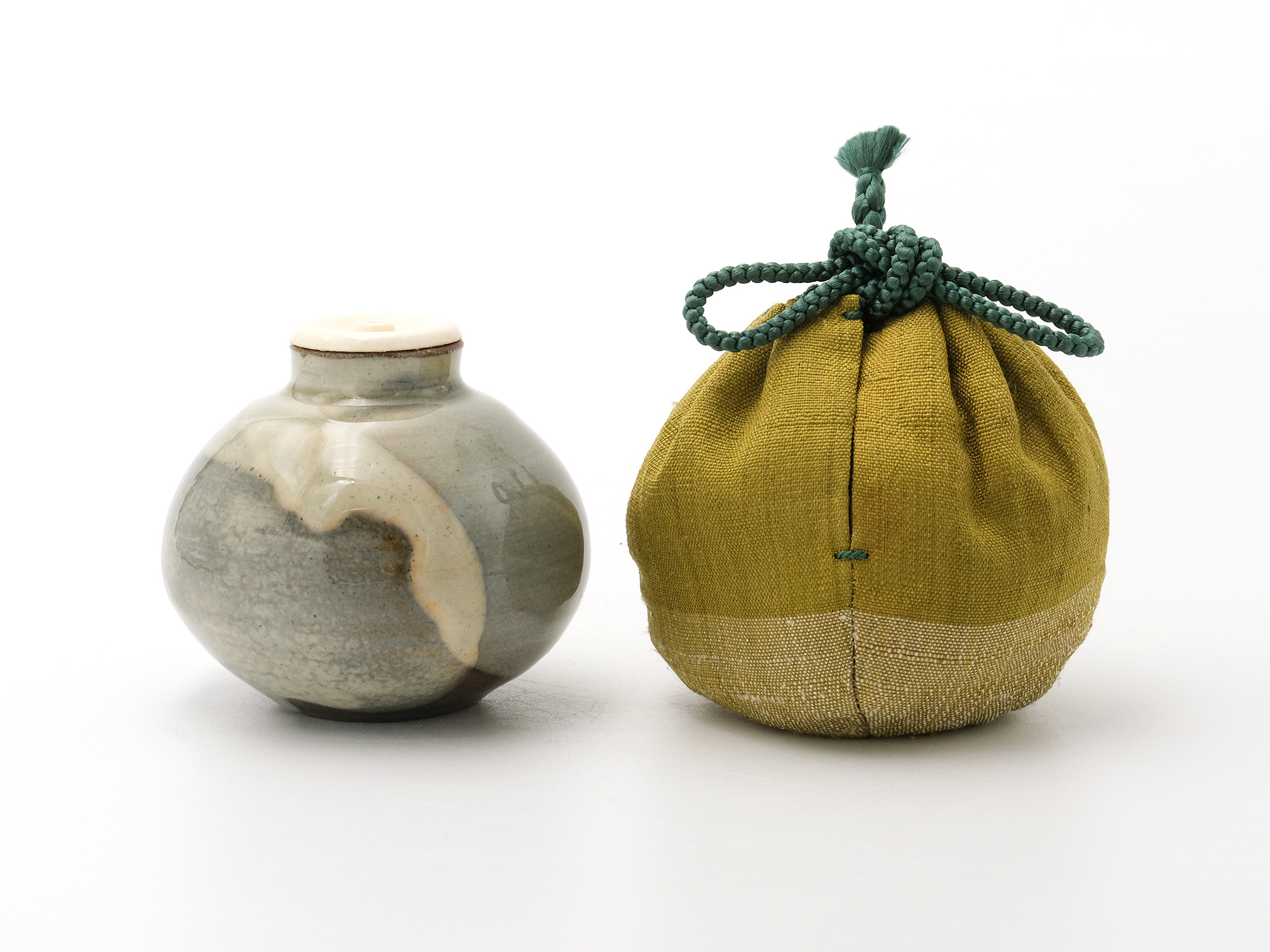 | 作品名 | 粉引茶入[仕覆・牙蓋・木蓋付] 仕覆 青朽葉色手紡ぎ手織 |