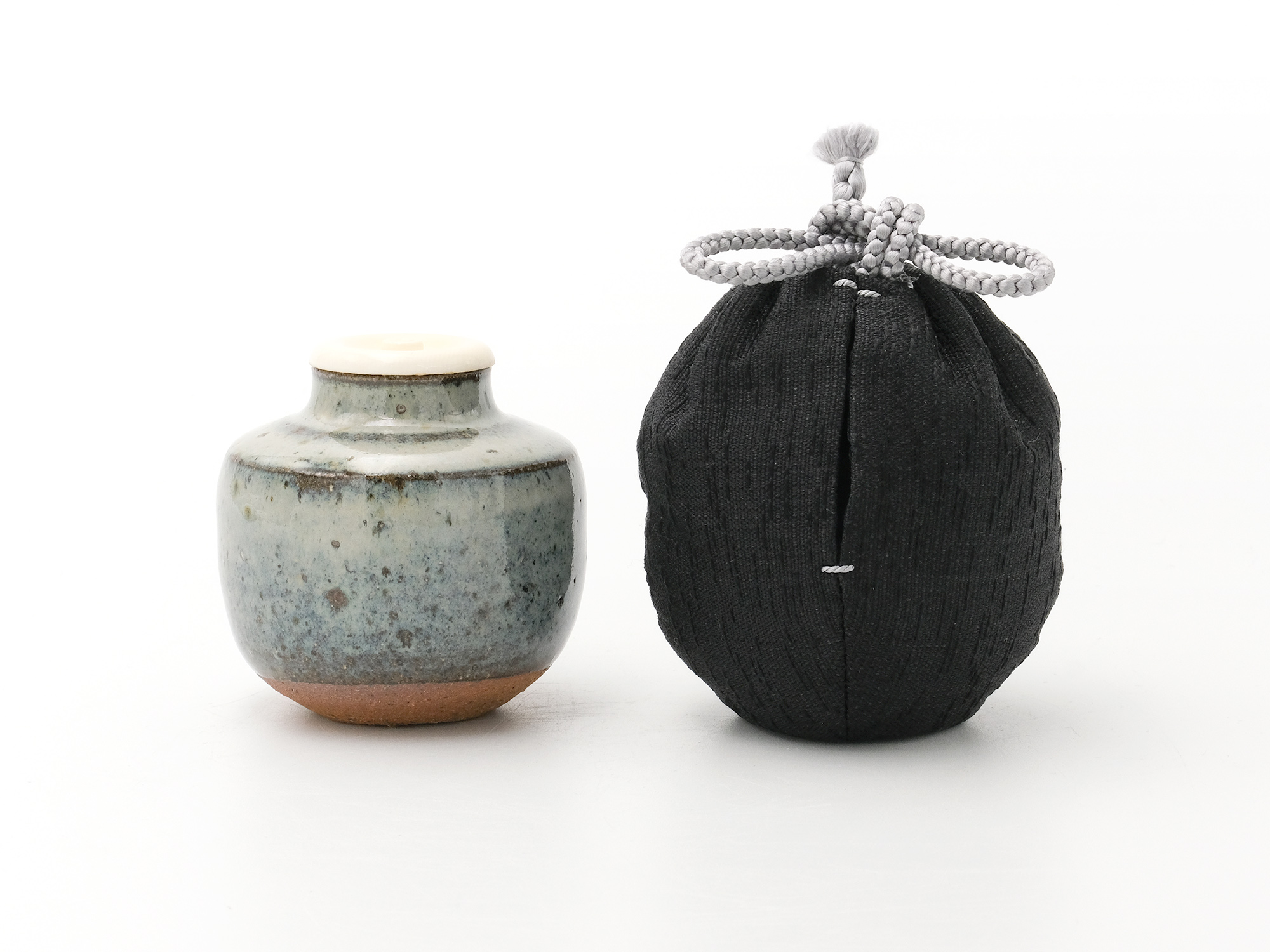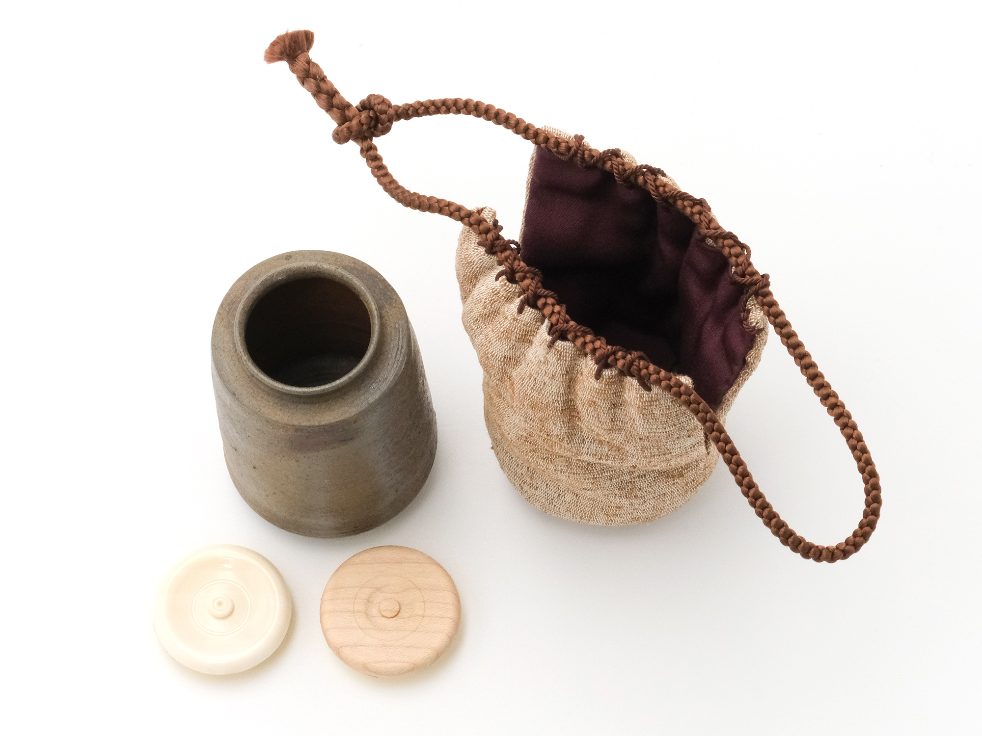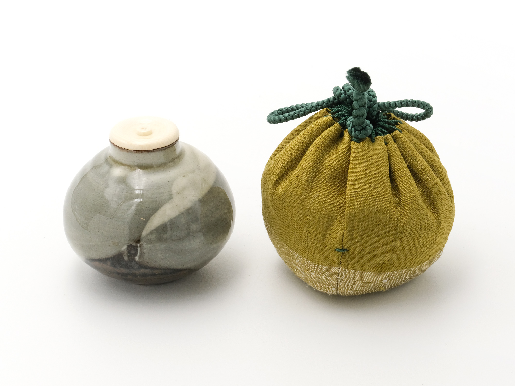 | 作品名 | 粉引茶入[仕覆・牙蓋・木蓋付] 仕覆 青朽葉色手紡ぎ手織 |