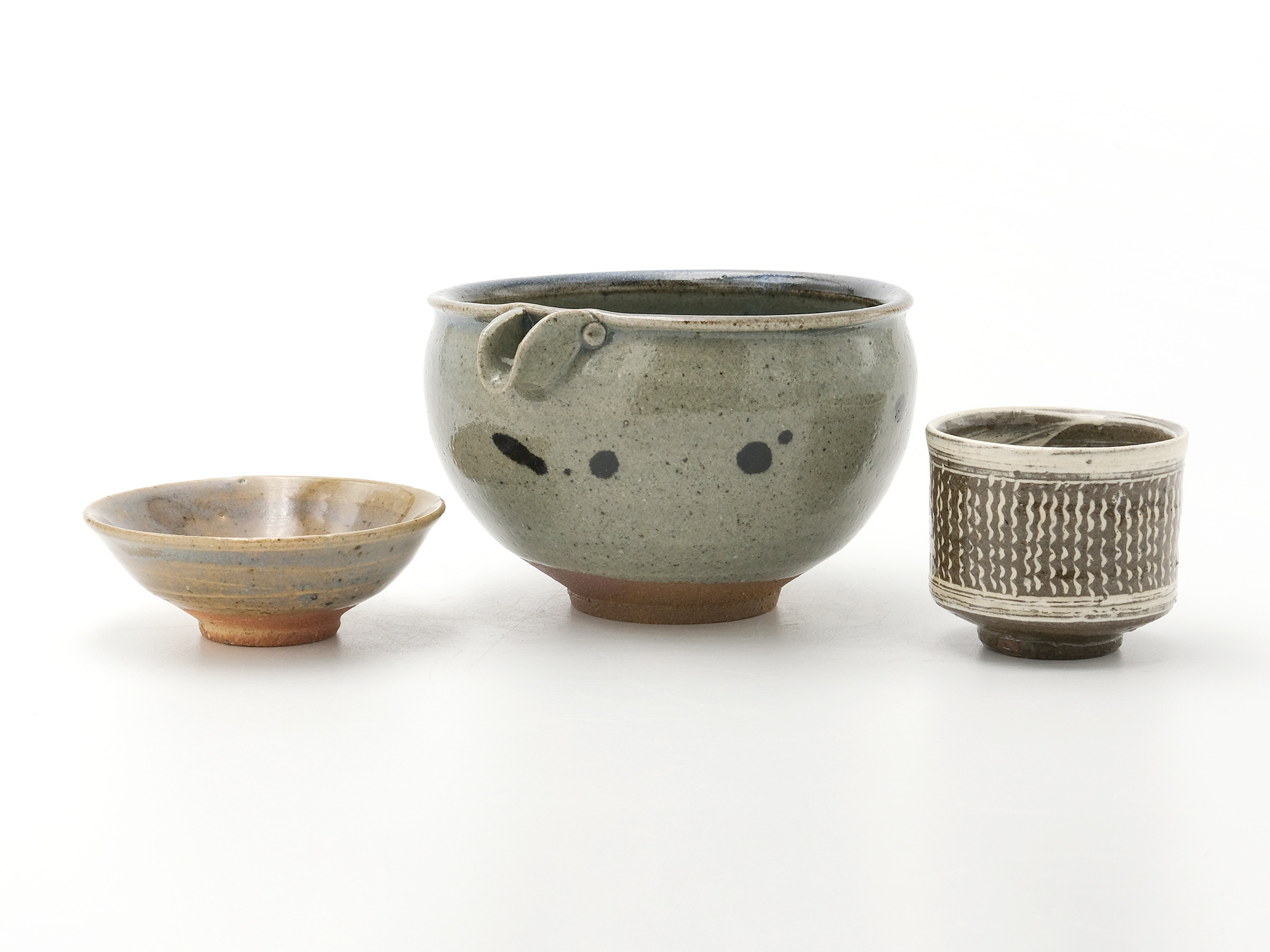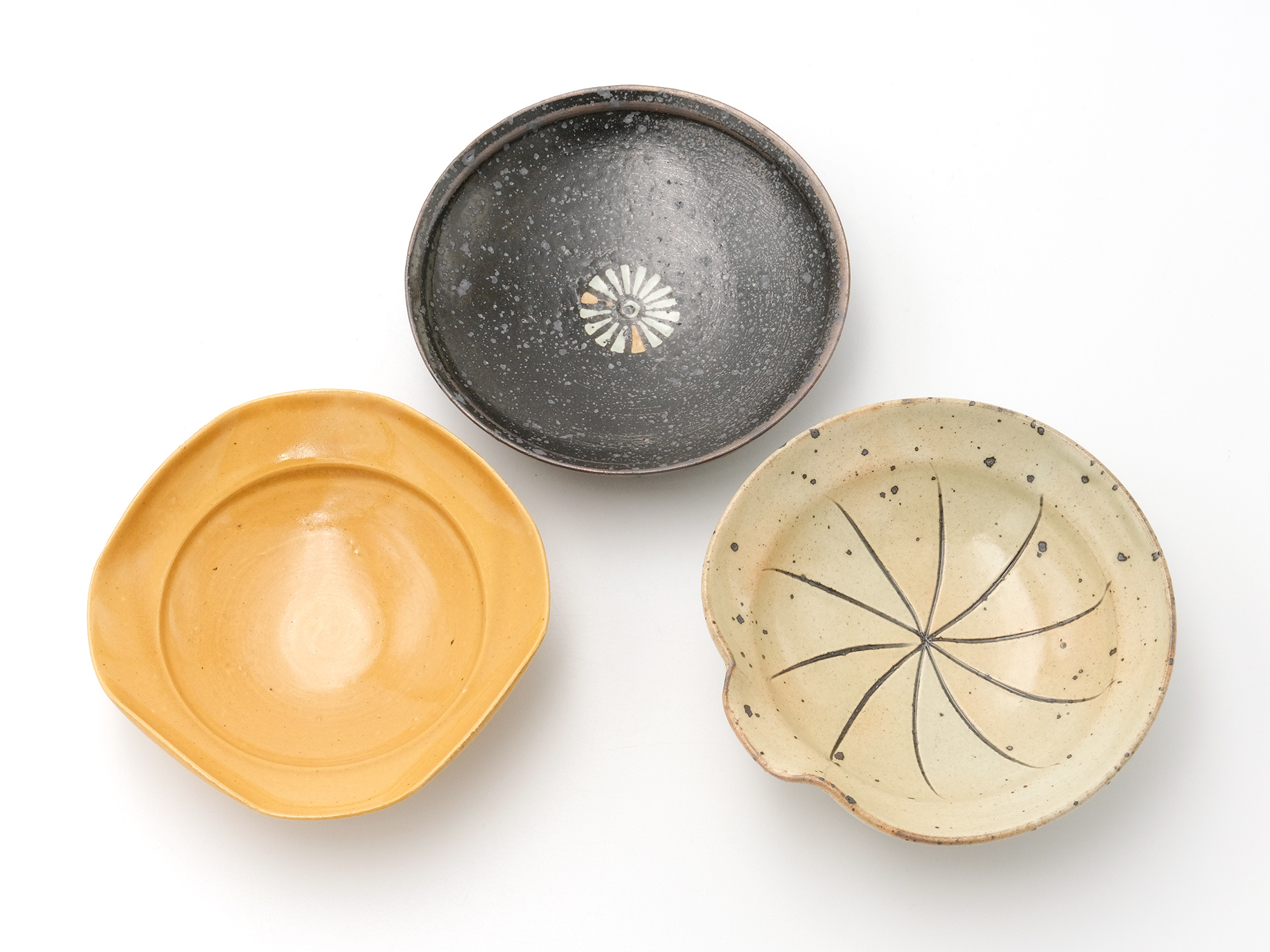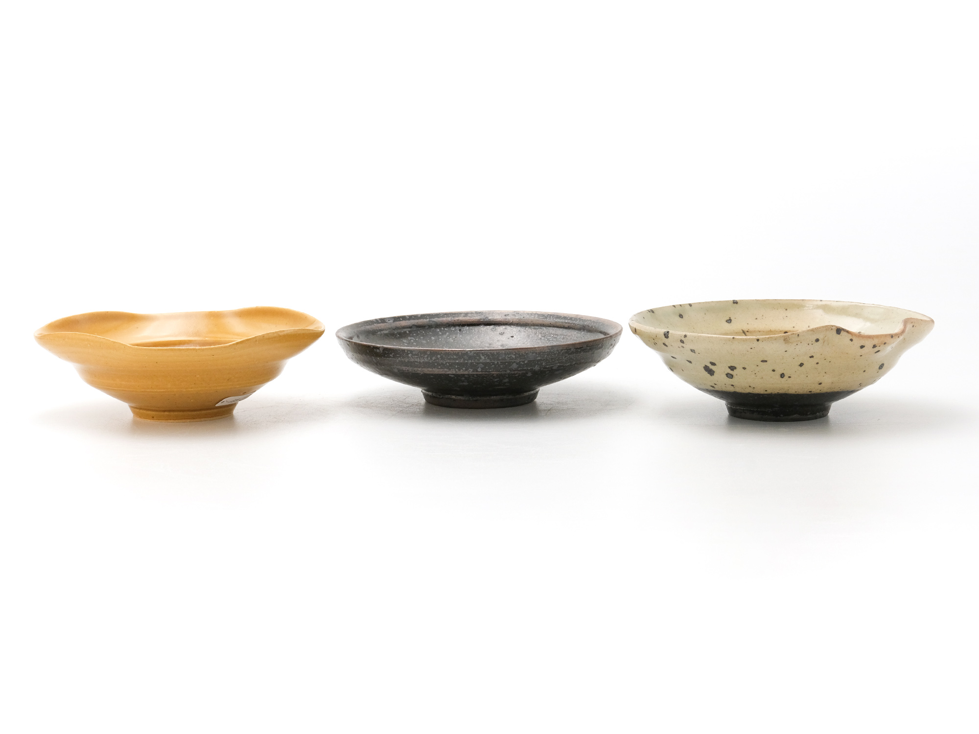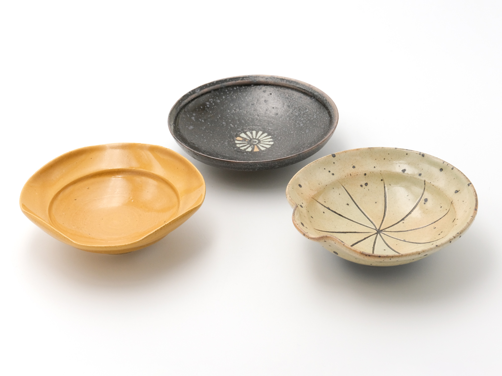 | 作品名 | [左] 黄釉四方小向【ご売約済】 [中] 黒陶印花小向 [右] 粉引片口小向 |