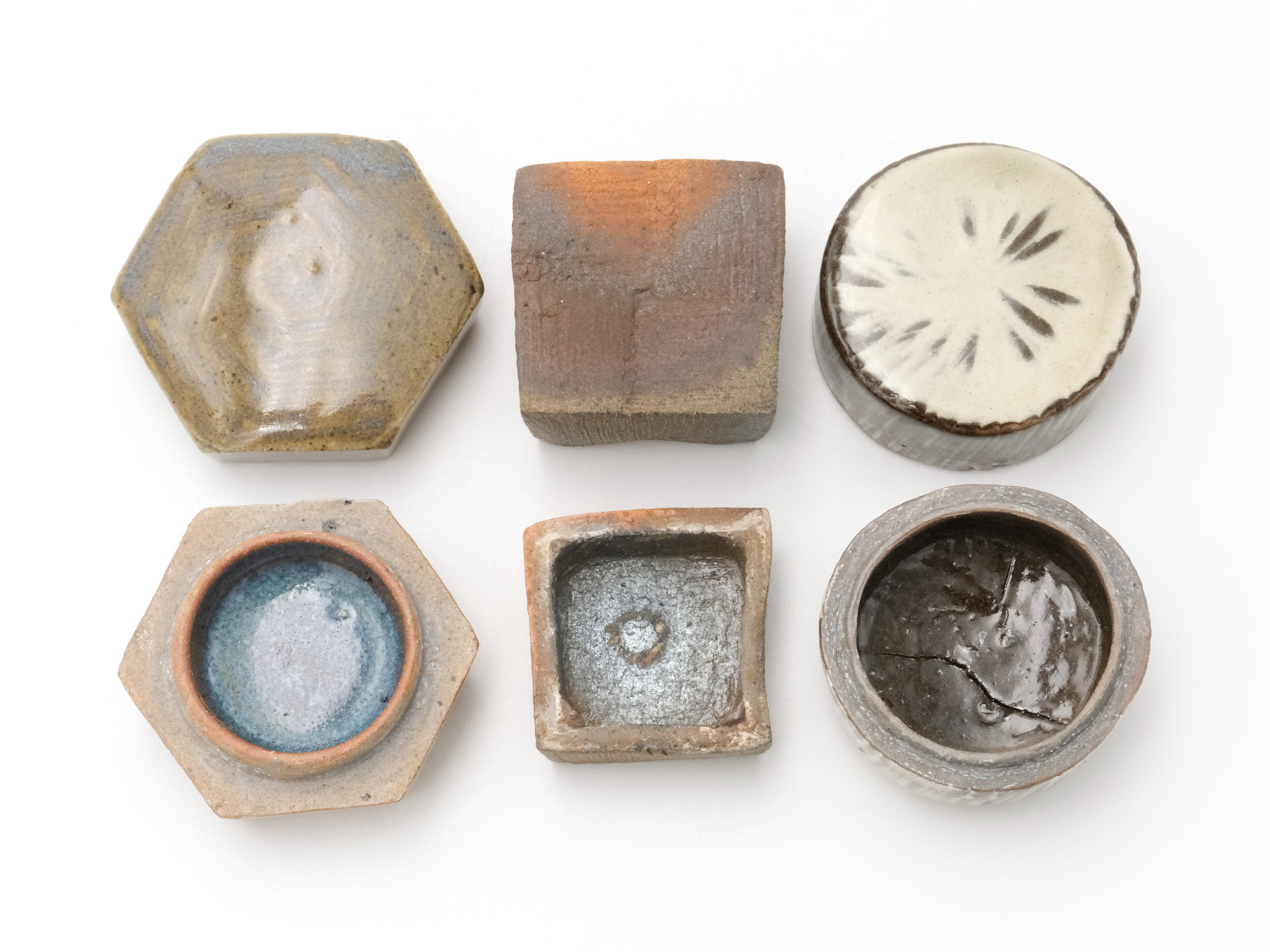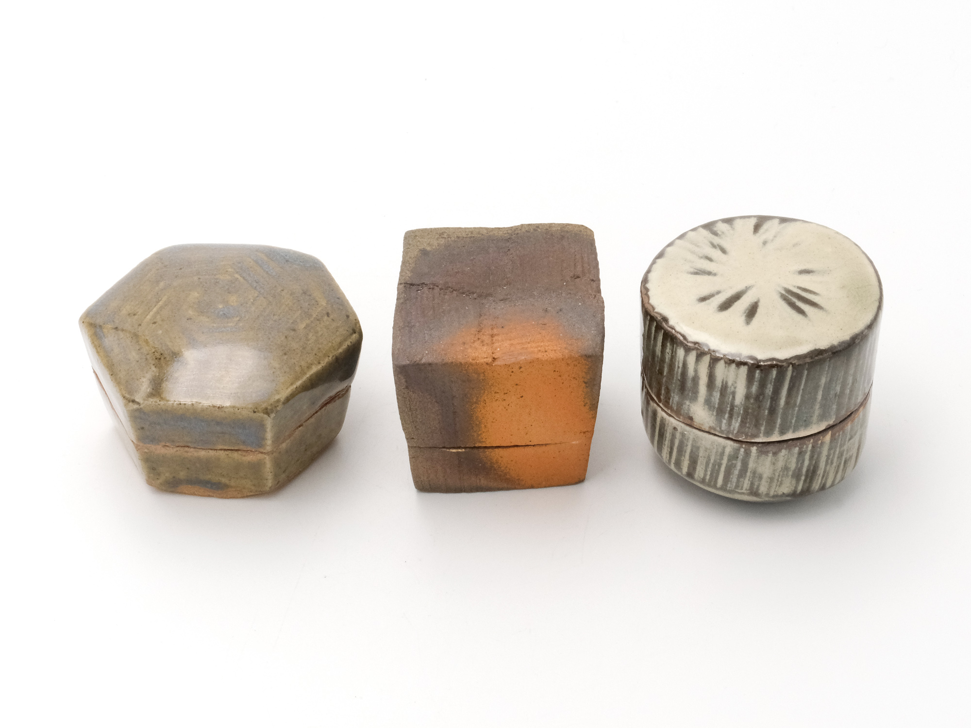 | 作品名 | [左] 黄唐津六角香合【ご売約済】 [中] 唐津南蛮四方香合 [右] 粉引摺落香合 |