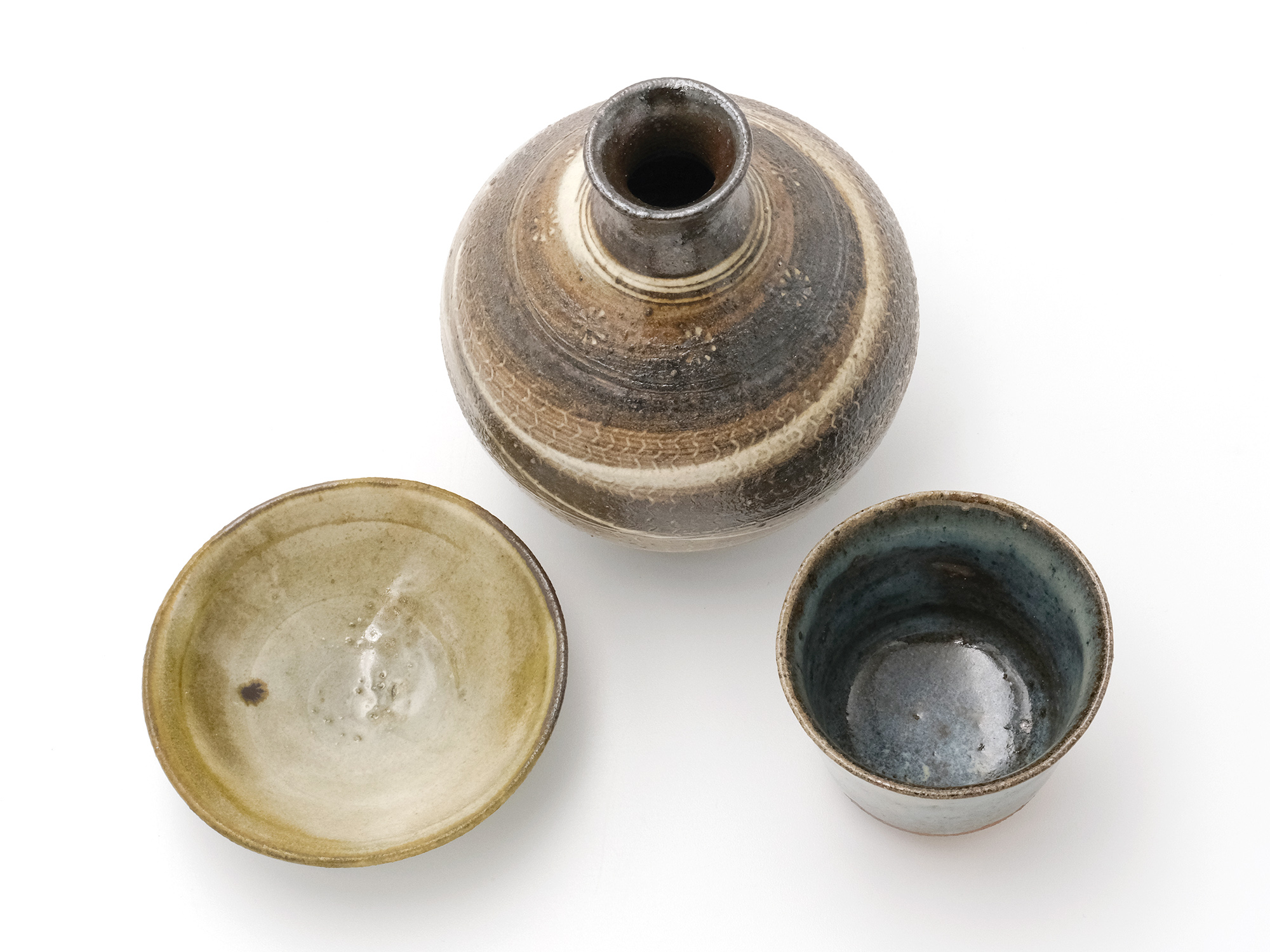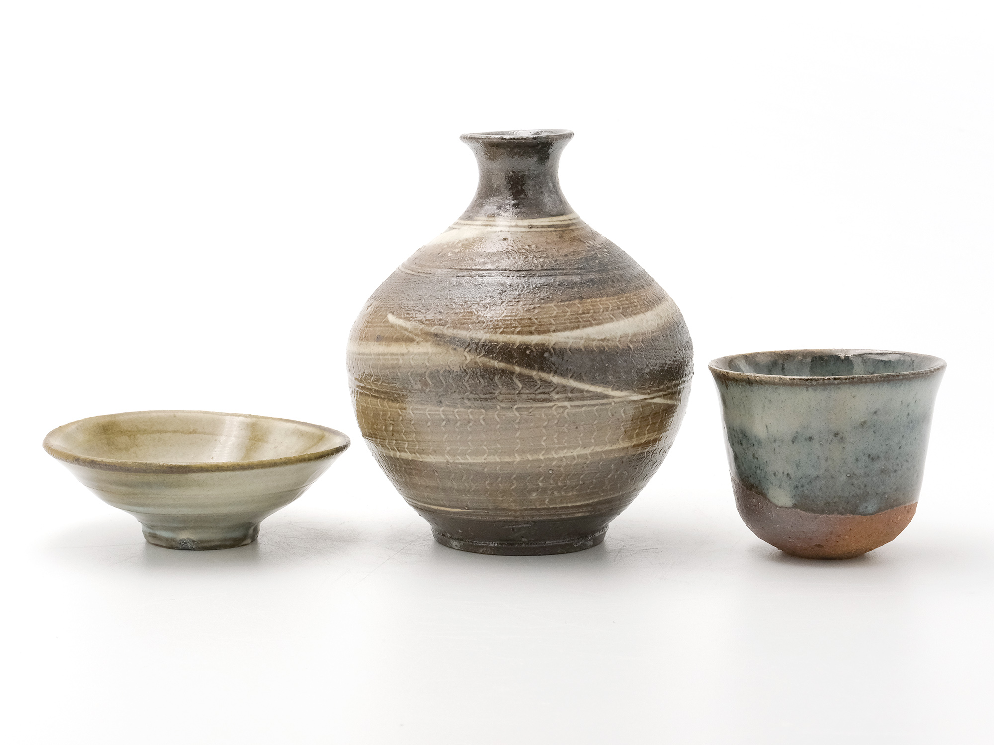 | 作品名 | [左] 粉引灰被ぐい呑 [中] 三島徳利【ご売約済】 [右] 斑唐津ぐい呑【ご売約済】 |