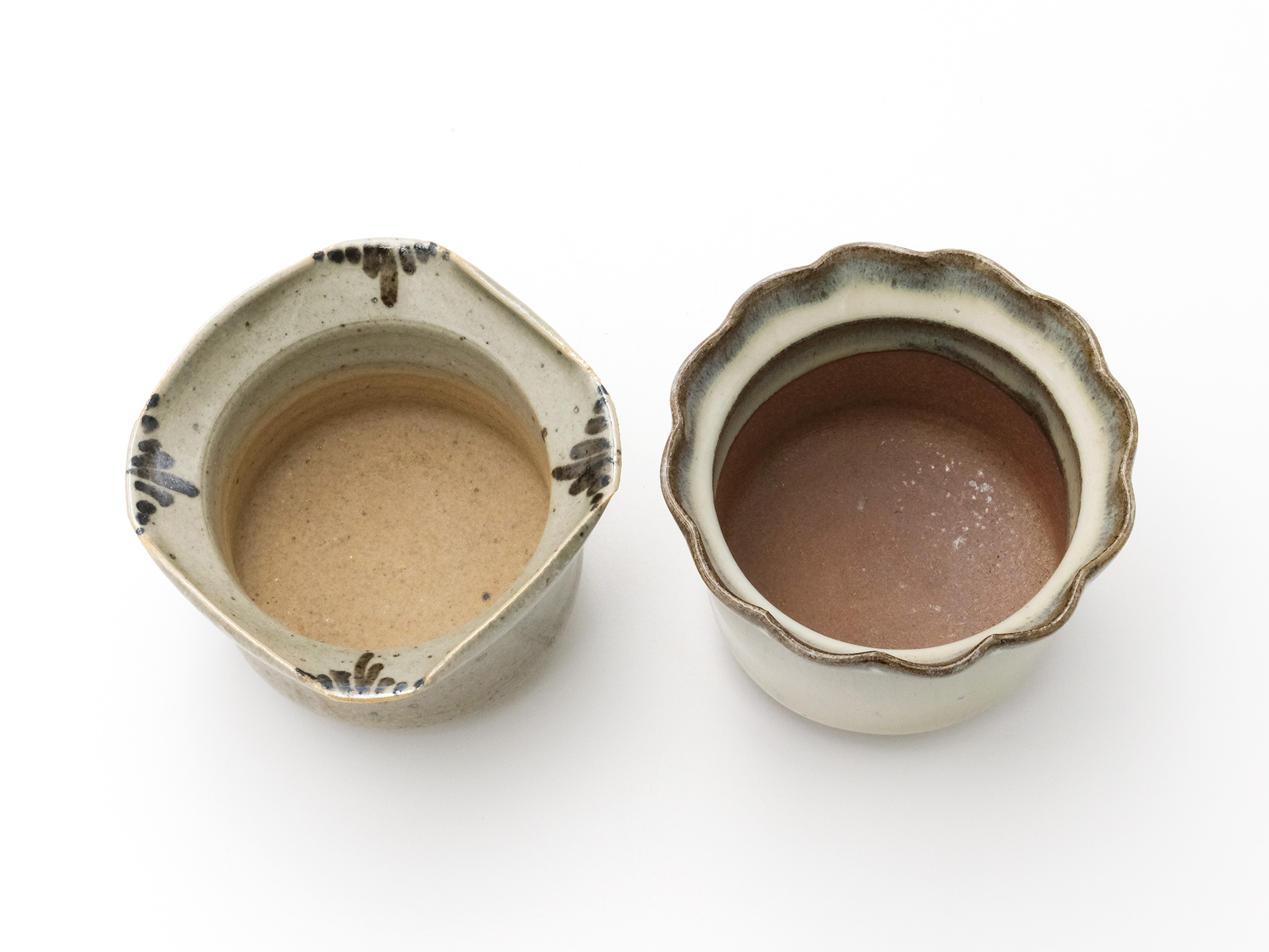 | 作品名 | [左] 絵唐津四方火入 [右] 斑唐津輪花火入 |