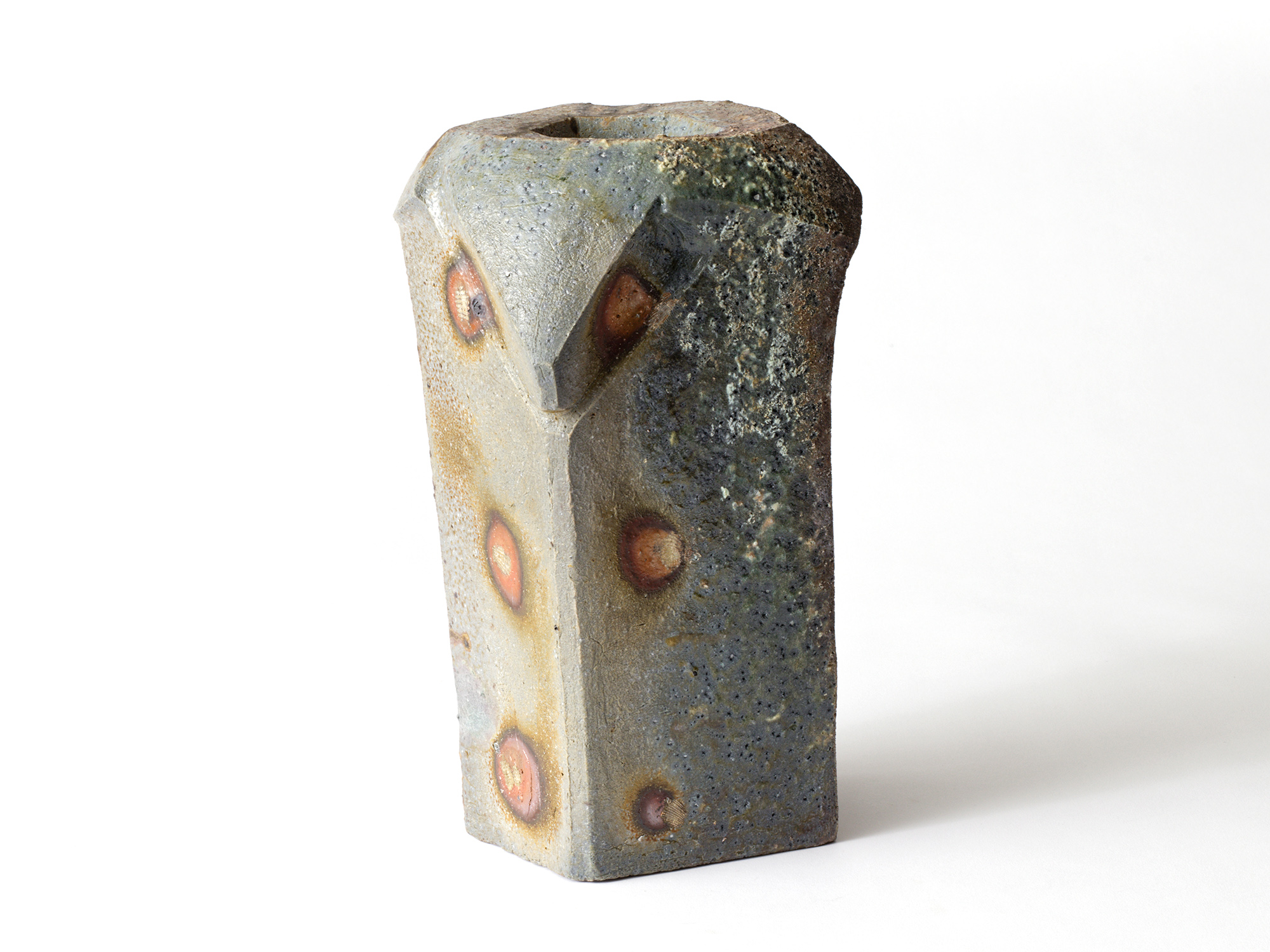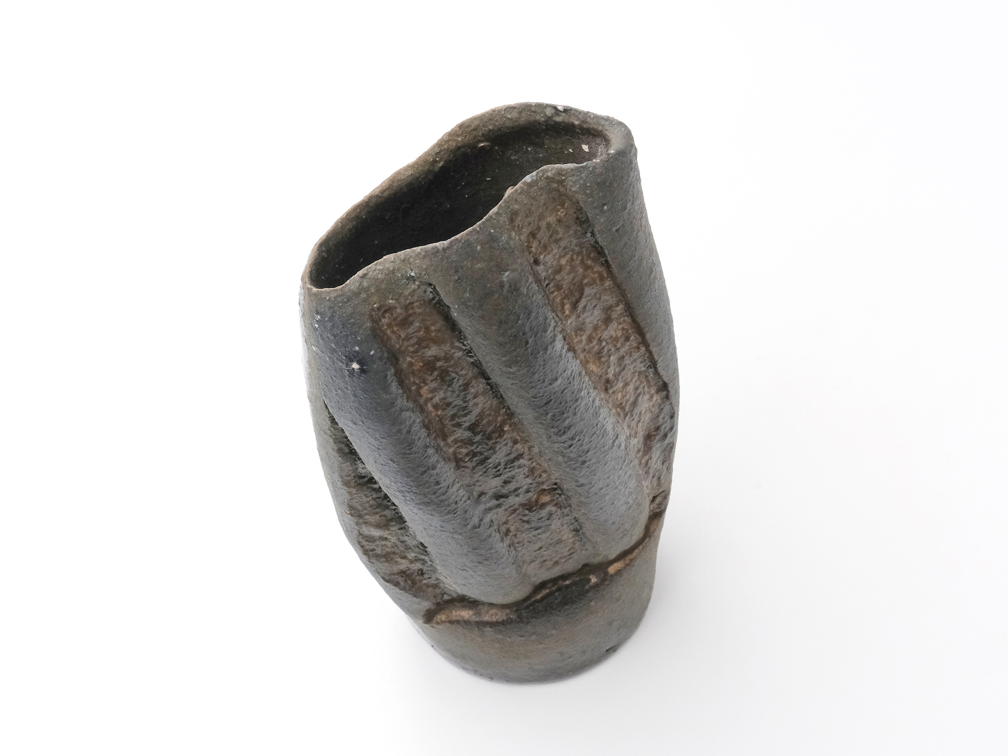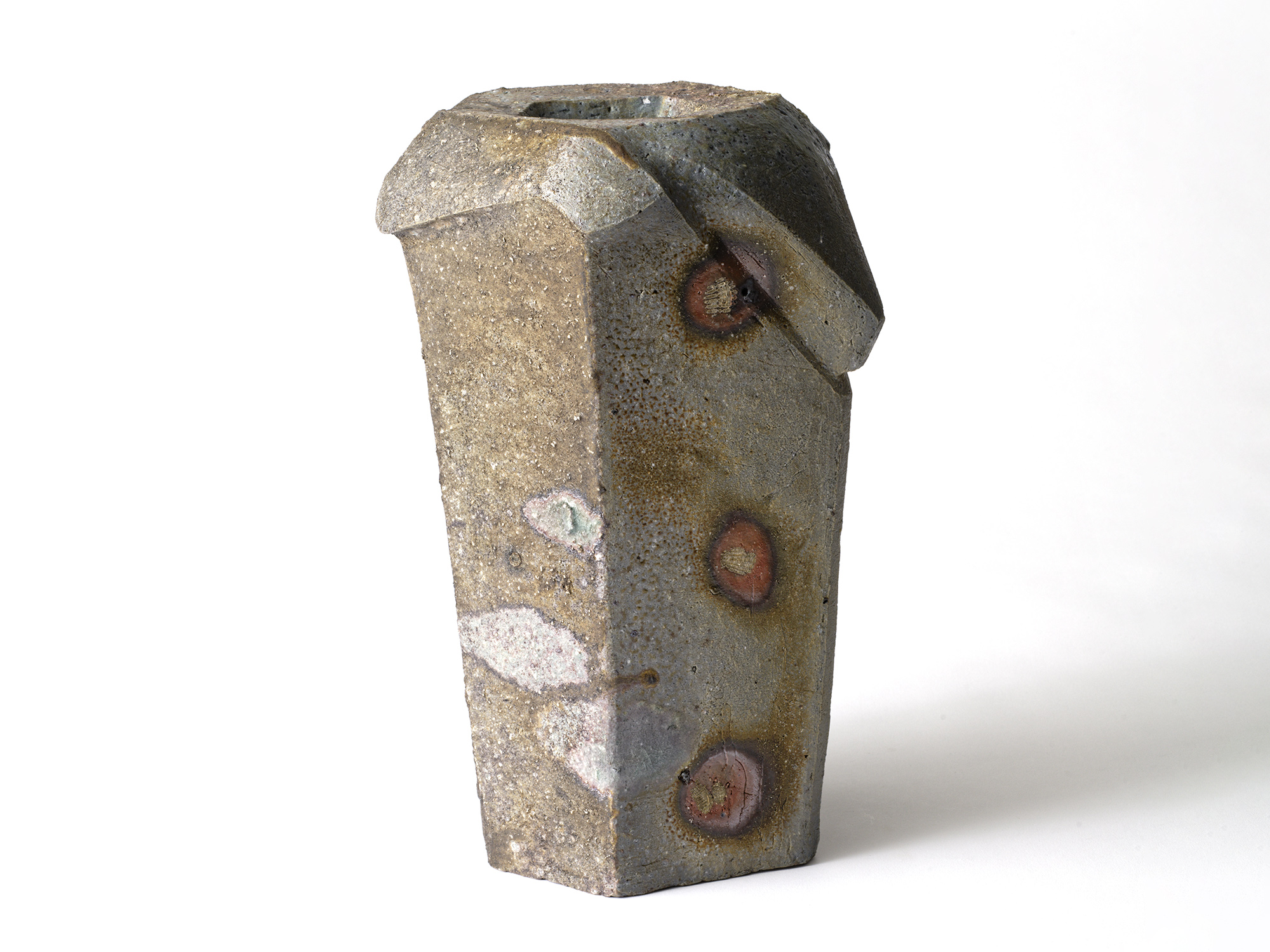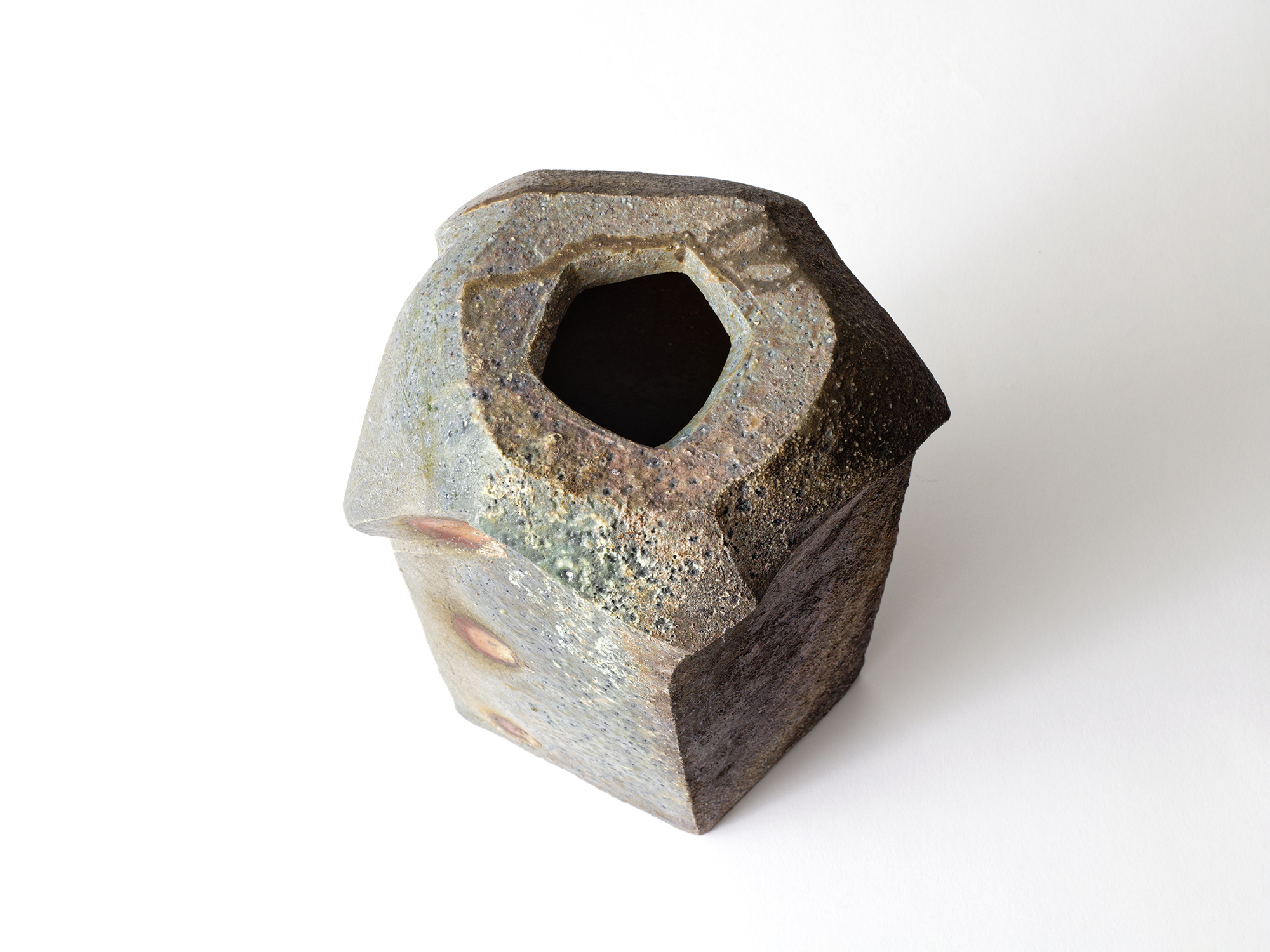 森 一朗の《窯変崩五角花入》は大地の力を集約し、備前の力強さを表現した作品です。 石膏型による制作で、崩れた五角形の口部とその周りの造作が豪快です。 全体の景色は灰被りの窯変で、花入を支えるための貝殻の跡や棚板から降った灰などの模様が何とも魅力的です。
