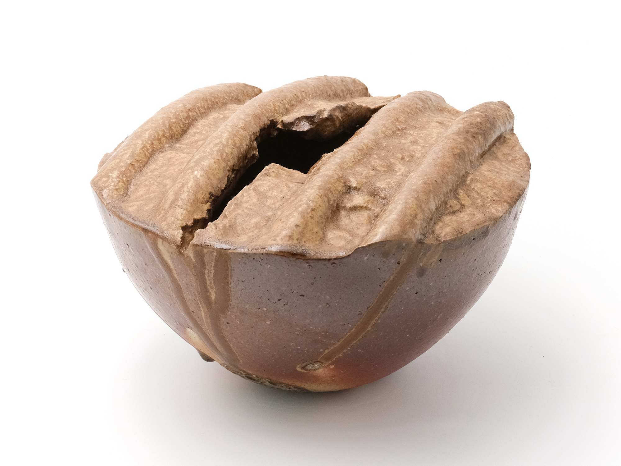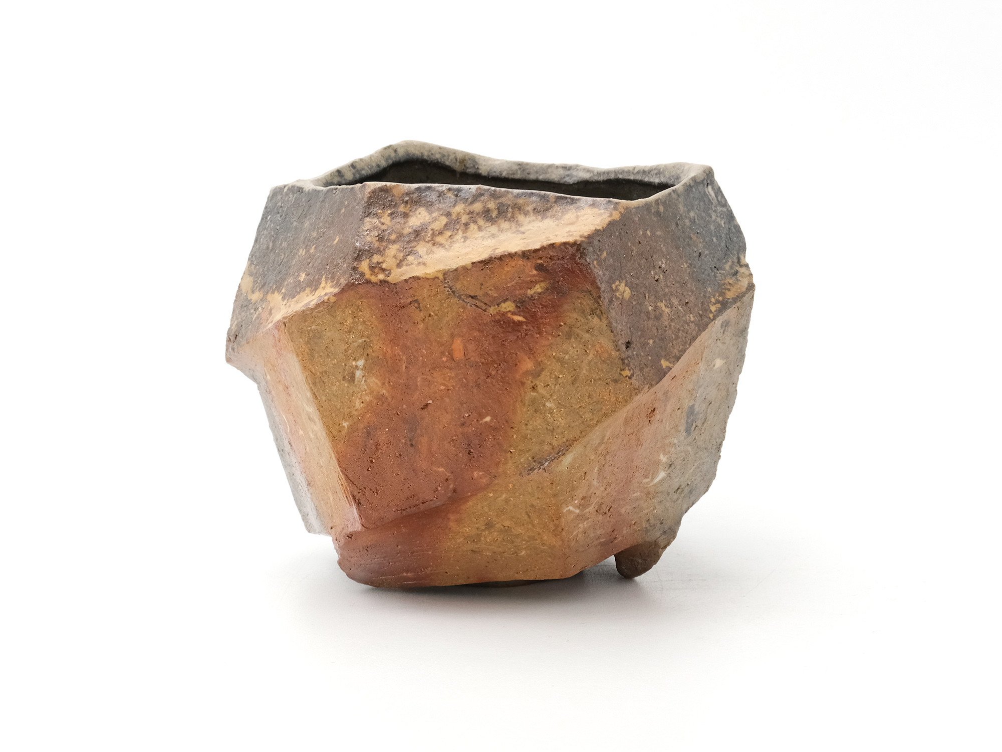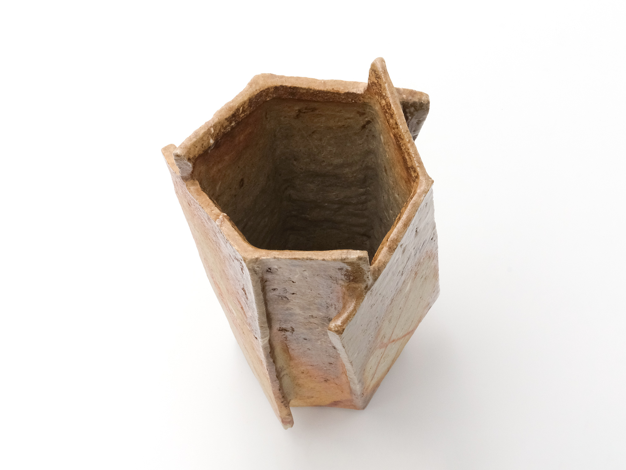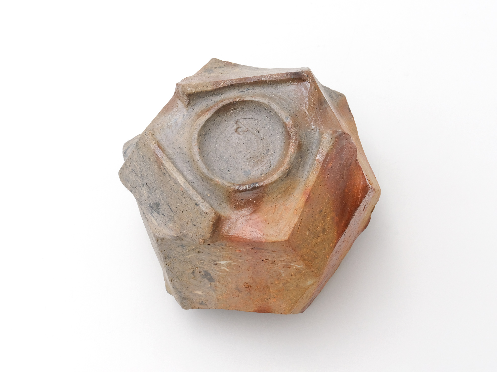 森 一朗の《窯変崩五角花入》は大地の力を集約し、備前の力強さを表現した作品です。 石膏型による制作で、崩れた五角形の口部とその周りの造作が豪快です。 全体の景色は灰被りの窯変で、花入を支えるための貝殻の跡や棚板から降った灰などの模様が何とも魅力的です。