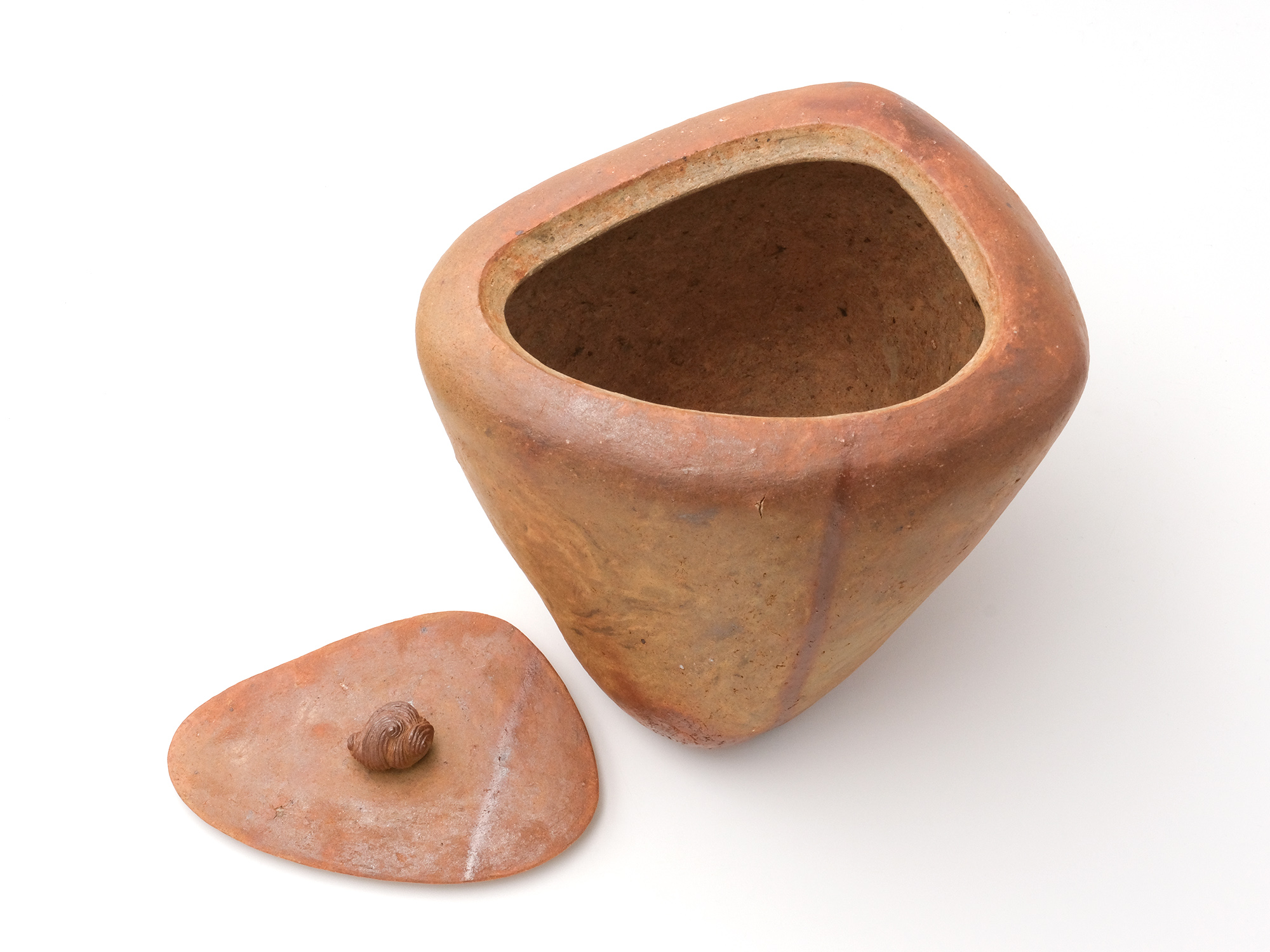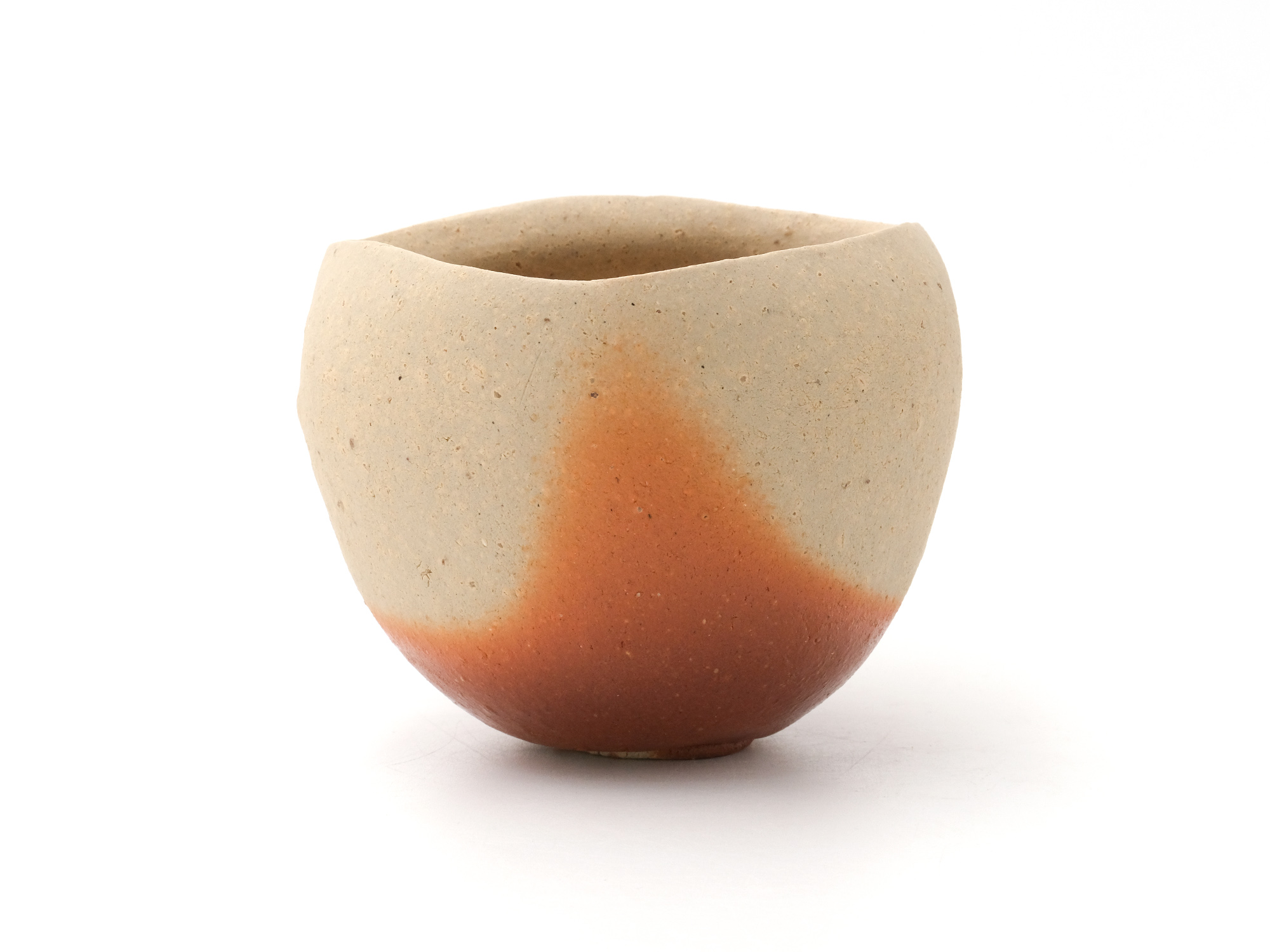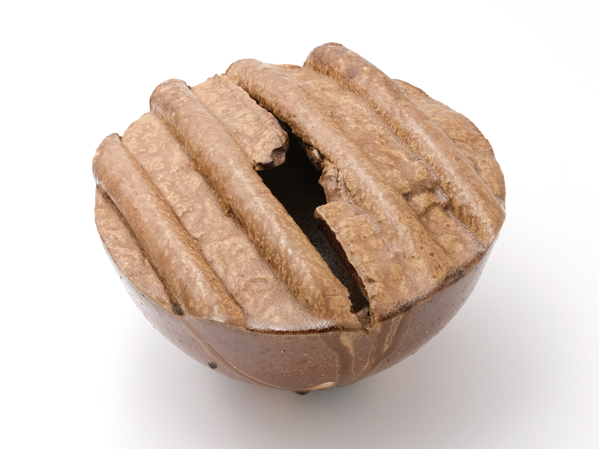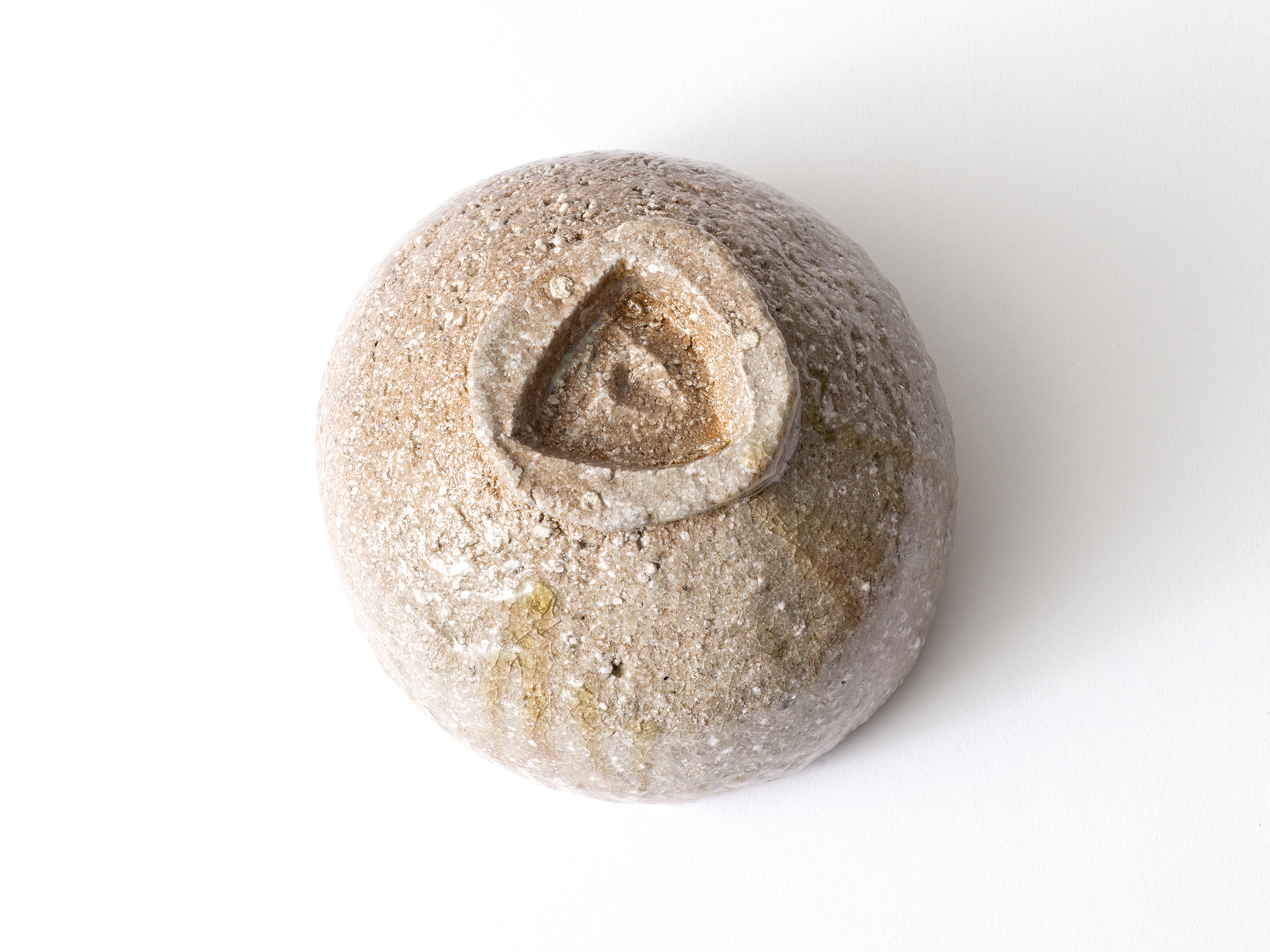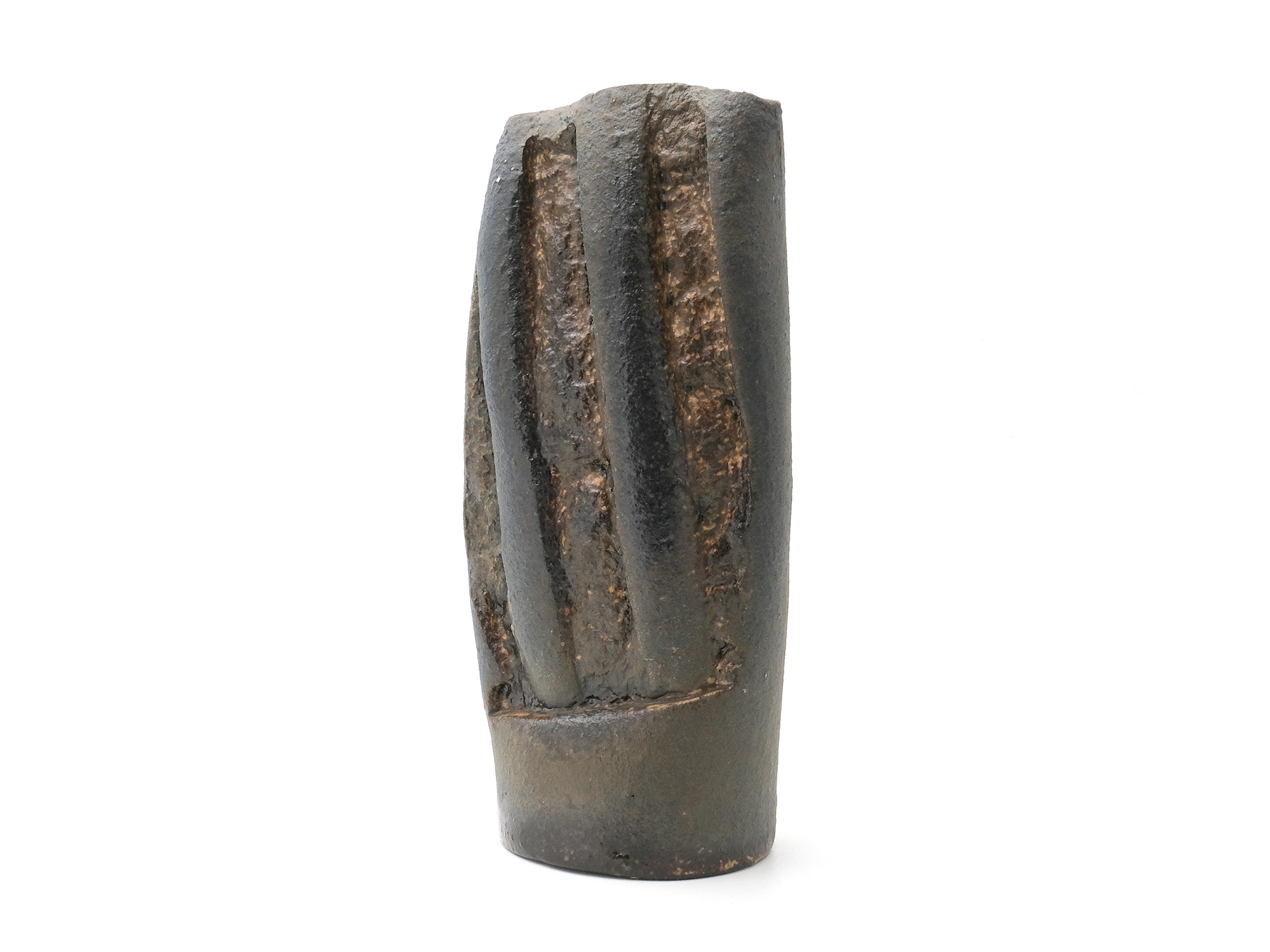 森 一朗の《窯変崩五角花入》は大地の力を集約し、備前の力強さを表現した作品です。 石膏型による制作で、崩れた五角形の口部とその周りの造作が豪快です。 全体の景色は灰被りの窯変で、花入を支えるための貝殻の跡や棚板から降った灰などの模様が何とも魅力的です。