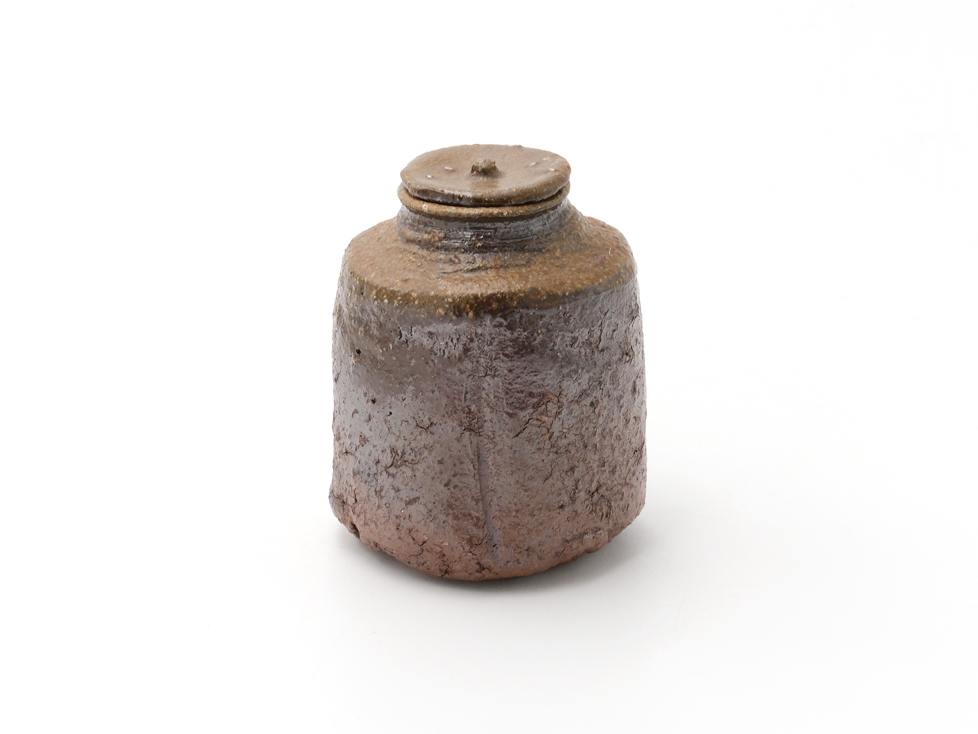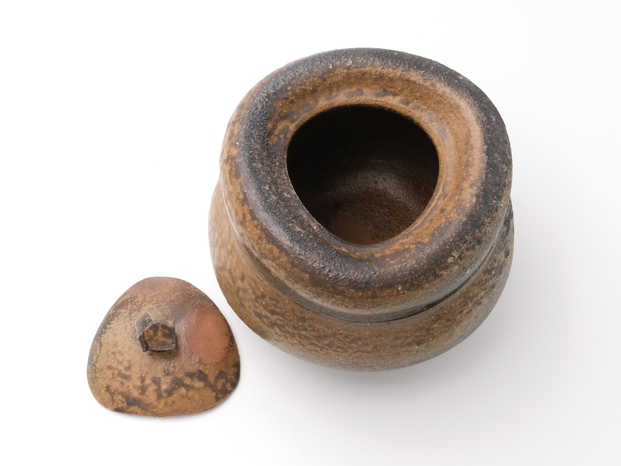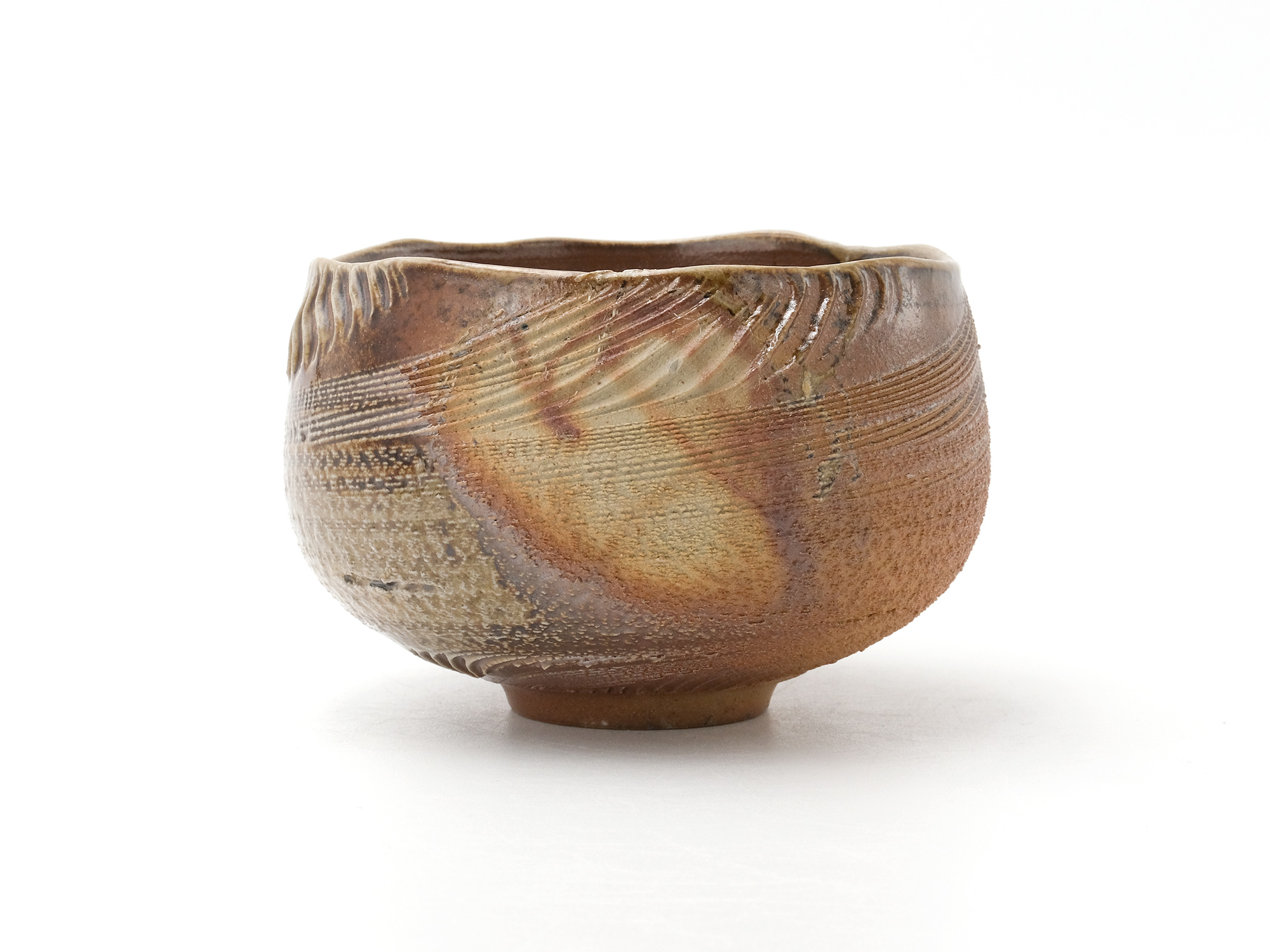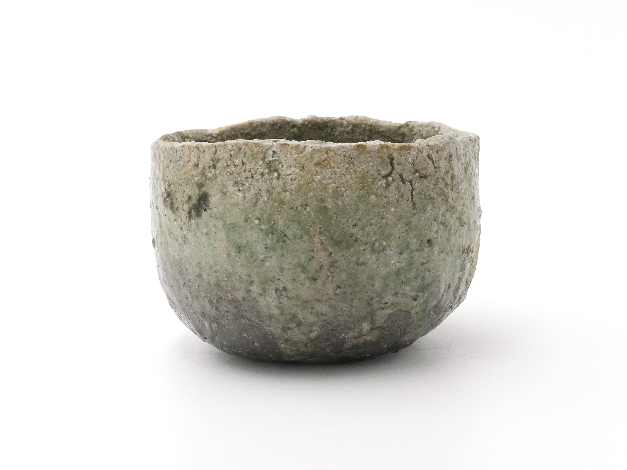 森 一朗の《窯変崩五角花入》は大地の力を集約し、備前の力強さを表現した作品です。 石膏型による制作で、崩れた五角形の口部とその周りの造作が豪快です。 全体の景色は灰被りの窯変で、花入を支えるための貝殻の跡や棚板から降った灰などの模様が何とも魅力的です。