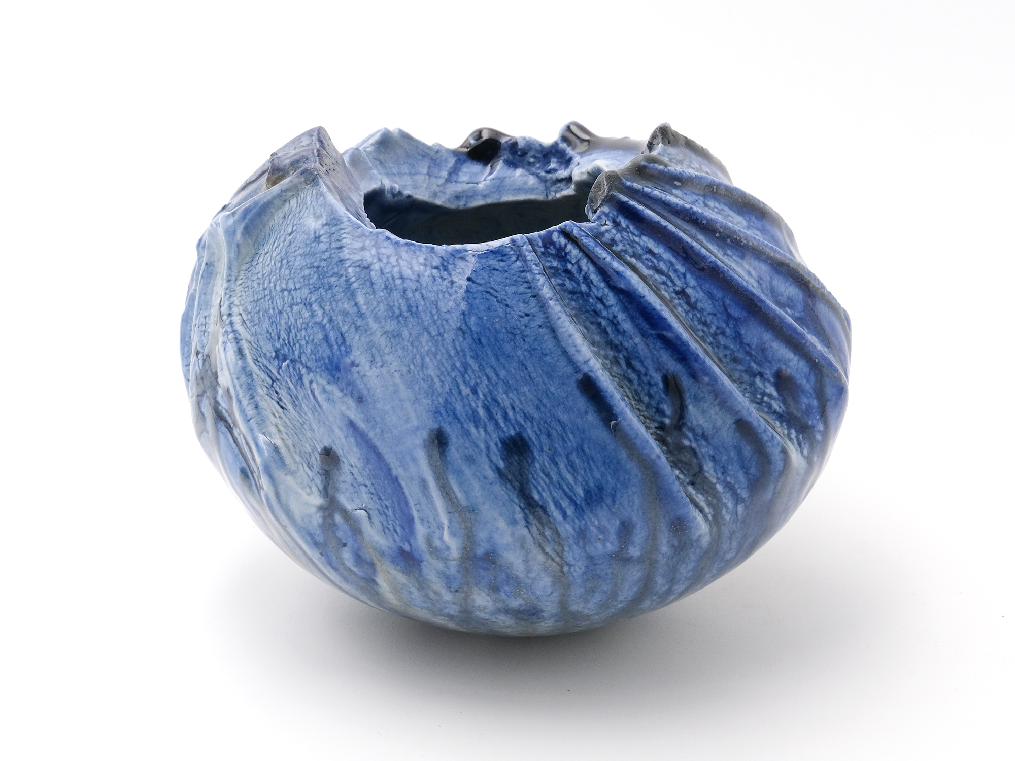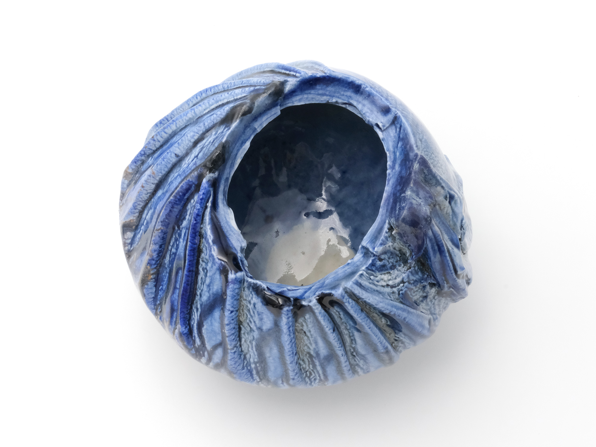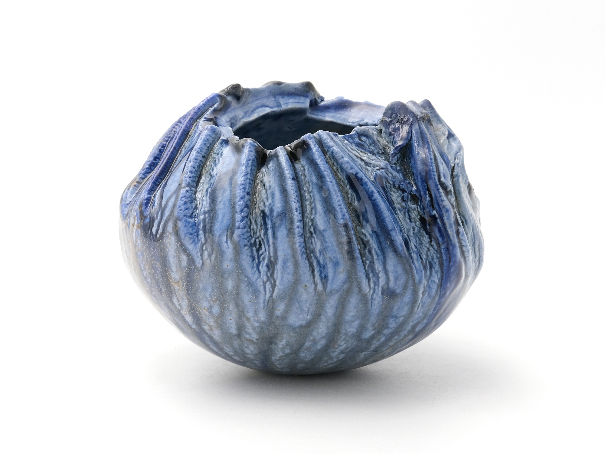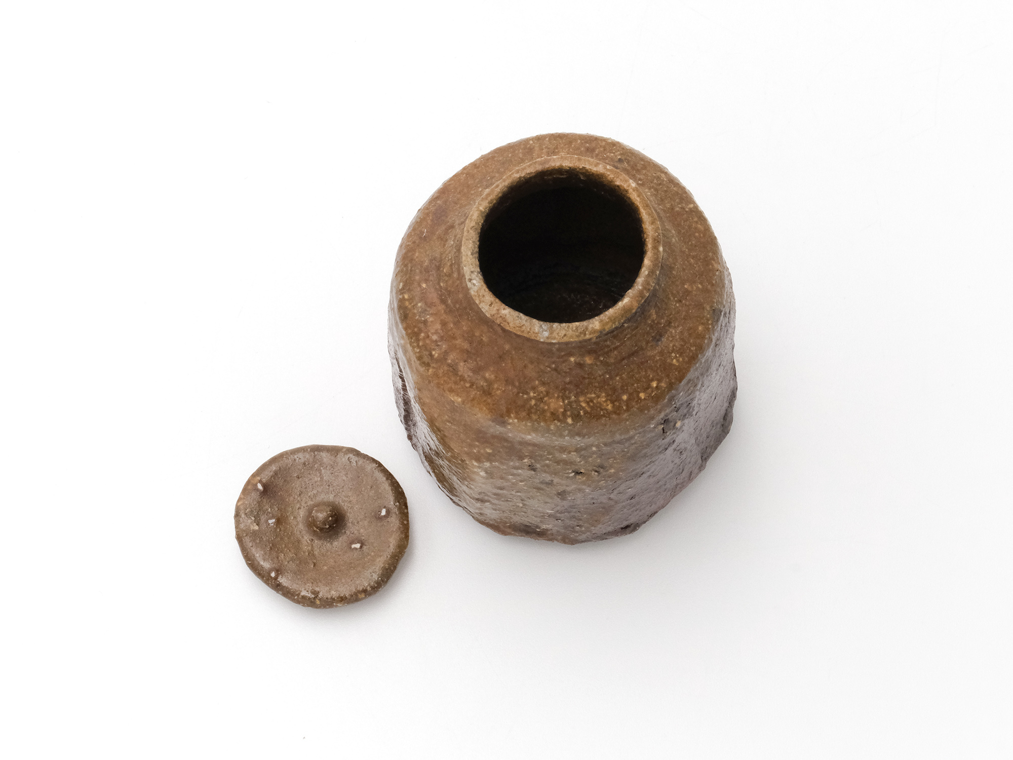 森 一朗の《窯変崩五角花入》は大地の力を集約し、備前の力強さを表現した作品です。 石膏型による制作で、崩れた五角形の口部とその周りの造作が豪快です。 全体の景色は灰被りの窯変で、花入を支えるための貝殻の跡や棚板から降った灰などの模様が何とも魅力的です。
