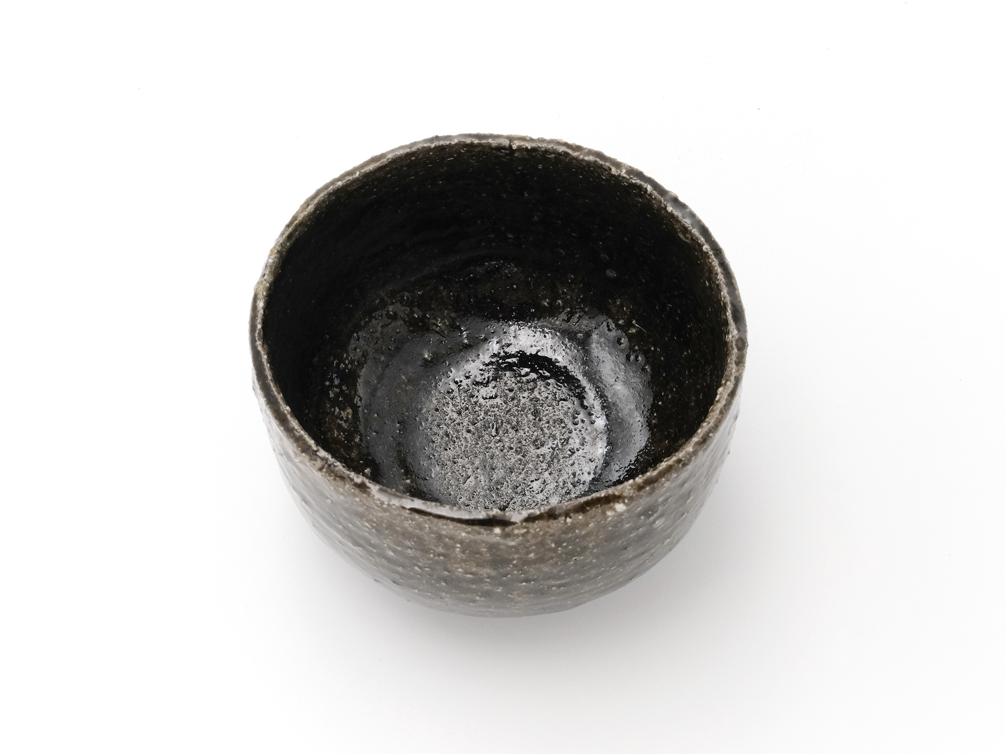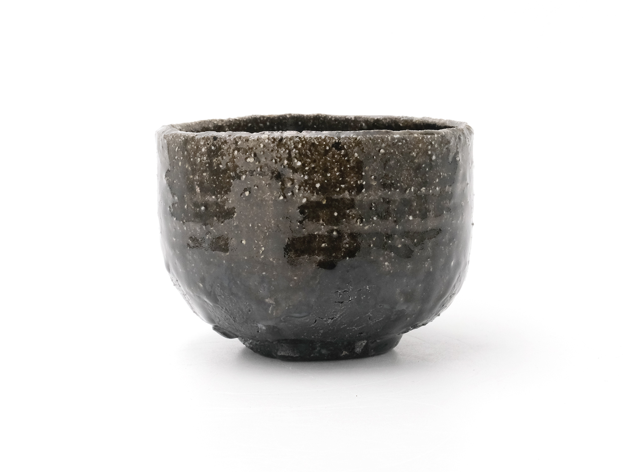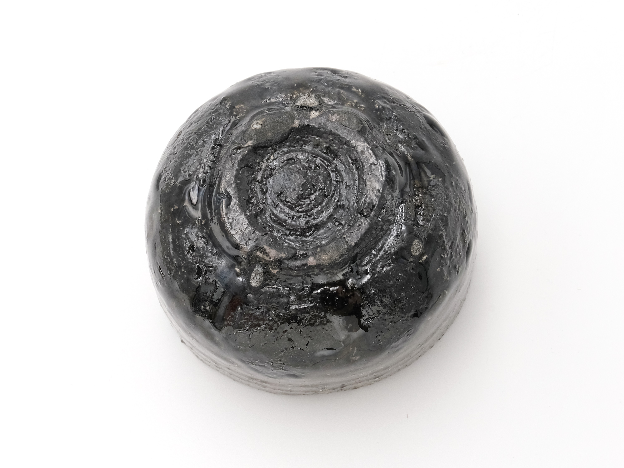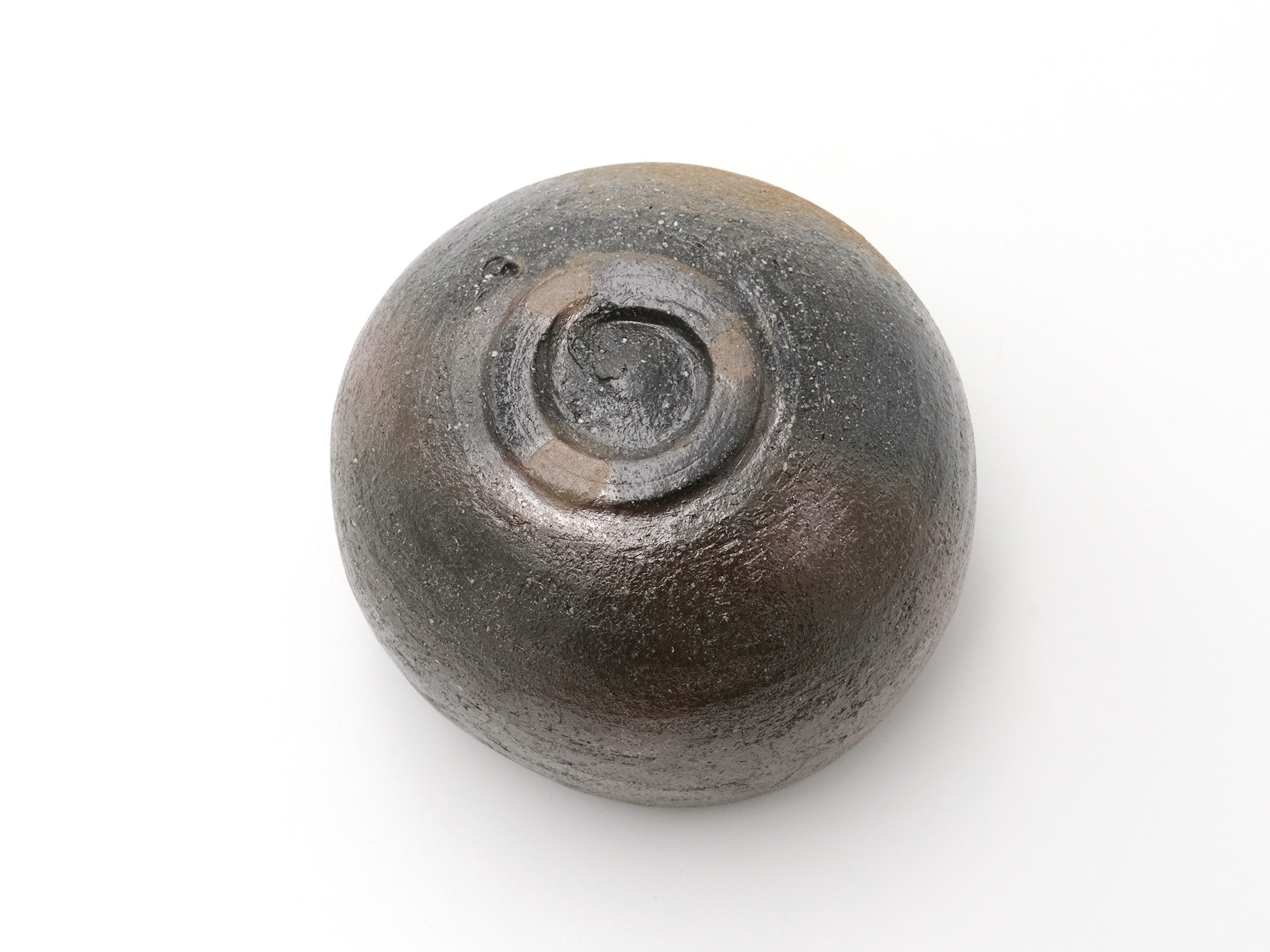 近藤正彦の《引黒茶盌》は備前の土で成形し、黒の顔料を化粧掛けした沓形の茶盌です。 窯焚き終盤に窯の中から作品を引出し、急冷で割れないようサヤ(容器)に移して冷まします。 黒の顔料は炎により様々な景色を作り出します。この茶盌は、その変化が見どころです。