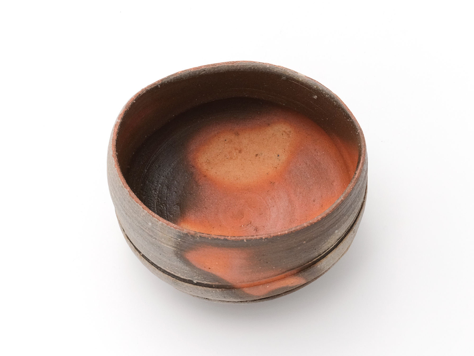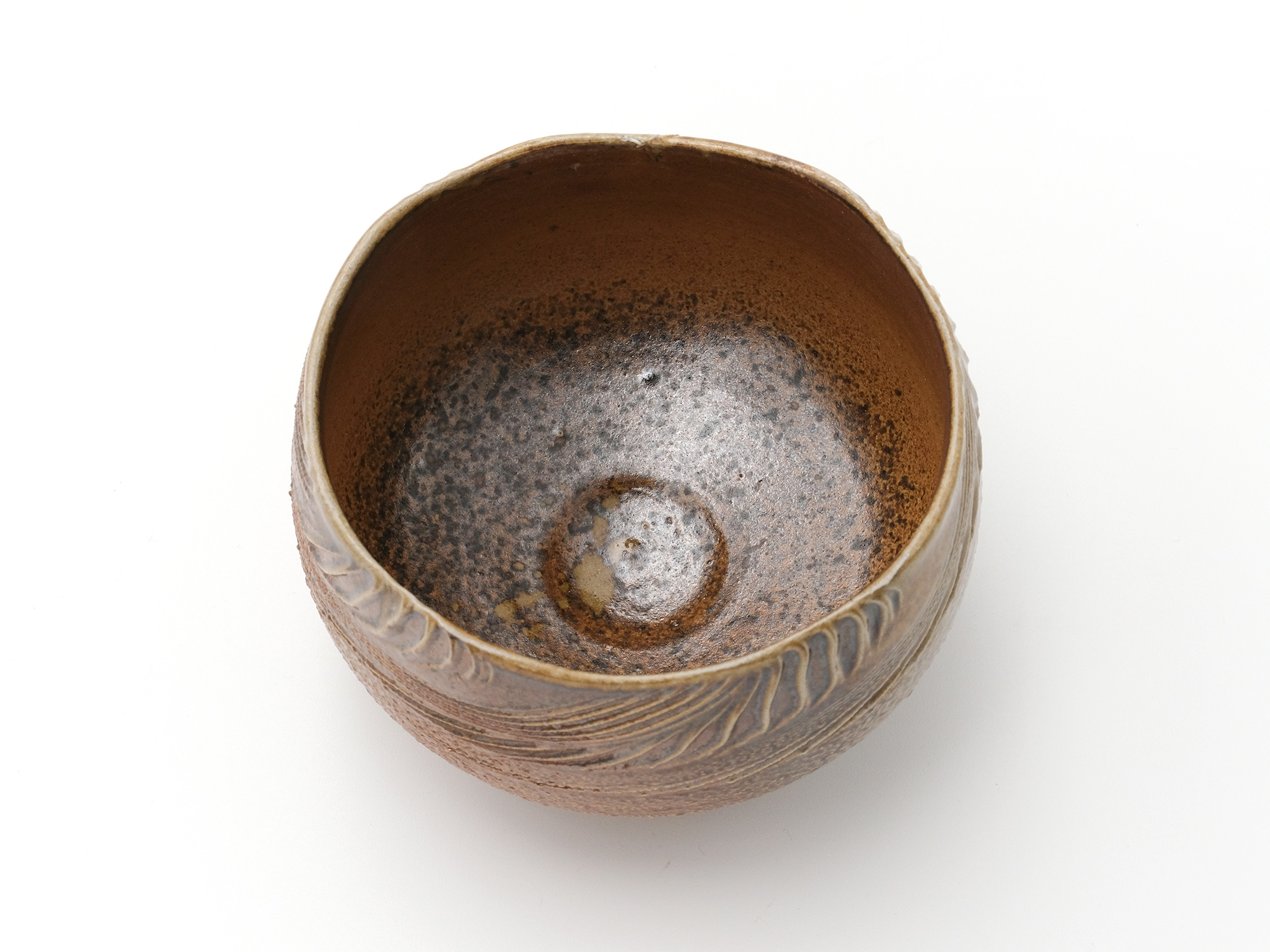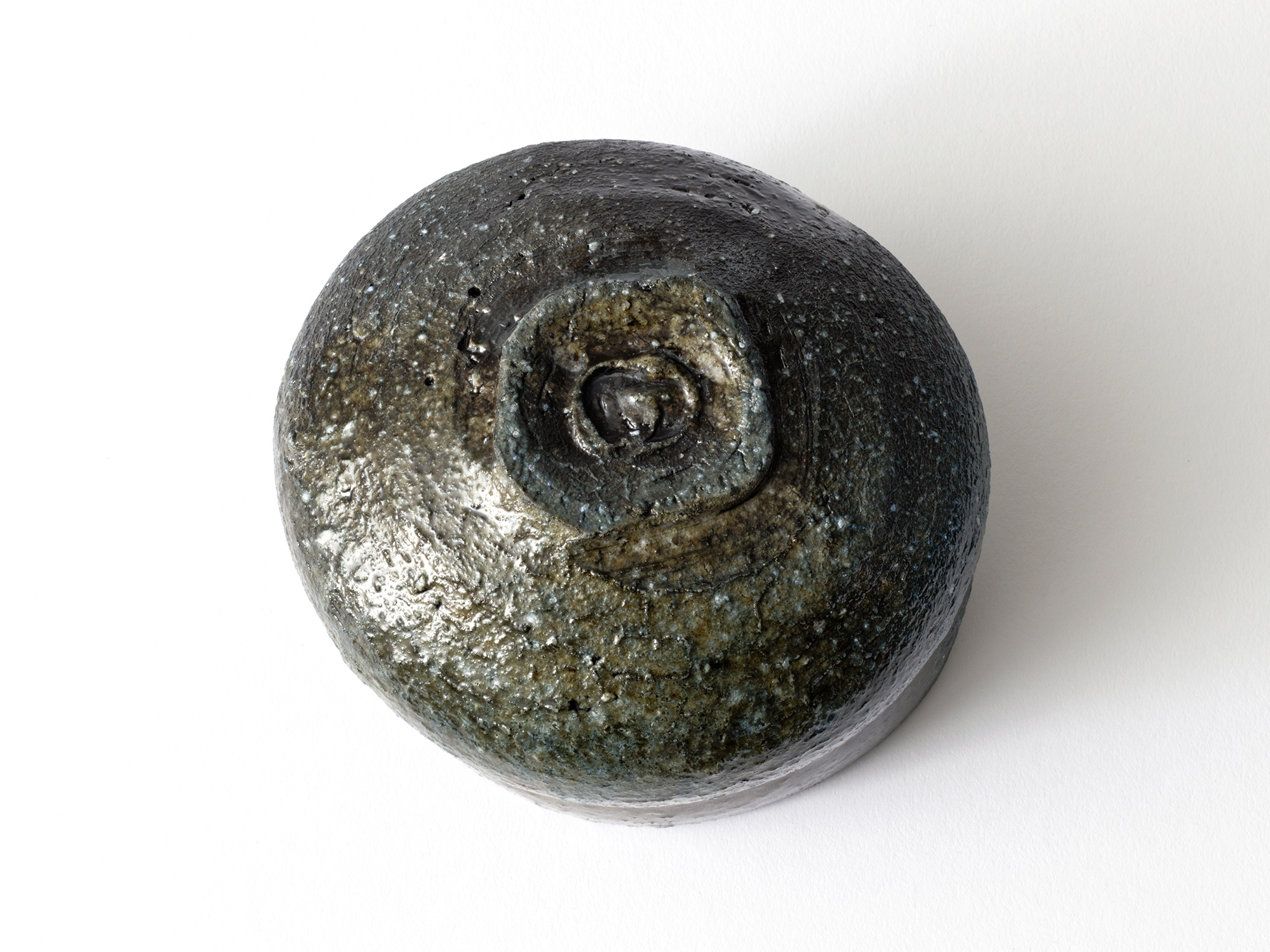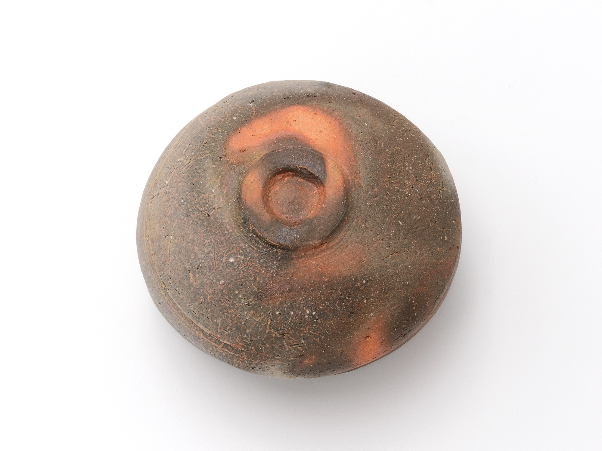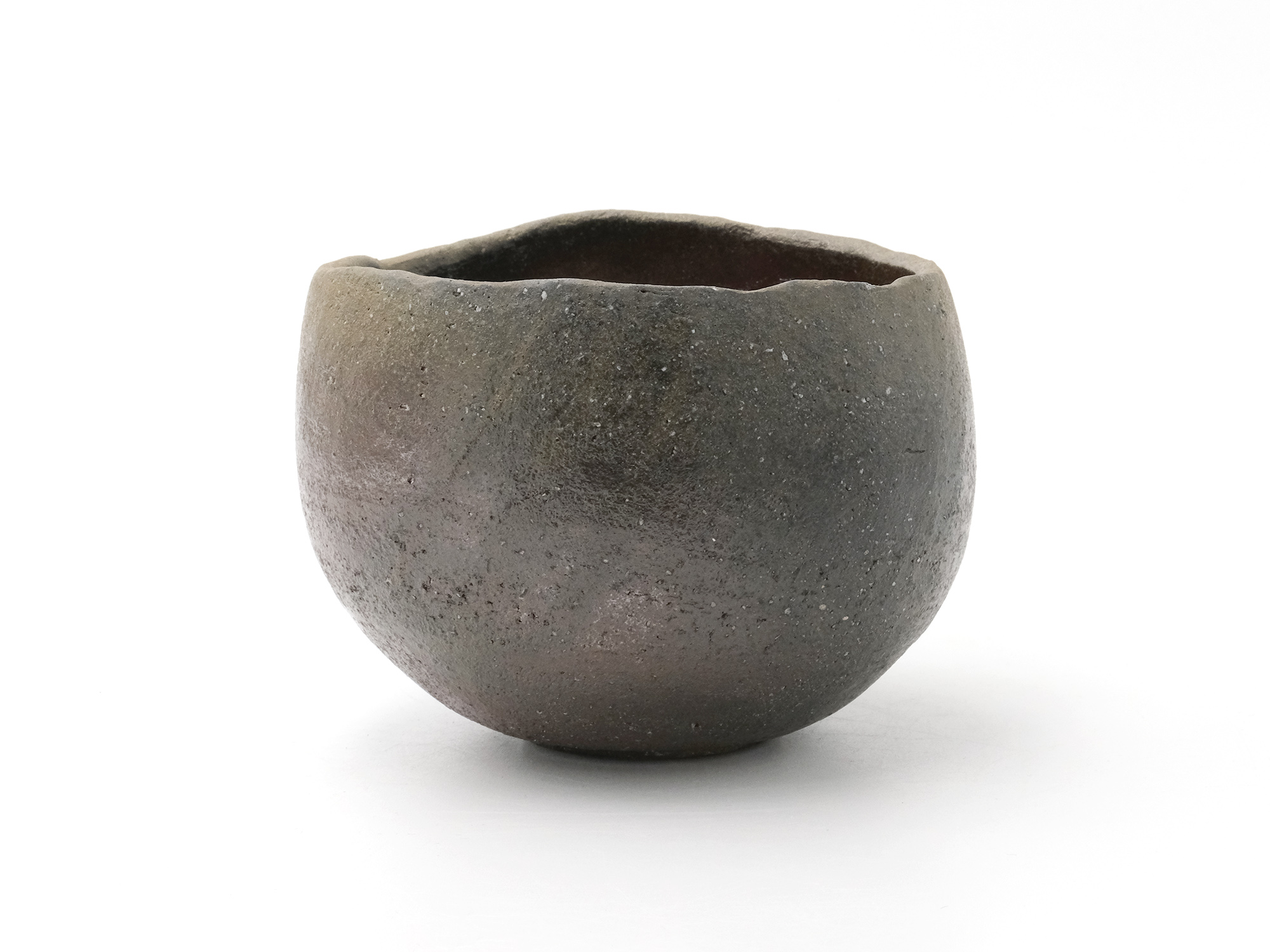 近藤正彦の《引黒茶盌》は備前の土で成形し、黒の顔料を化粧掛けした沓形の茶盌です。 窯焚き終盤に窯の中から作品を引出し、急冷で割れないようサヤ(容器)に移して冷まします。 黒の顔料は炎により様々な景色を作り出します。この茶盌は、その変化が見どころです。