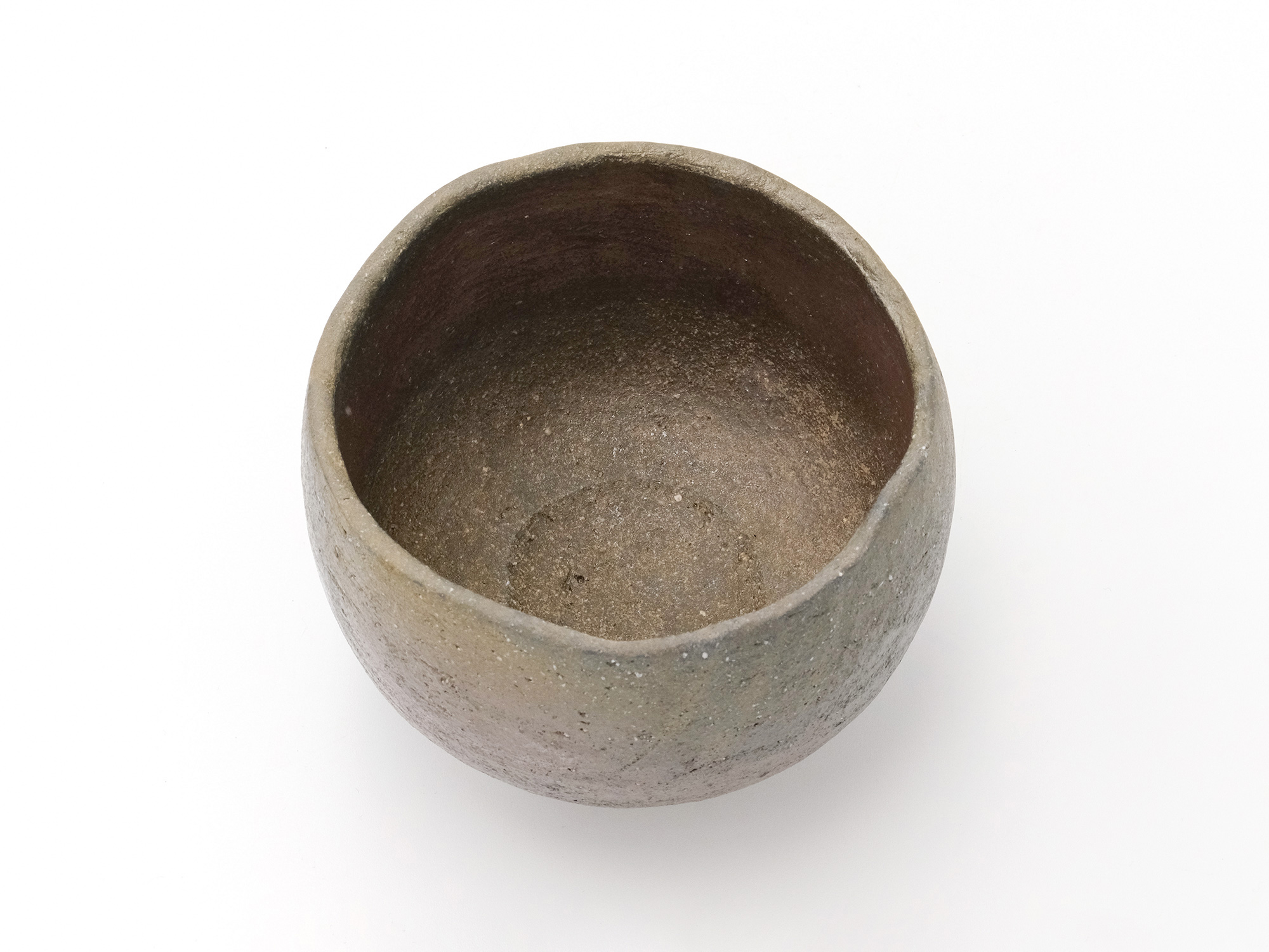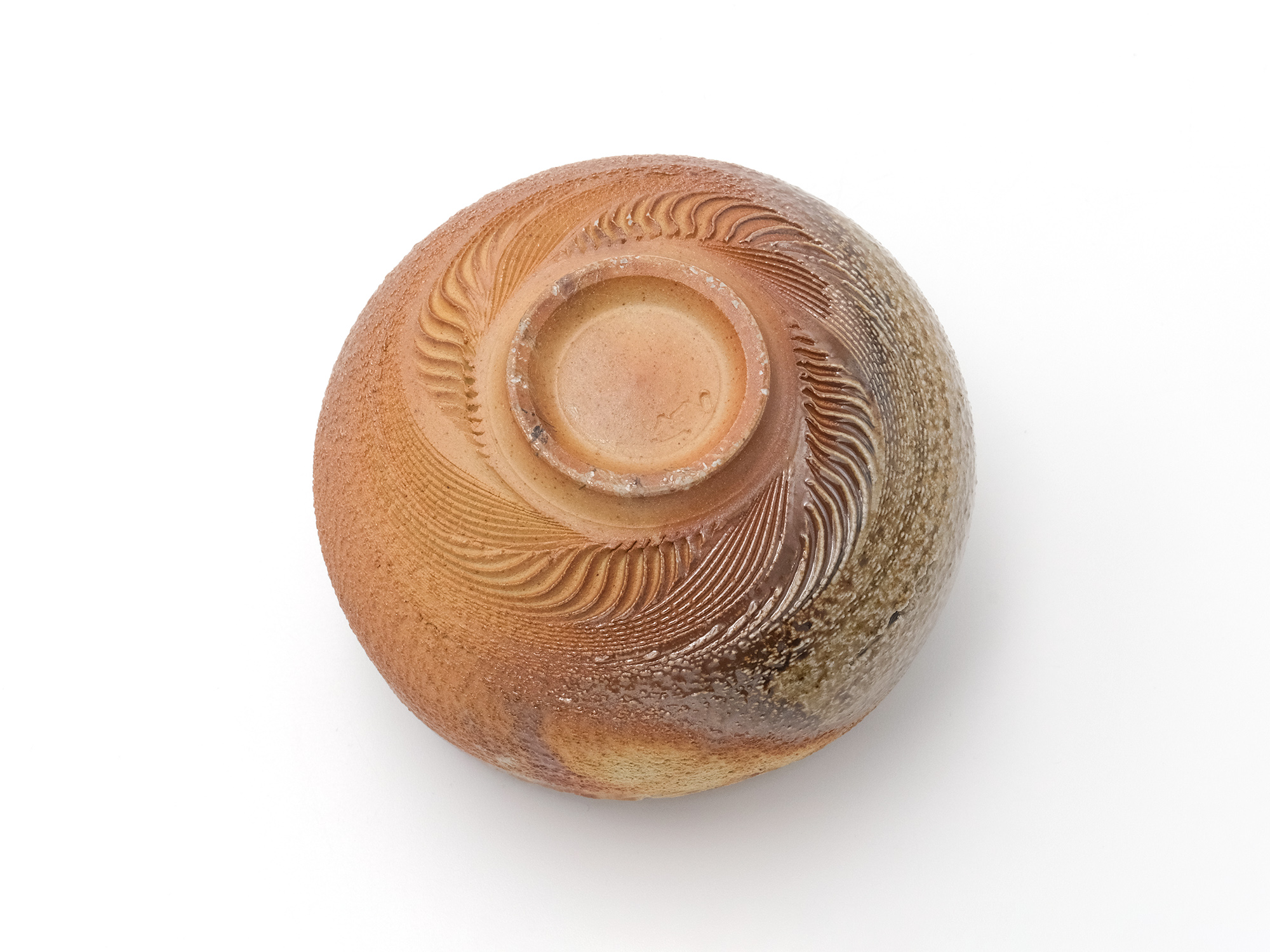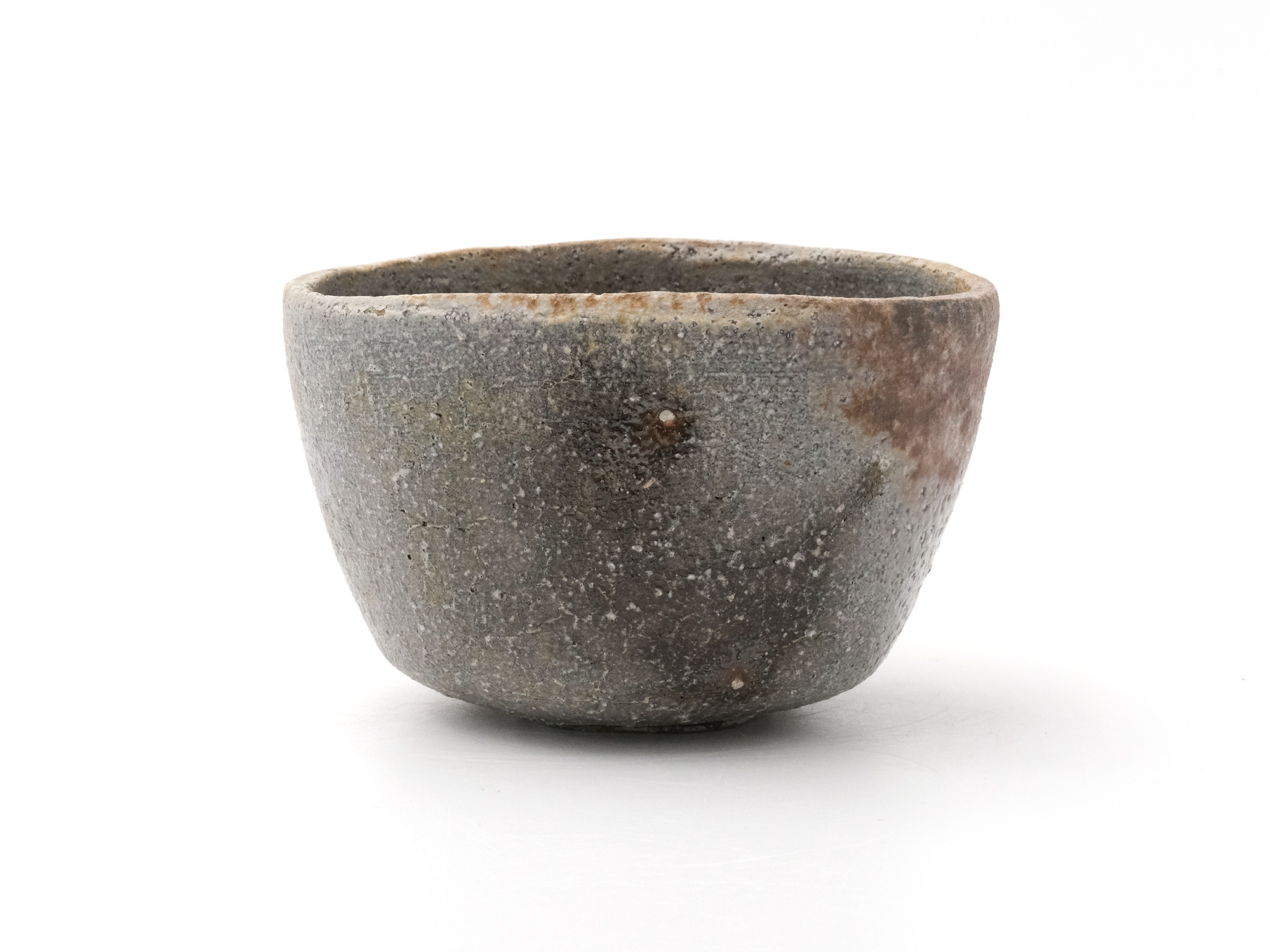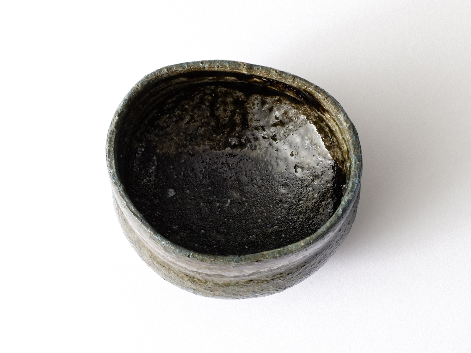 近藤正彦の《引黒茶盌》は備前の土で成形し、黒の顔料を化粧掛けした沓形の茶盌です。 窯焚き終盤に窯の中から作品を引出し、急冷で割れないようサヤ(容器)に移して冷まします。 黒の顔料は炎により様々な景色を作り出します。この茶盌は、その変化が見どころです。