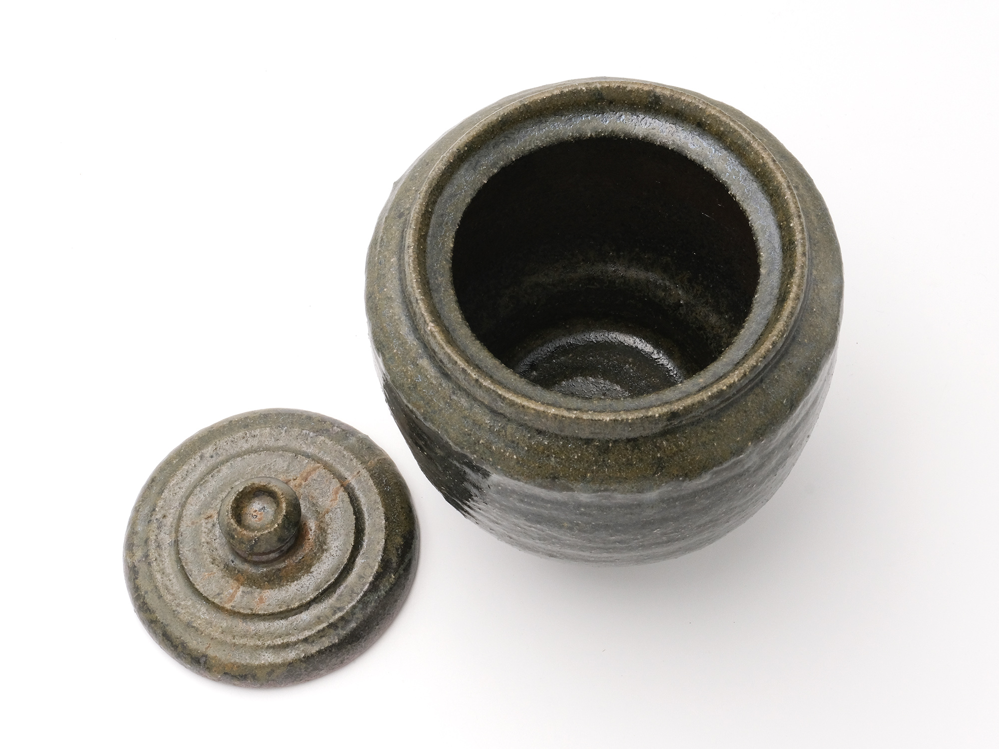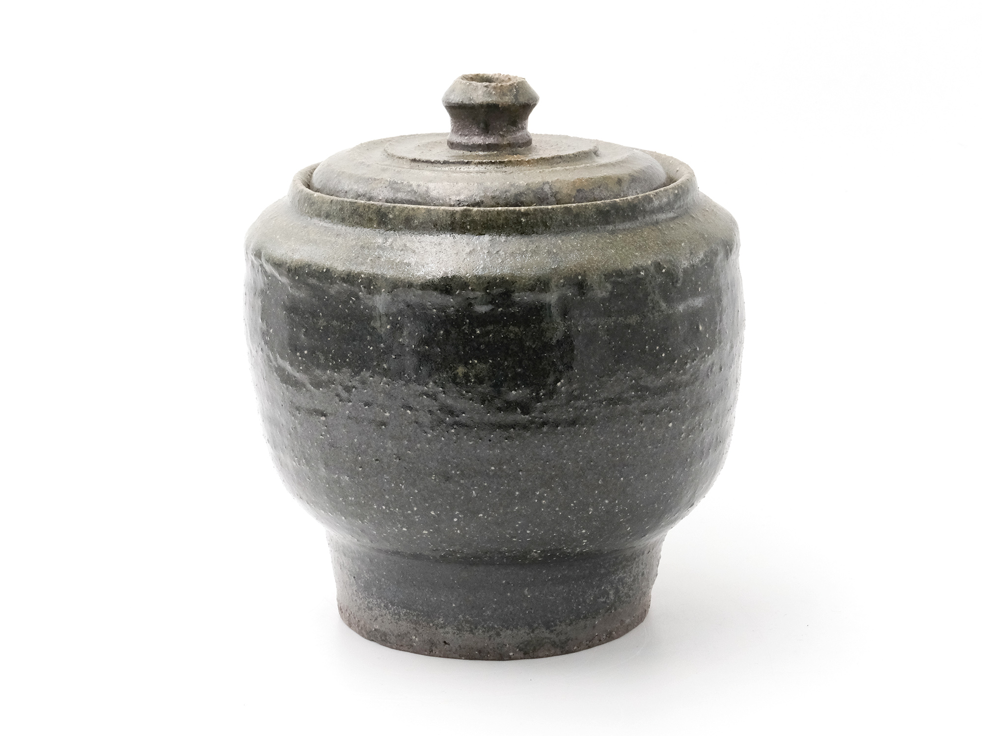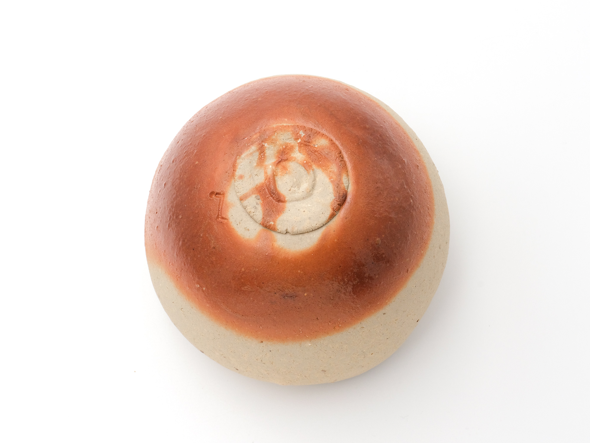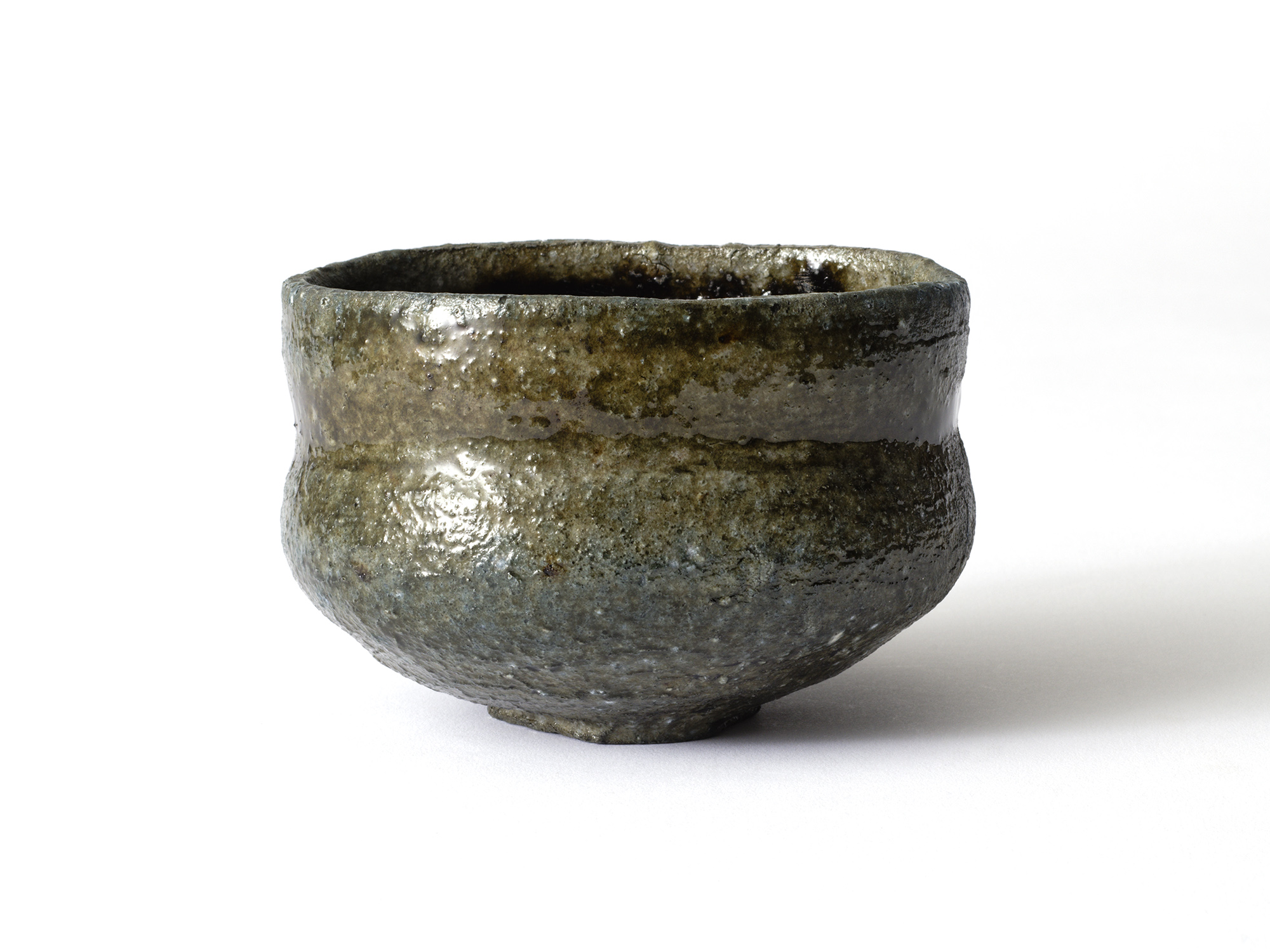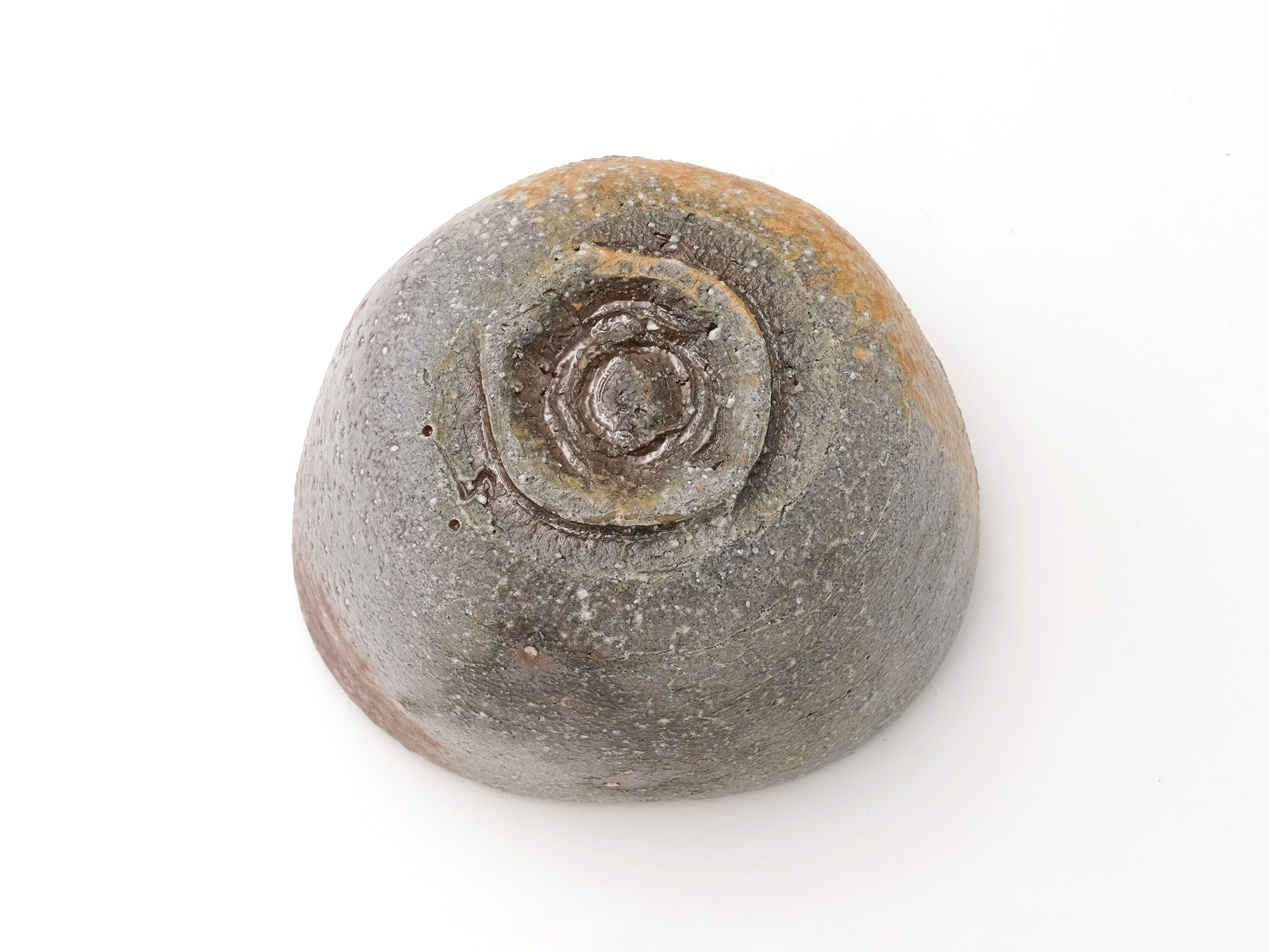 近藤正彦の《引黒茶盌》は備前の土で成形し、黒の顔料を化粧掛けした沓形の茶盌です。 窯焚き終盤に窯の中から作品を引出し、急冷で割れないようサヤ(容器)に移して冷まします。 黒の顔料は炎により様々な景色を作り出します。この茶盌は、その変化が見どころです。