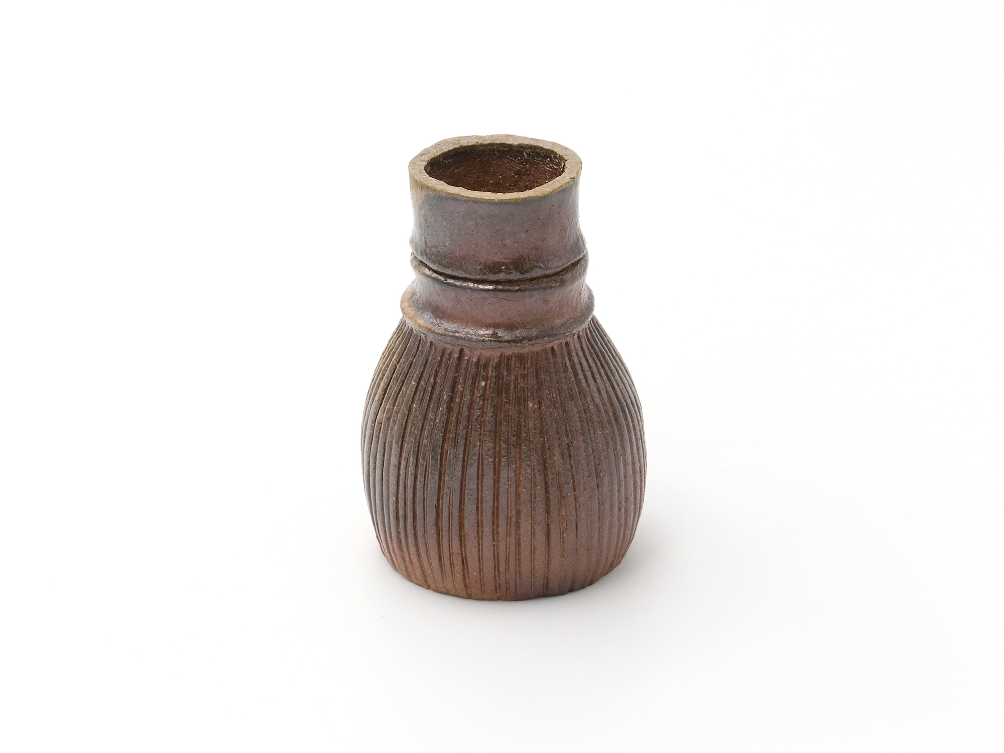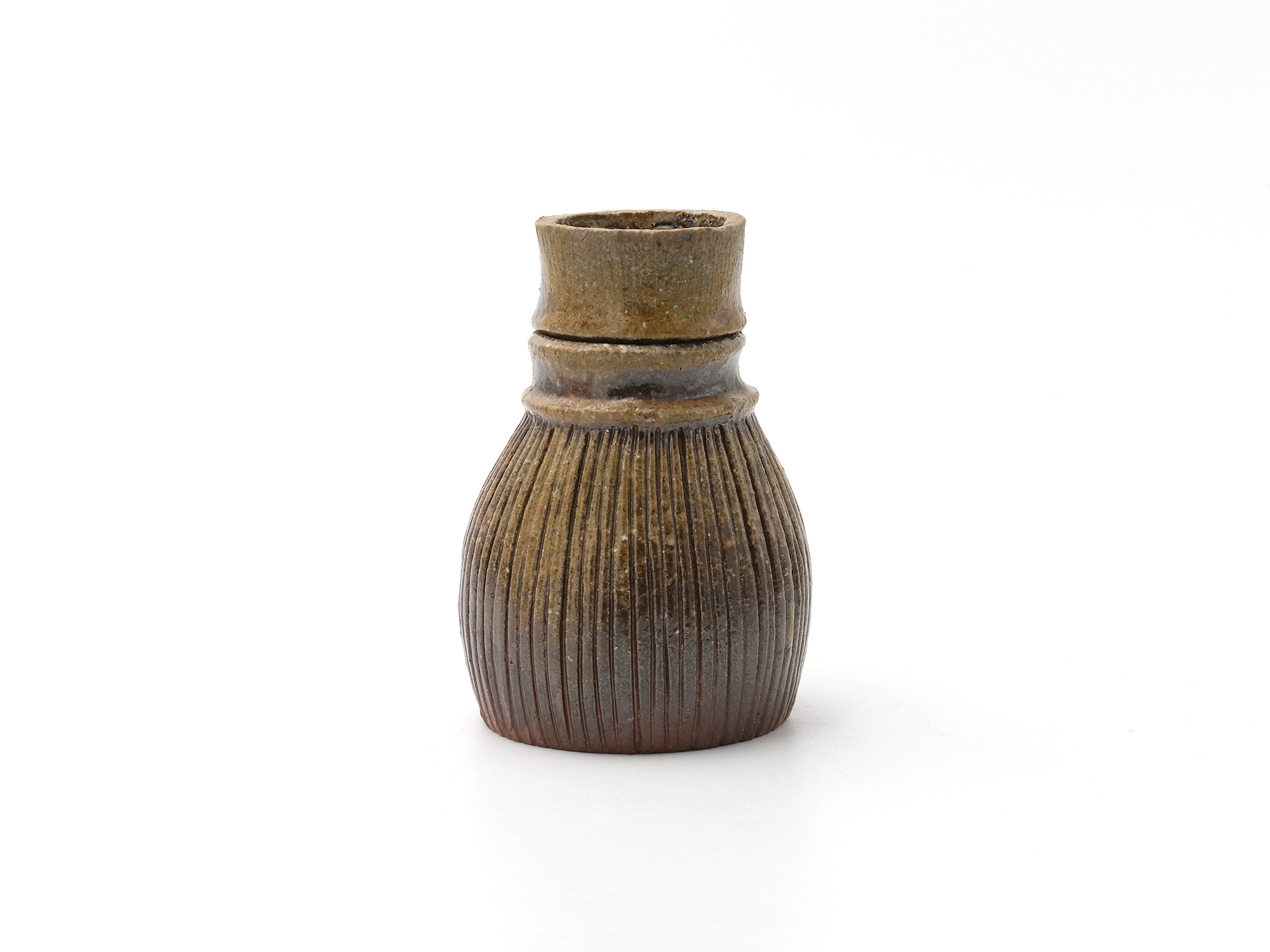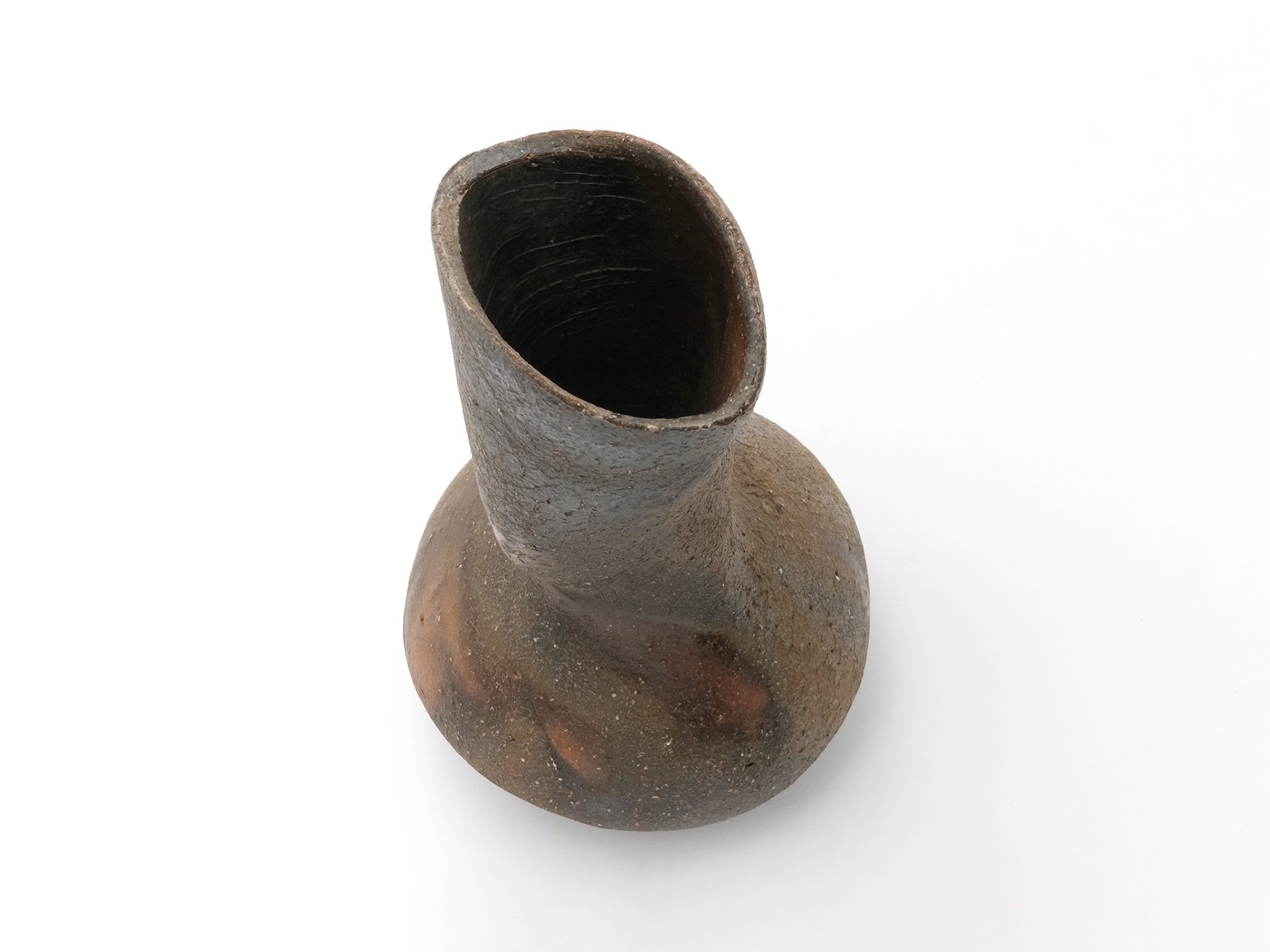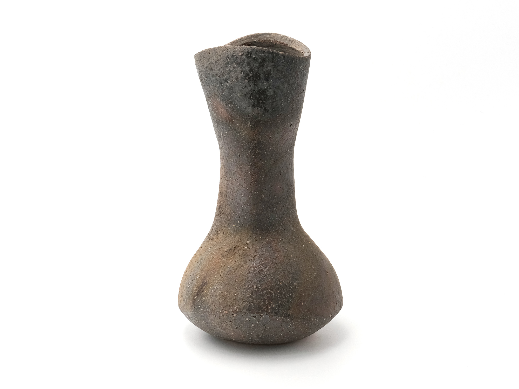 松本優作の《花器》はシンプルな下蕪型の備前焼の花器ですが、真っ直ぐに立ち上がった太い頸がとても力強く、安定感のある造形を成しています。 青味がかったボディーには、茶胡麻や黒焦げが見え、美しいコントラストに仕上がっています。
