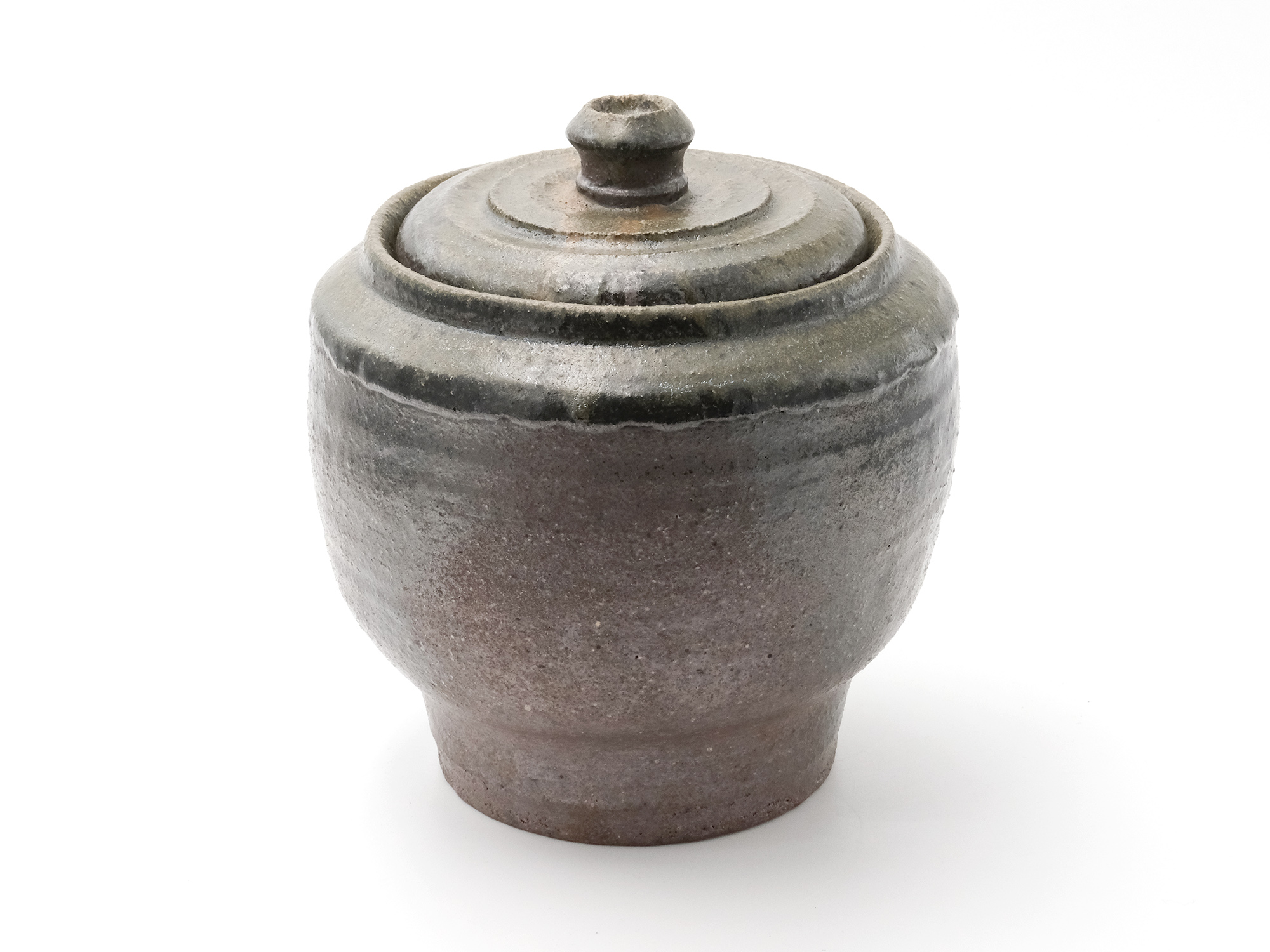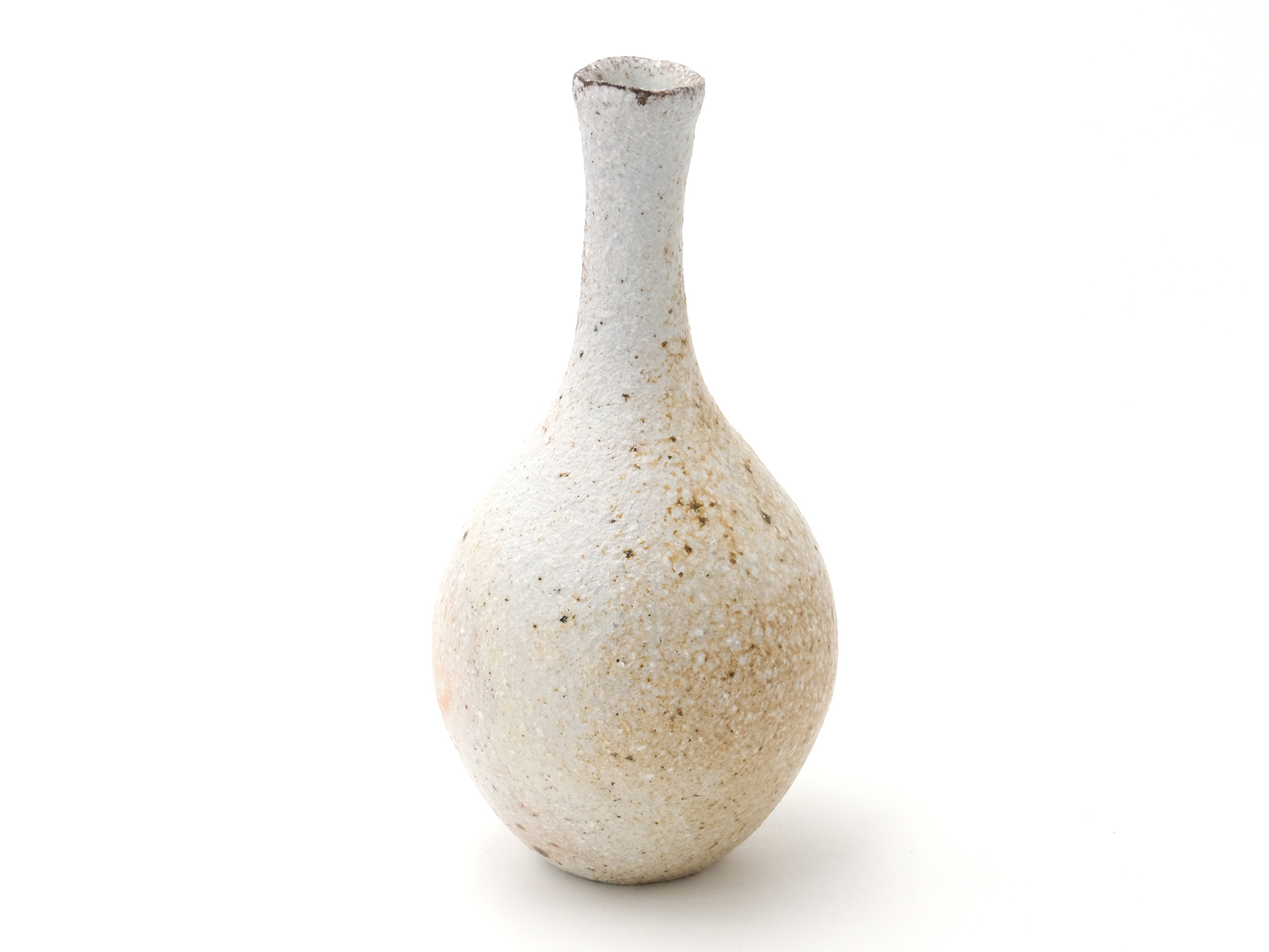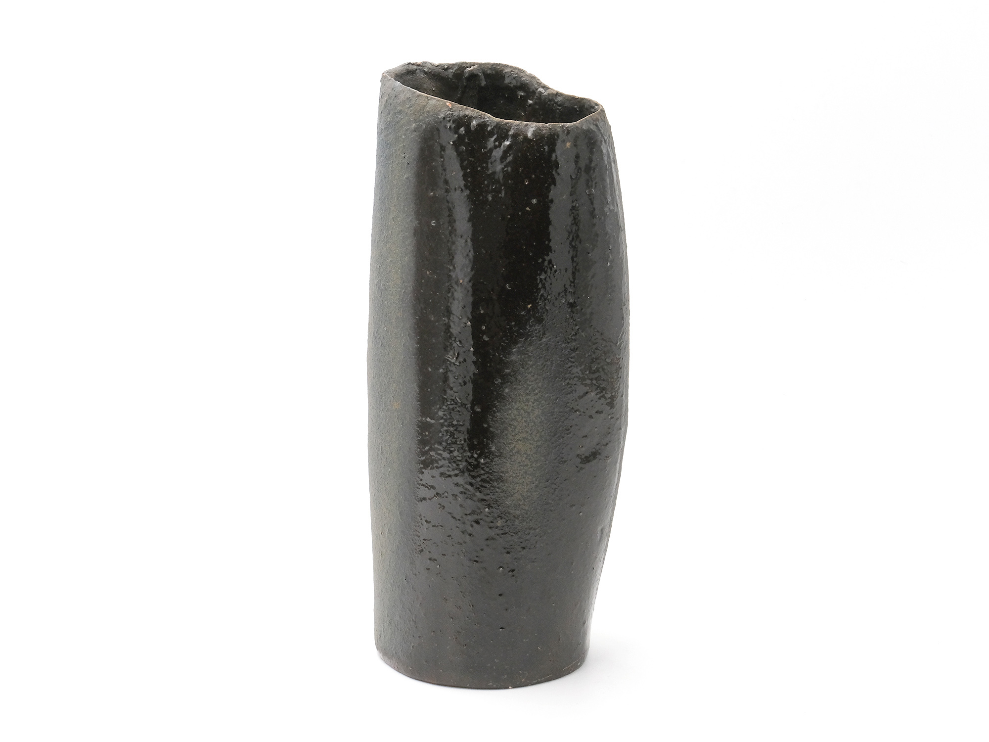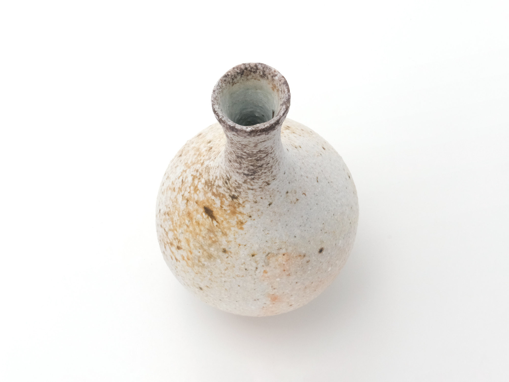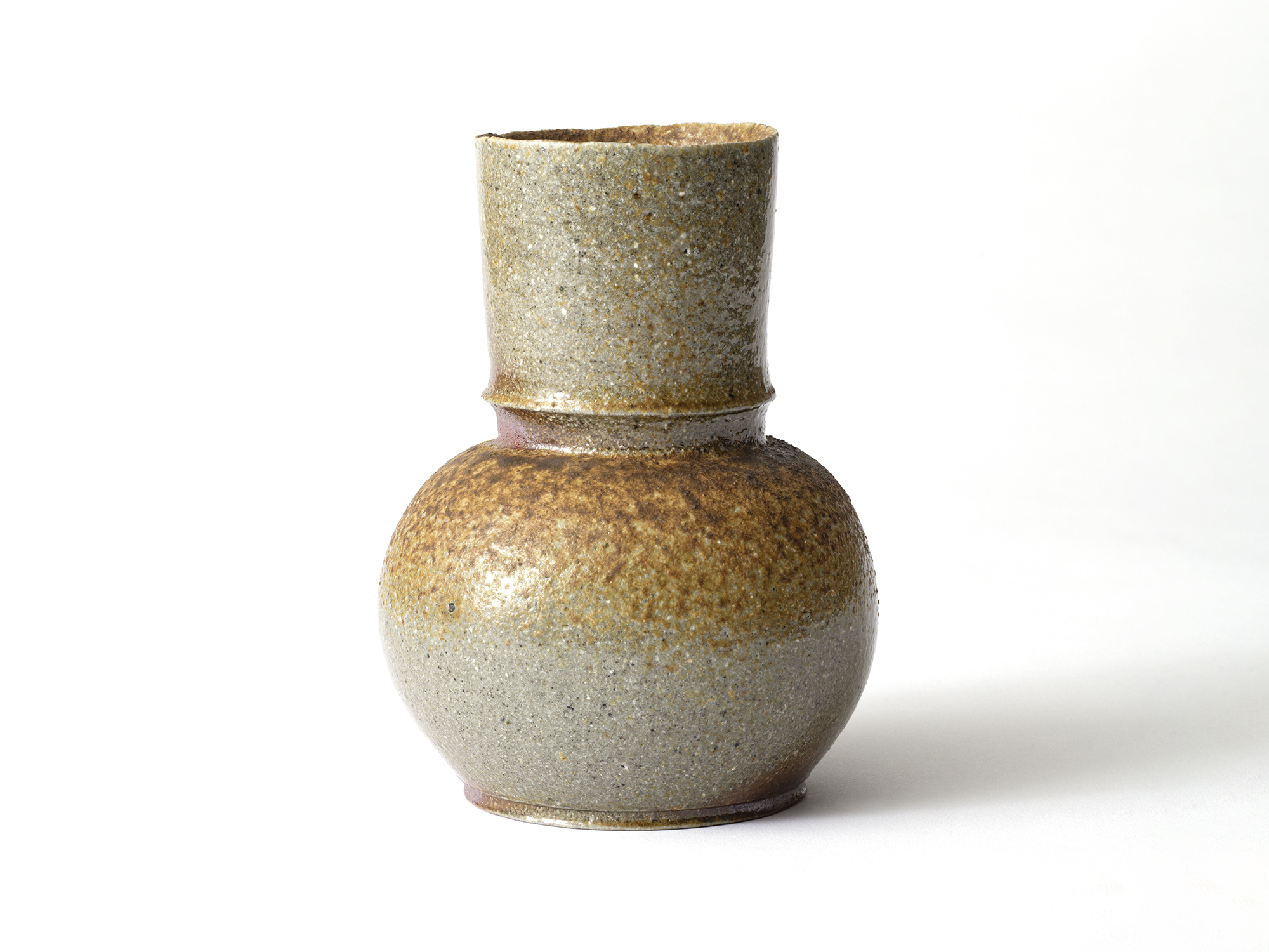 松本優作の《花器》はシンプルな下蕪型の備前焼の花器ですが、真っ直ぐに立ち上がった太い頸がとても力強く、安定感のある造形を成しています。 青味がかったボディーには、茶胡麻や黒焦げが見え、美しいコントラストに仕上がっています。